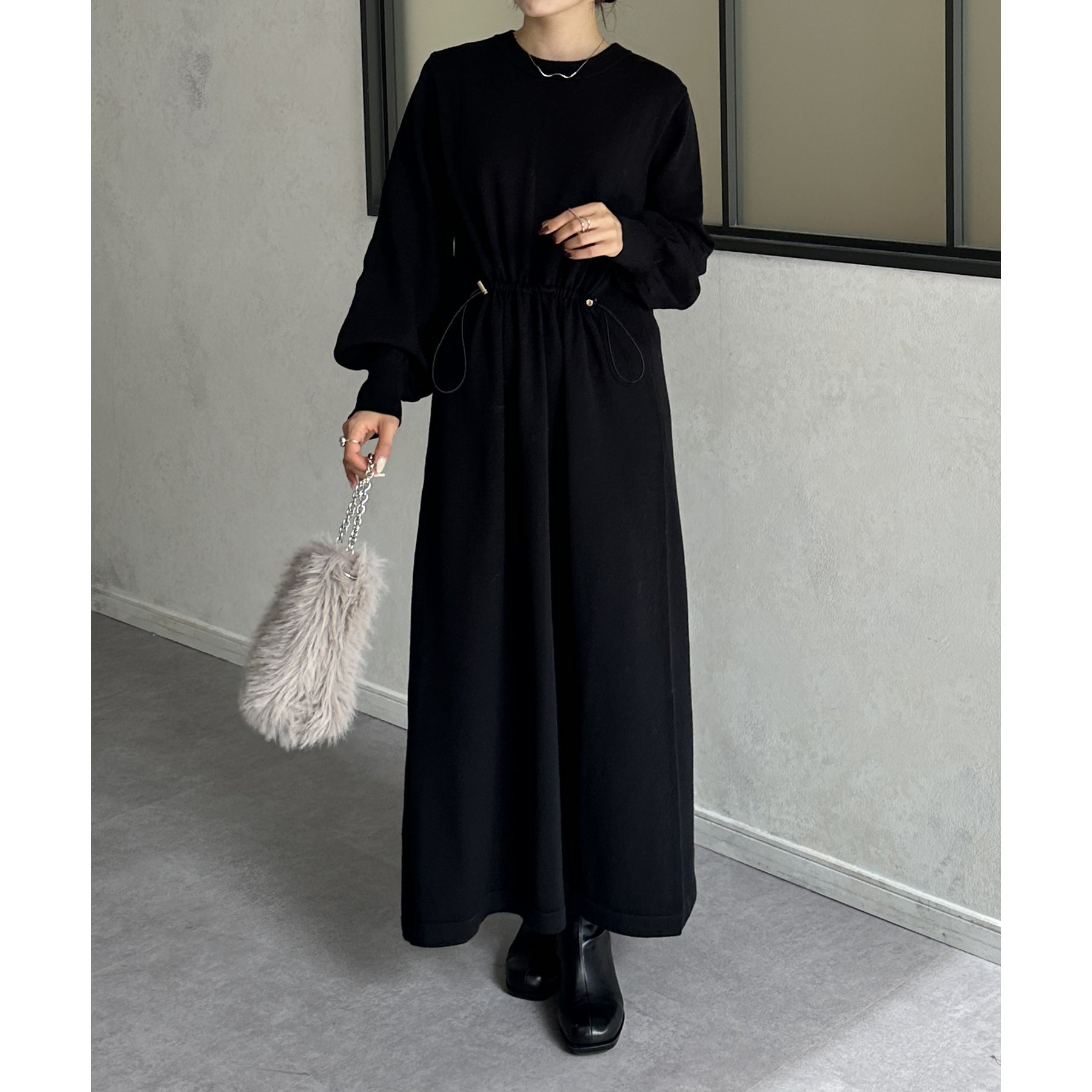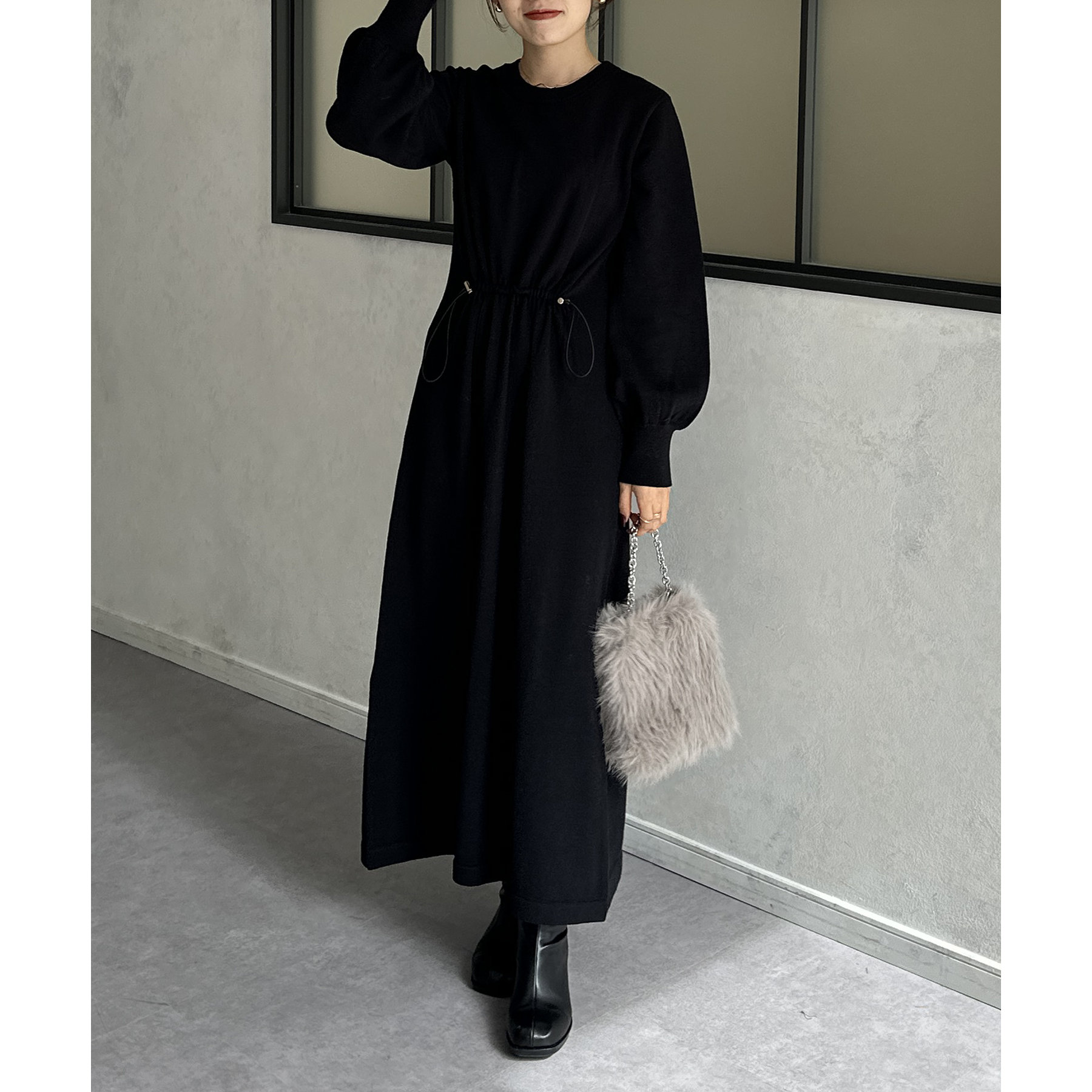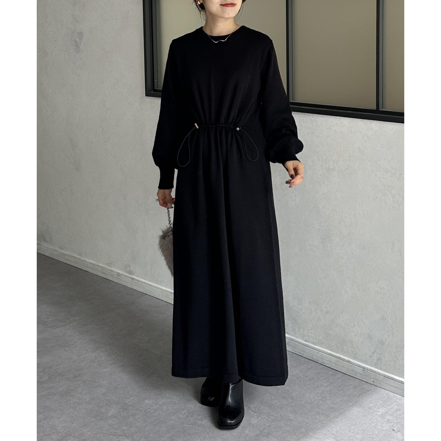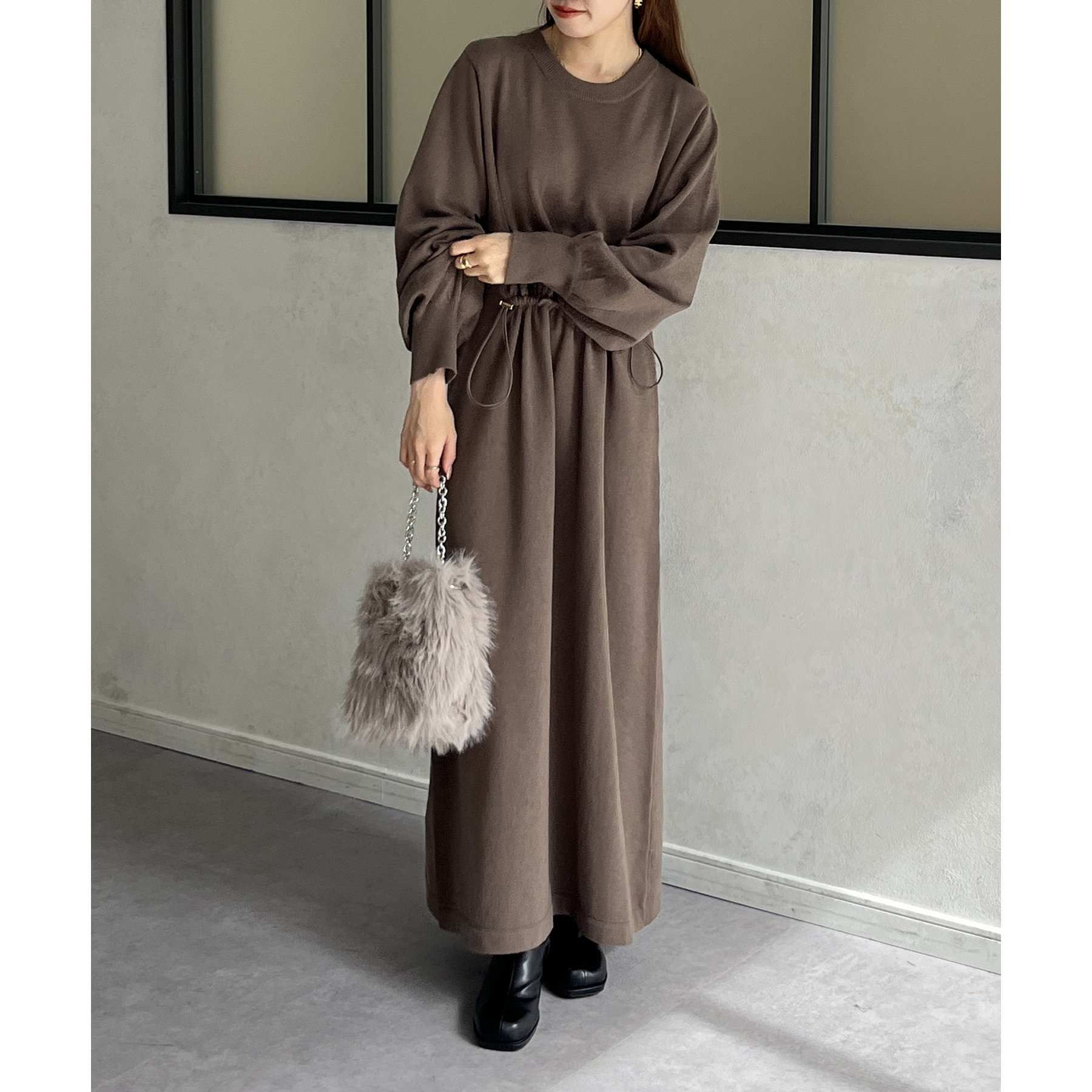 ウエストドロスト袖ボリュームニットワンピース