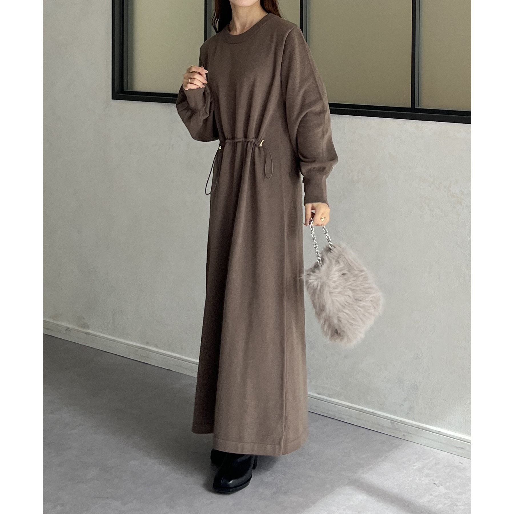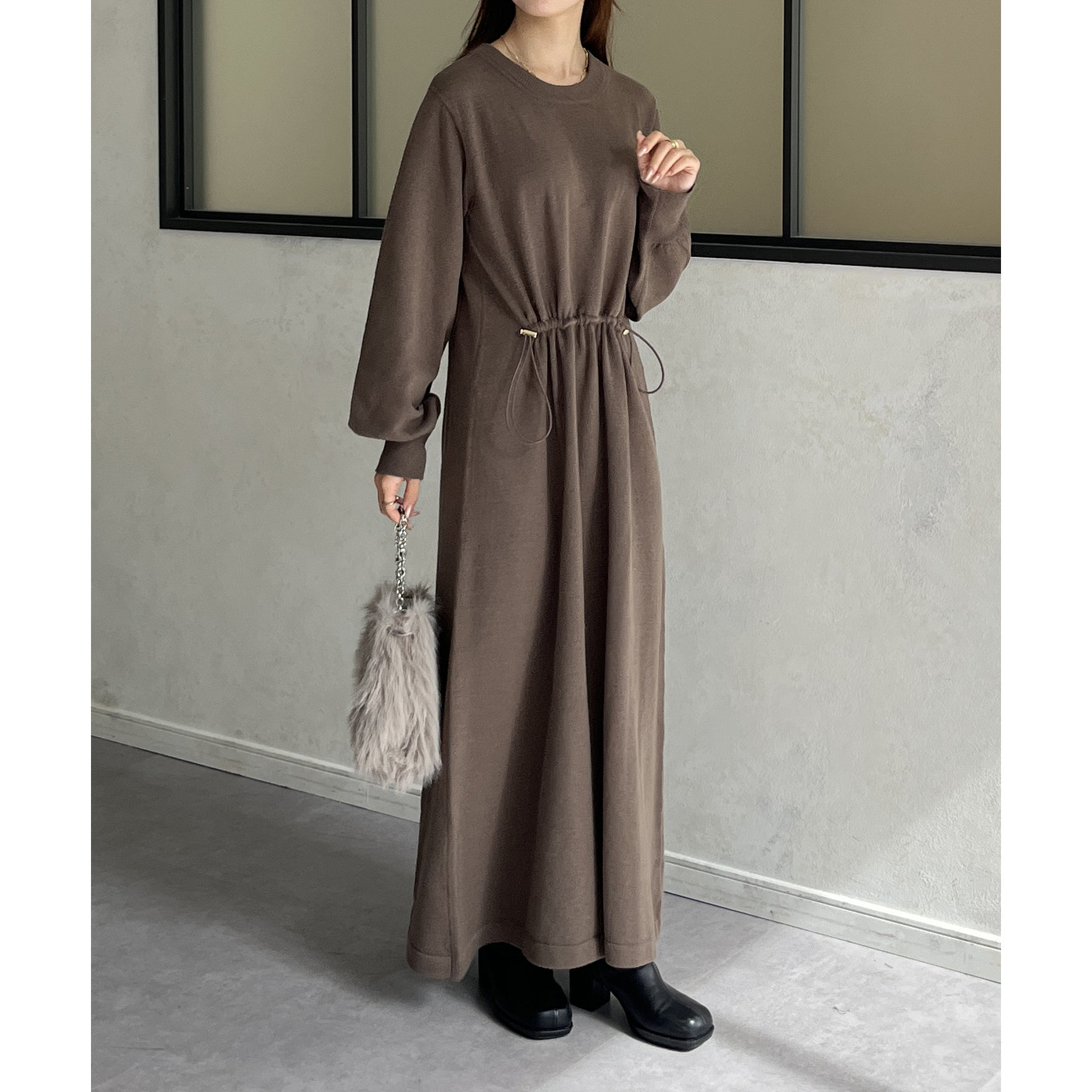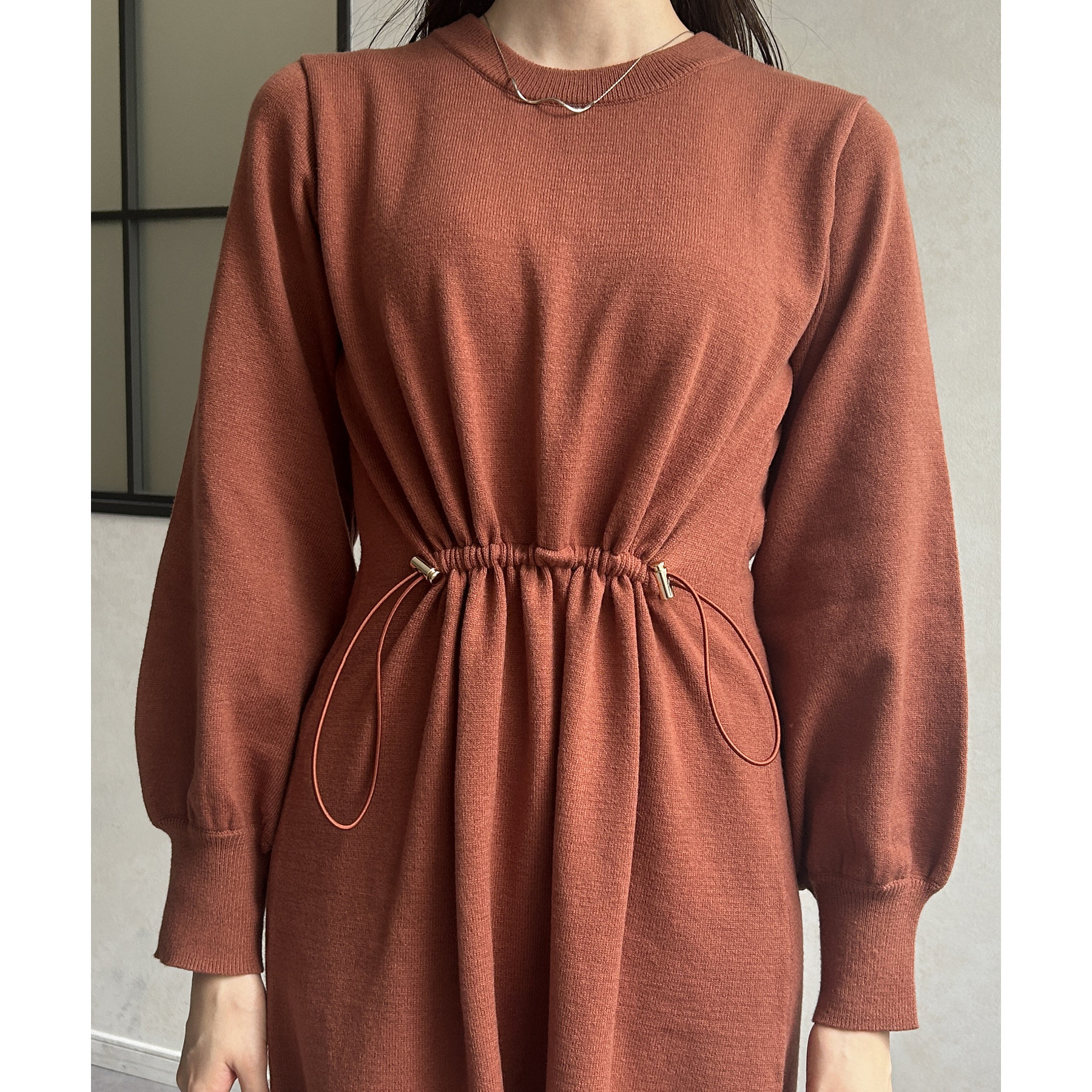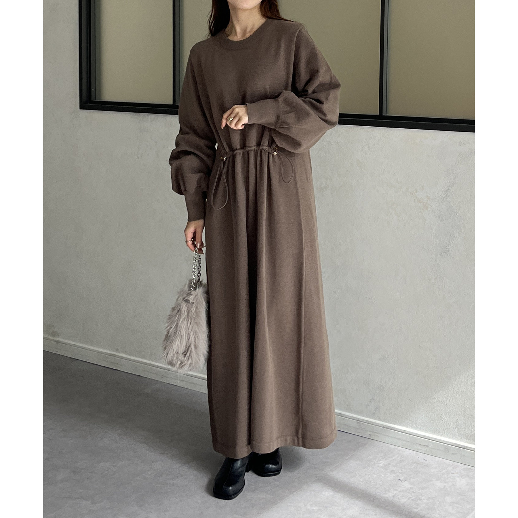 ウエストドロスト袖ボリュームニットワンピース