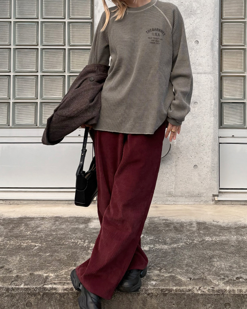 ピグメントウォッシュチャコールカラーとワッフル組織ならではの立体的な質感が引き立つコットン混紡生地 ラウンドネックと長袖仕様のTシャツタイプ エッジリップ組織仕上げとレグランスリーブ、ロゴプリントのディテール ※ピグメントウォッシング特性上、製品ごとに10〜15%トンの差がある場合があり、明るい色の着用時に異炎が発生することがあります。 ※ウォッシングにより2~3cmのサイズ偏差がある場合がございます。 Cotton 60% Polyester 40% Khaki Cotton Blend Pigment washing ラウンドネック ロングスリーブ Waffle texture Ribbed finish ロゴ印刷