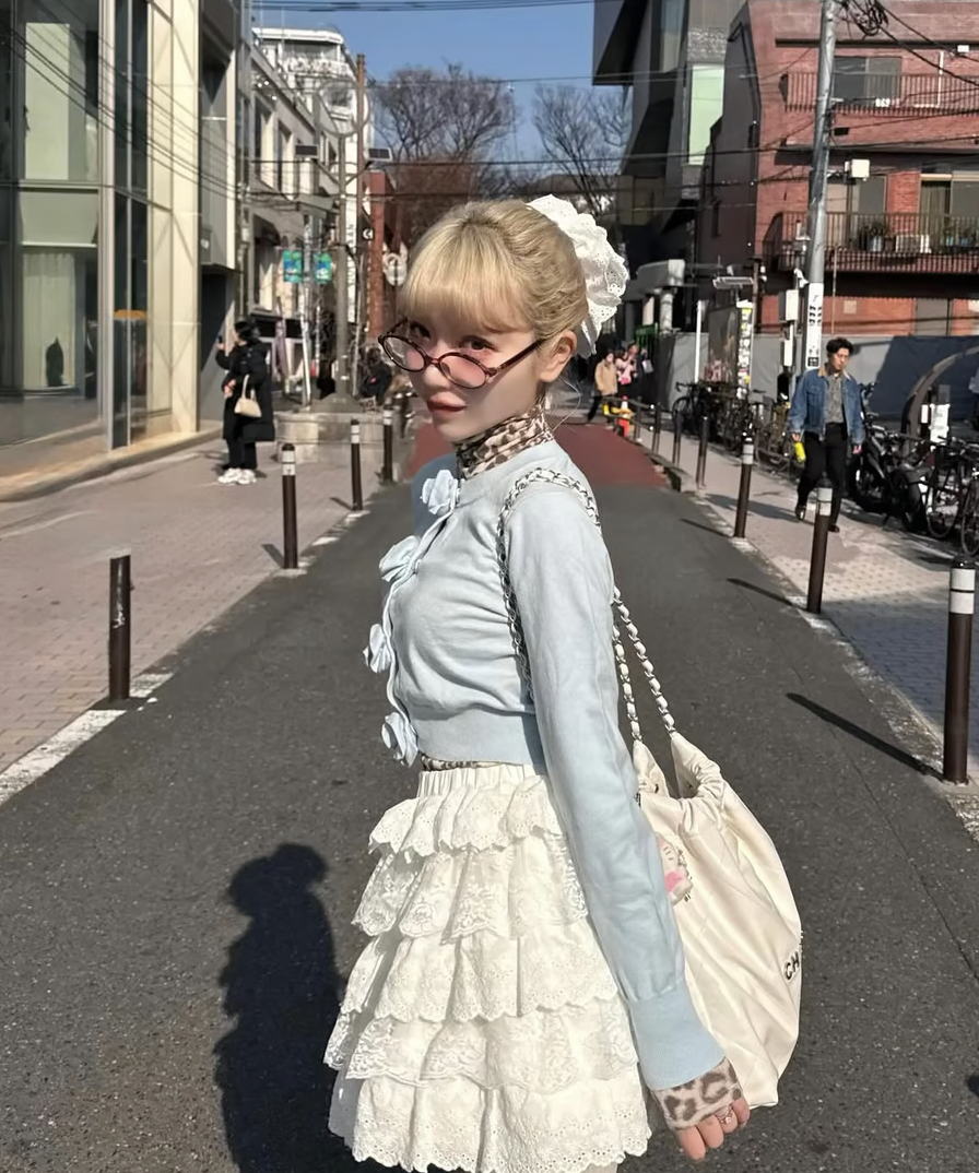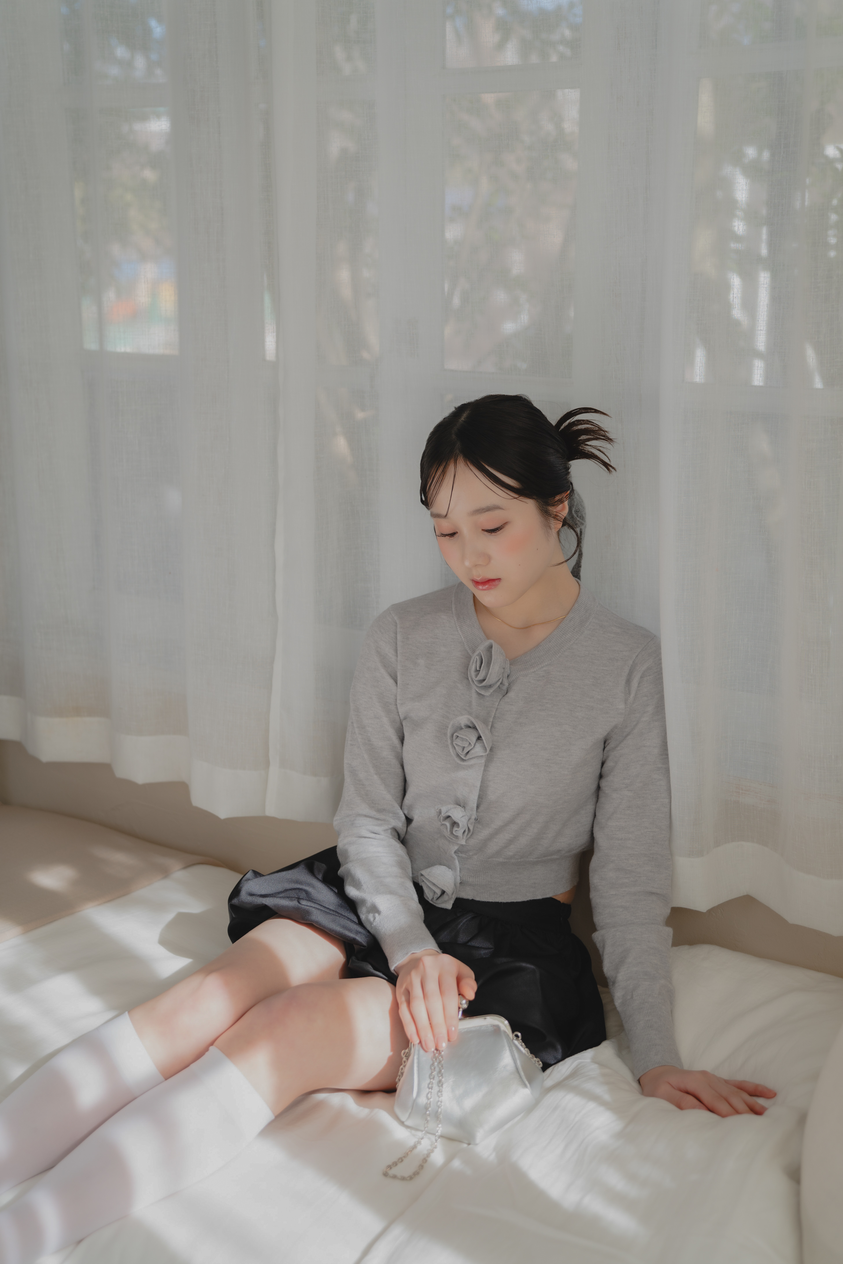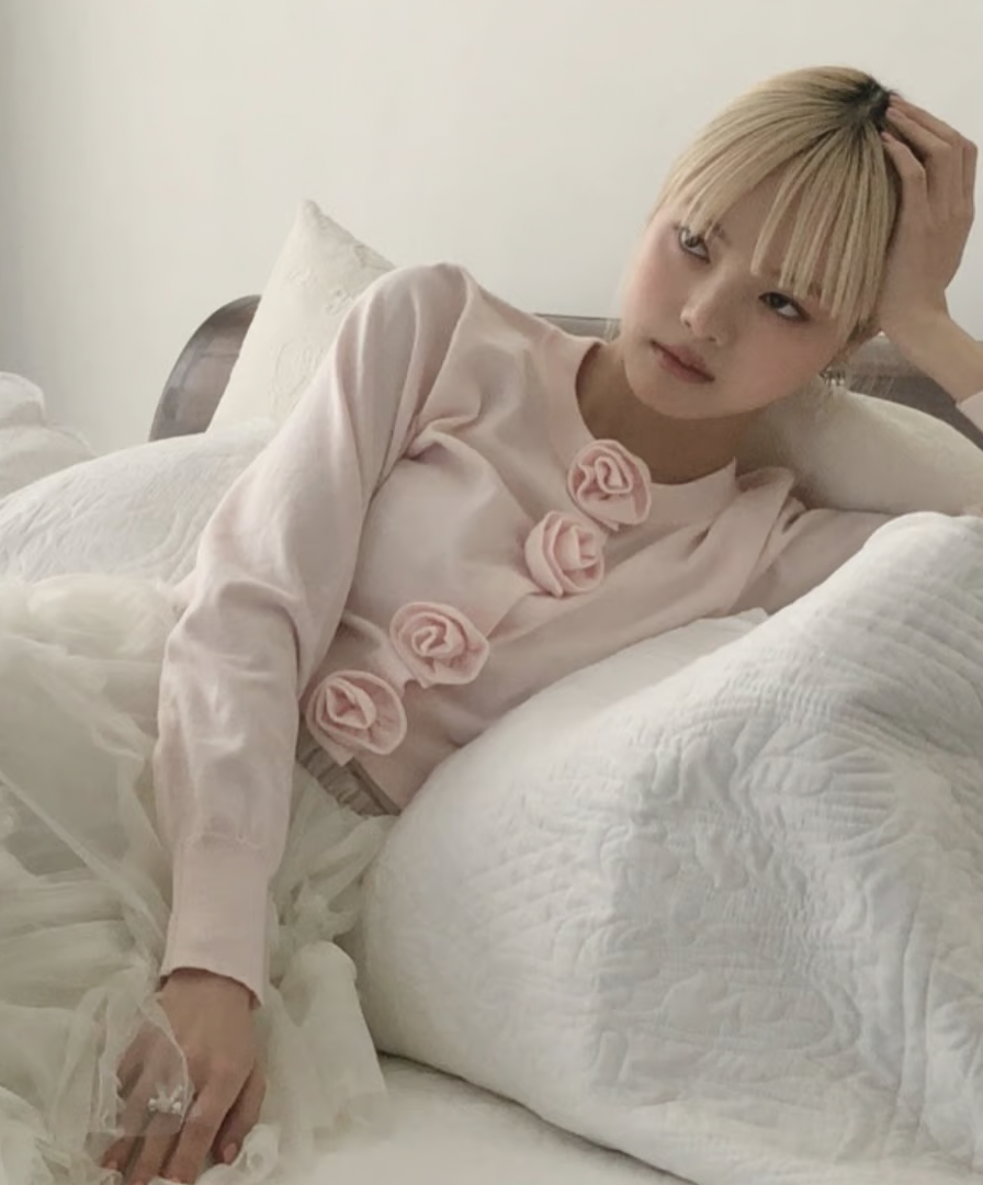 今季のシグネチャーモチーフでもあるローズを立体的なモチーフであしらい、華やかに仕上げたカーディガン。