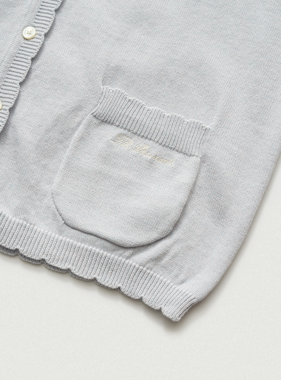 *スカラップ編みを加えたアウトポケットと、筆記体ロゴ刺繍がポイント