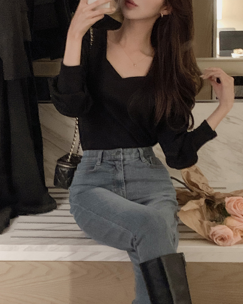 モデル|ブラックカラー(F)サイズ スクエアネック長袖着用
