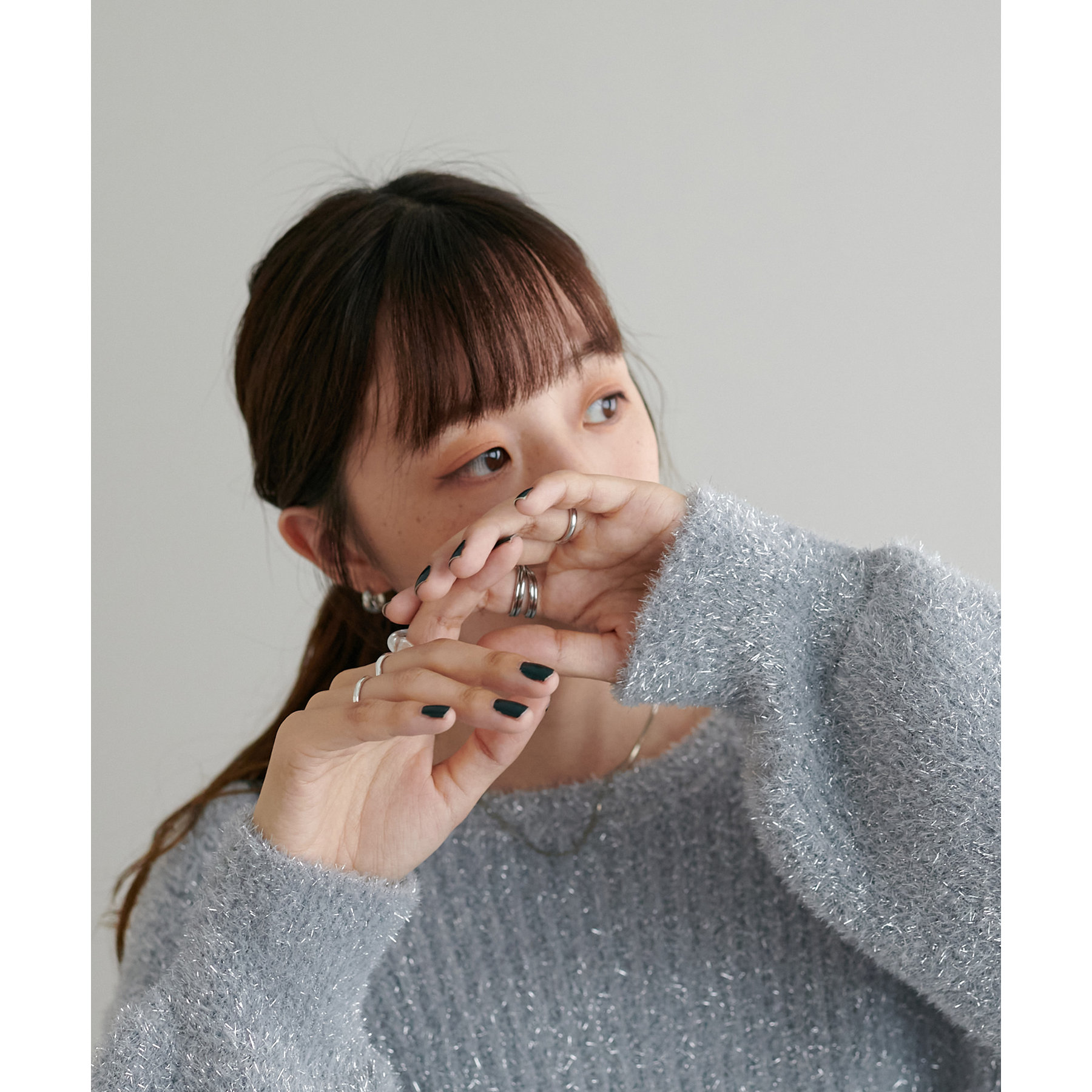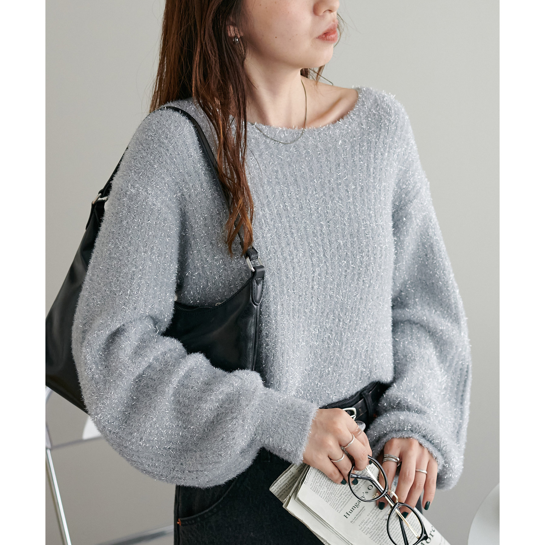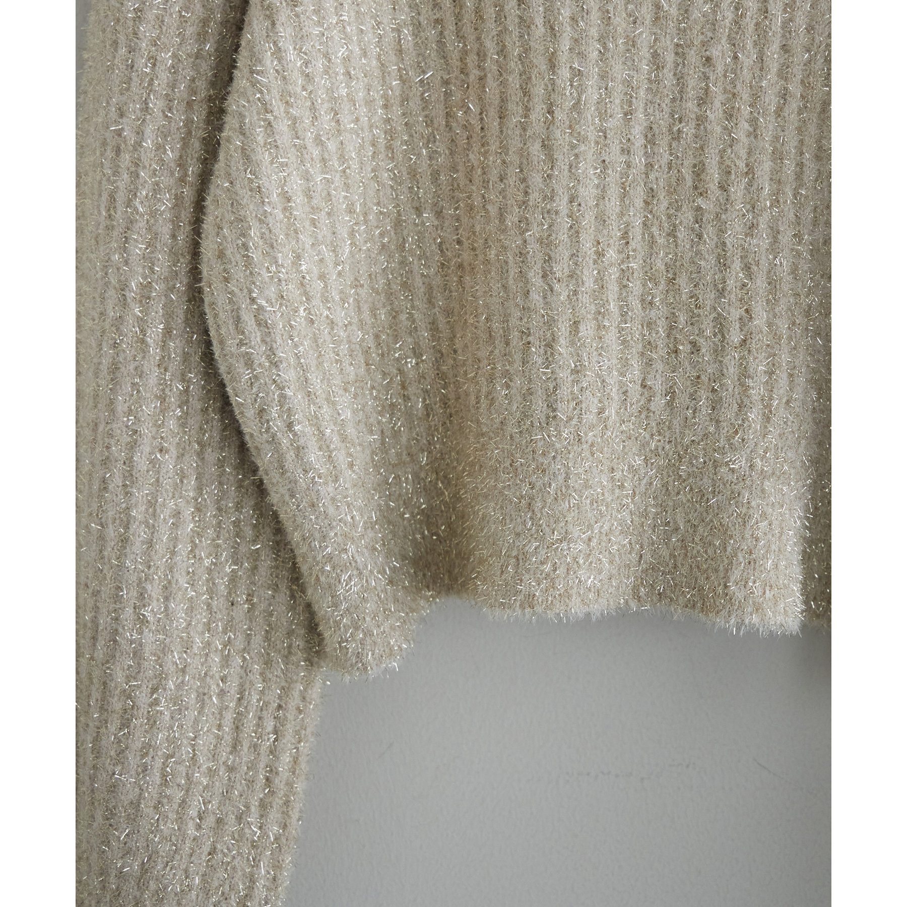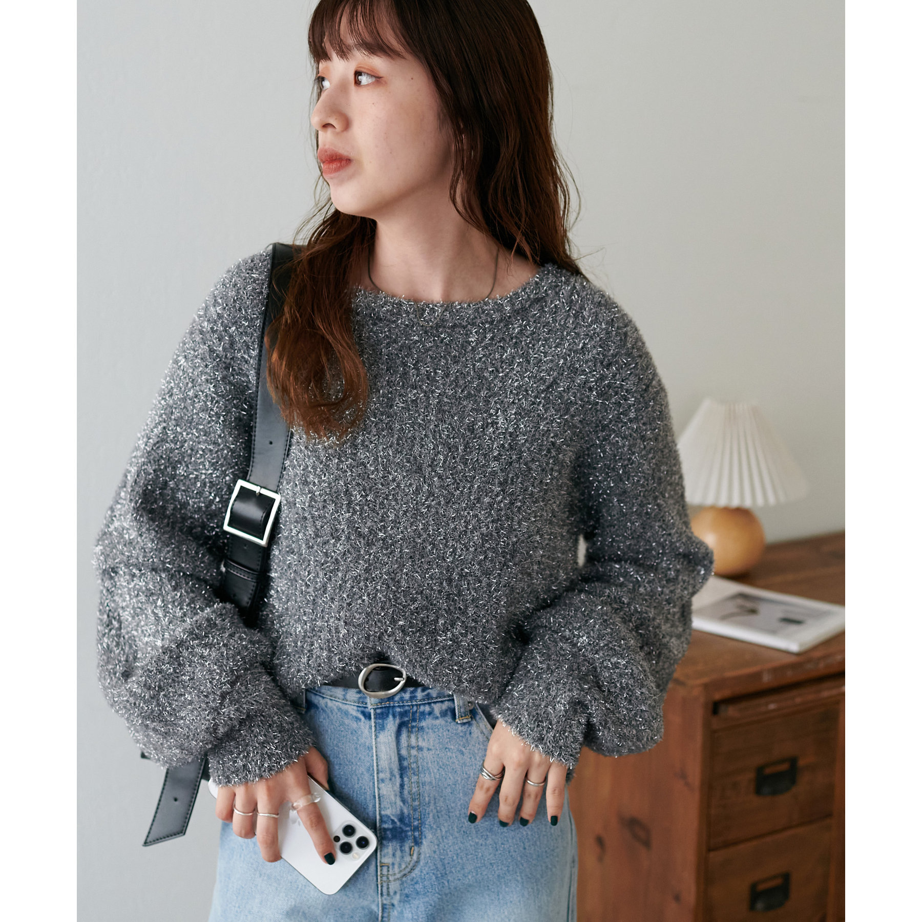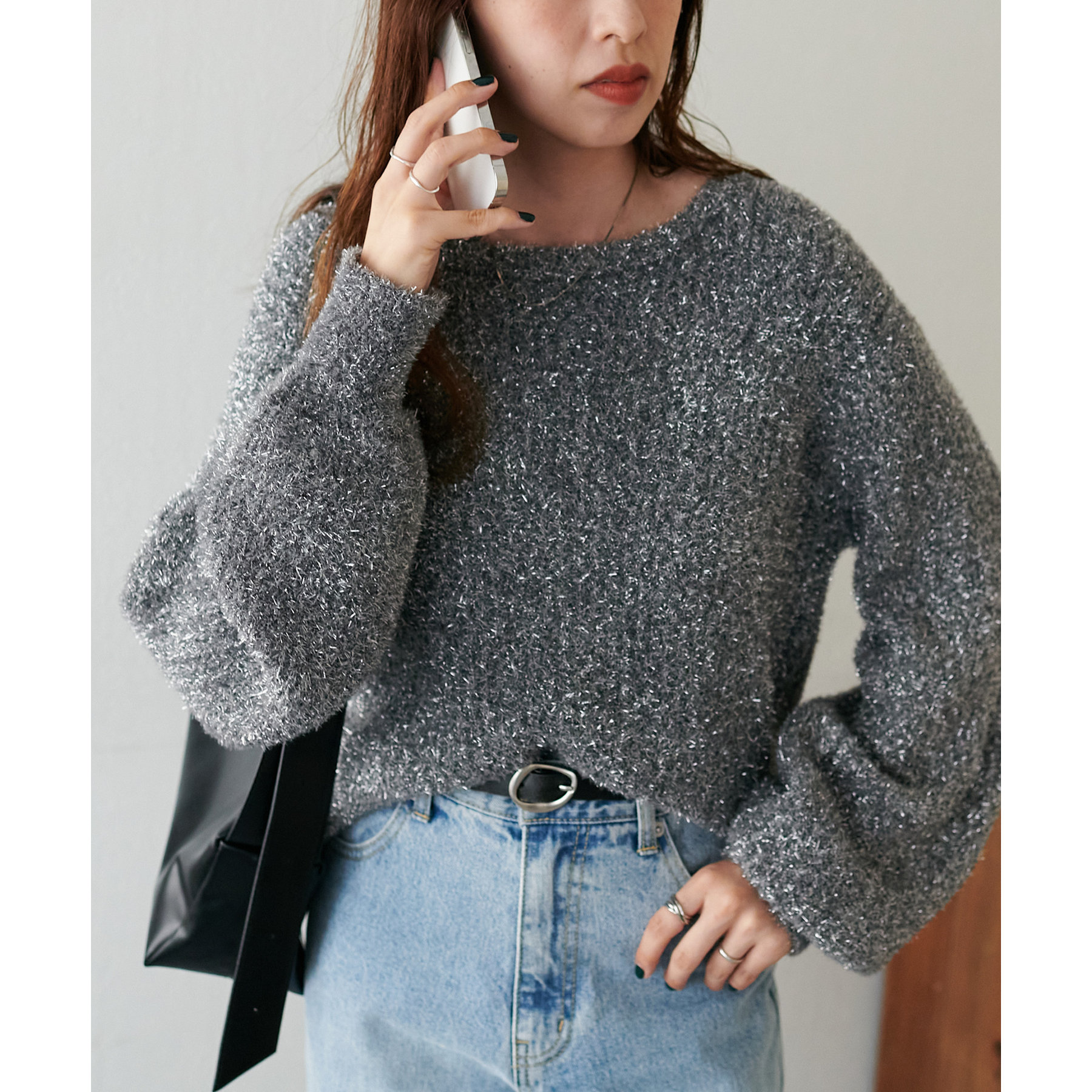 毛足の長さが特徴のフェザーヤーン素材にラメ糸が混紡された、トレンド感のある一枚。