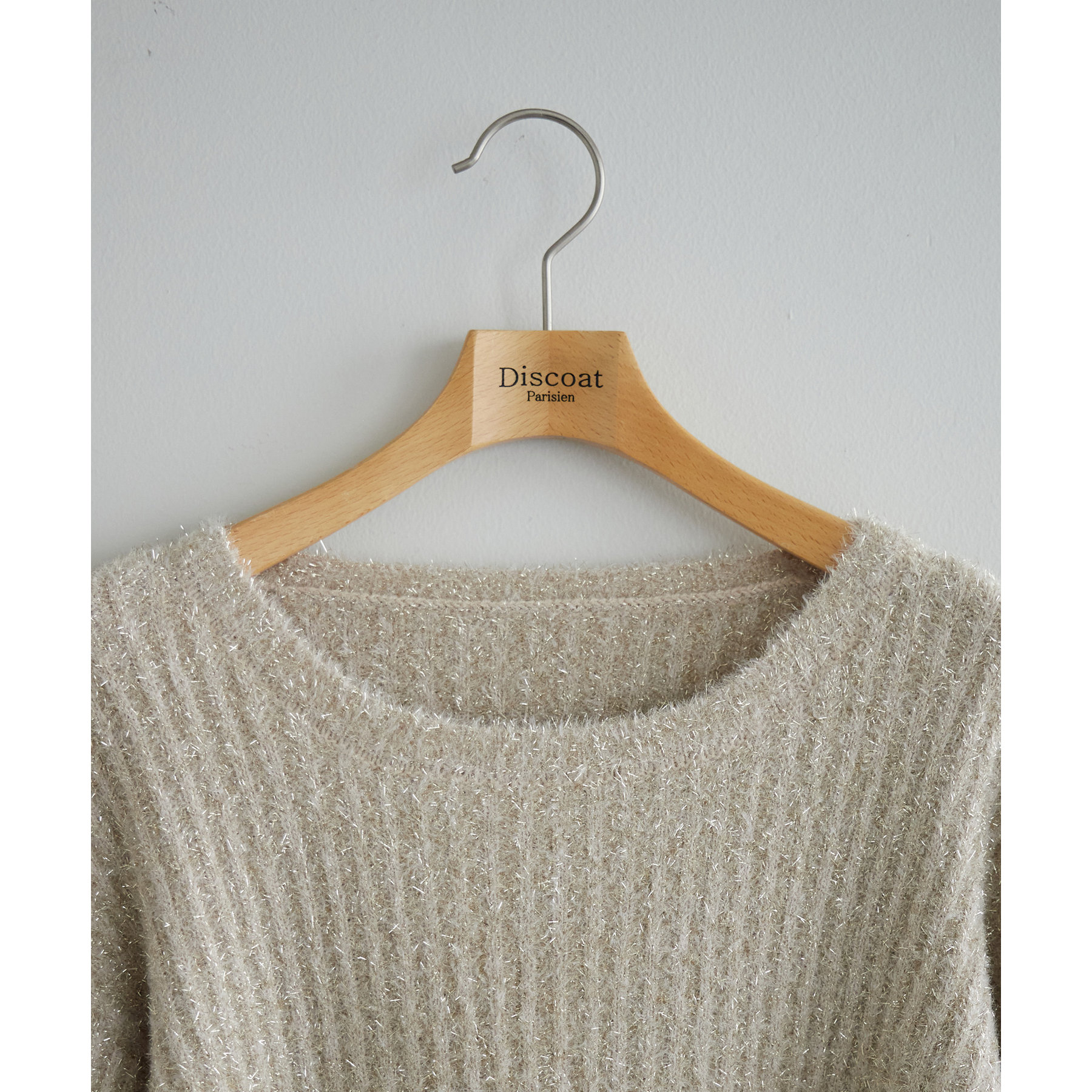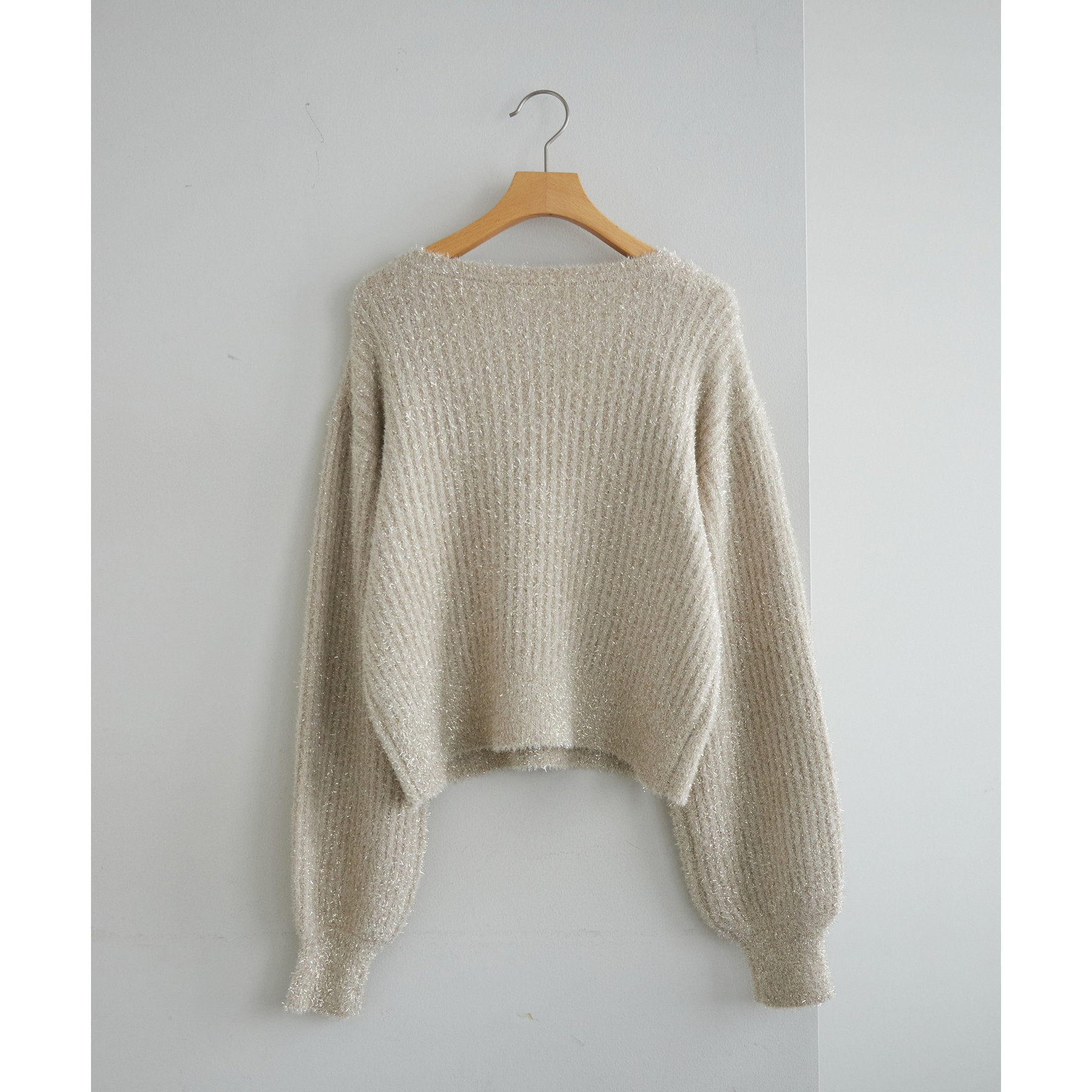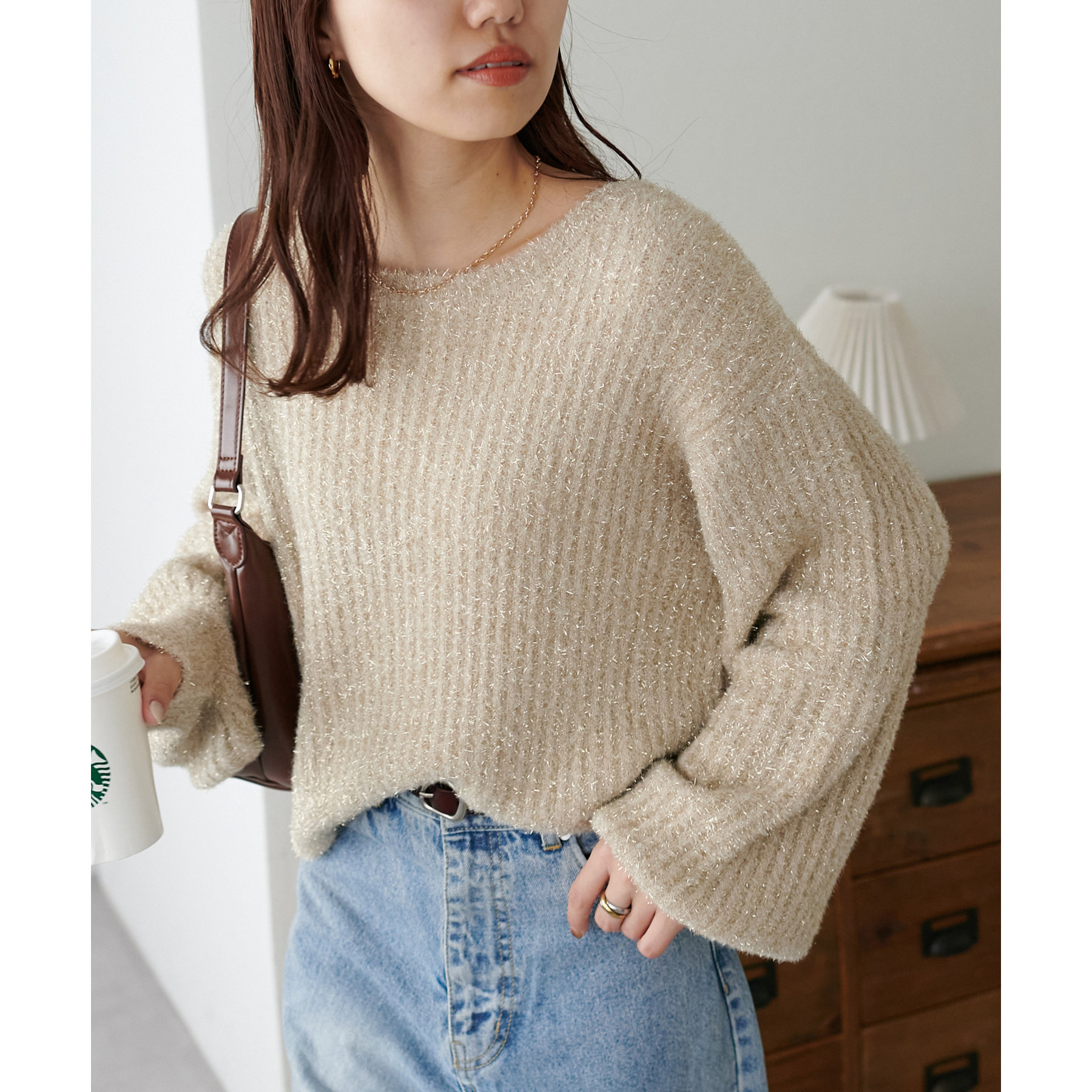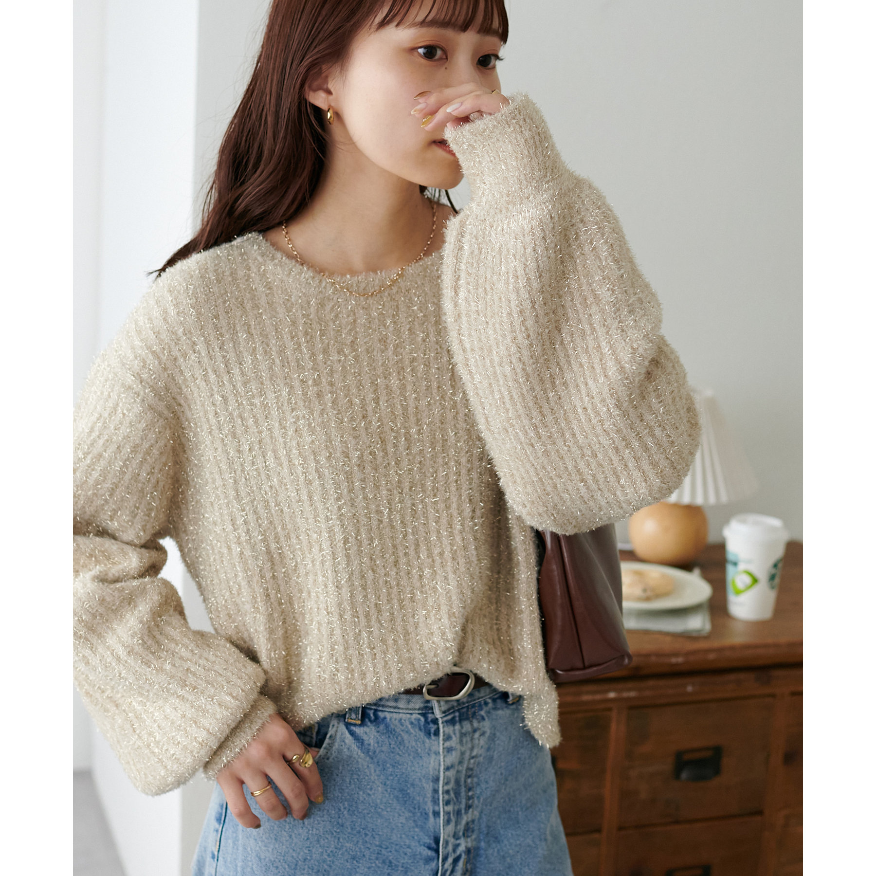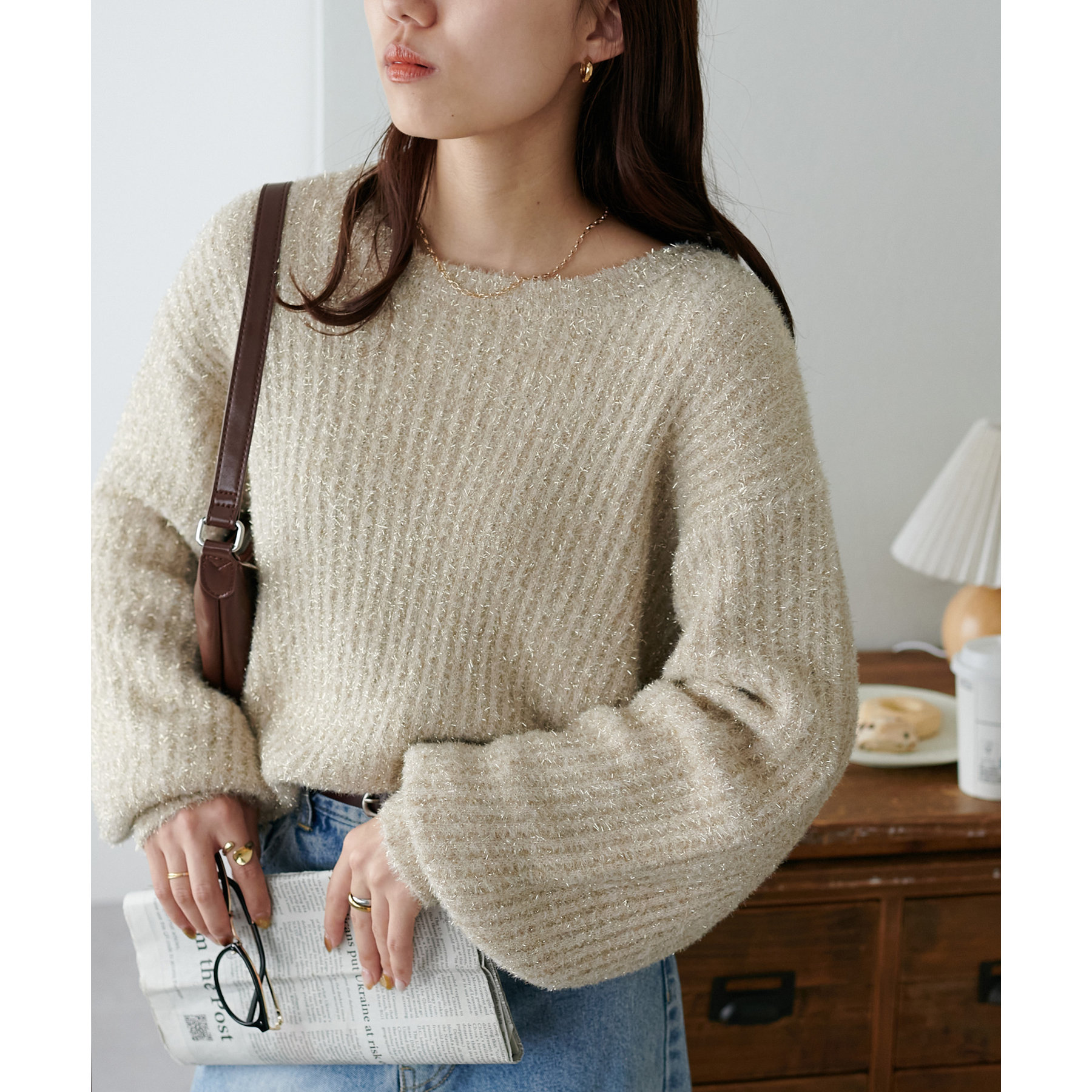 毛足の長さが特徴のフェザーヤーン素材にラメ糸が混紡された、トレンド感のある一枚。
