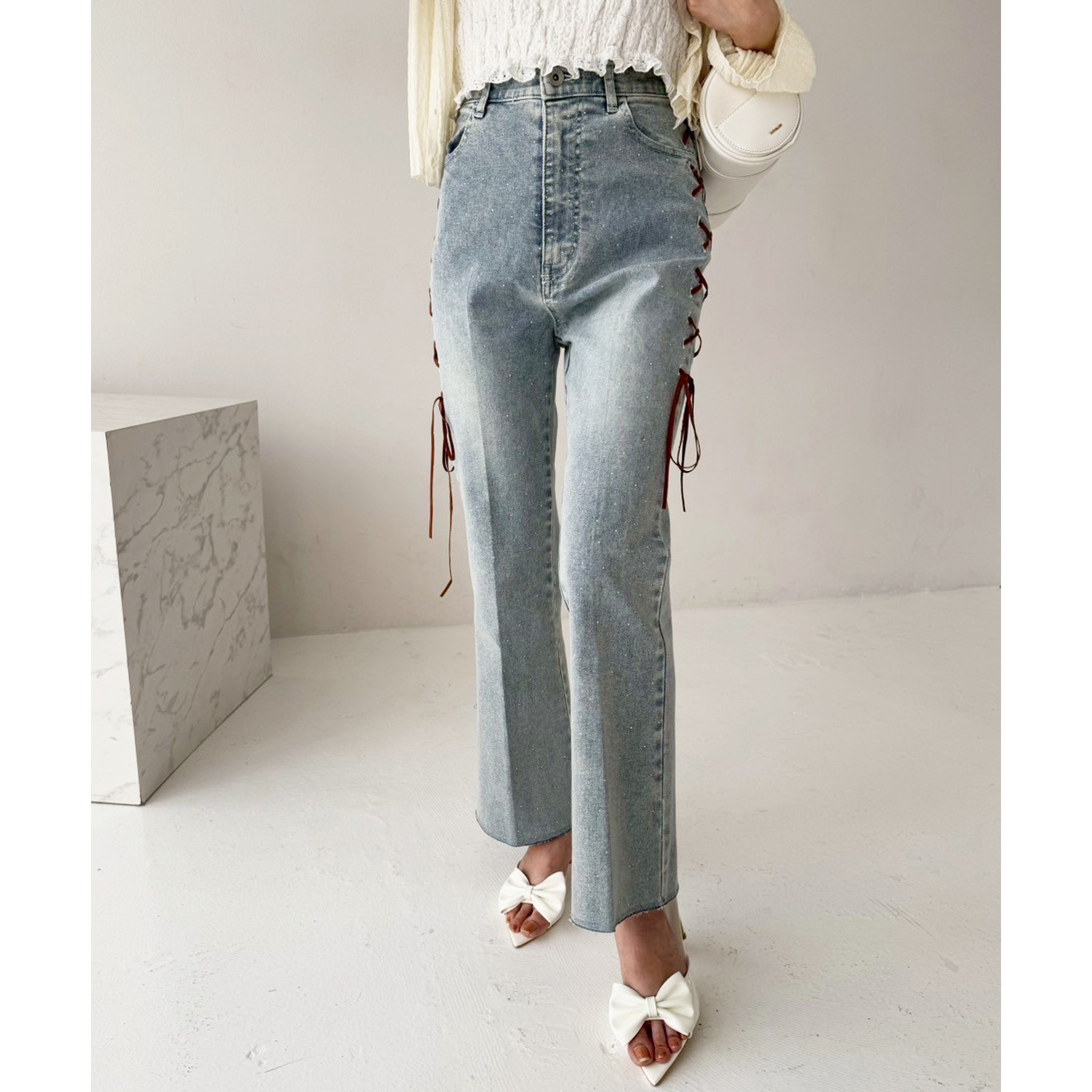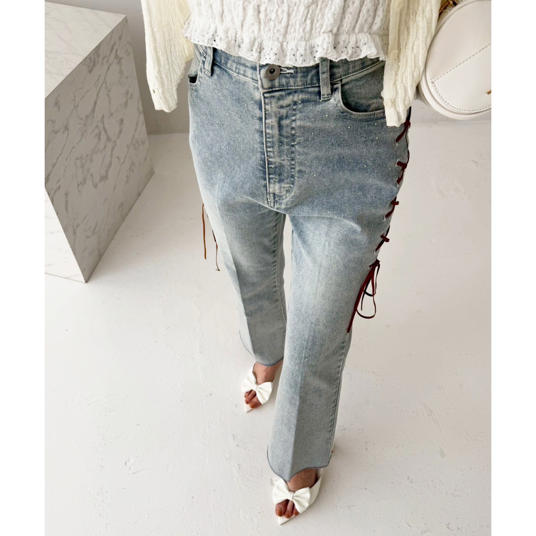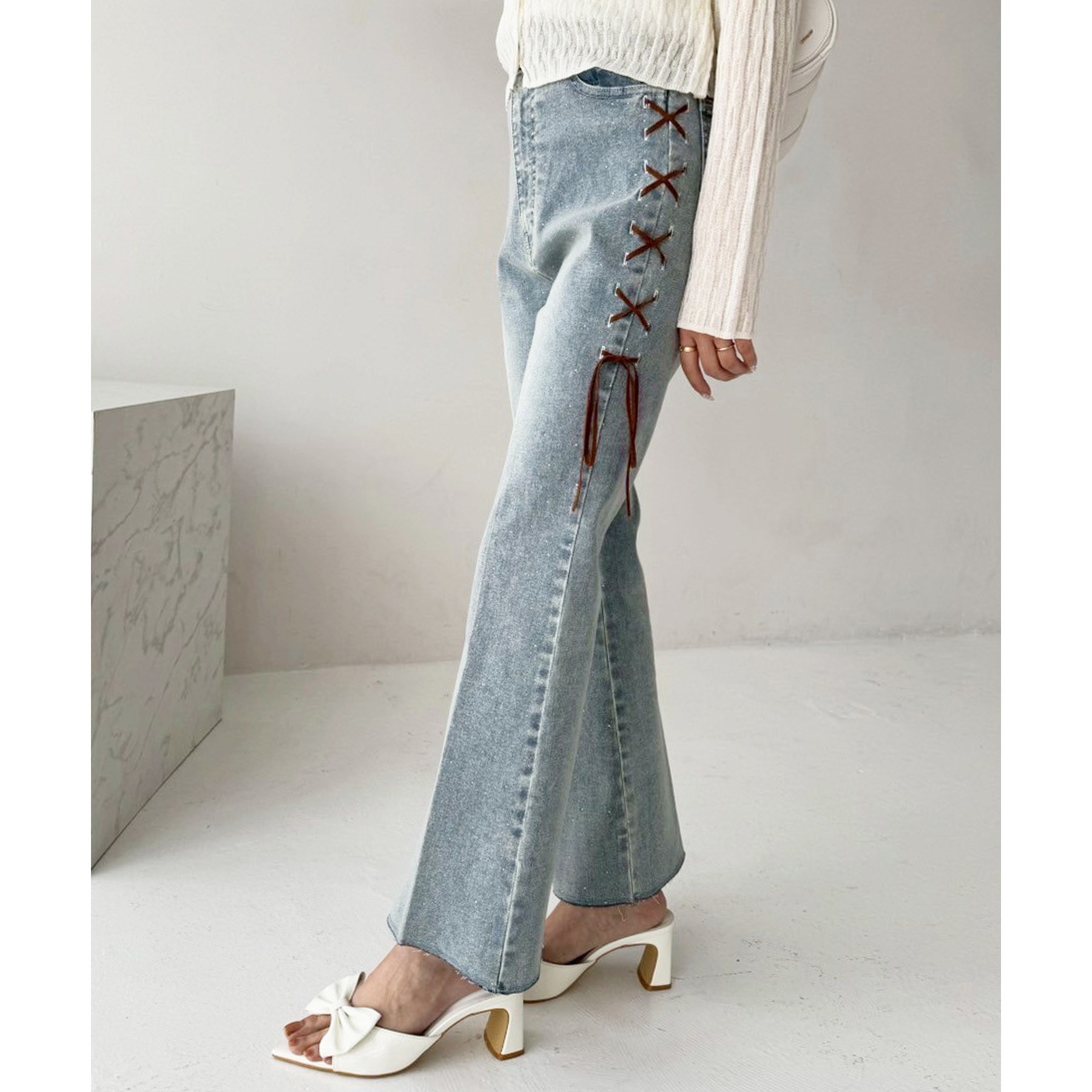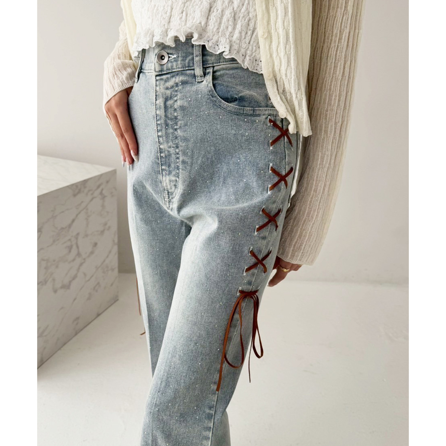 サイドのレースアップがおしゃれ見えするデニムパンツ