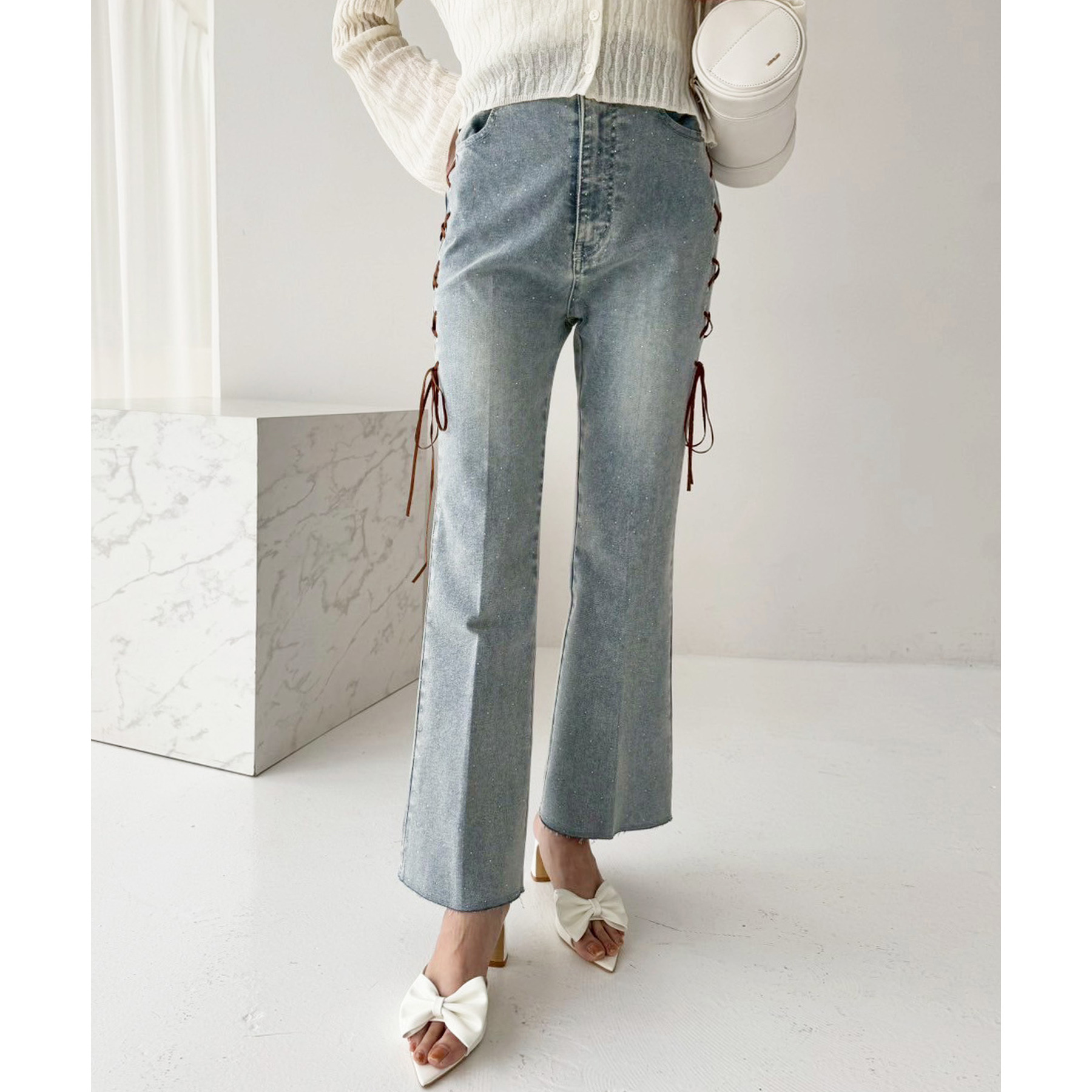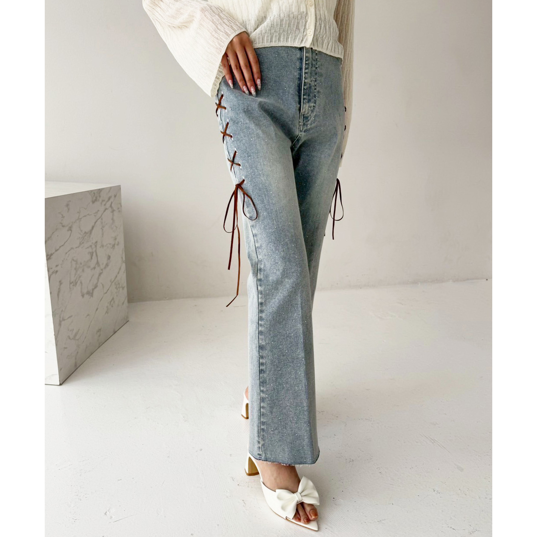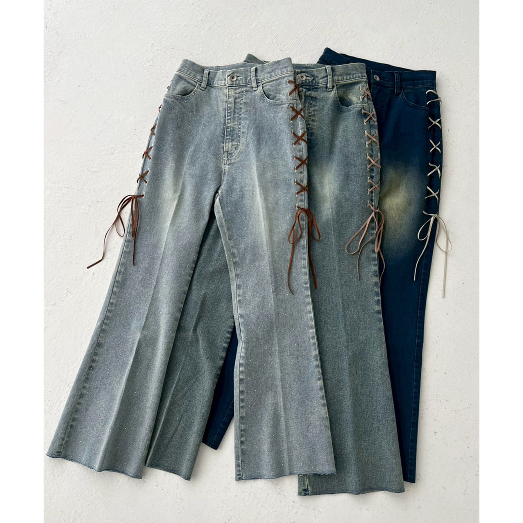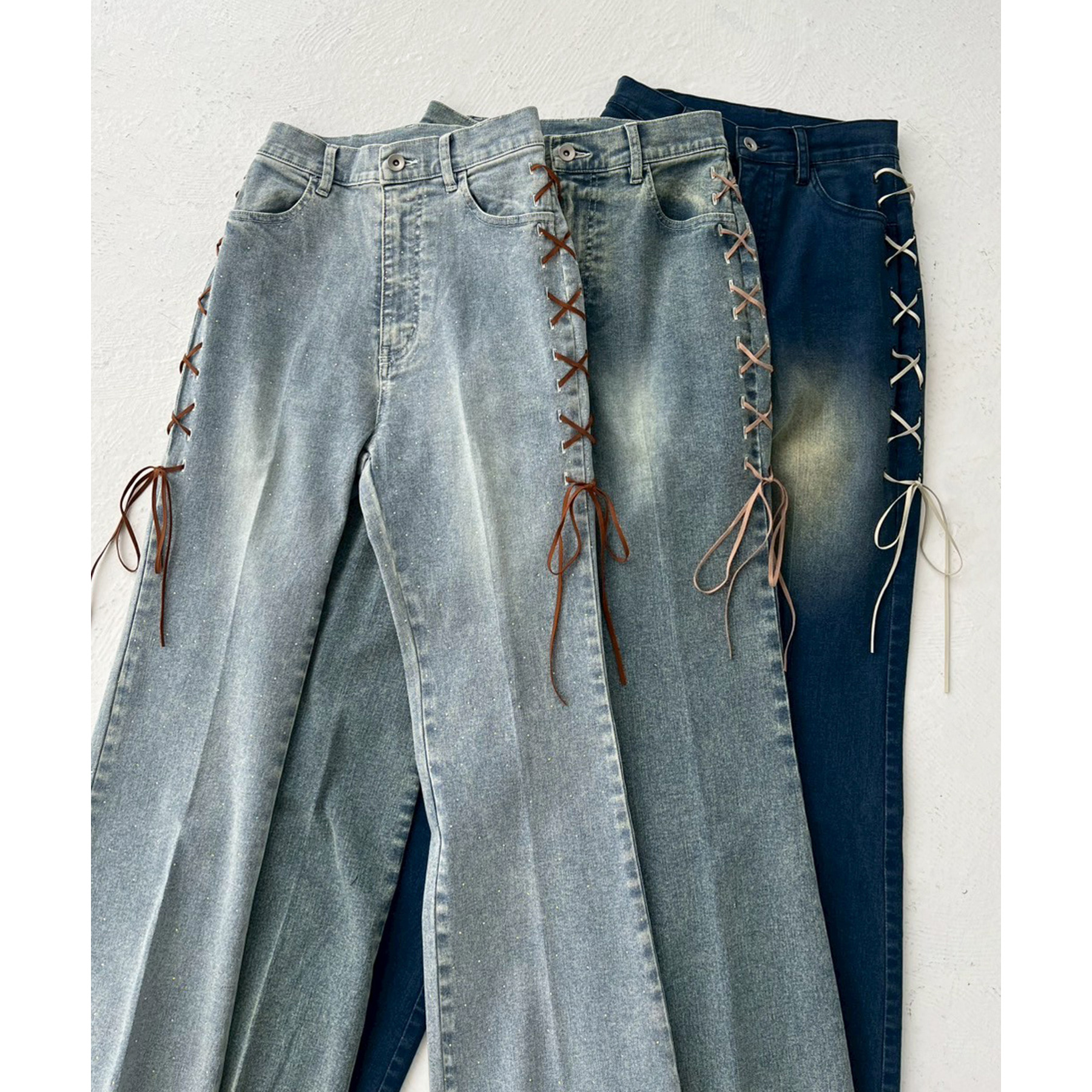 サイドのレースアップがおしゃれ見えするデニムパンツ