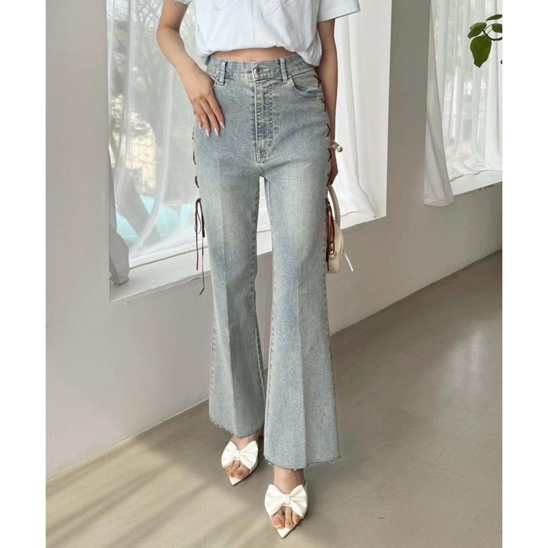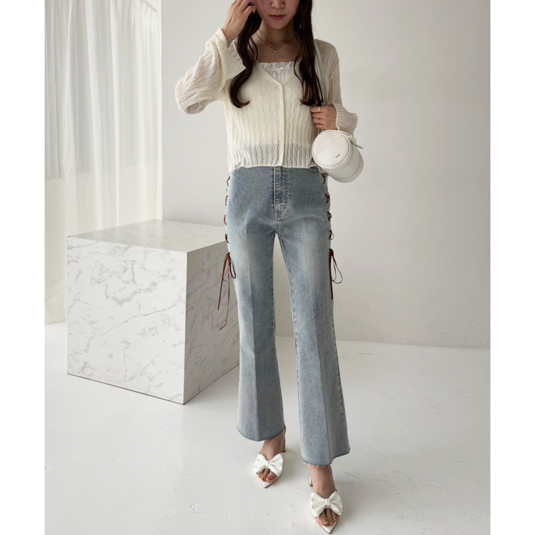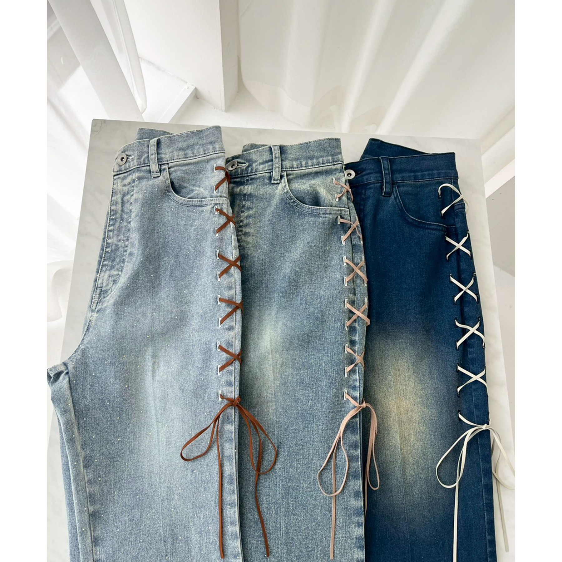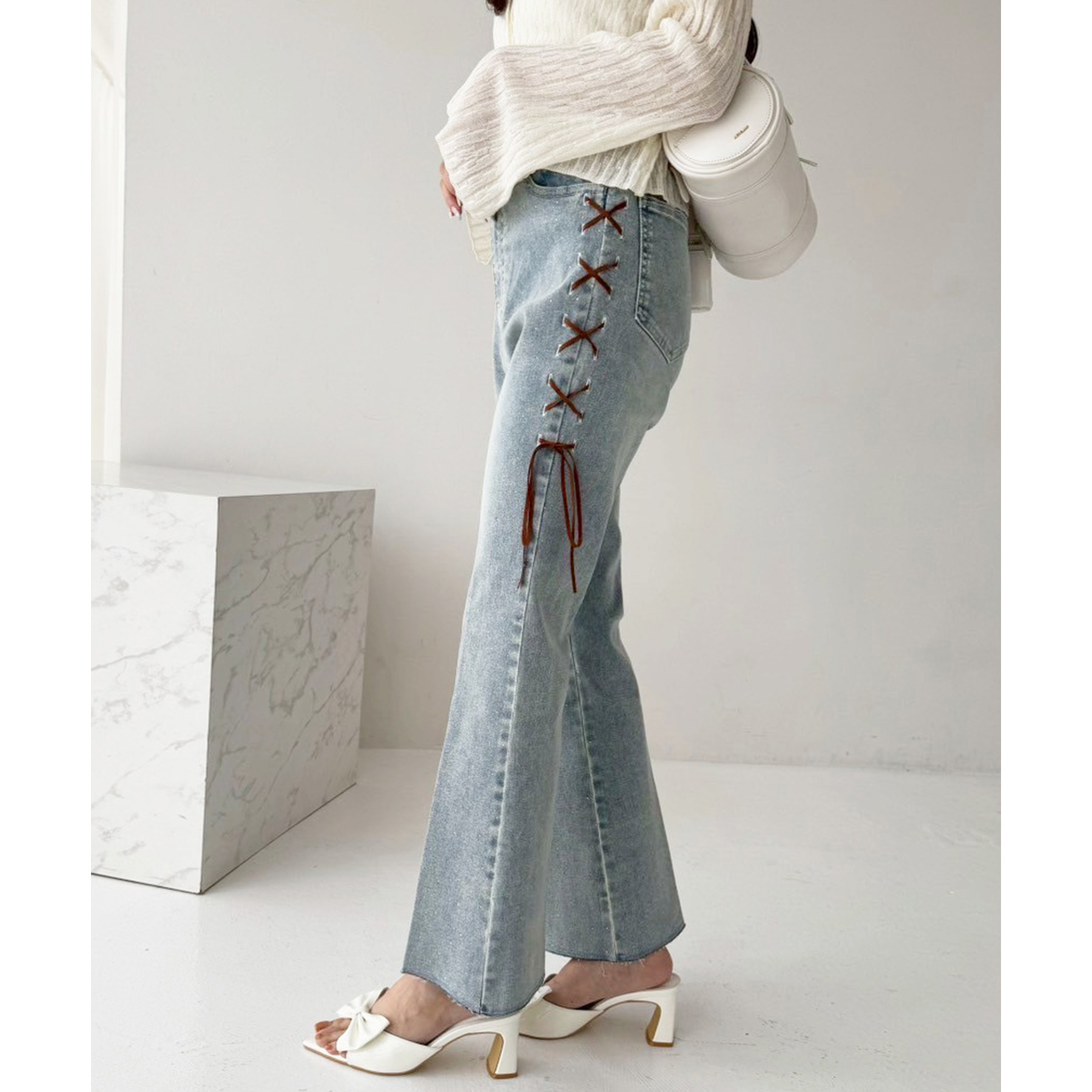 サイドのレースアップがおしゃれ見えするデニムパンツ