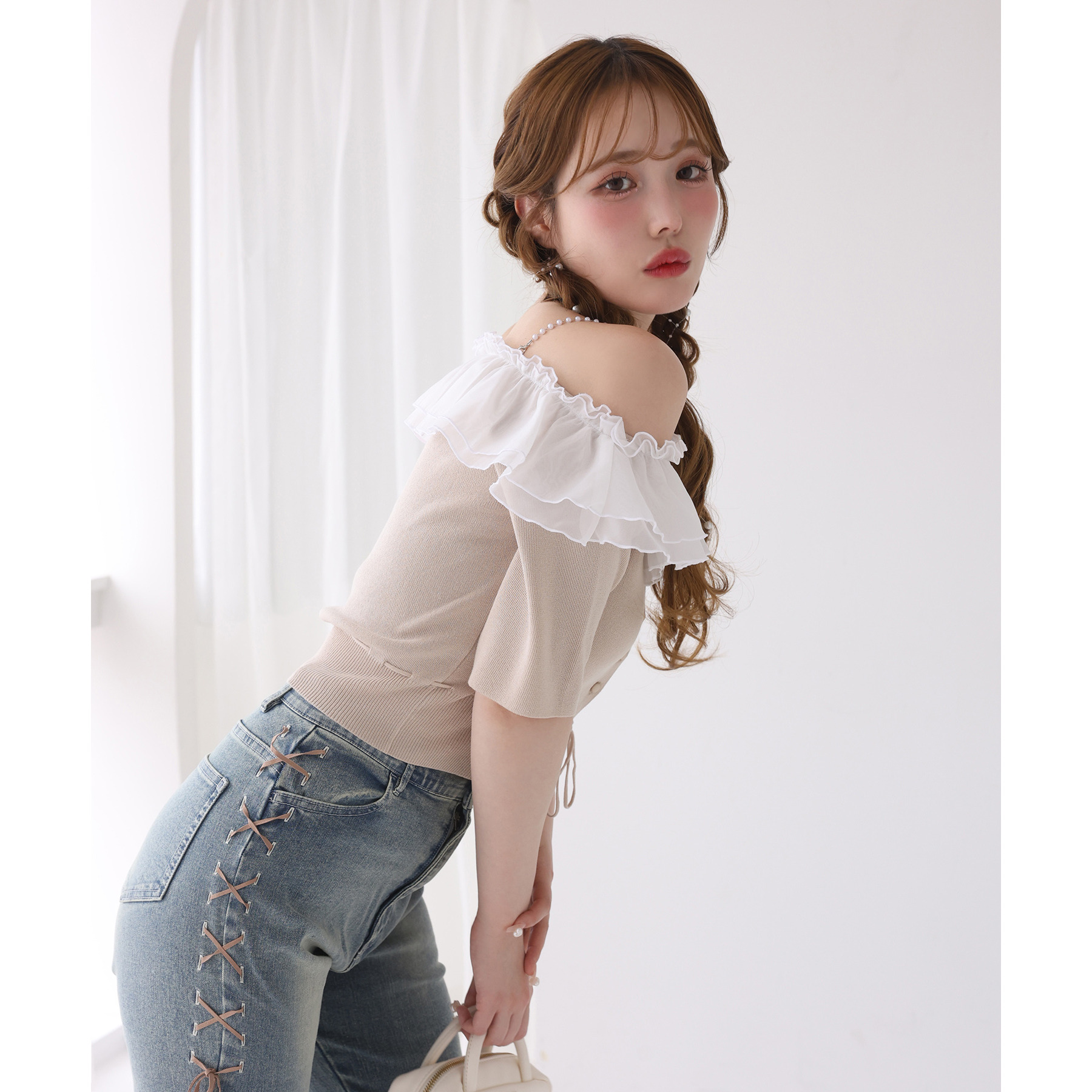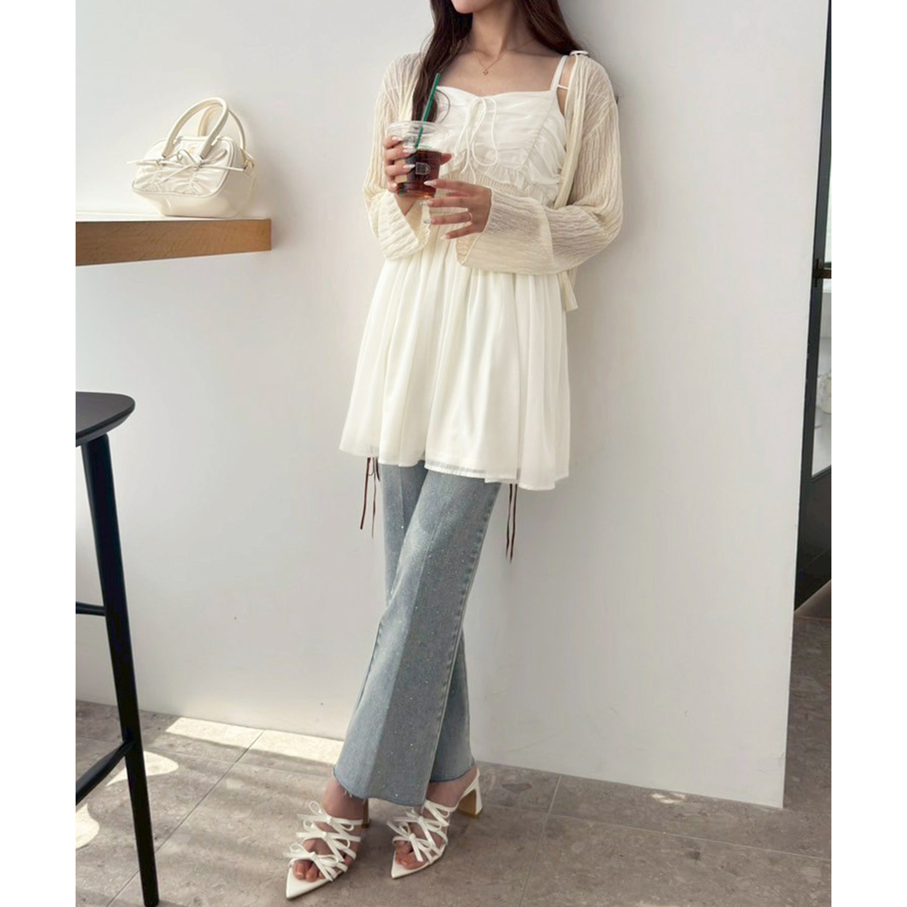 カジュアルになりやすいデニムは少し甘めなトップスとの合わせが今年らしい着こなしでおすすめ。