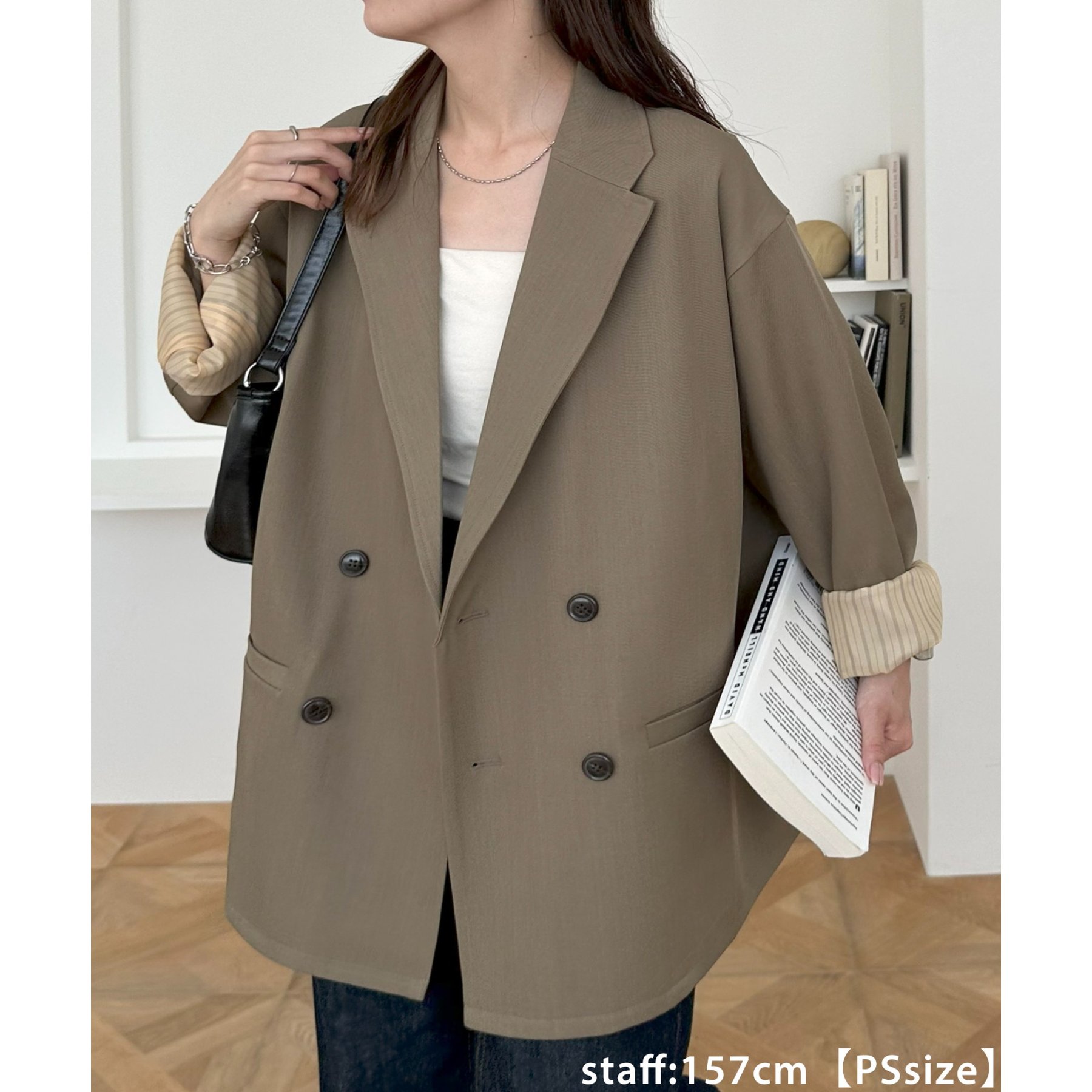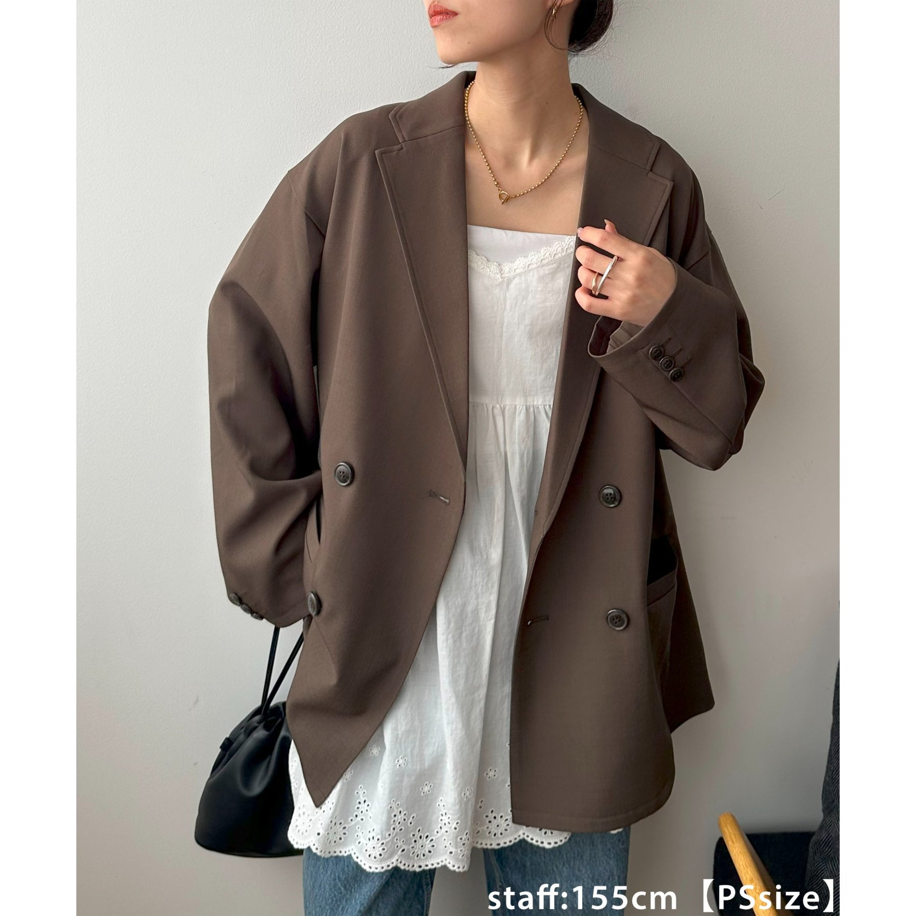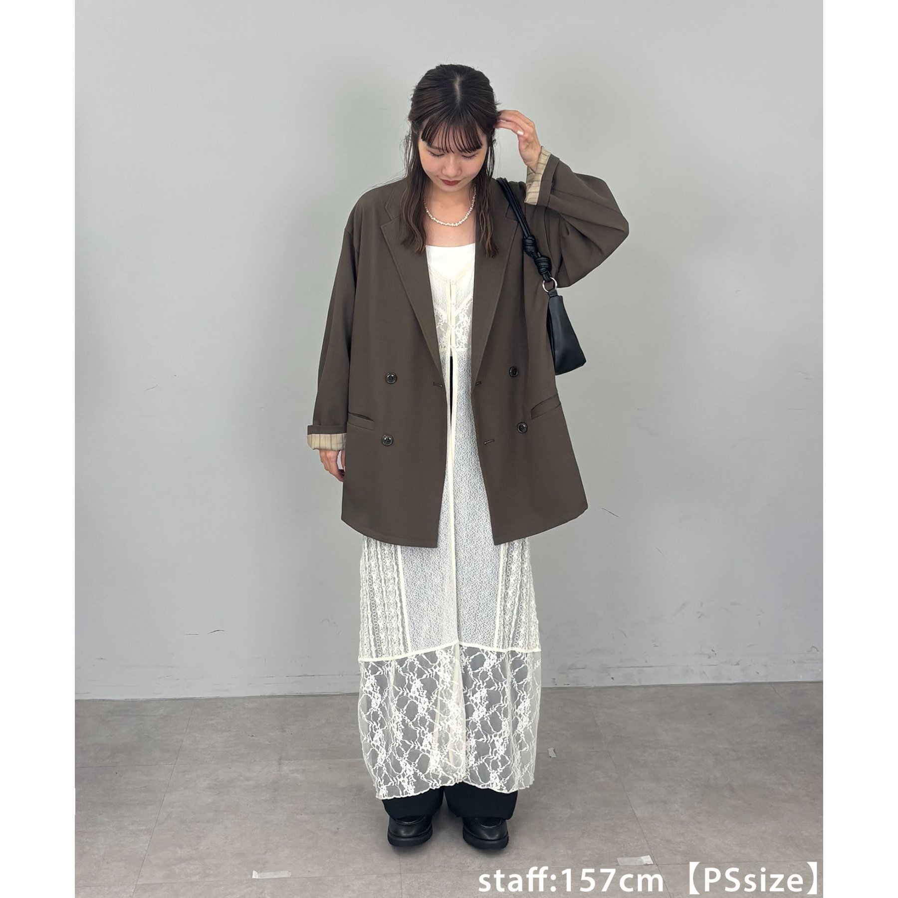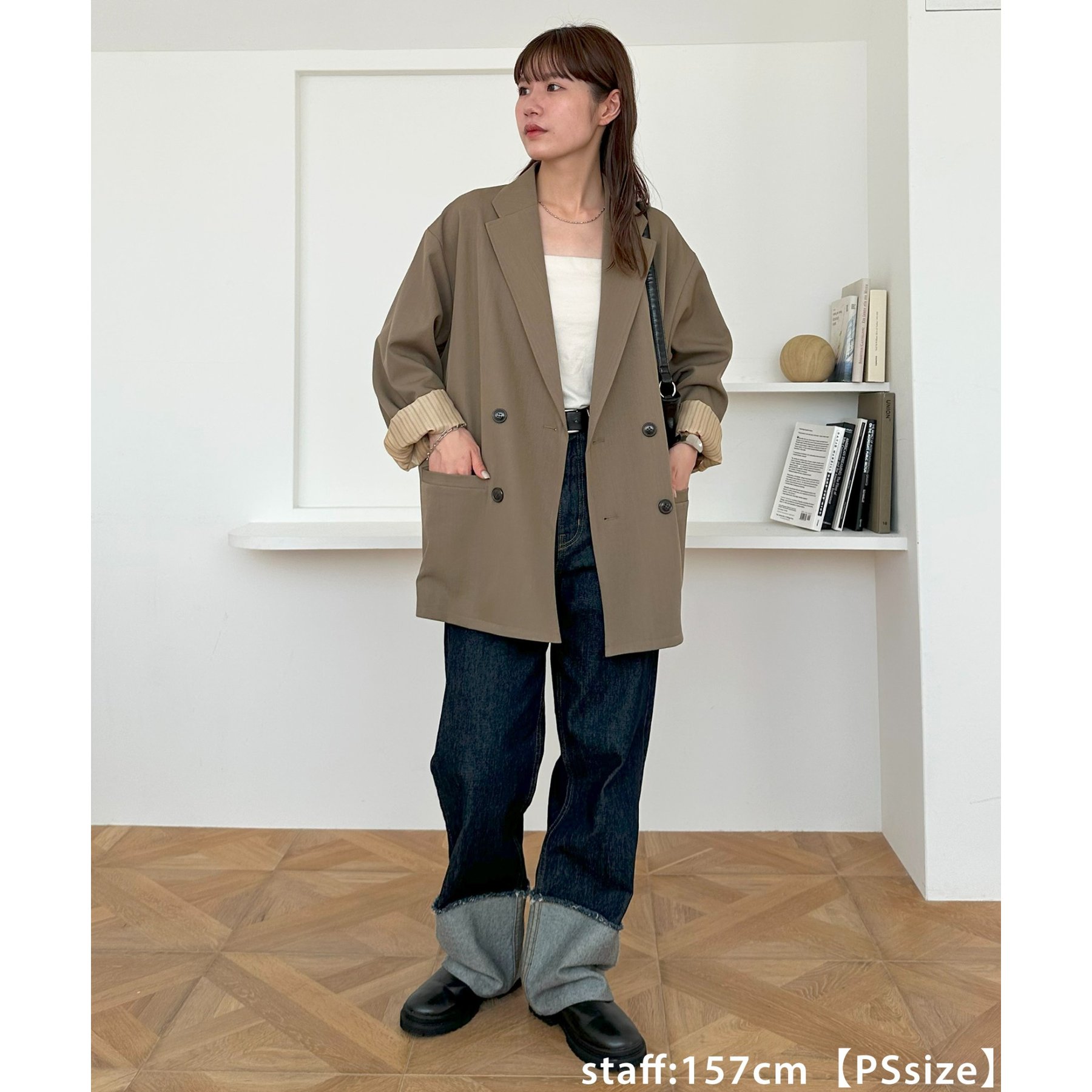 157cmレディーススタッフ:肩まわりは程よく落ちていて、ラフだけどきちんと感も出る絶妙なシルエット!パンツスタイルはもちろんワンピースにも合わせやすいです。