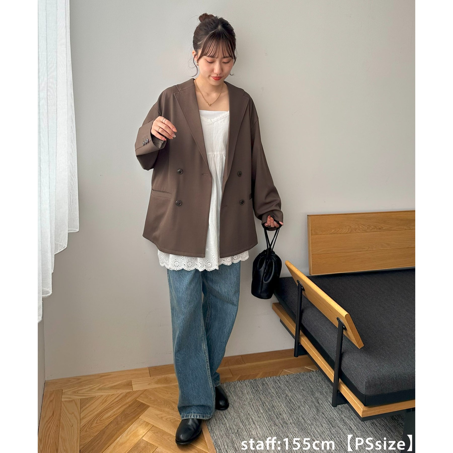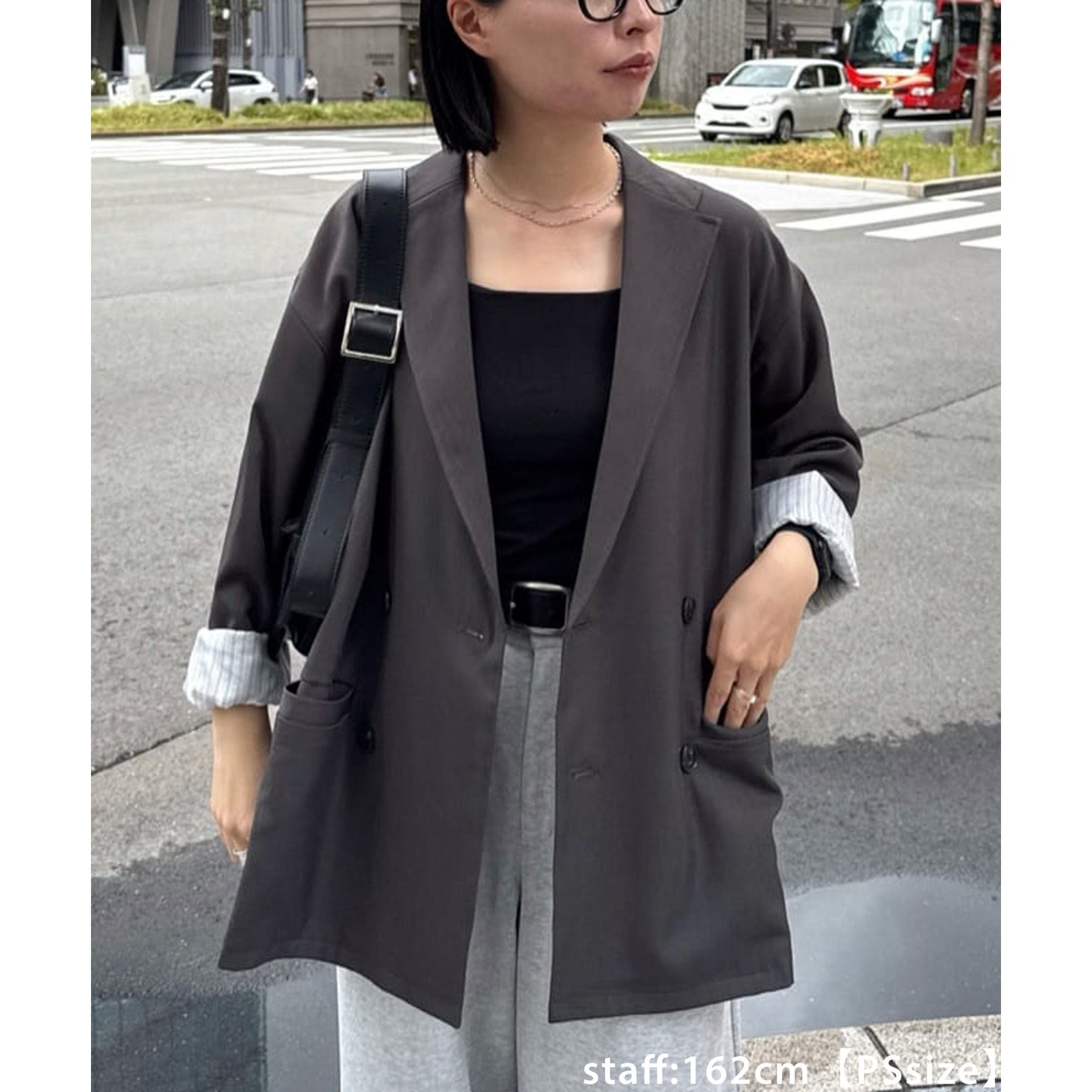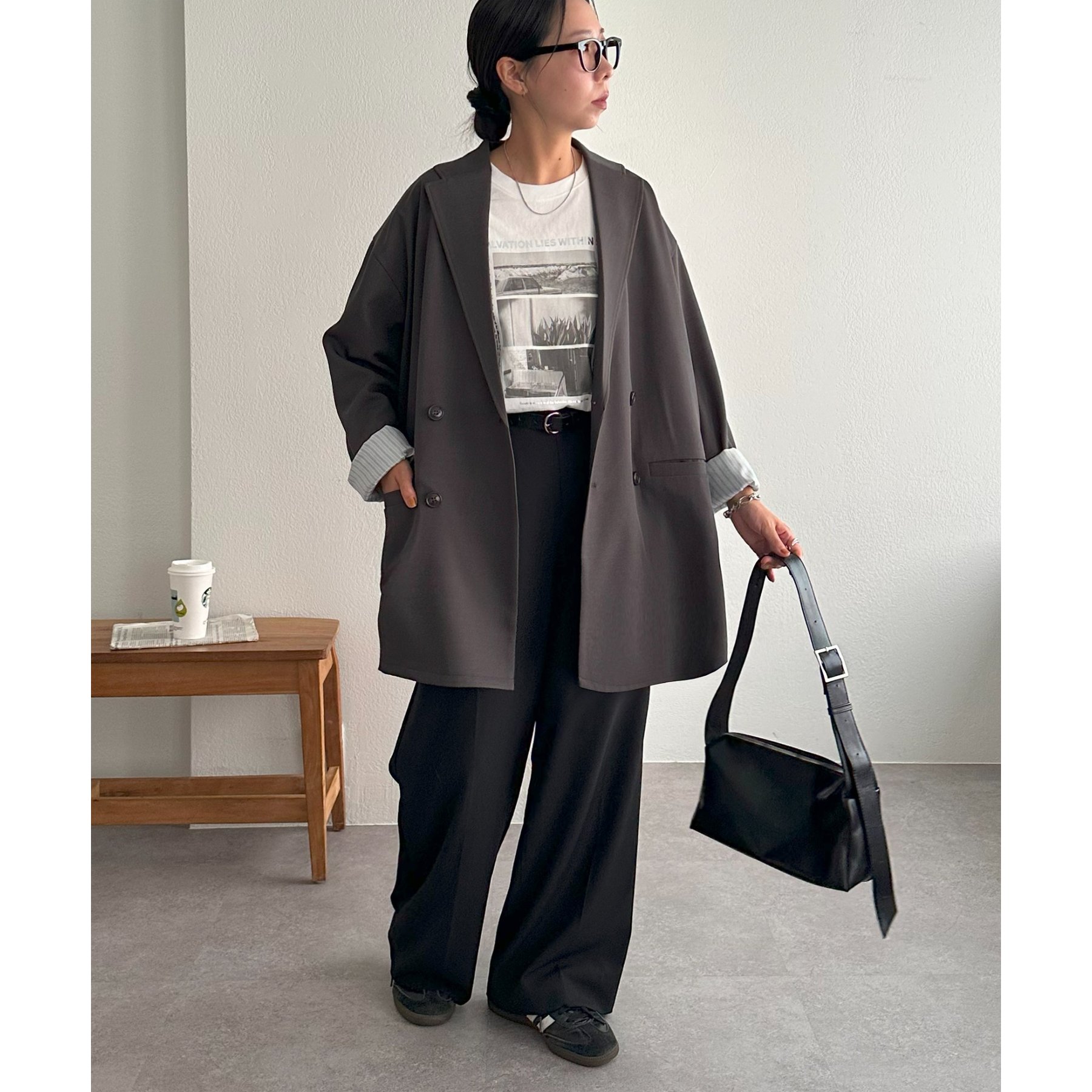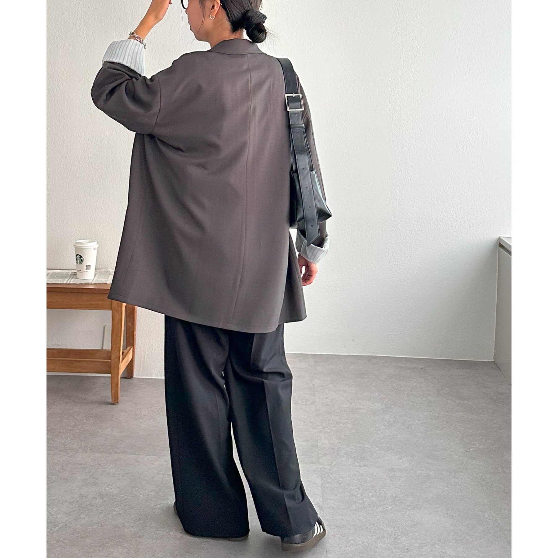 157cmレディーススタッフ:肩まわりは程よく落ちていて、ラフだけどきちんと感も出る絶妙なシルエット!パンツスタイルはもちろんワンピースにも合わせやすいです。
