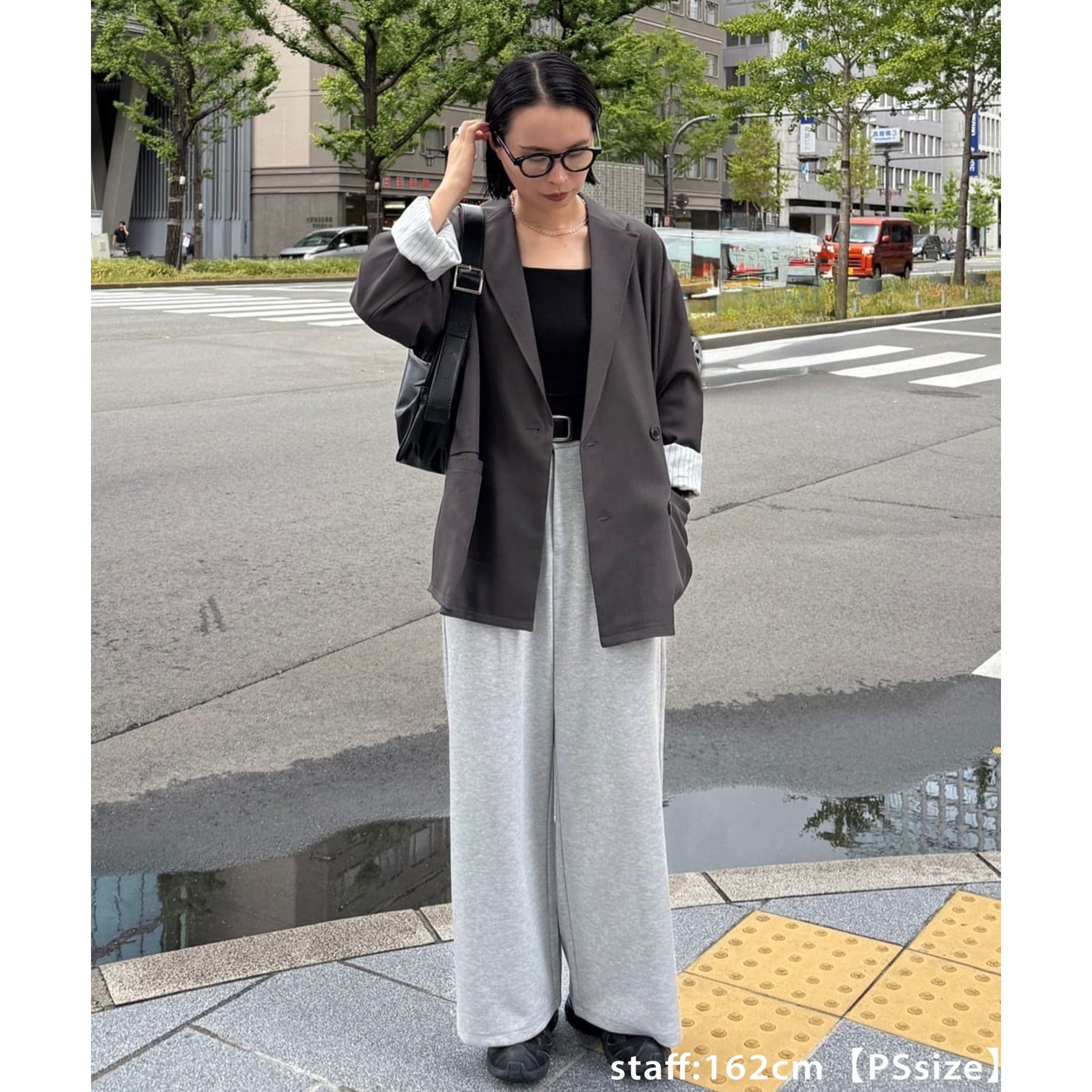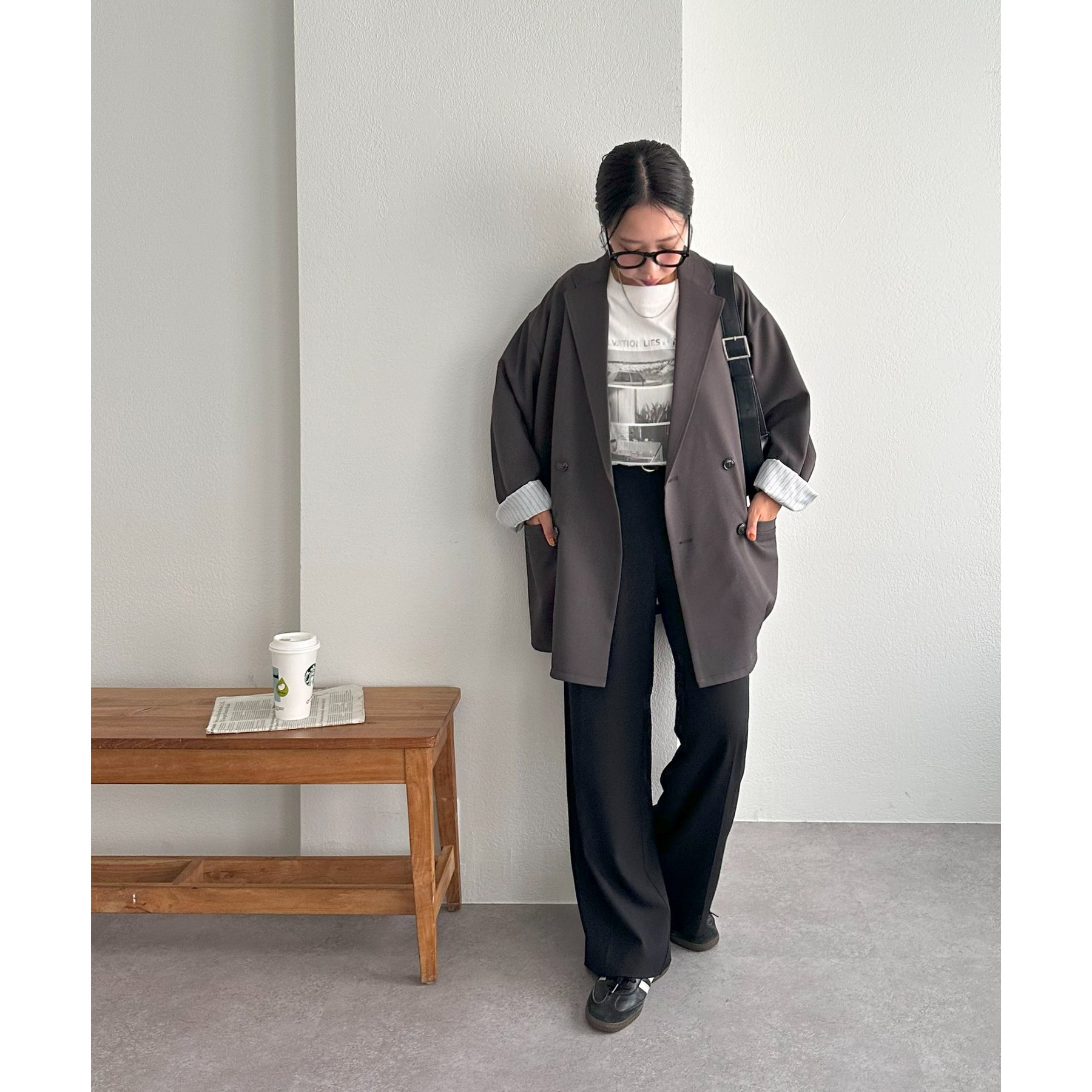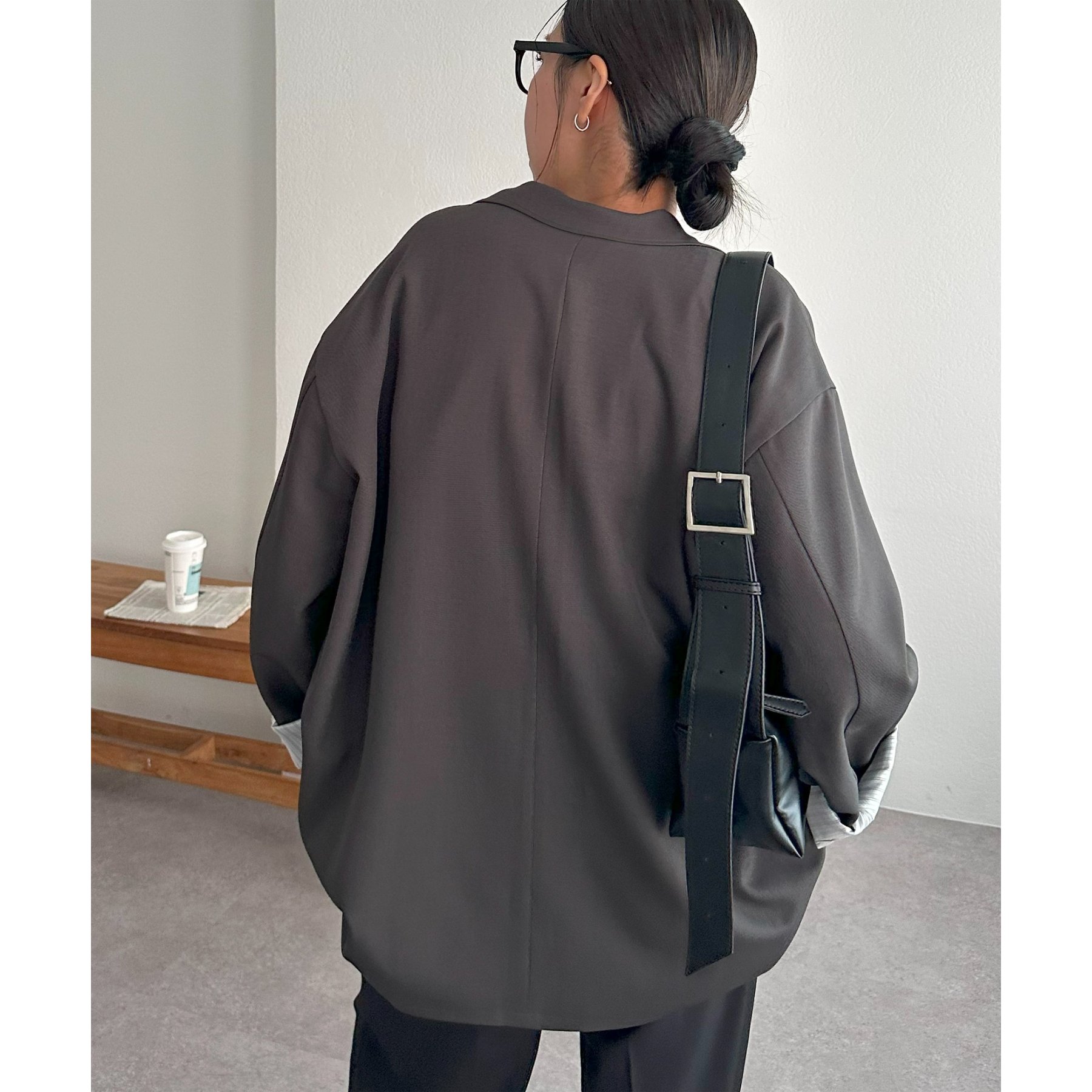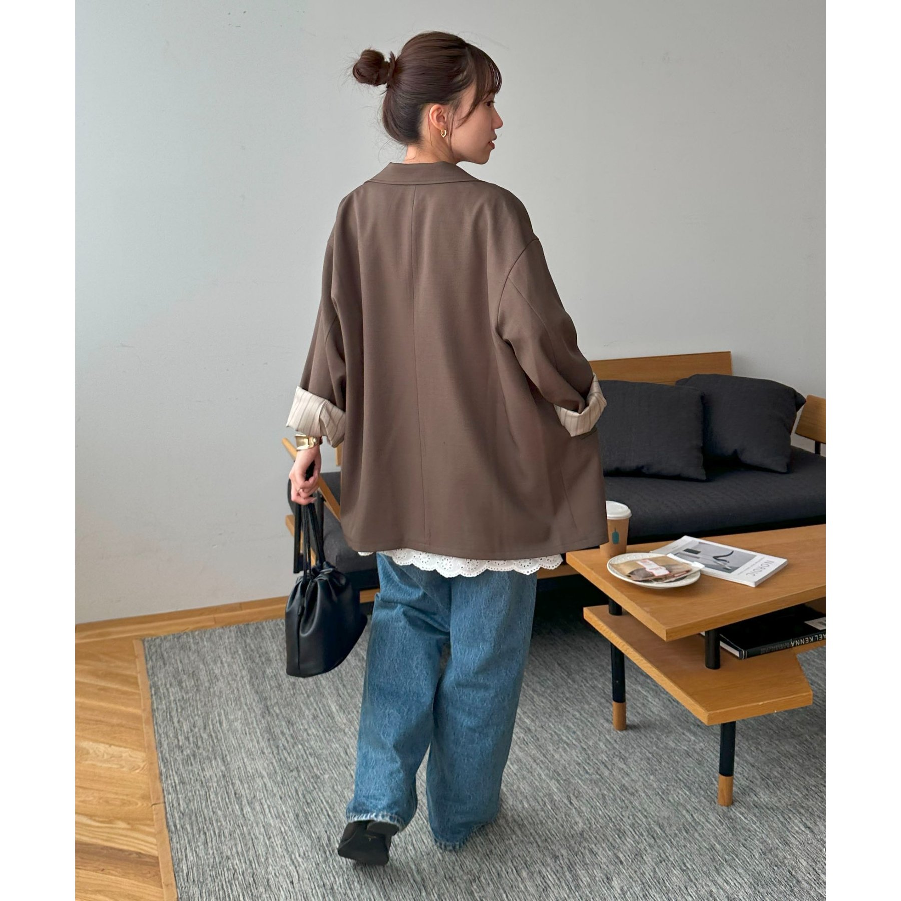 157cmレディーススタッフ:肩まわりは程よく落ちていて、ラフだけどきちんと感も出る絶妙なシルエット!パンツスタイルはもちろんワンピースにも合わせやすいです。