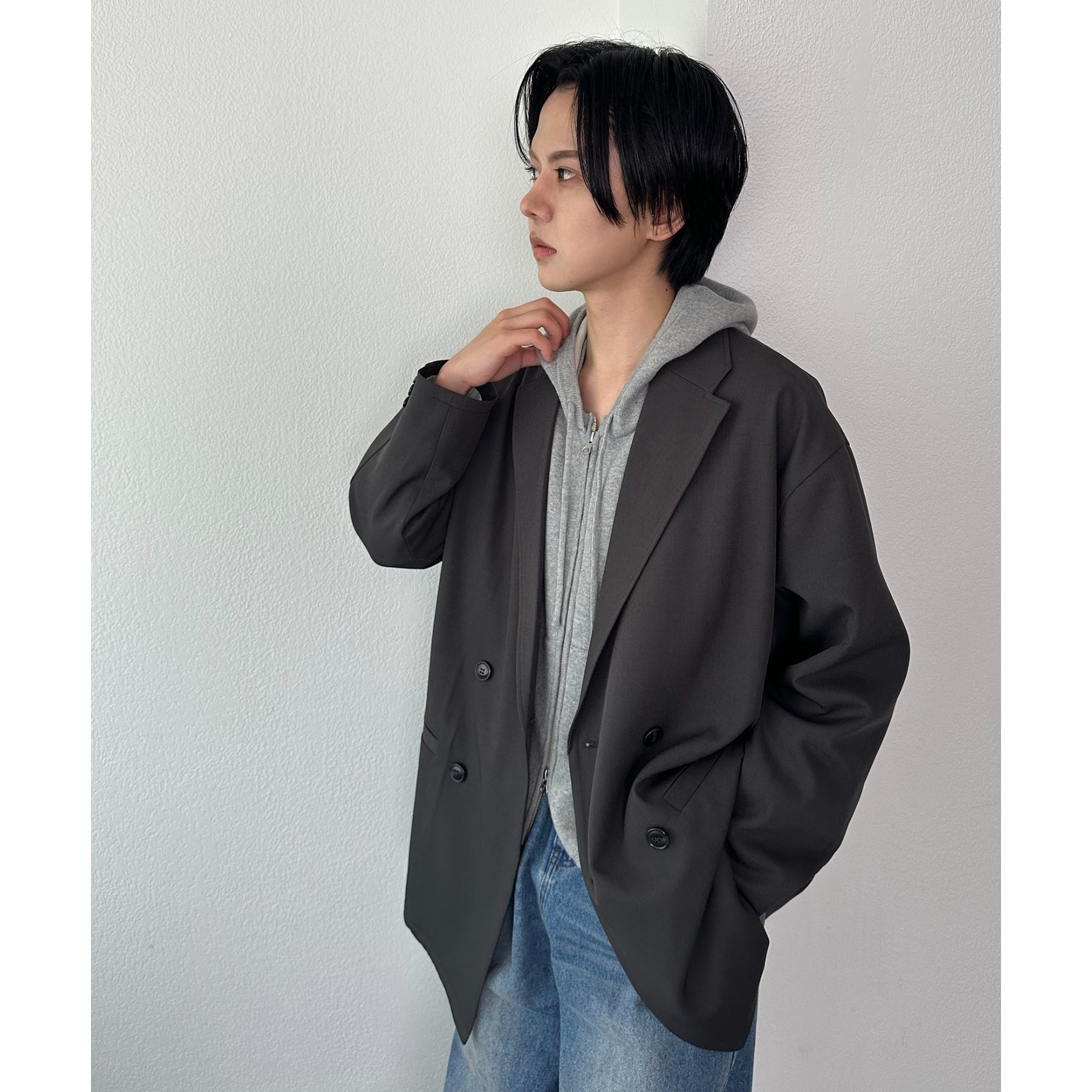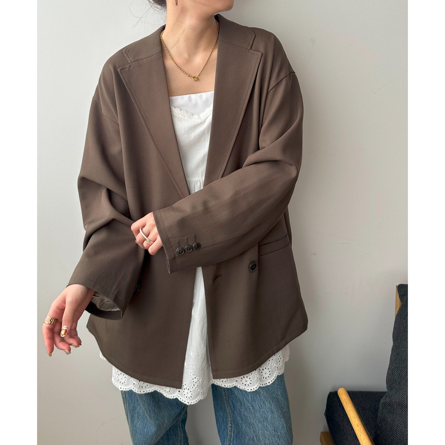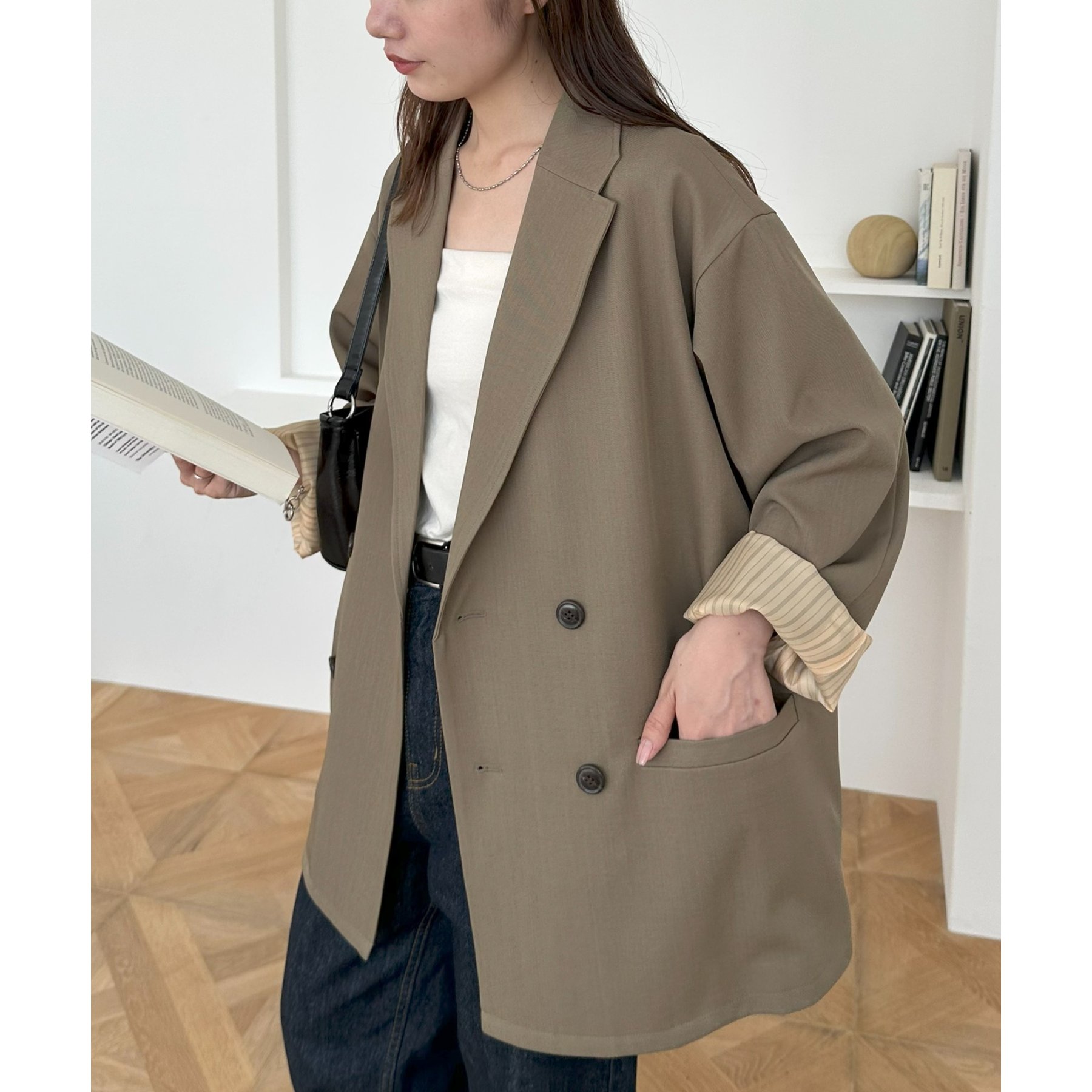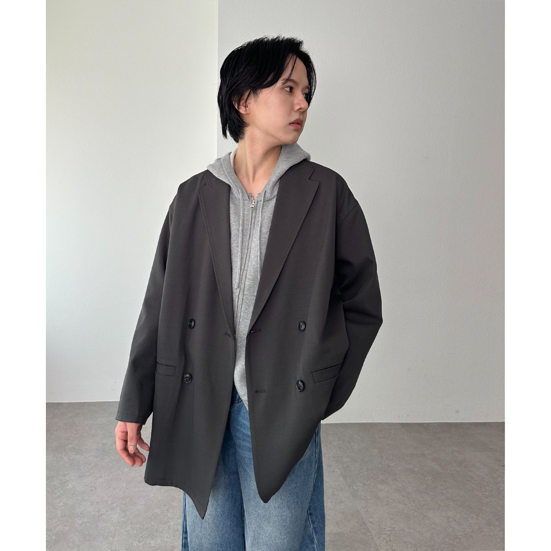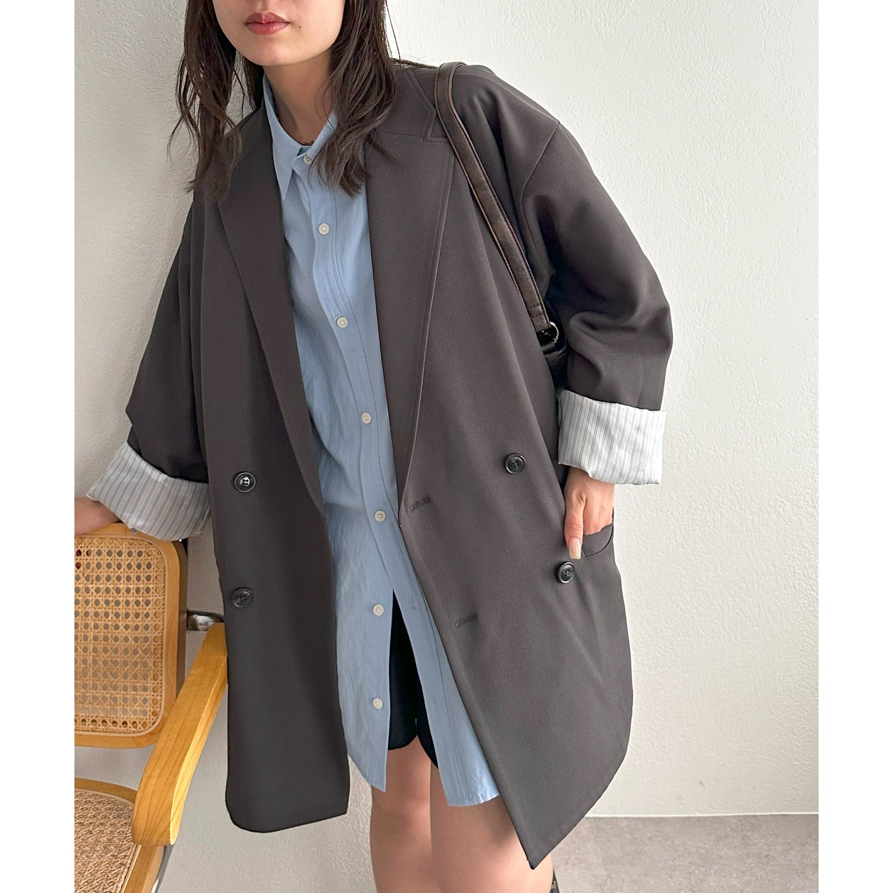 ゆったりとしたシルエットで、カチッとしすぎない柔らかさがありながらも、ダブルブレストデザインでしっかり感も備えたジャケット。