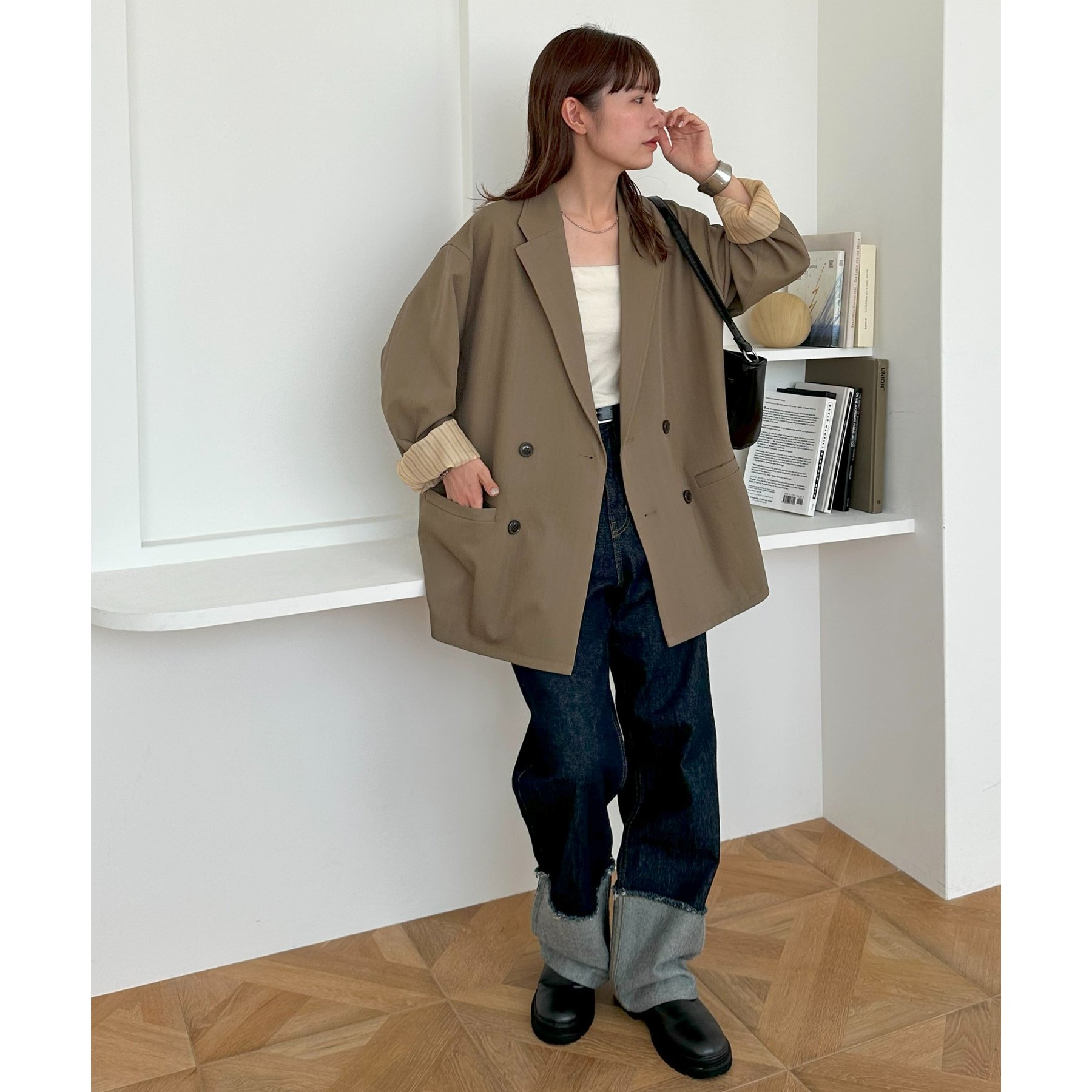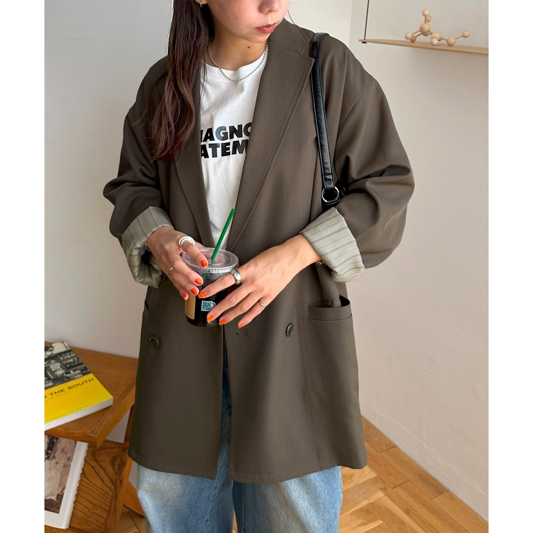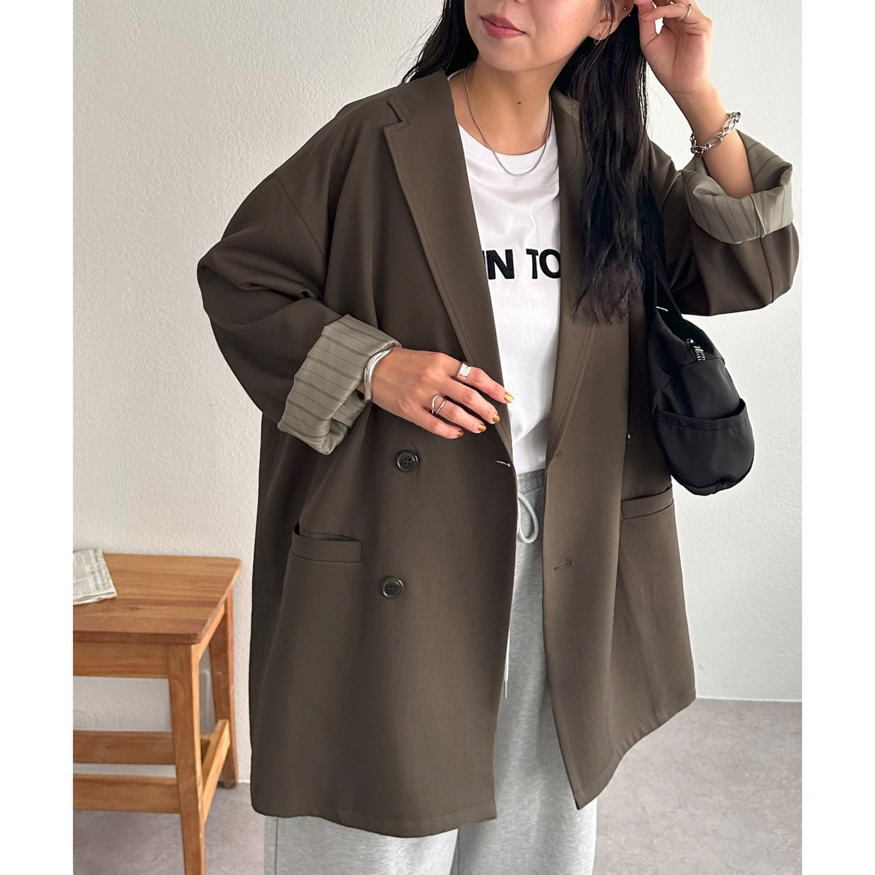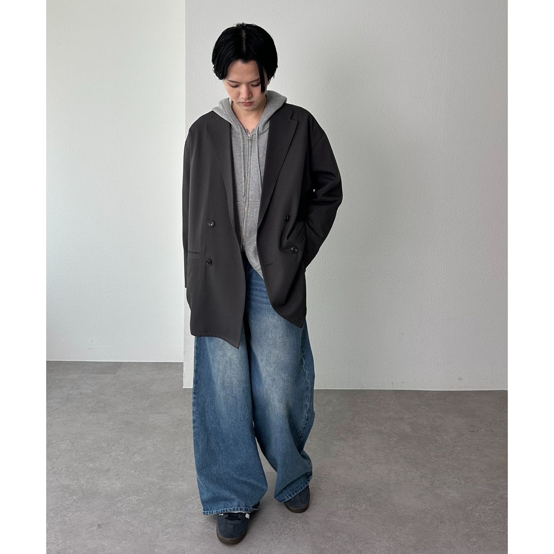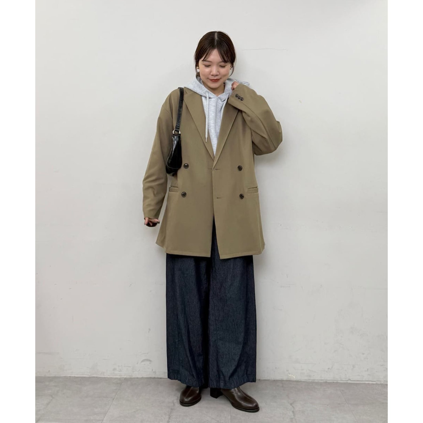 ゆったりとしたシルエットで、カチッとしすぎない柔らかさがありながらも、ダブルブレストデザインでしっかり感も備えたジャケット。