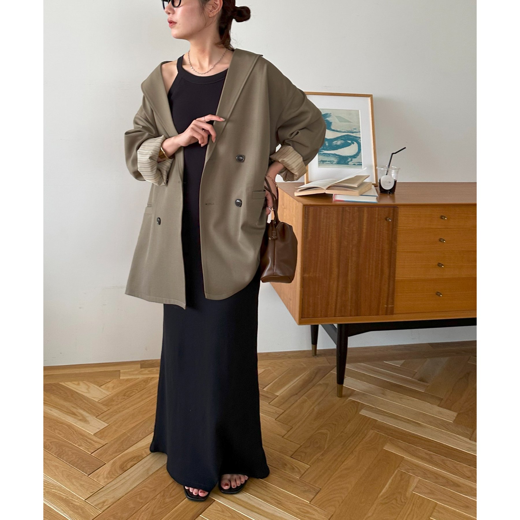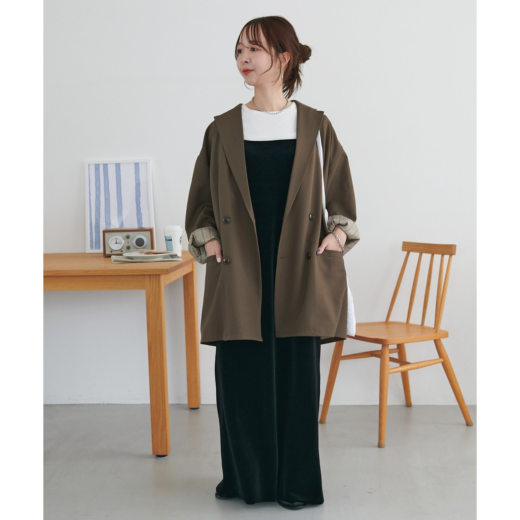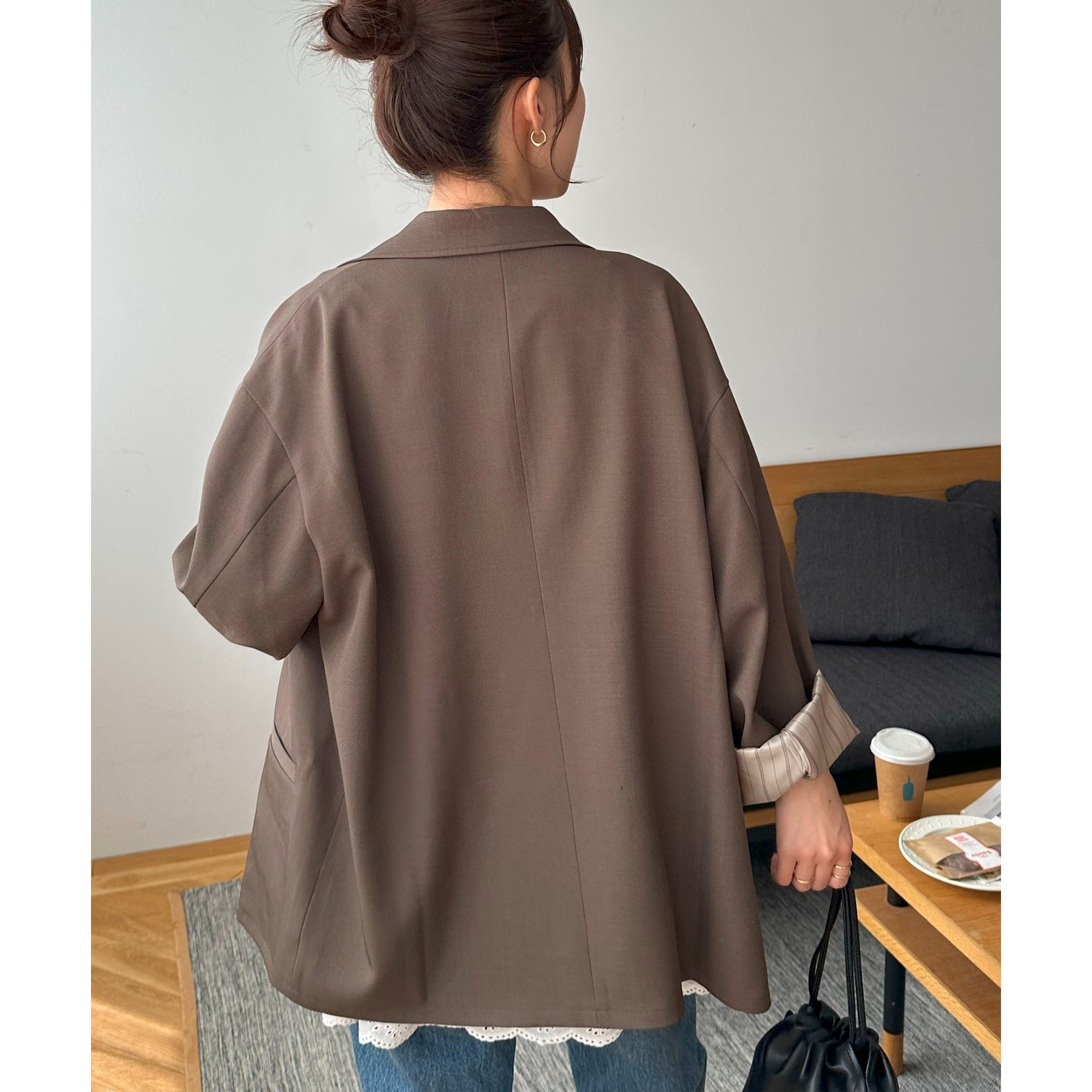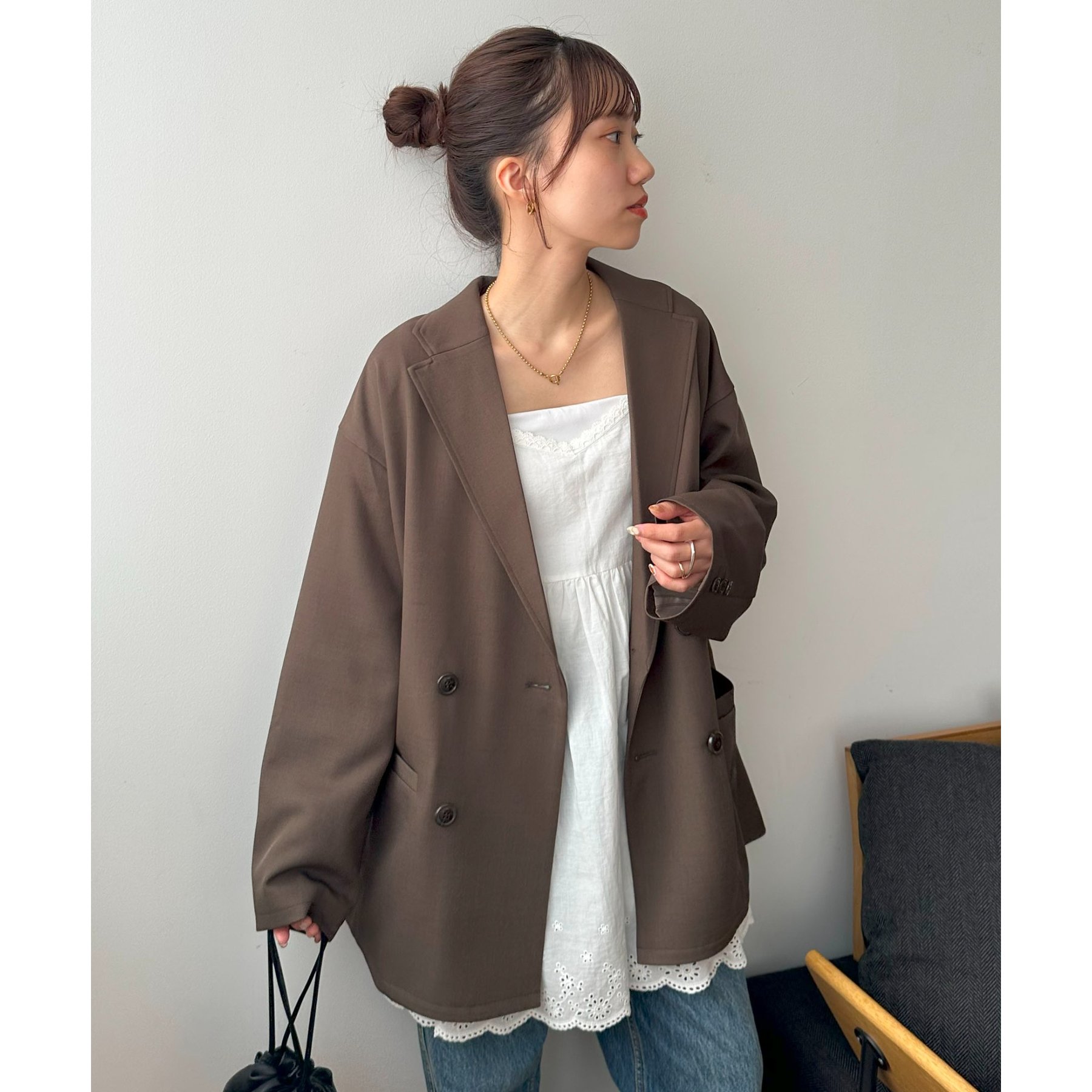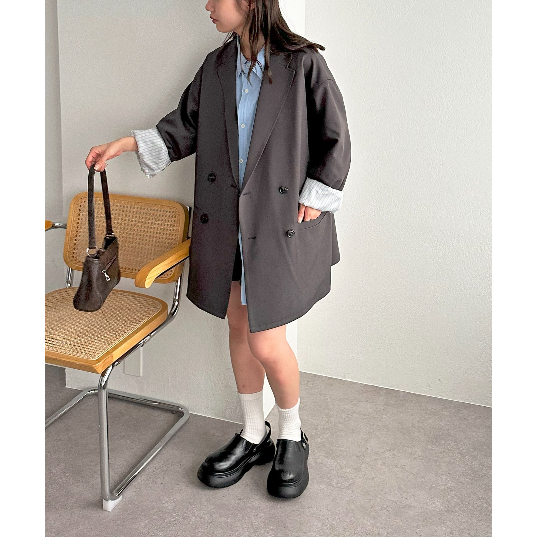 ゆったりとしたシルエットで、カチッとしすぎない柔らかさがありながらも、ダブルブレストデザインでしっかり感も備えたジャケット。