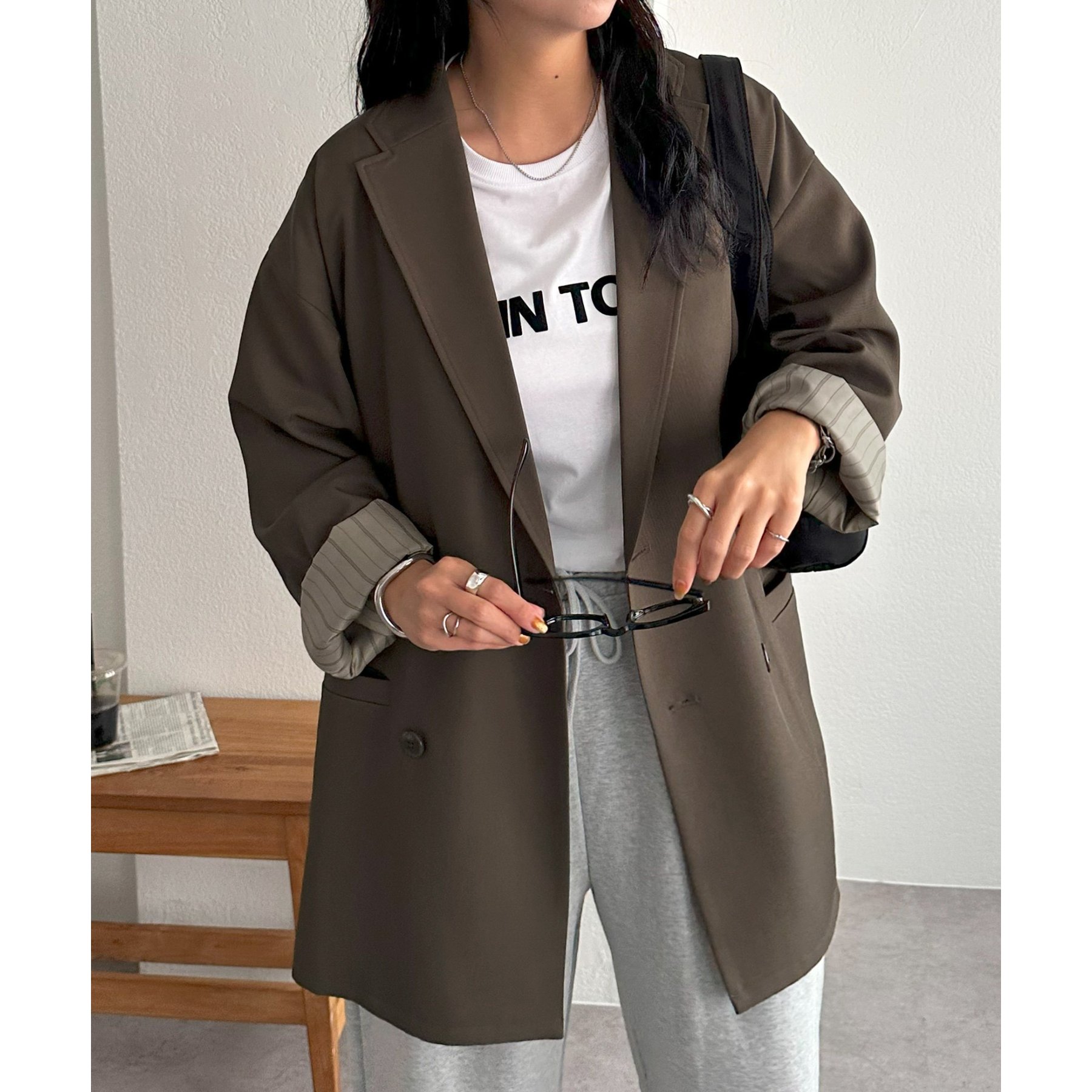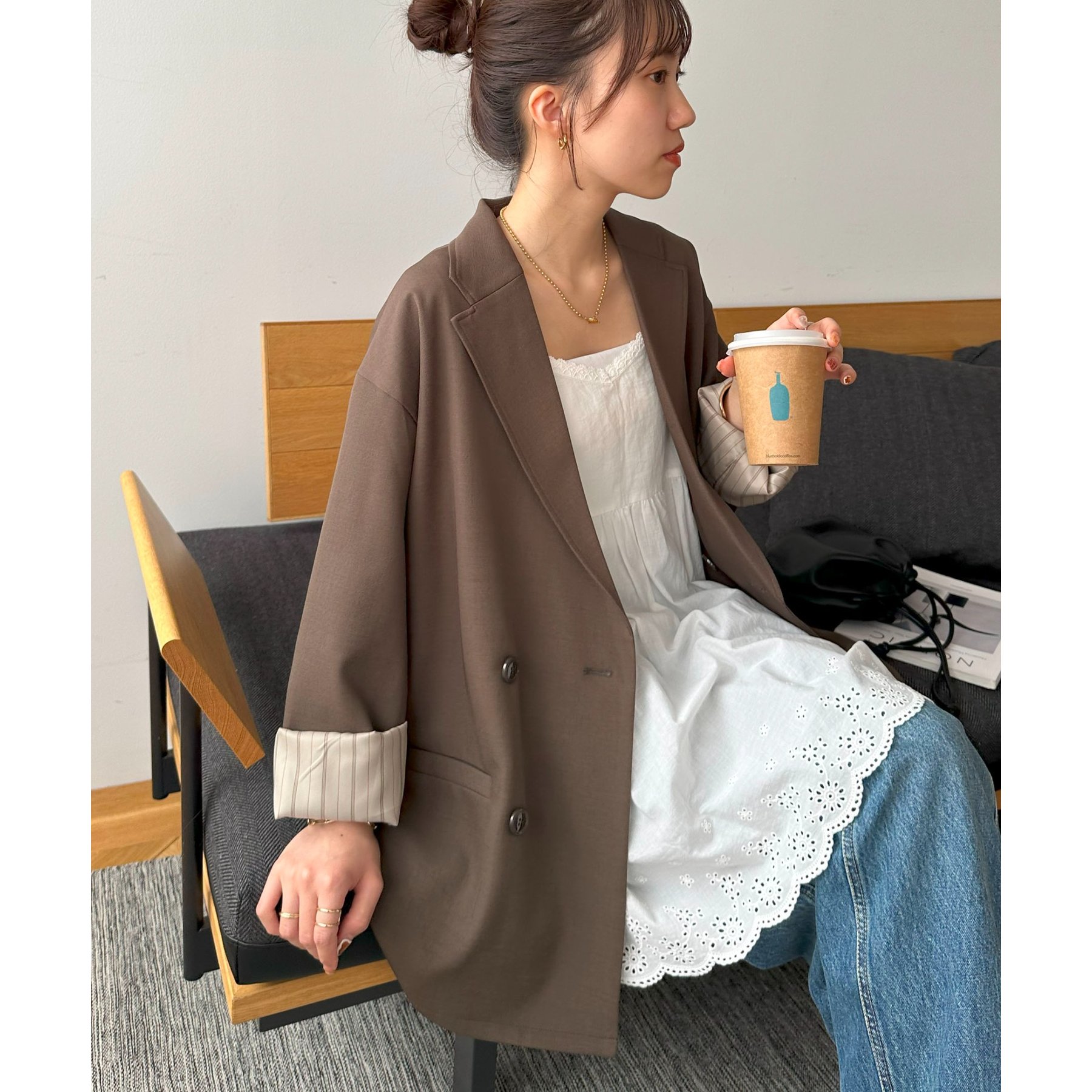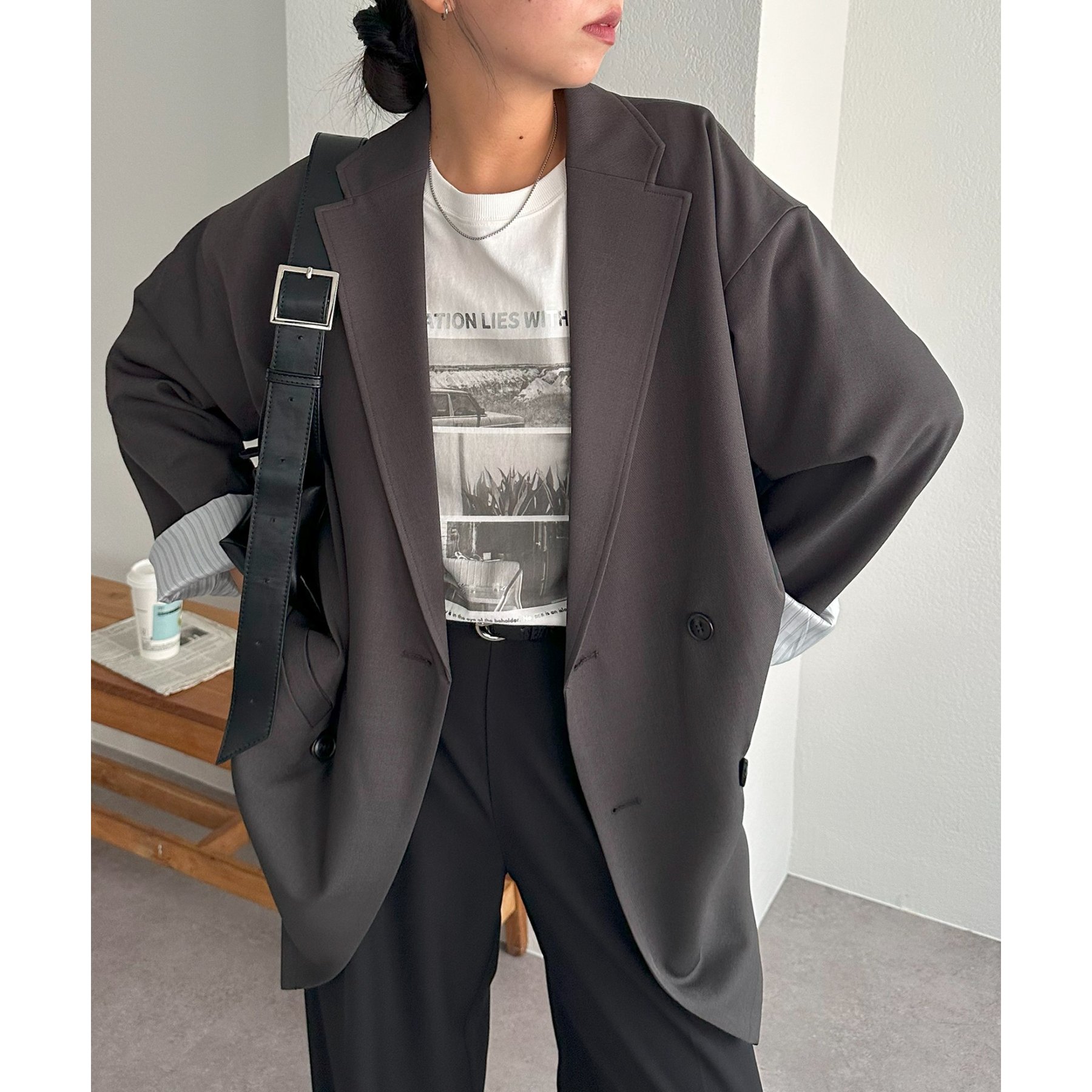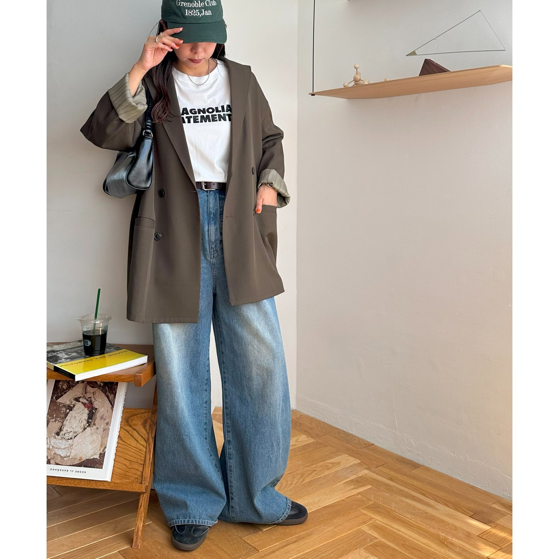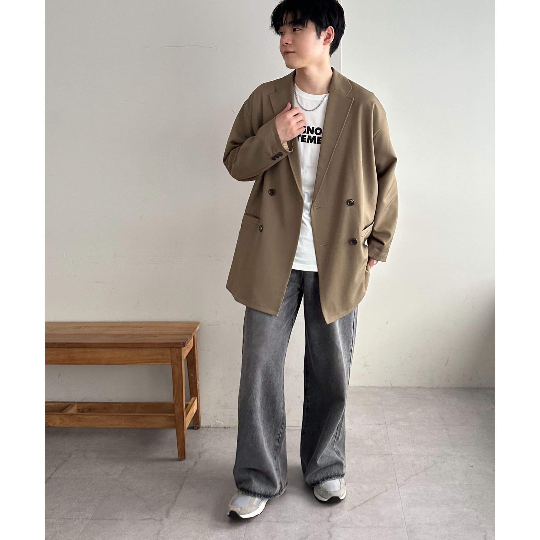 ゆったりとしたシルエットで、カチッとしすぎない柔らかさがありながらも、ダブルブレストデザインでしっかり感も備えたジャケット。