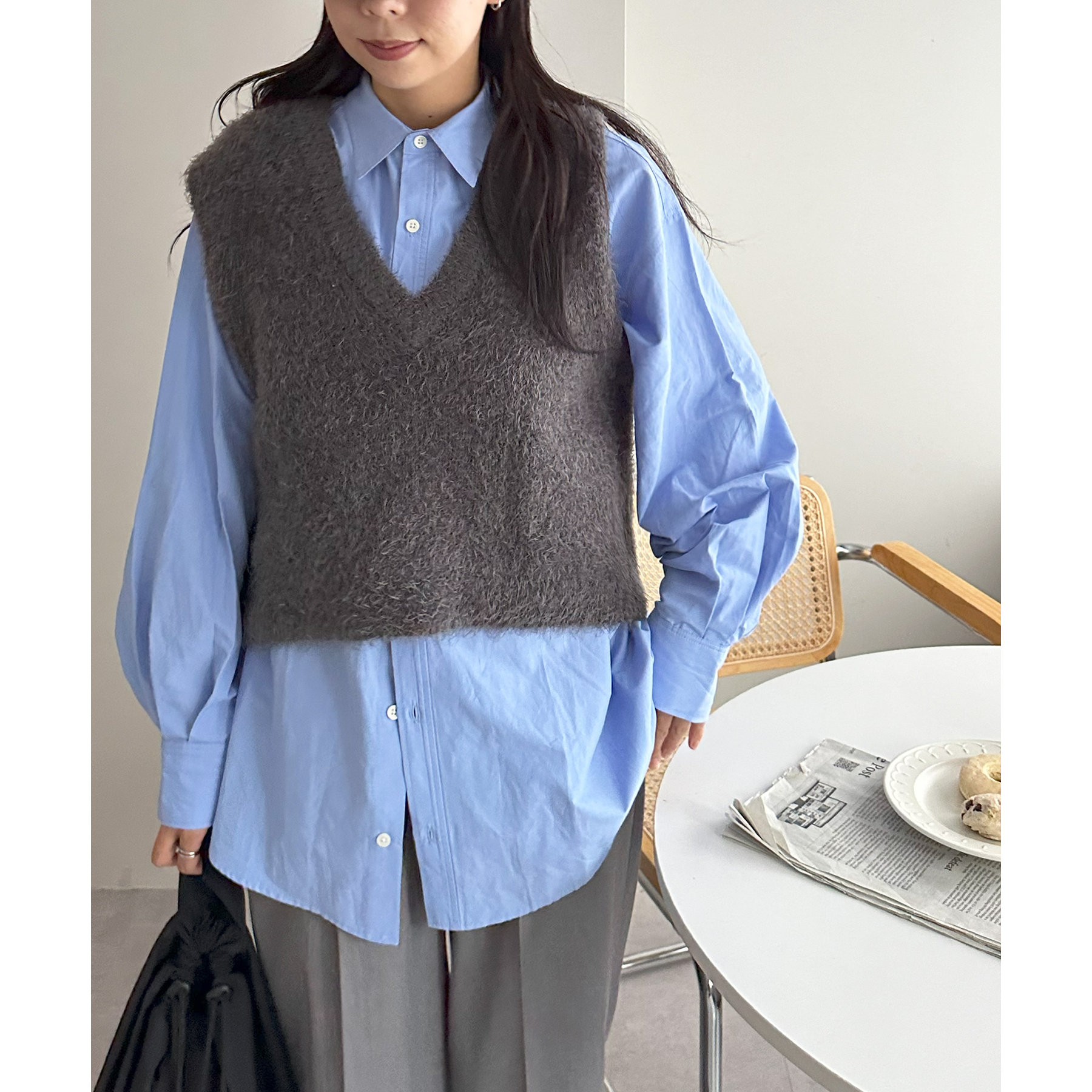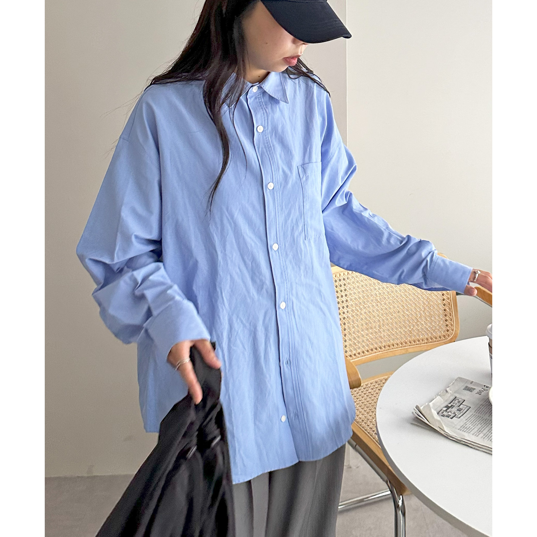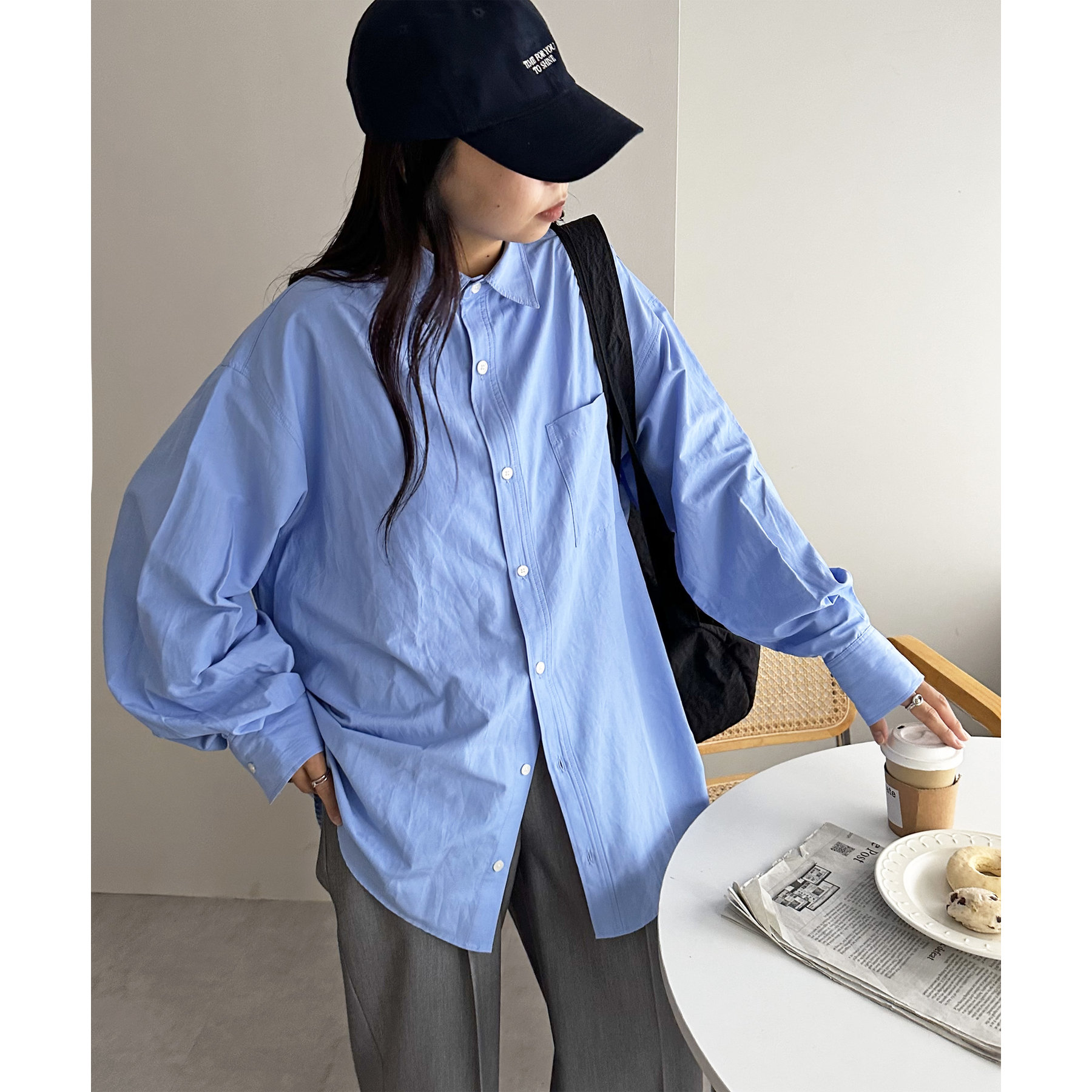 オーバーサイズですが、裾に施されたスリットやボリュームスリーブが抜け感をプラス〇