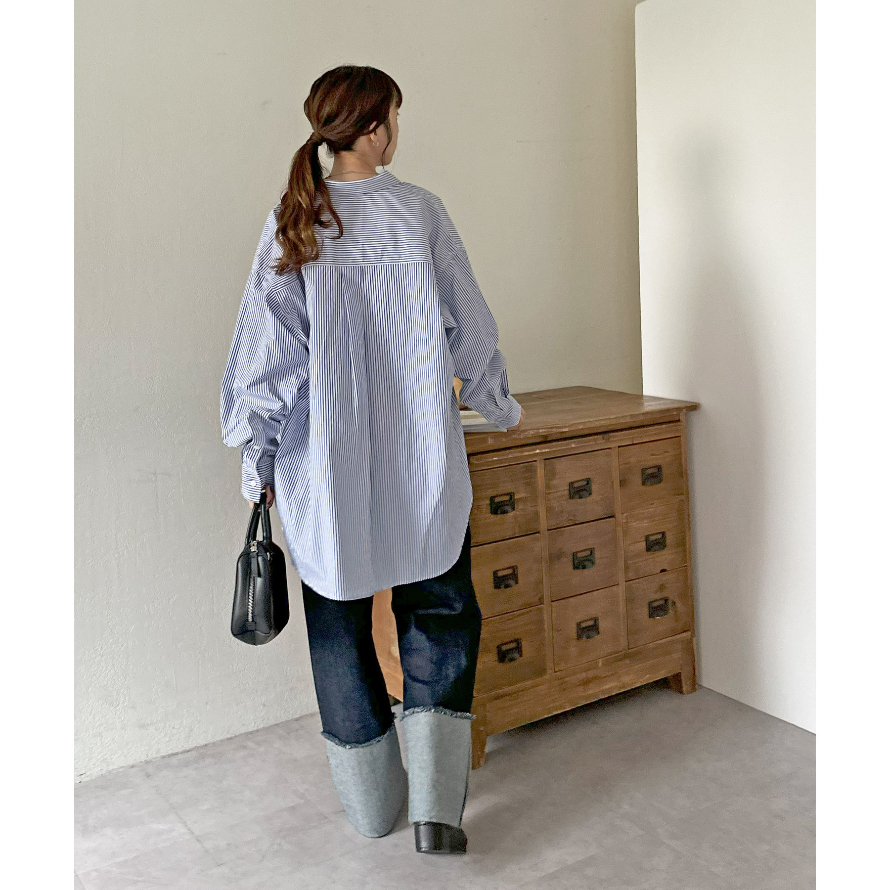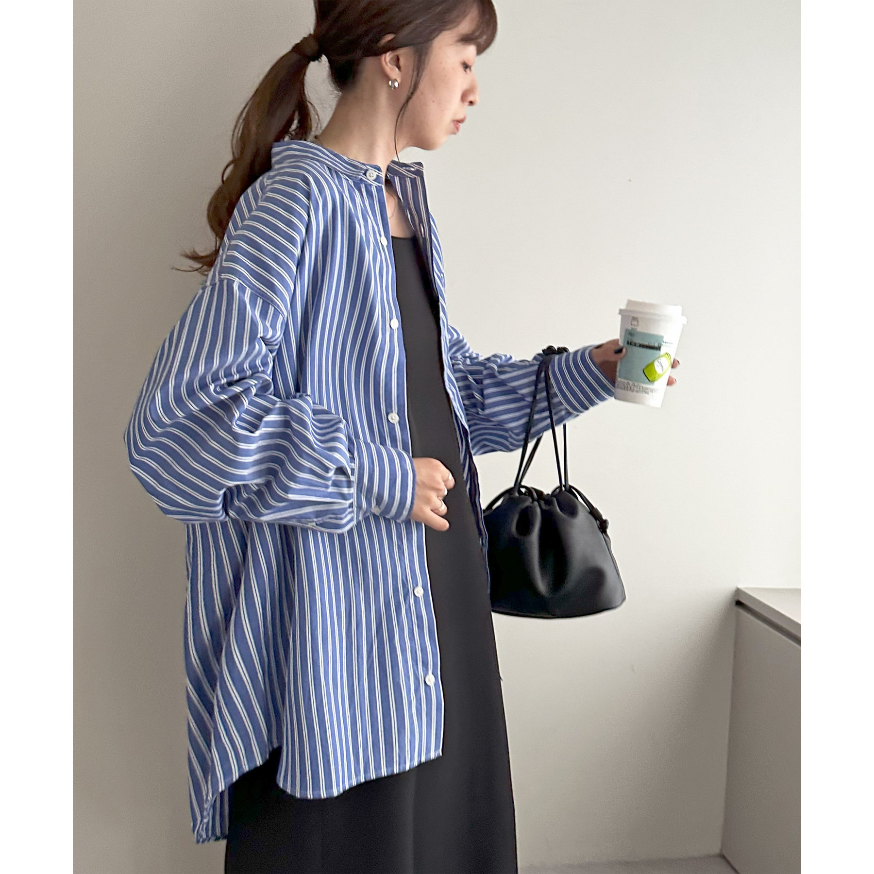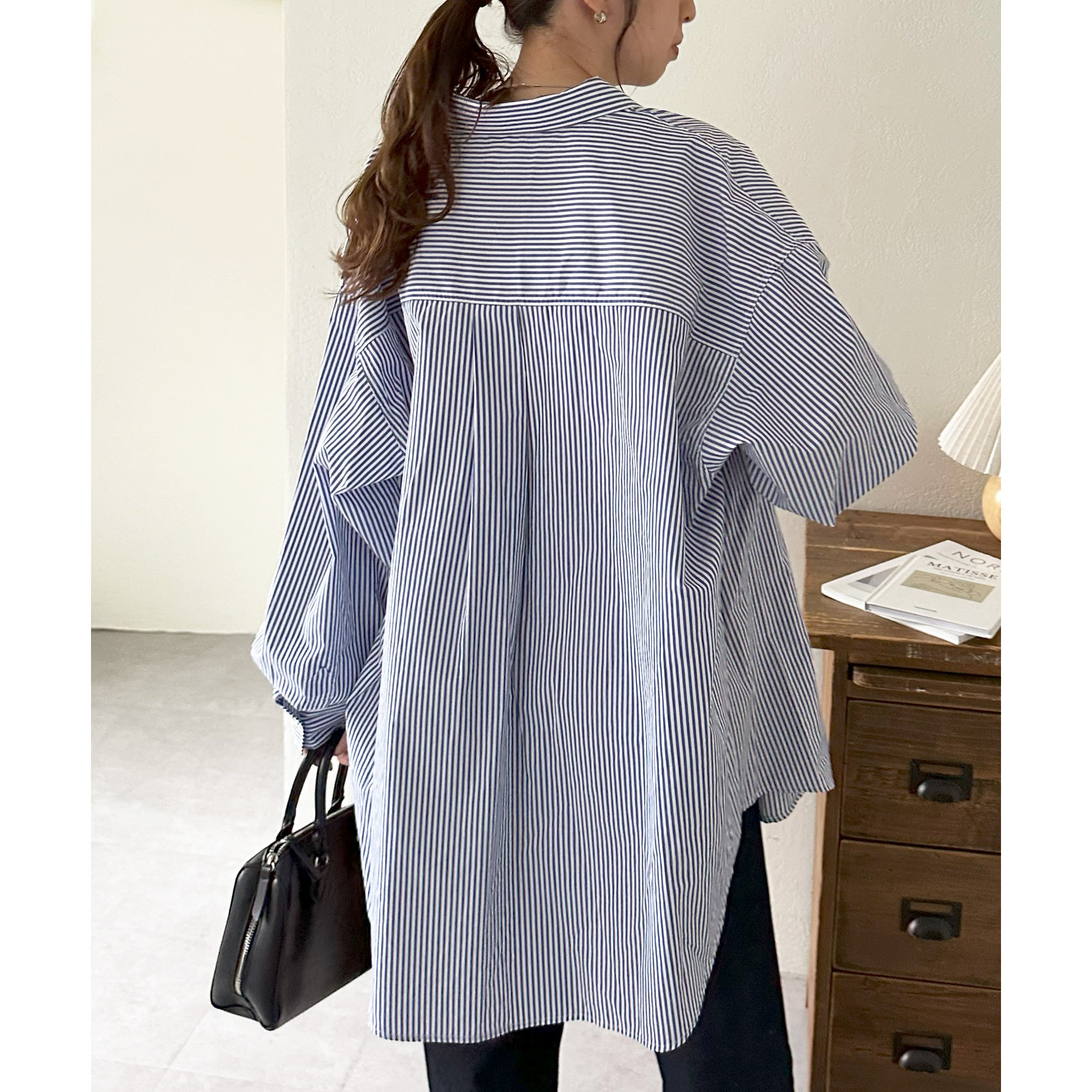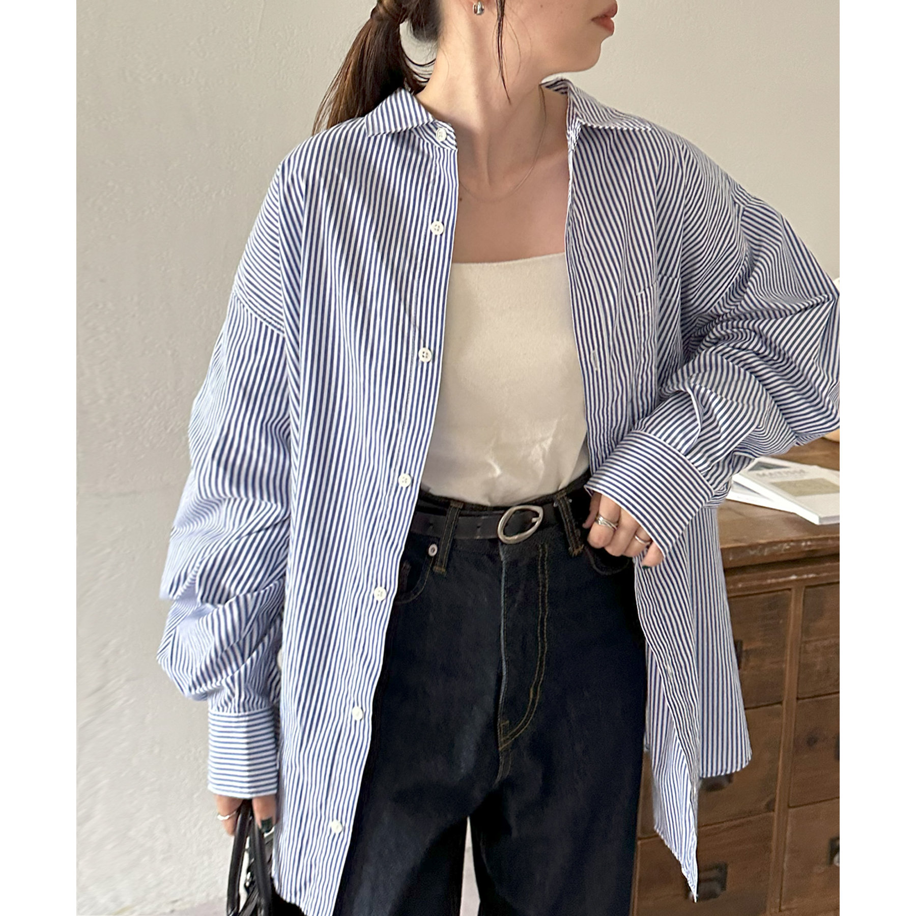 オーバーサイズですが、裾に施されたスリットやボリュームスリーブが抜け感をプラス〇