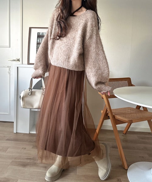 贅沢なニットトップス×チュールコンビワンピースセット。