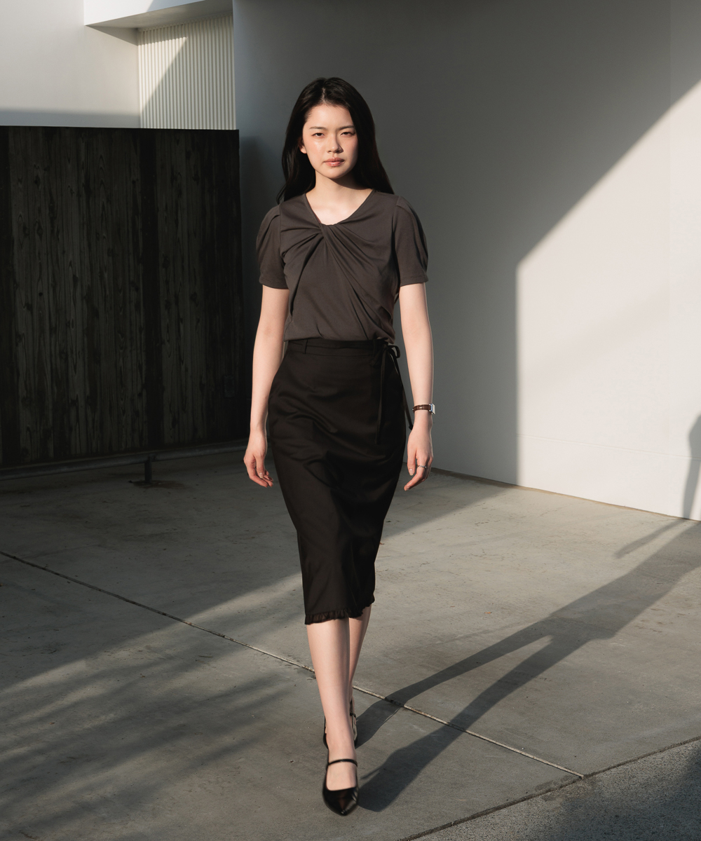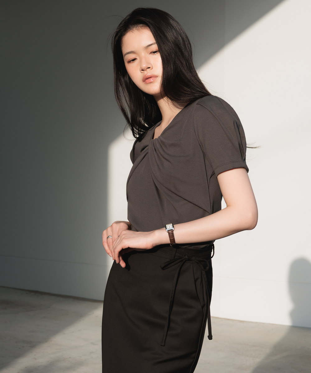 ネックラインのツイストディテールが際立つ半袖Tシャツです。