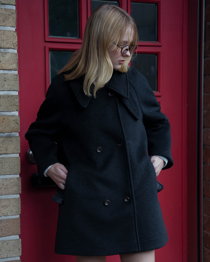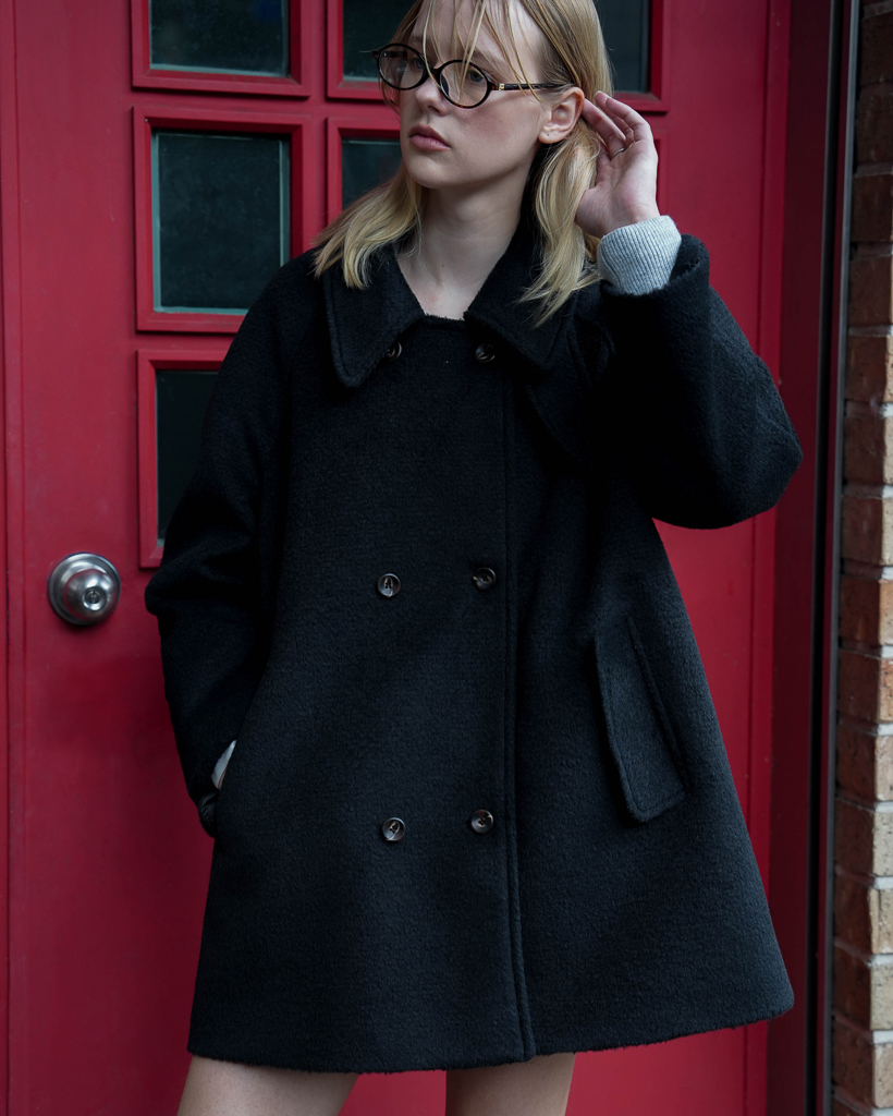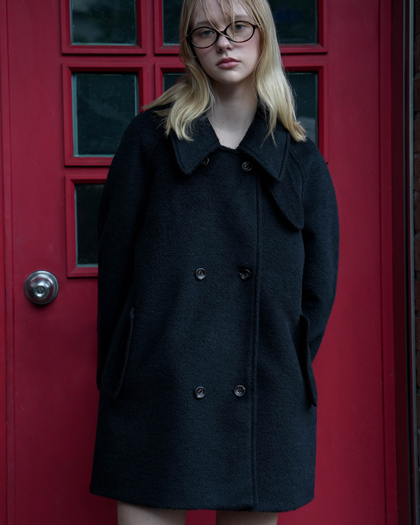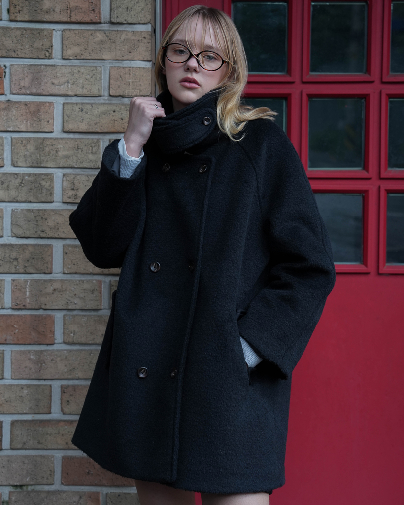 ハイネックデザインとダブルボタン仕様で、防寒性とデザイン性を兼ね備えたクラシックムードのコートです。