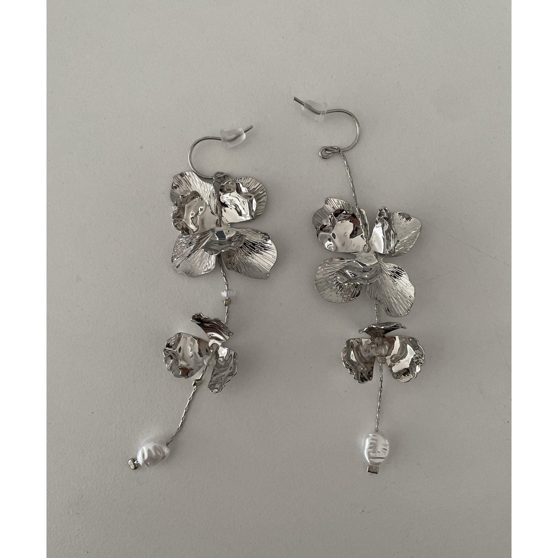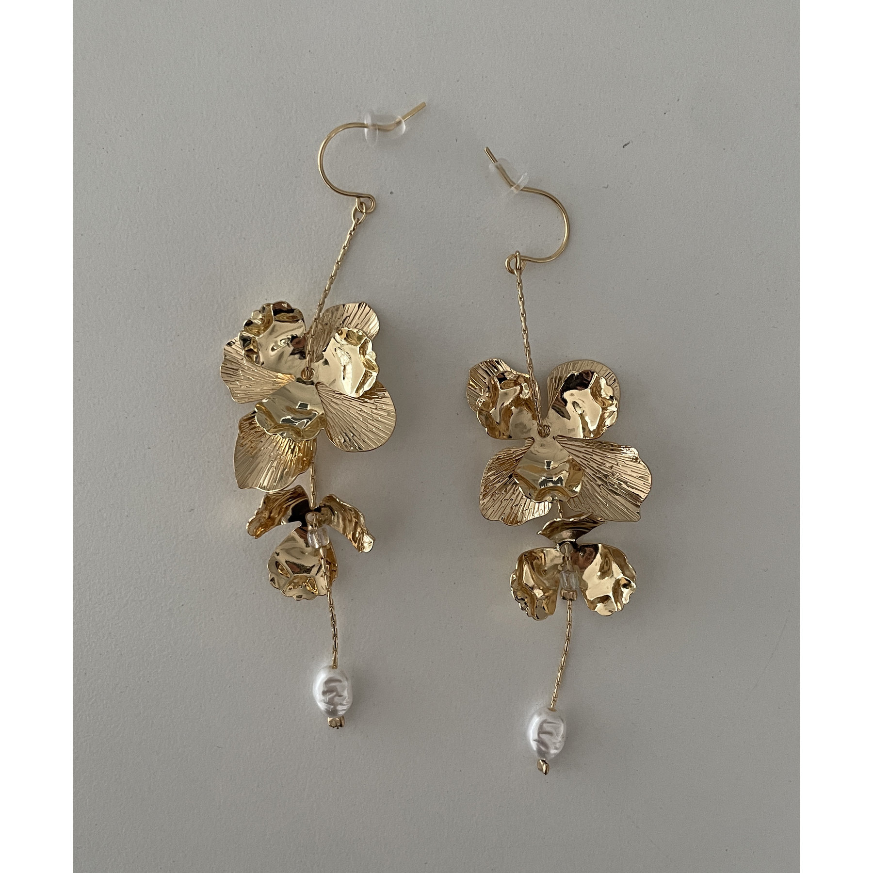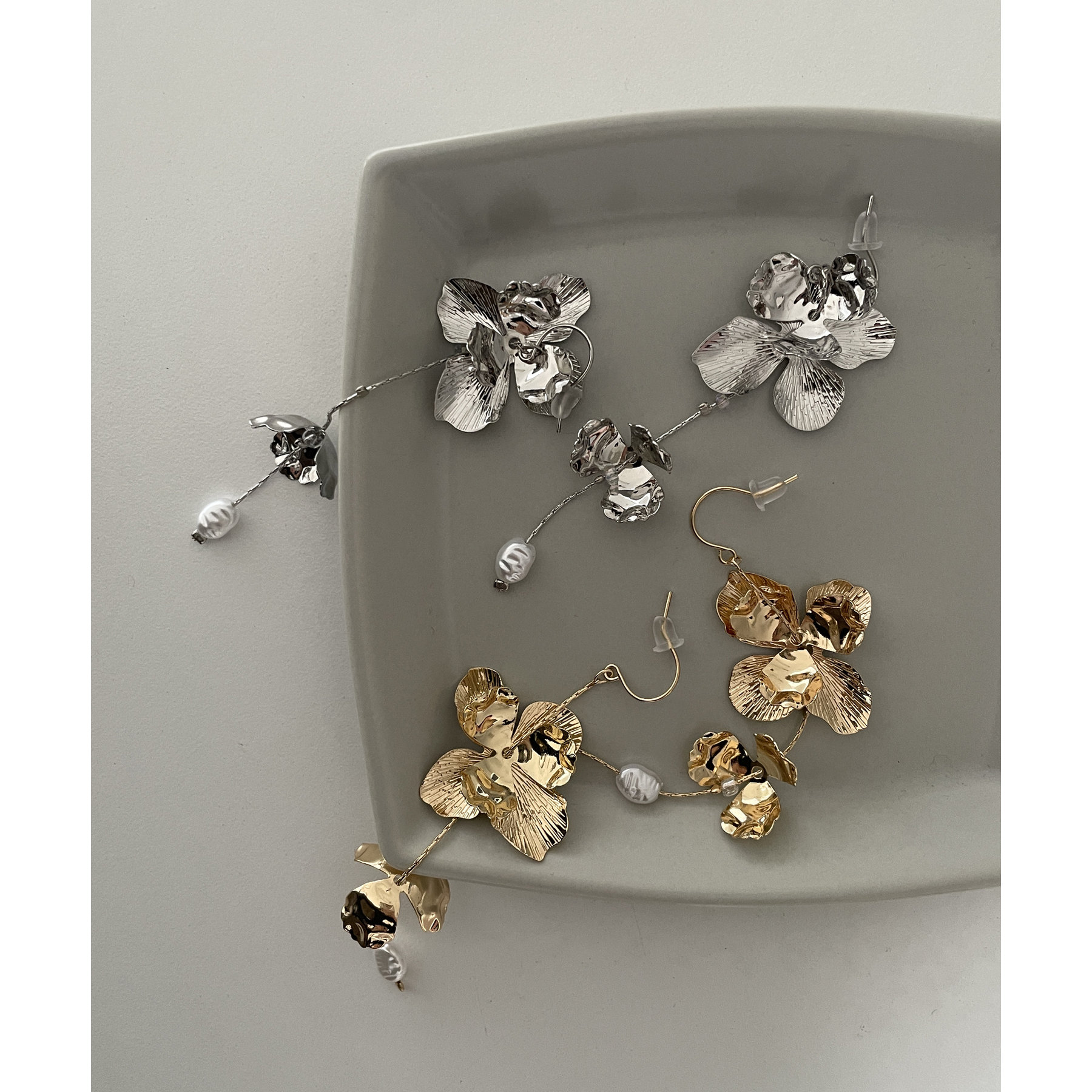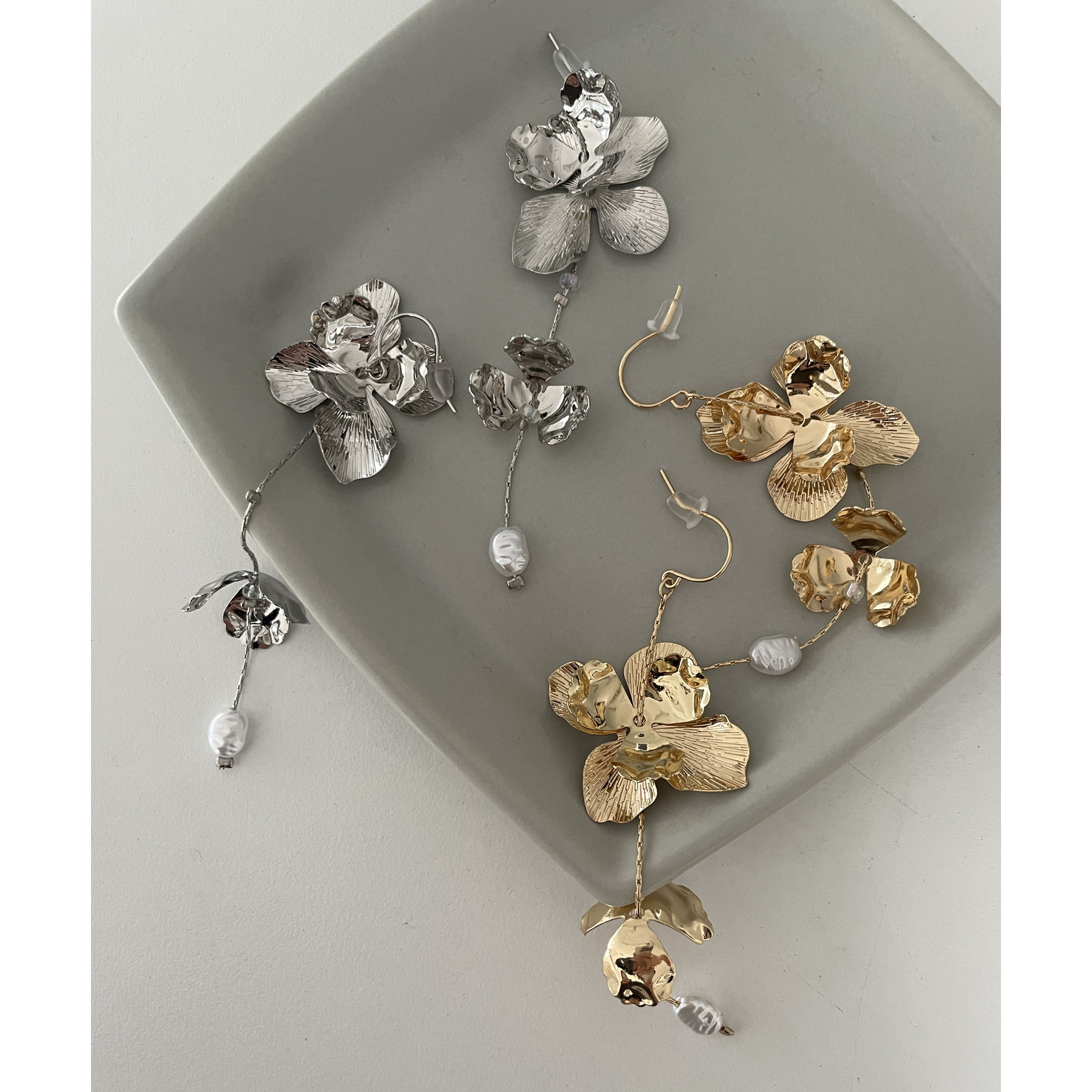 ・上品なメタルフラワーと先端のパールが華やかな印象に。