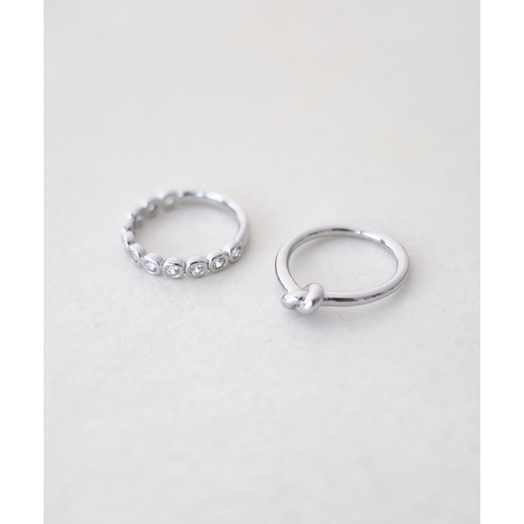 結び目をモチーフにしたデザインが特徴の2本セットリング。シンプルながらも存在感のあるデザインで、指先にさりげないアクセントを加えます。