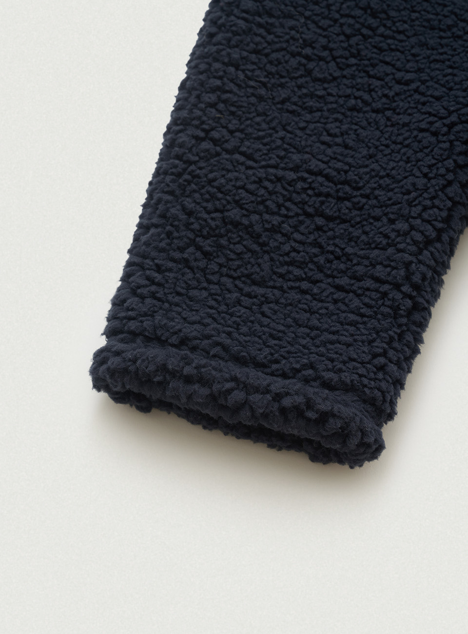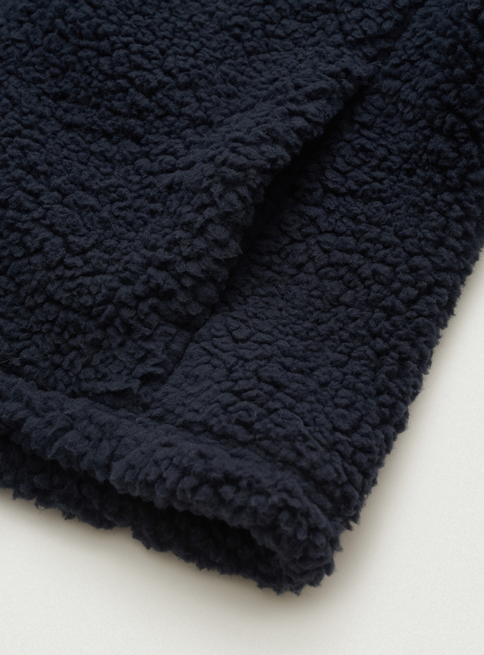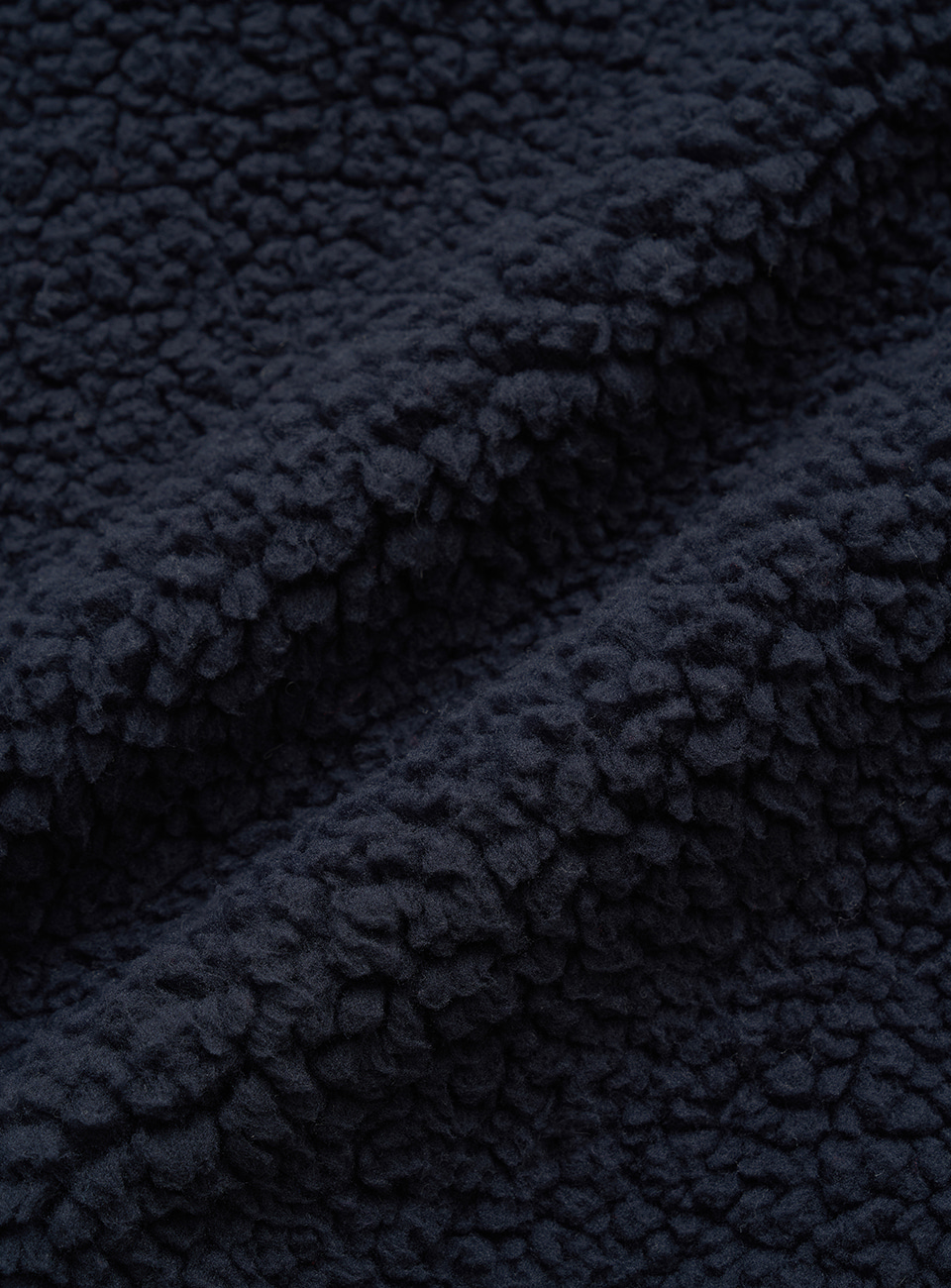 ネイビーカラーで、柔らかいテクスチャーが特徴のポリエステルフリース。