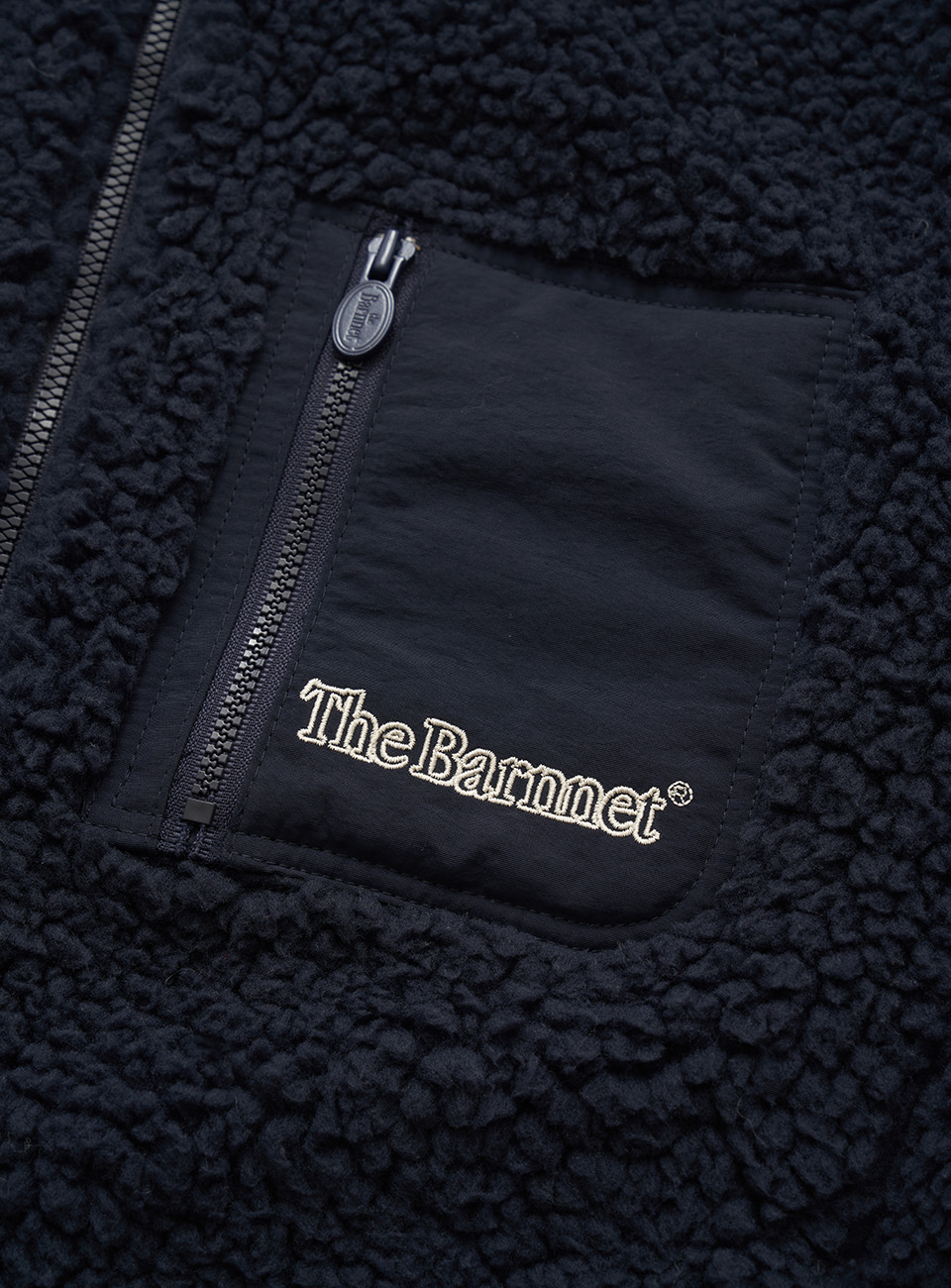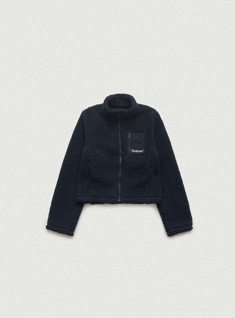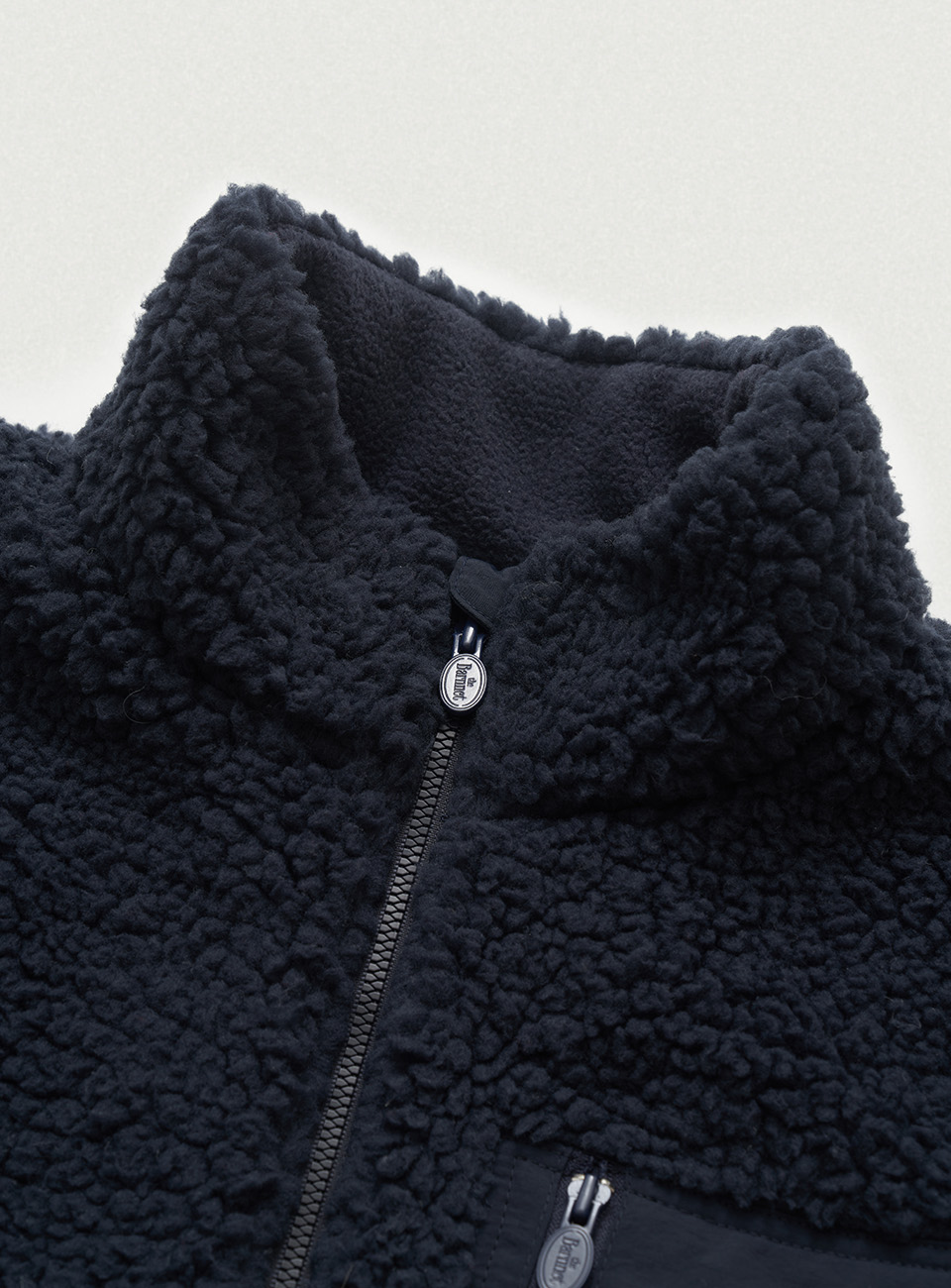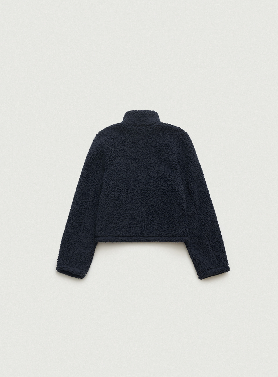 ネイビーカラーで、柔らかいテクスチャーが特徴のポリエステルフリース。
