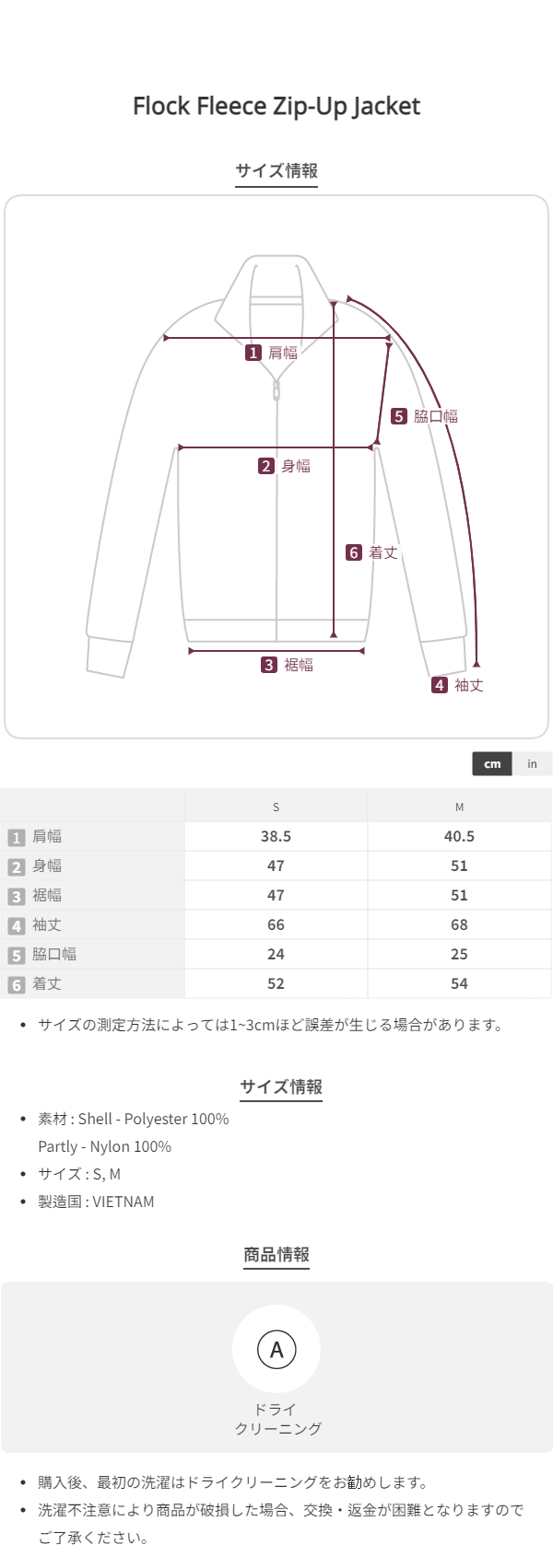 ※ フリースの特性のせいで、保管や着用時に毛落ちが発生する場合があります。