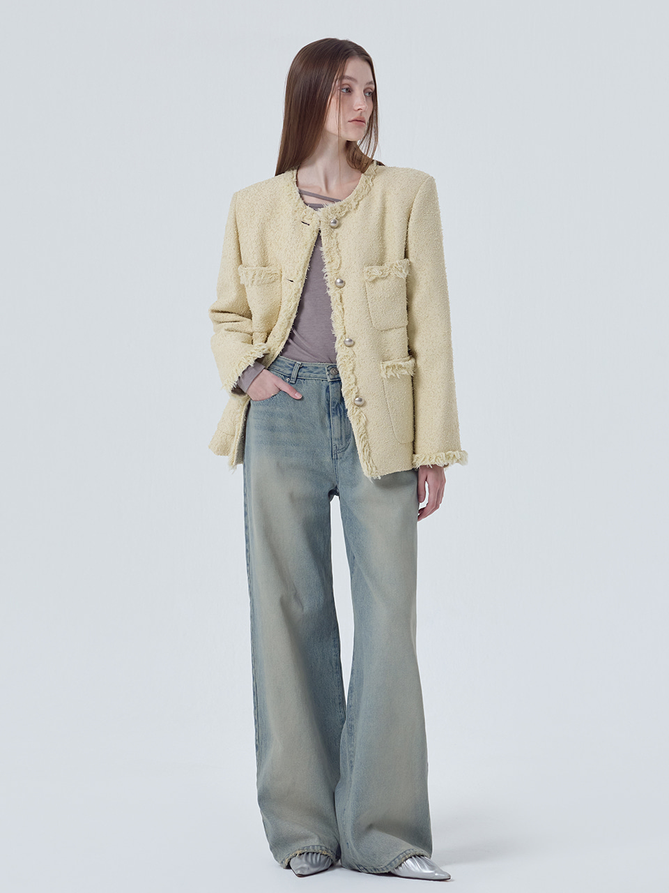 Fringe Pocket Tweed Jacket, Cream Yellow