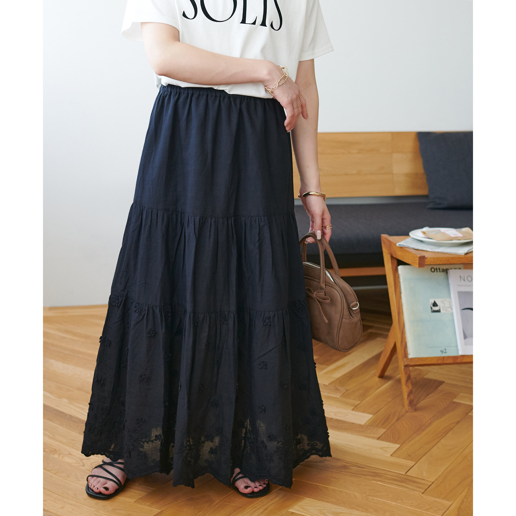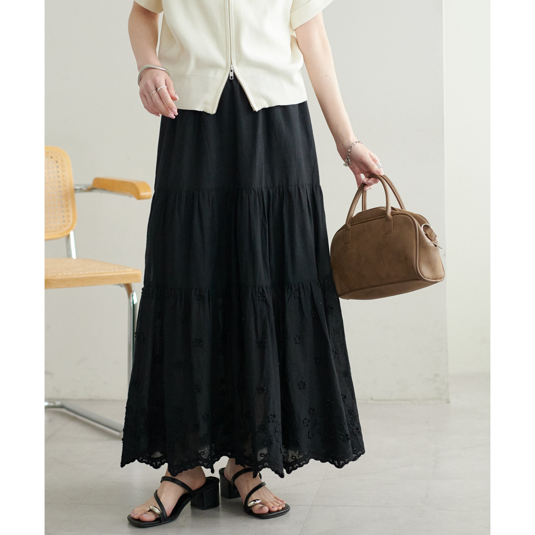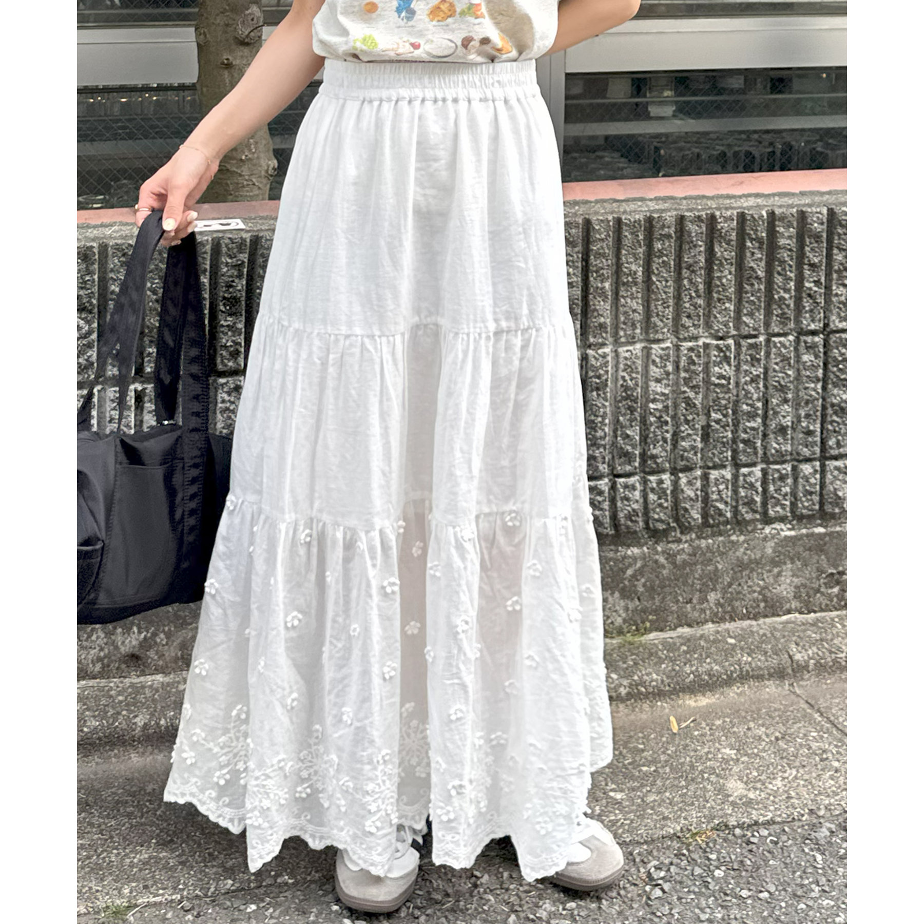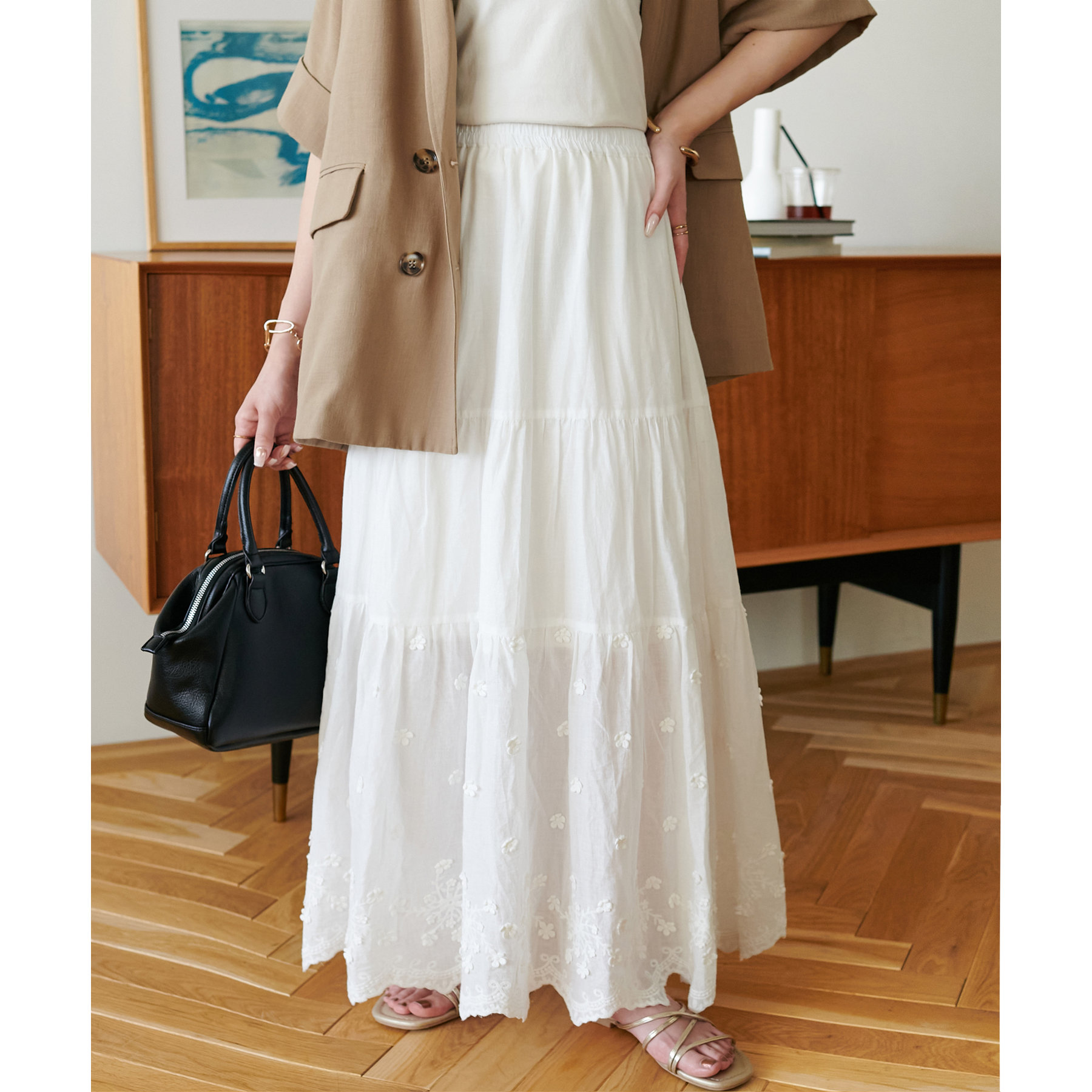 立体の花柄デザインが華やかさをプラスしてくれるティアードスカート。