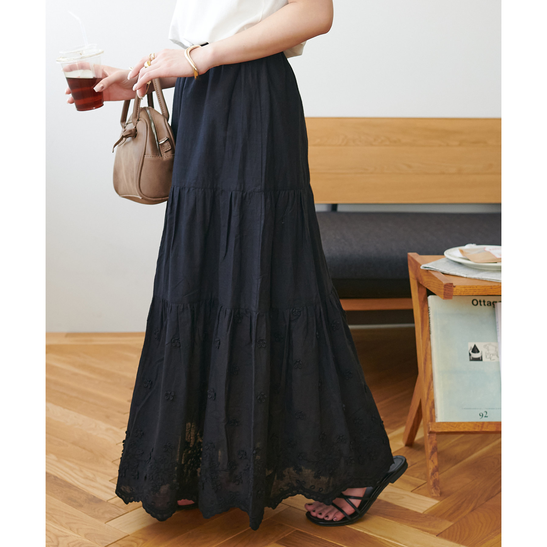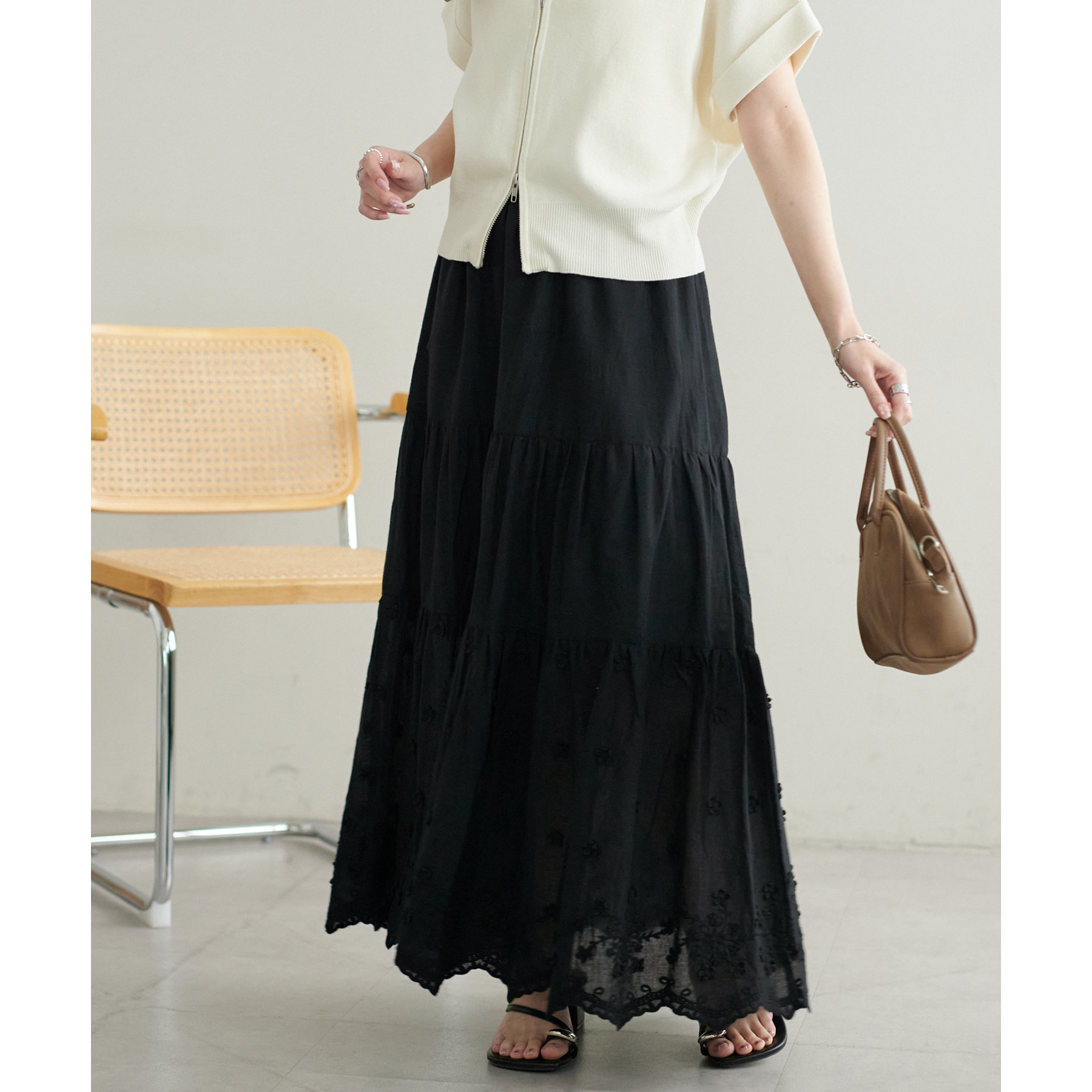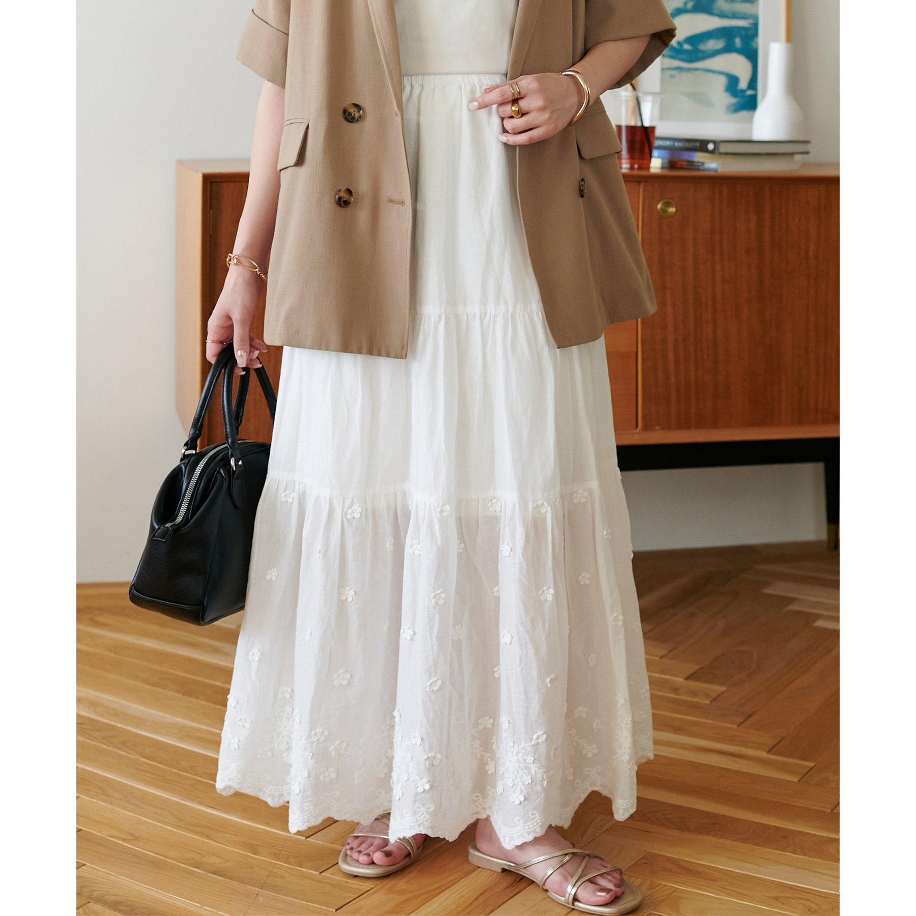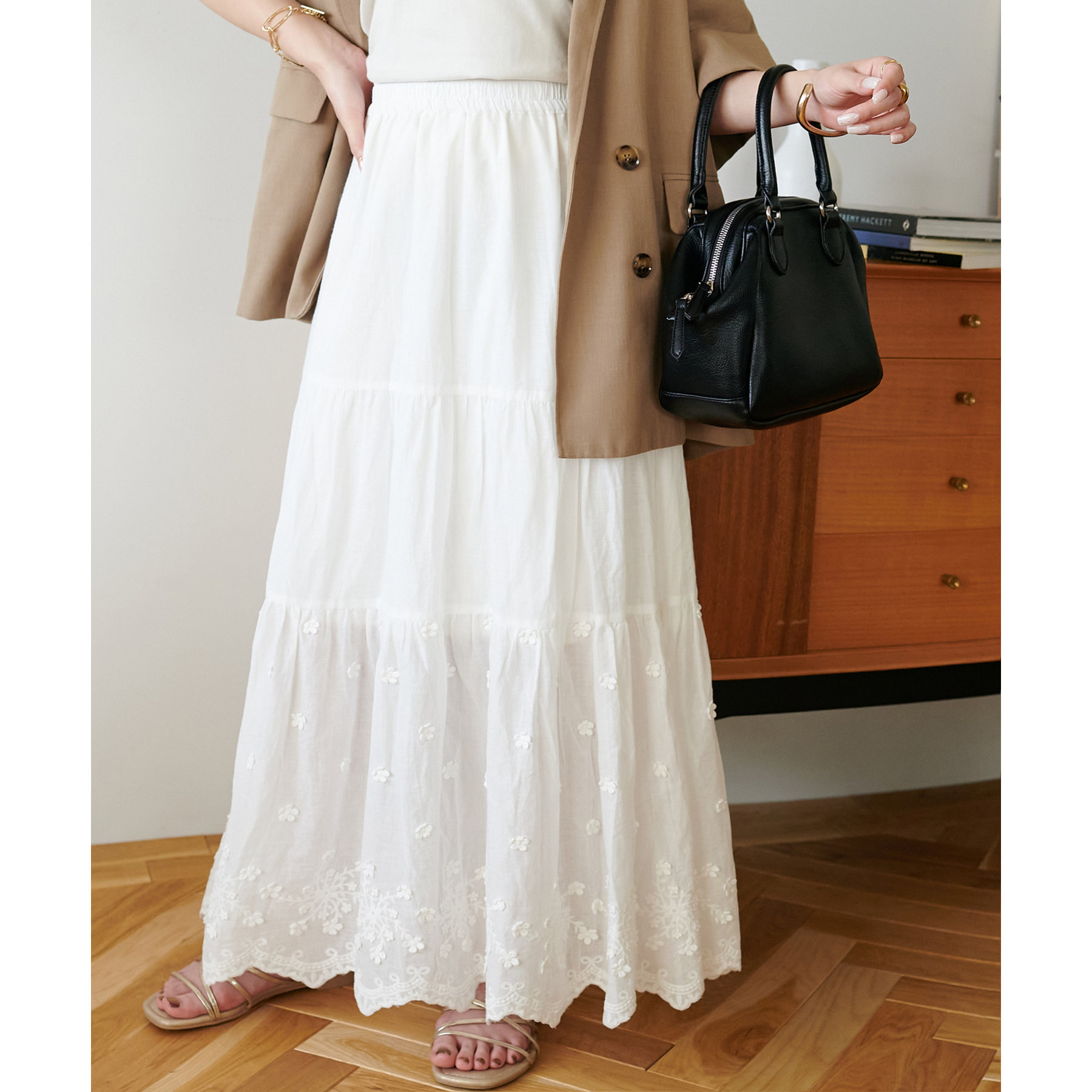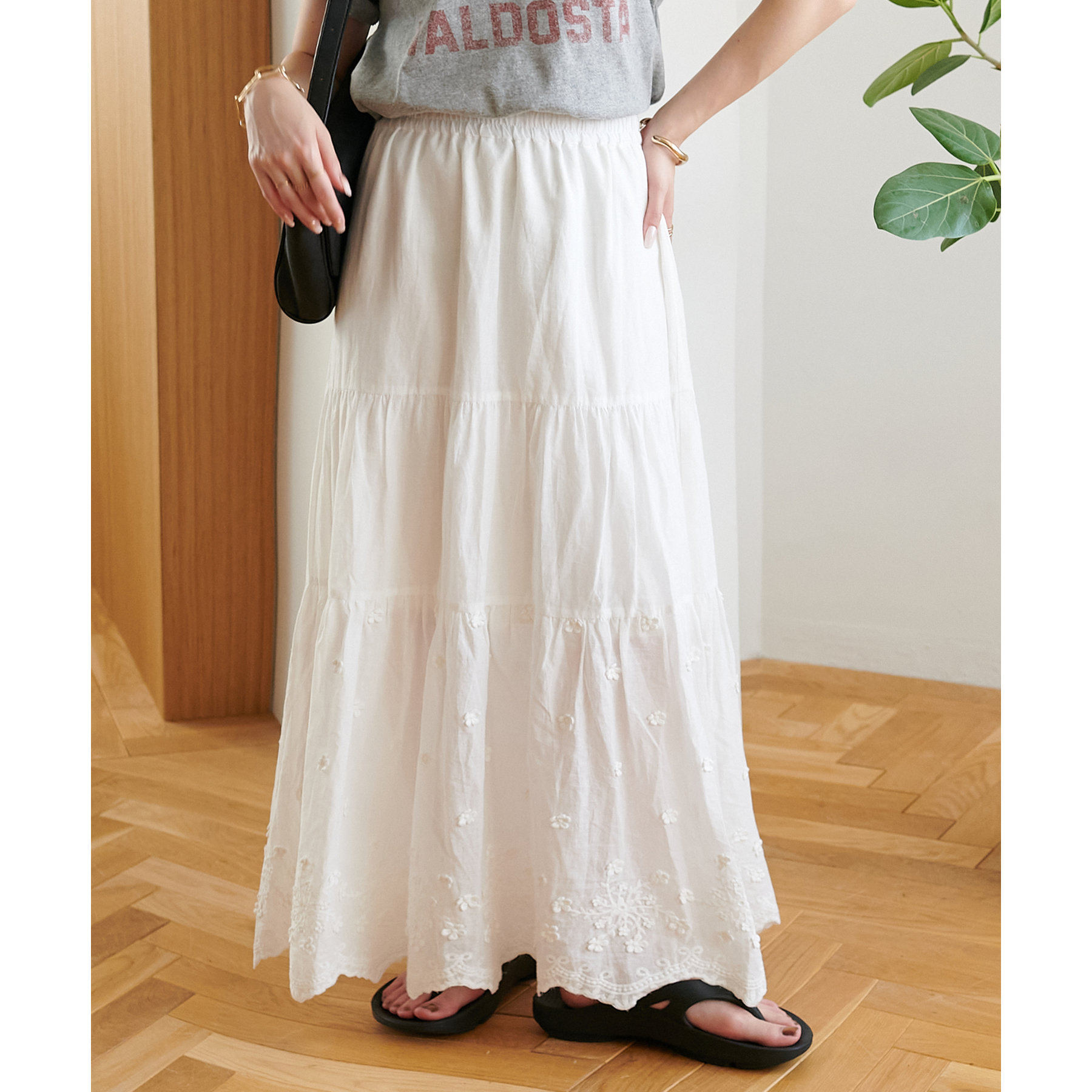 立体の花柄デザインが華やかさをプラスしてくれるティアードスカート。