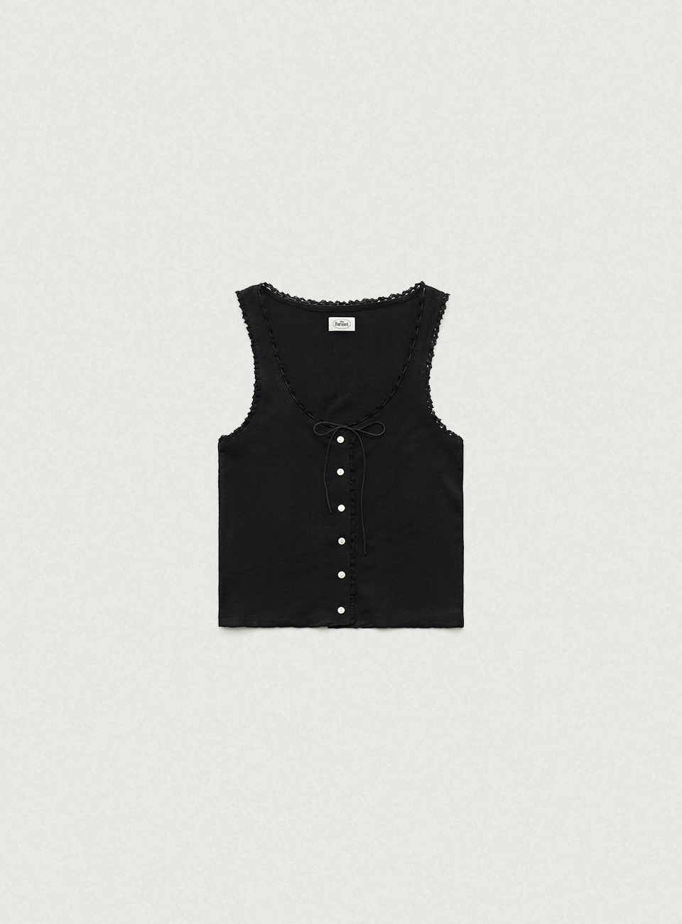 Uネック、ノースリーブ、タイ&ボタン留め仕様のタンクトップタイプ。