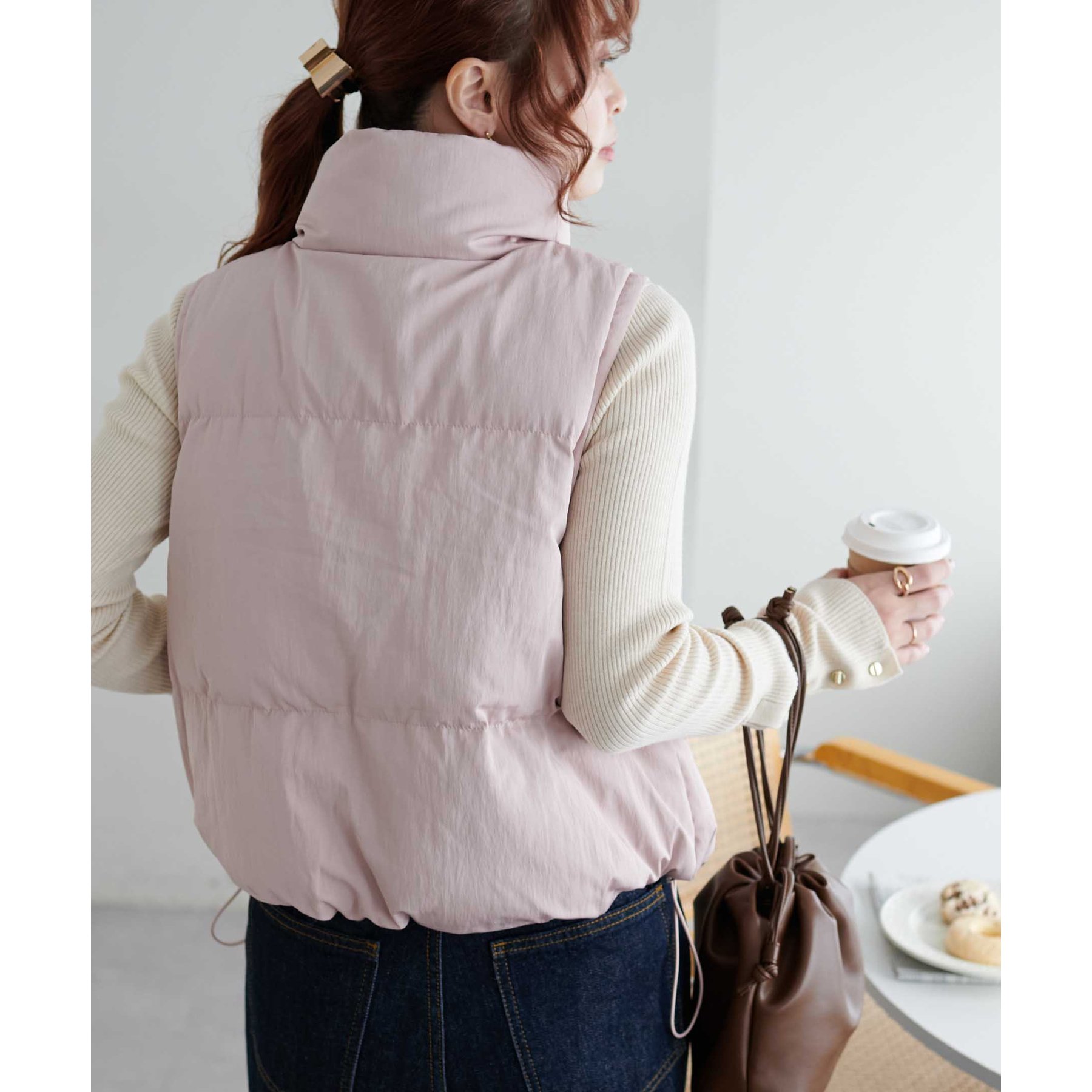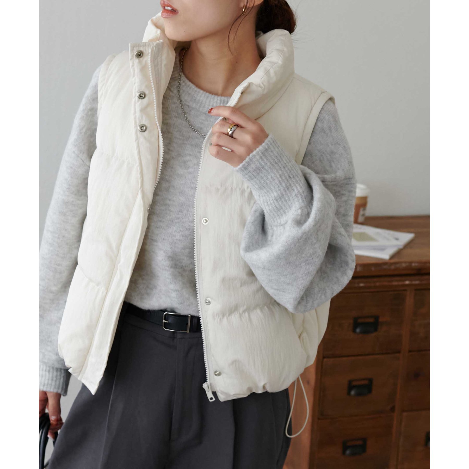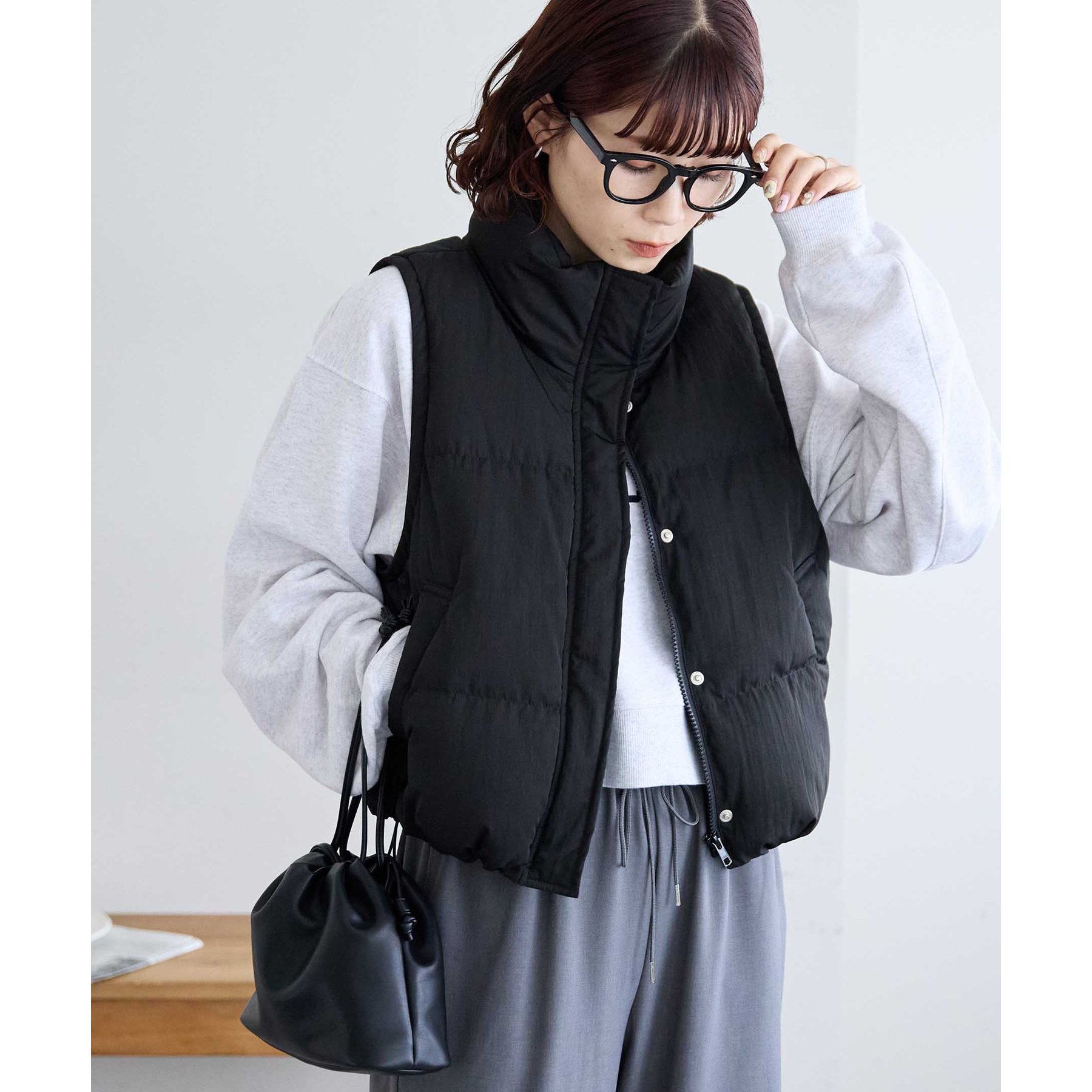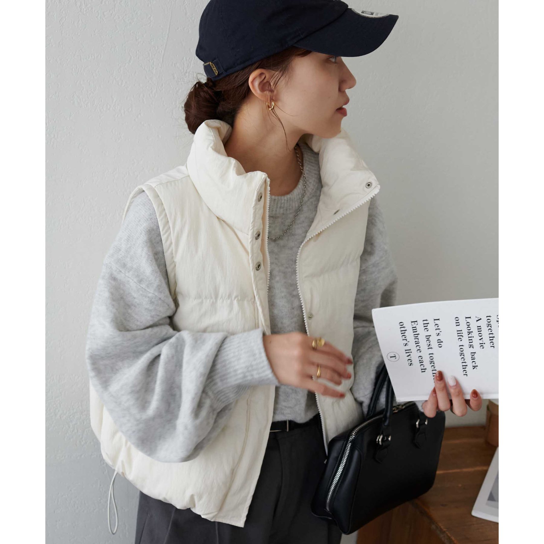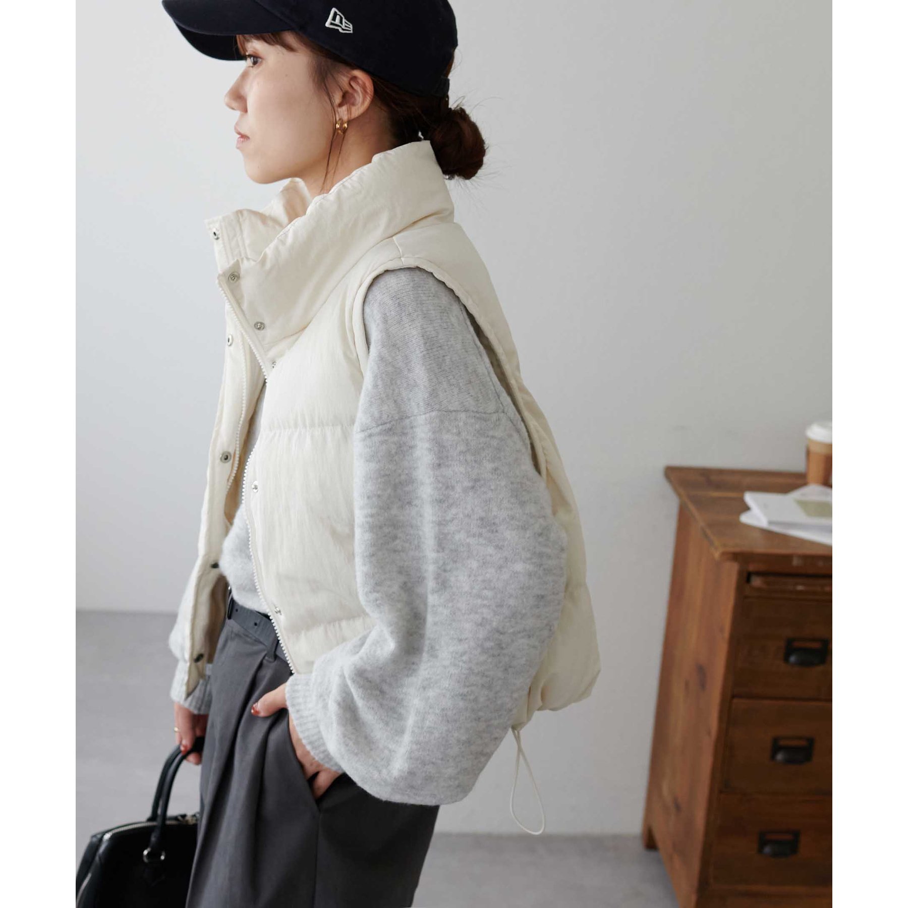 153cmスタッフ:気温が難しい時期におすすめのショートベスト!裾のドロスとで丸み度合いが調節できるので、印象を変えて着ていただけます〇