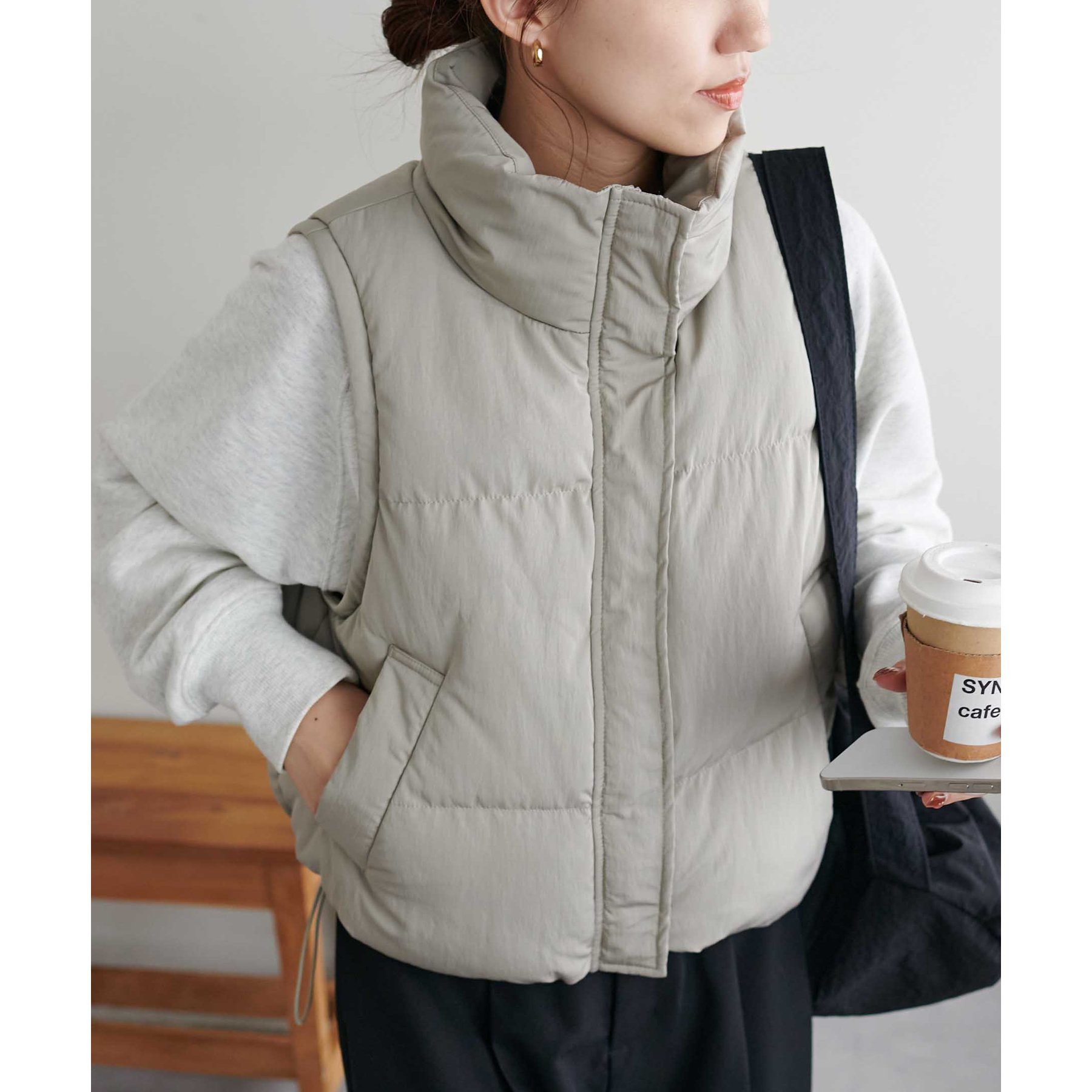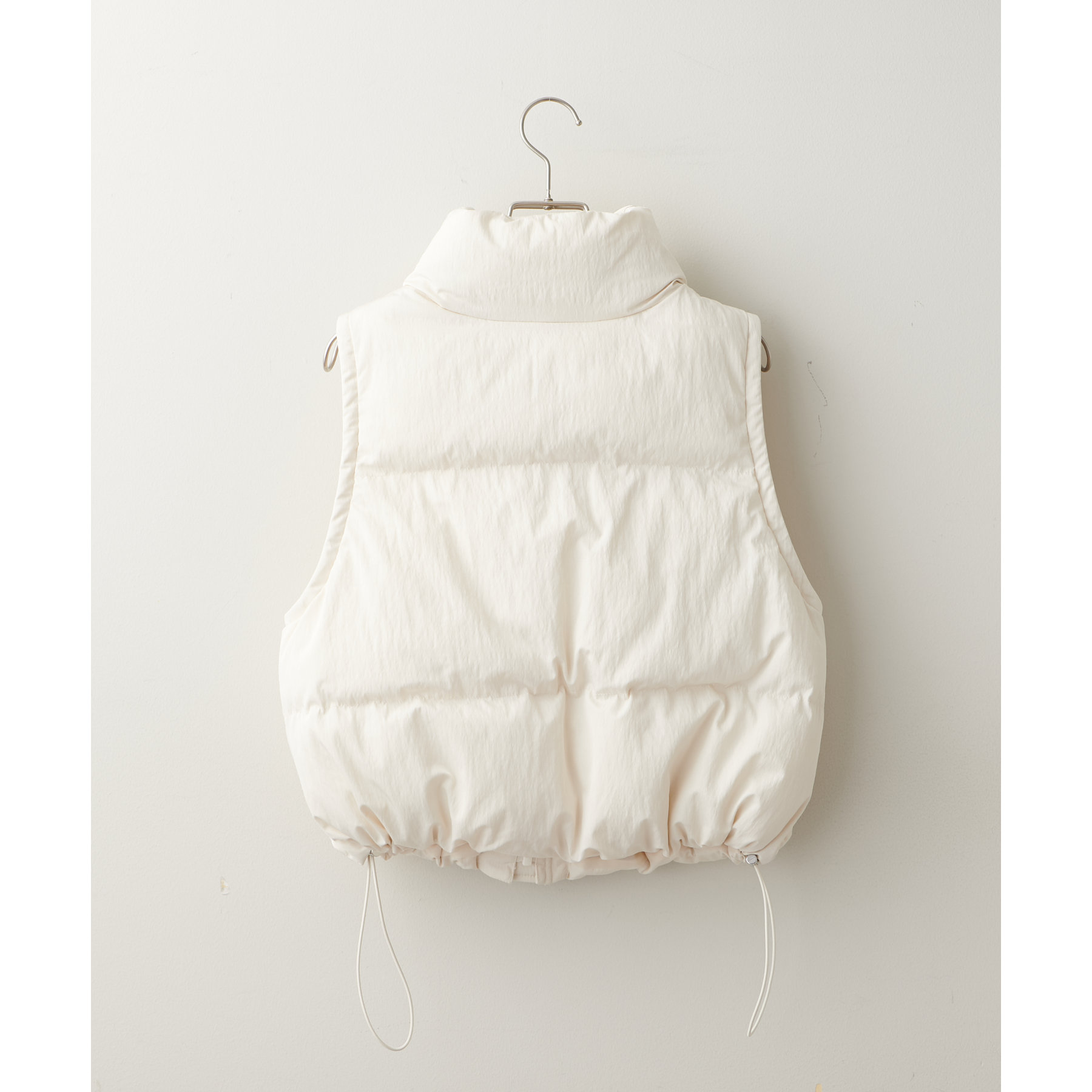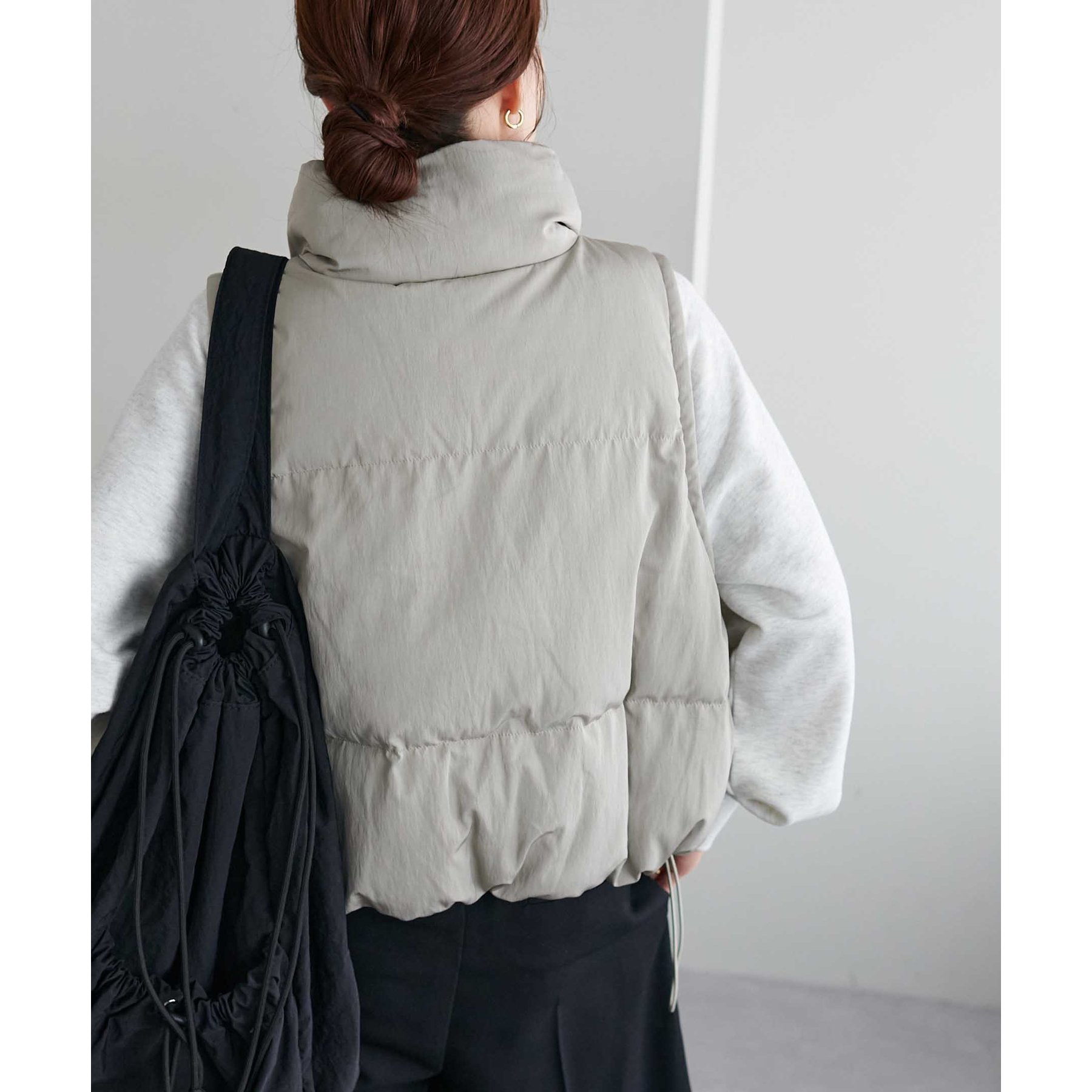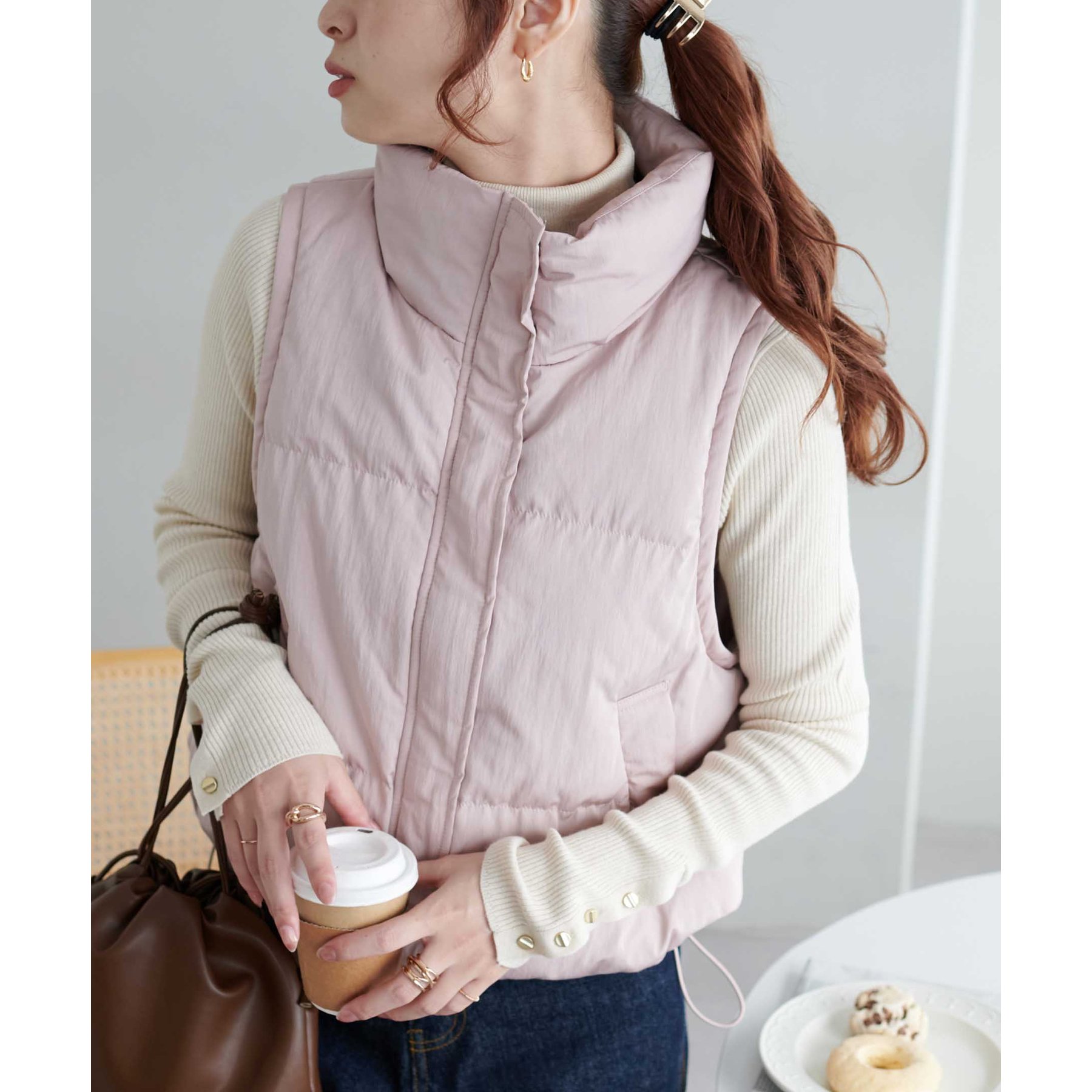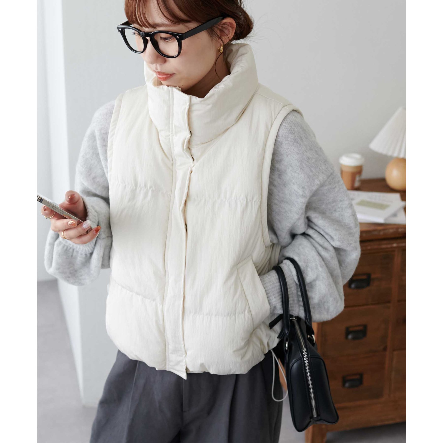 153cmスタッフ:気温が難しい時期におすすめのショートベスト!裾のドロスとで丸み度合いが調節できるので、印象を変えて着ていただけます〇