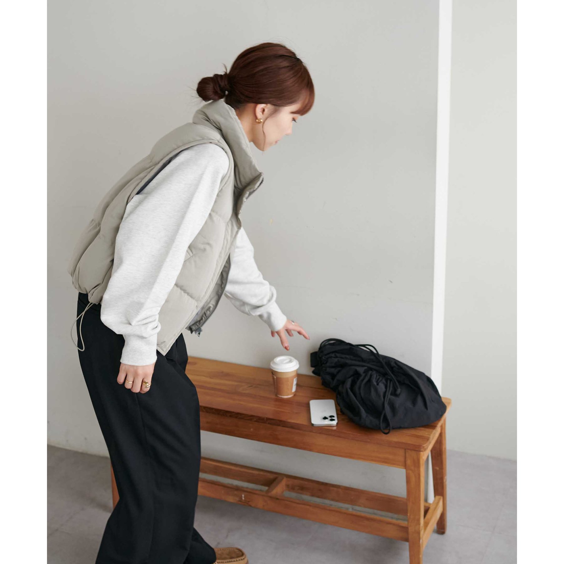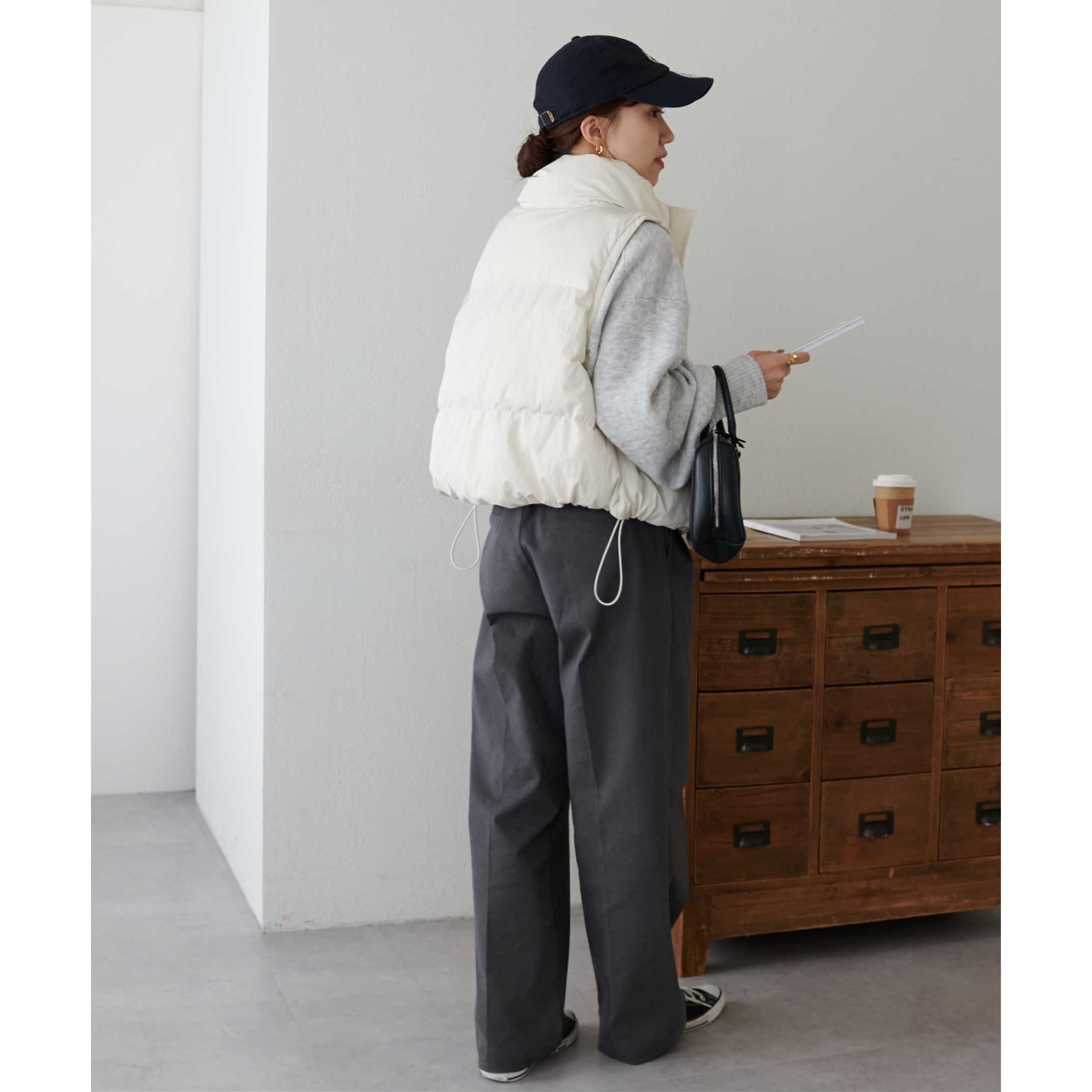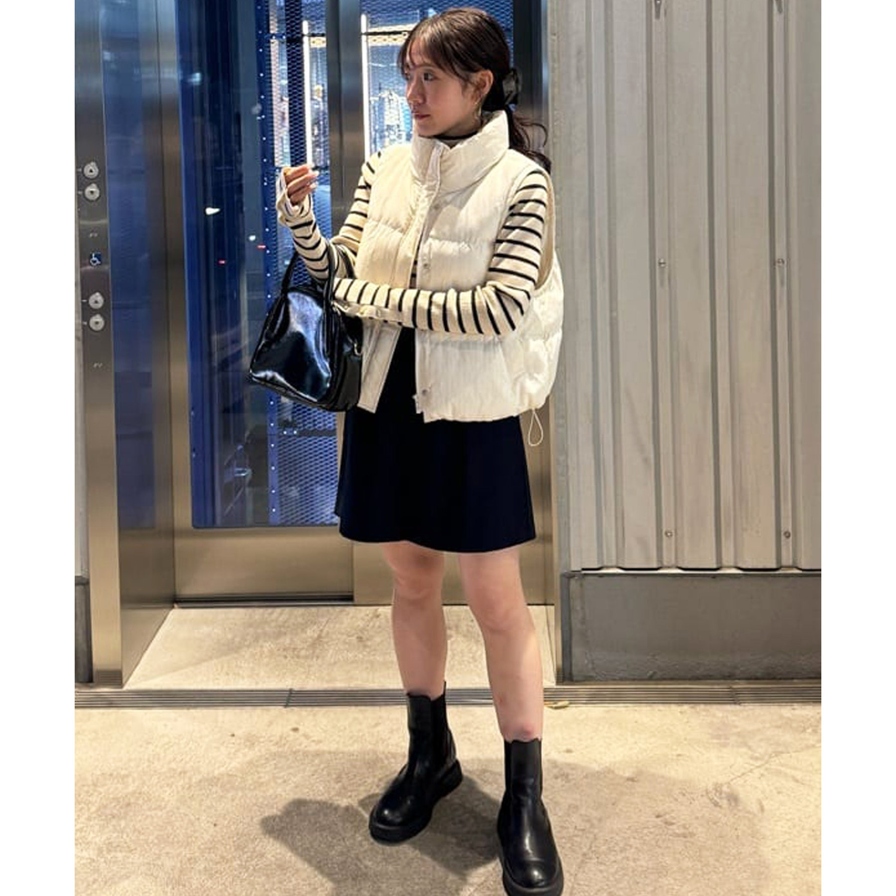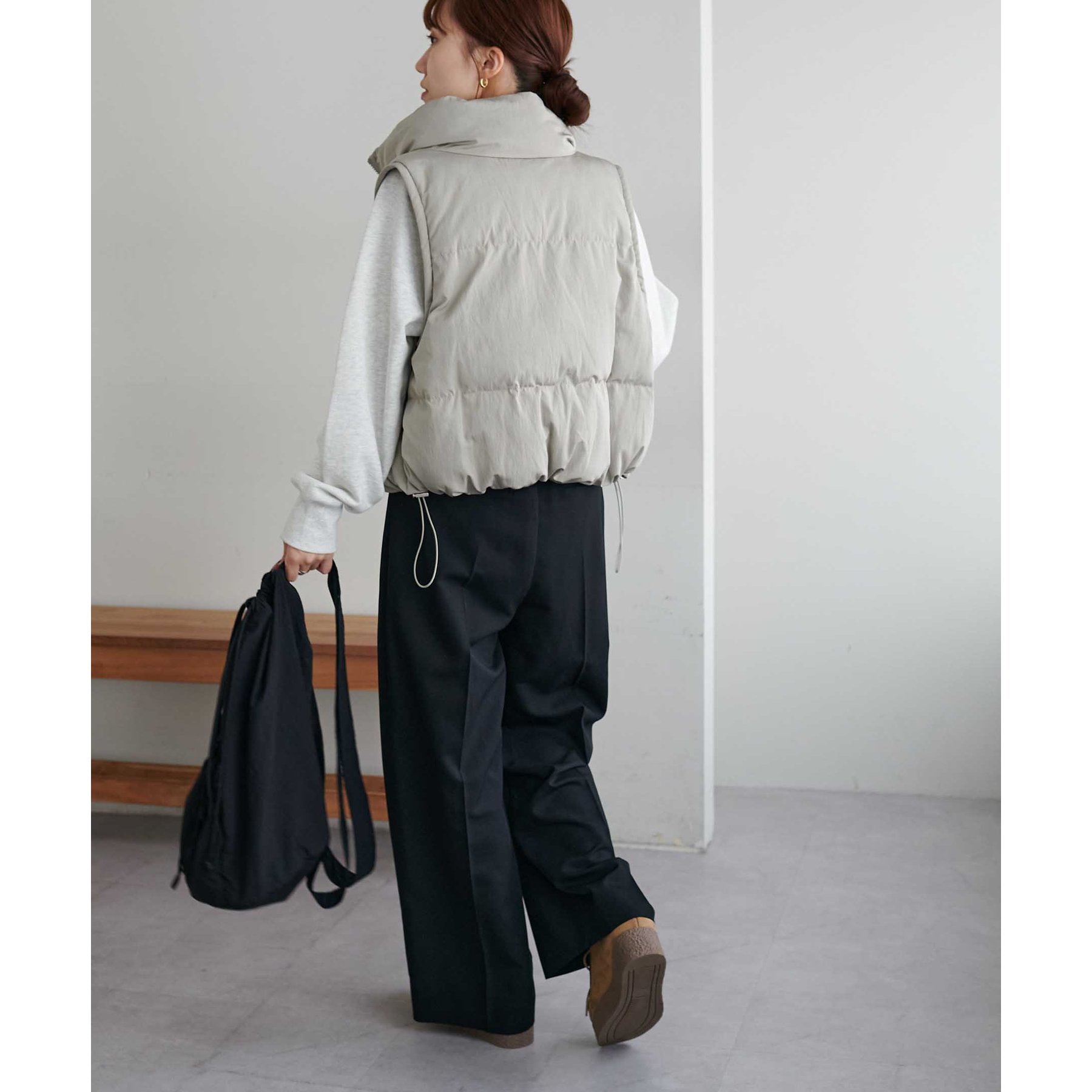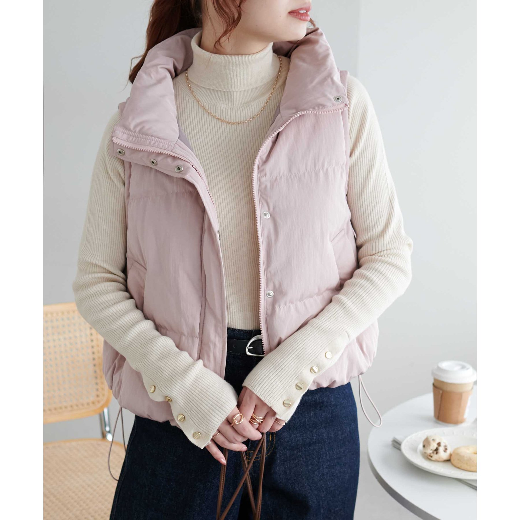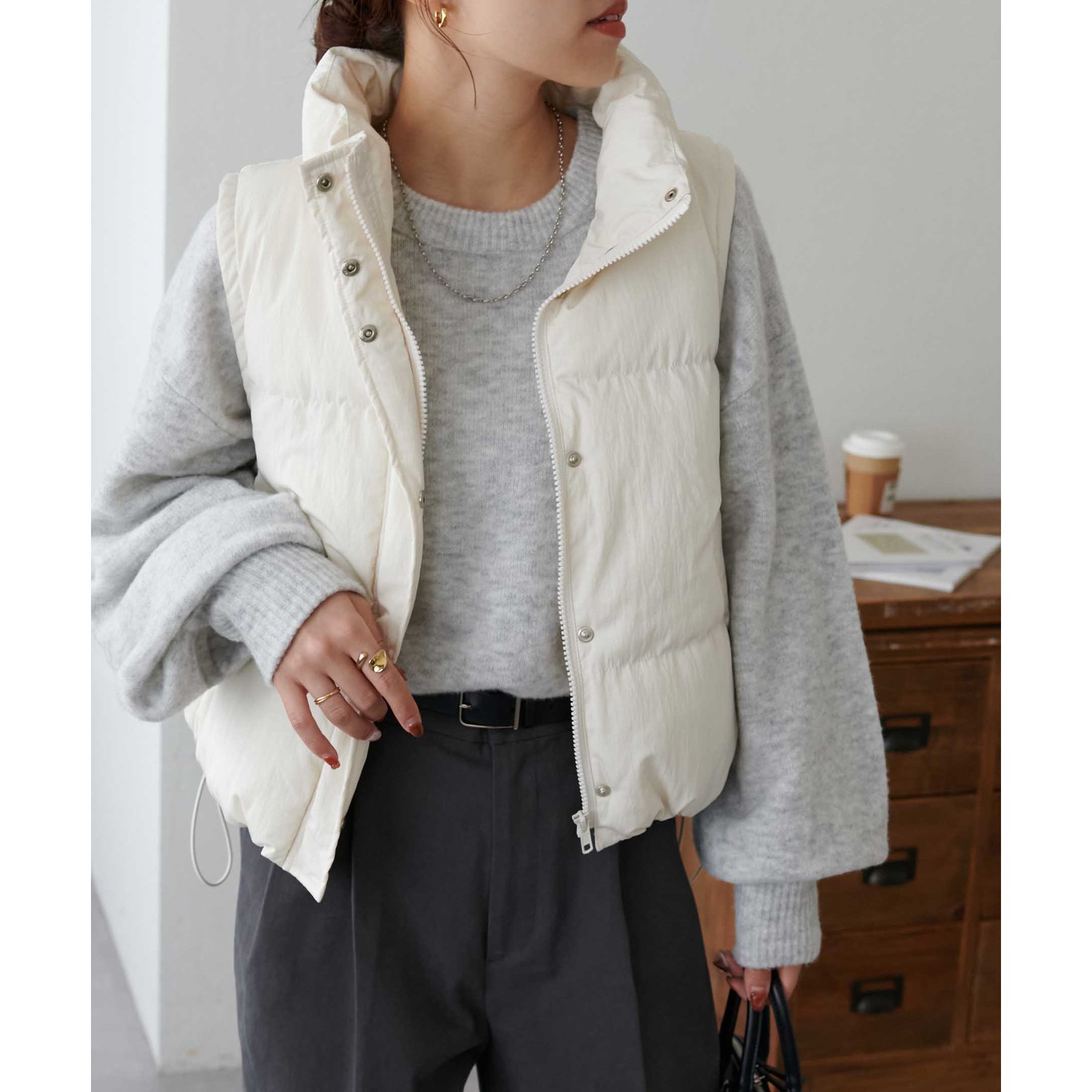 153cmスタッフ:気温が難しい時期におすすめのショートベスト!裾のドロスとで丸み度合いが調節できるので、印象を変えて着ていただけます〇