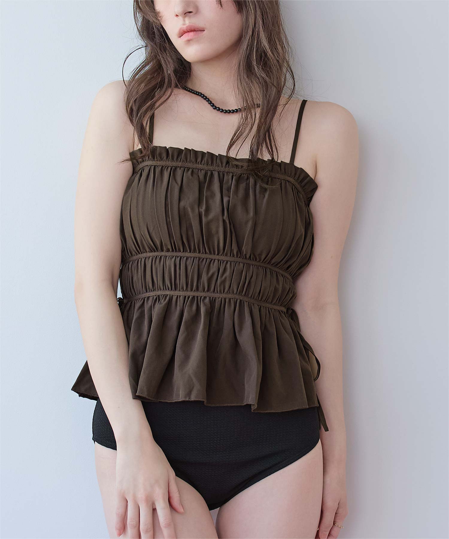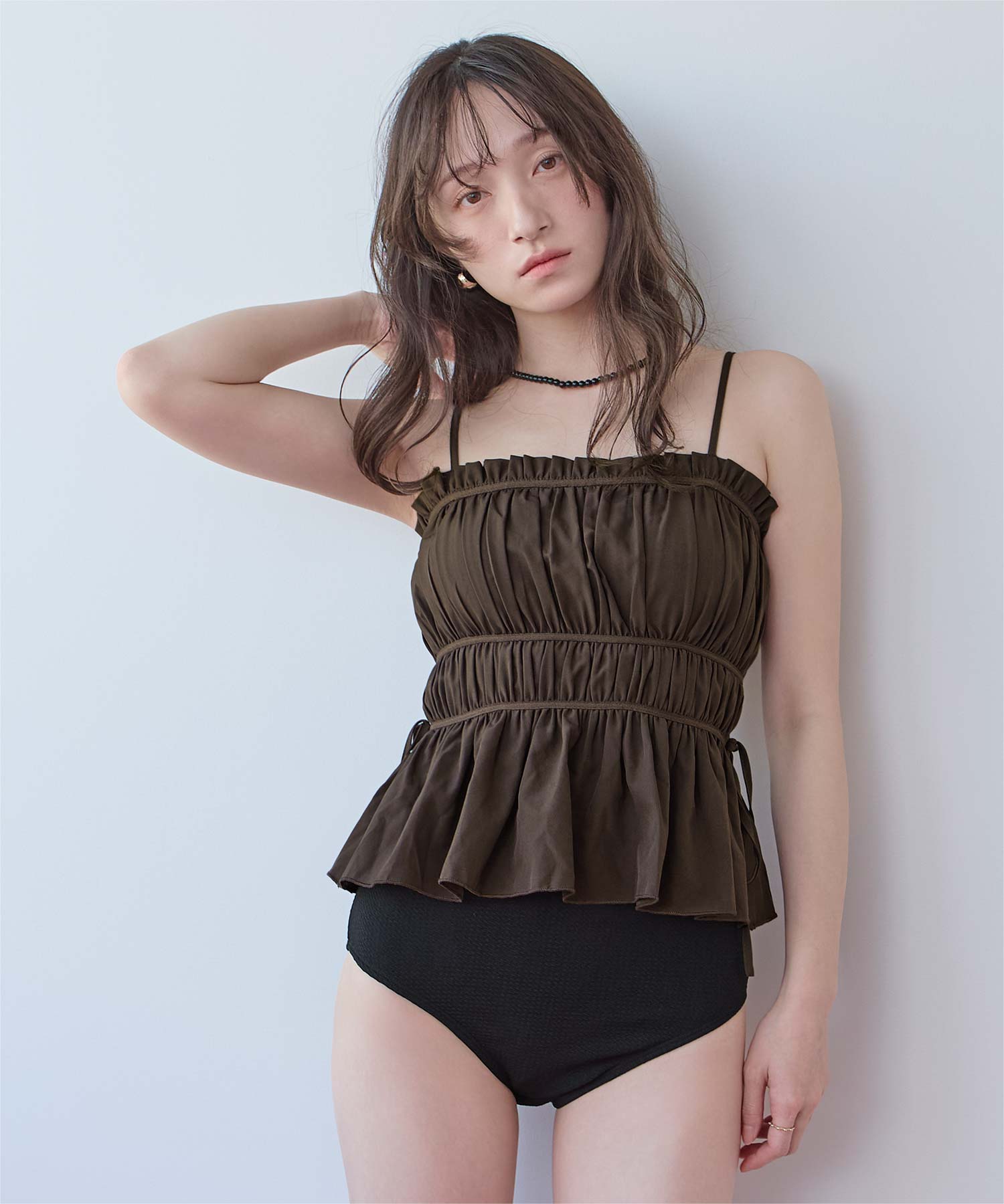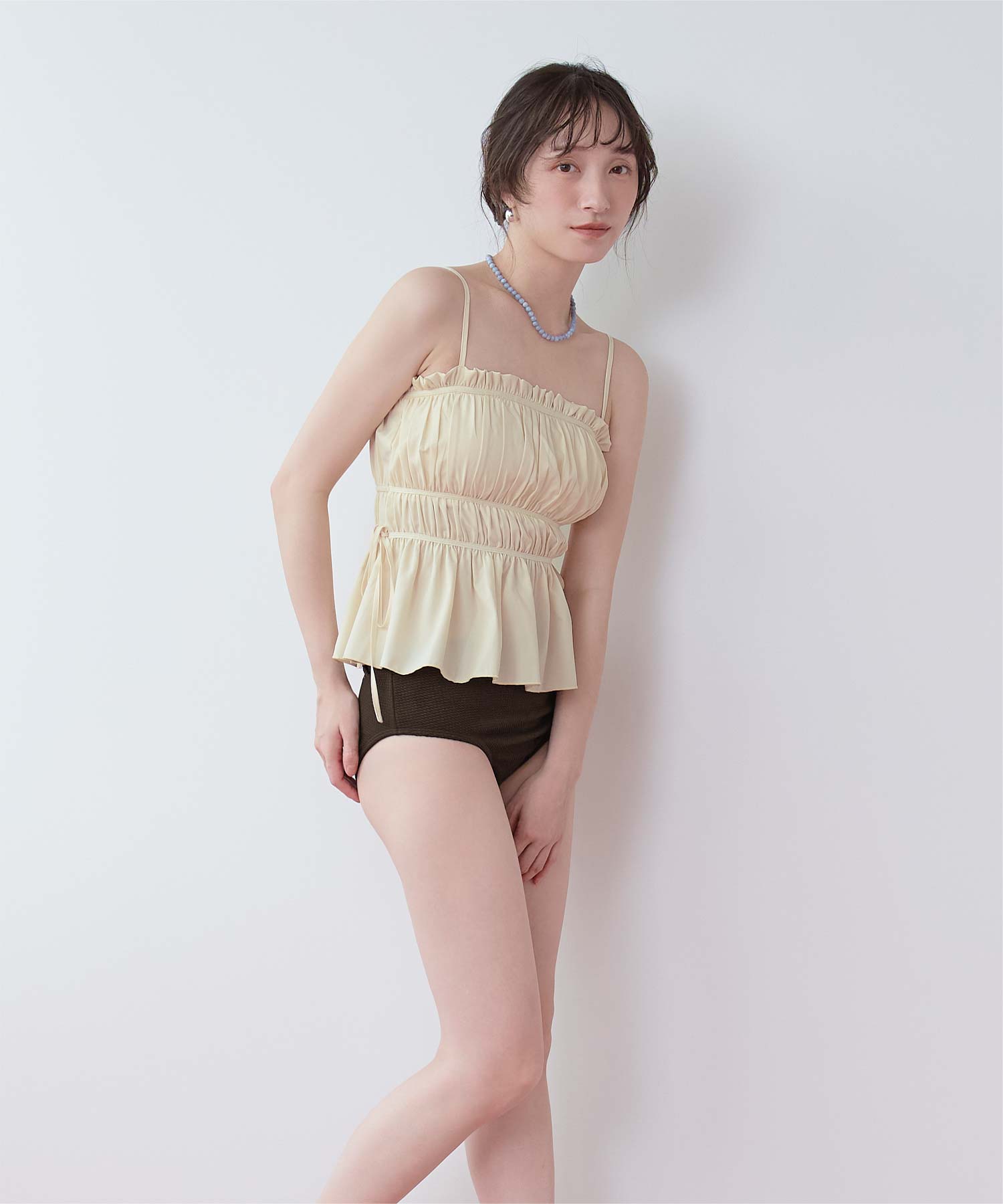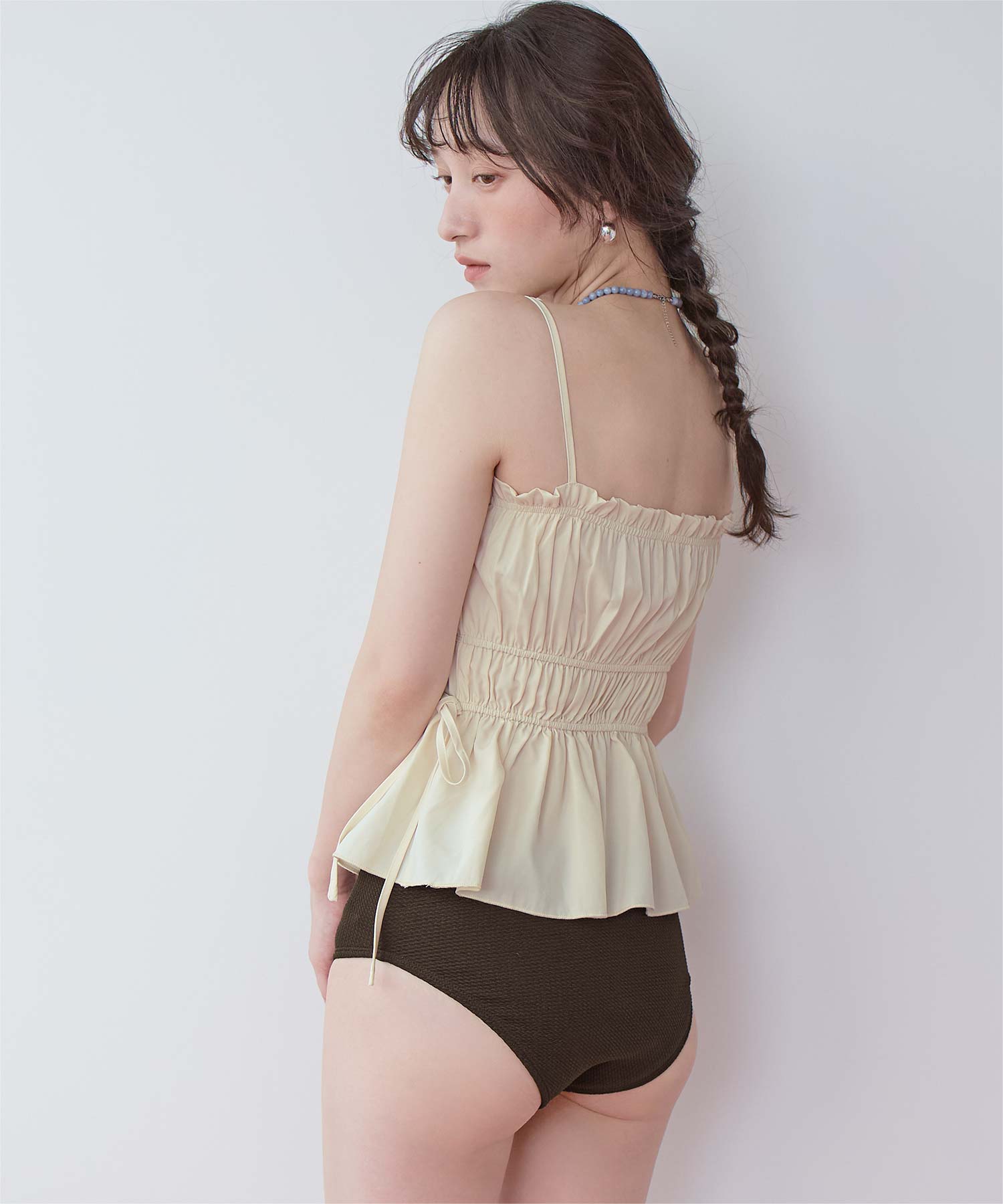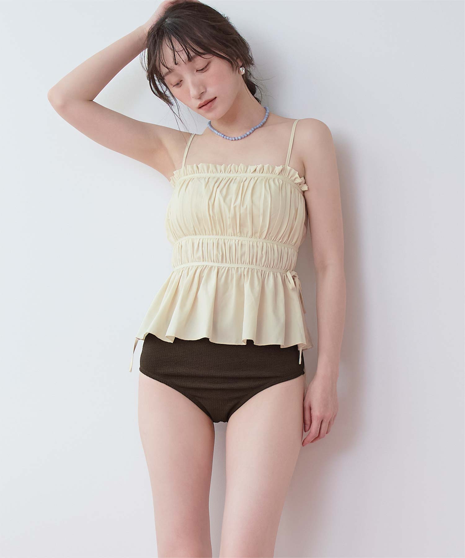 ボリュームのあるギャザーデザインが大人可愛いペプラムフレアビキニ。