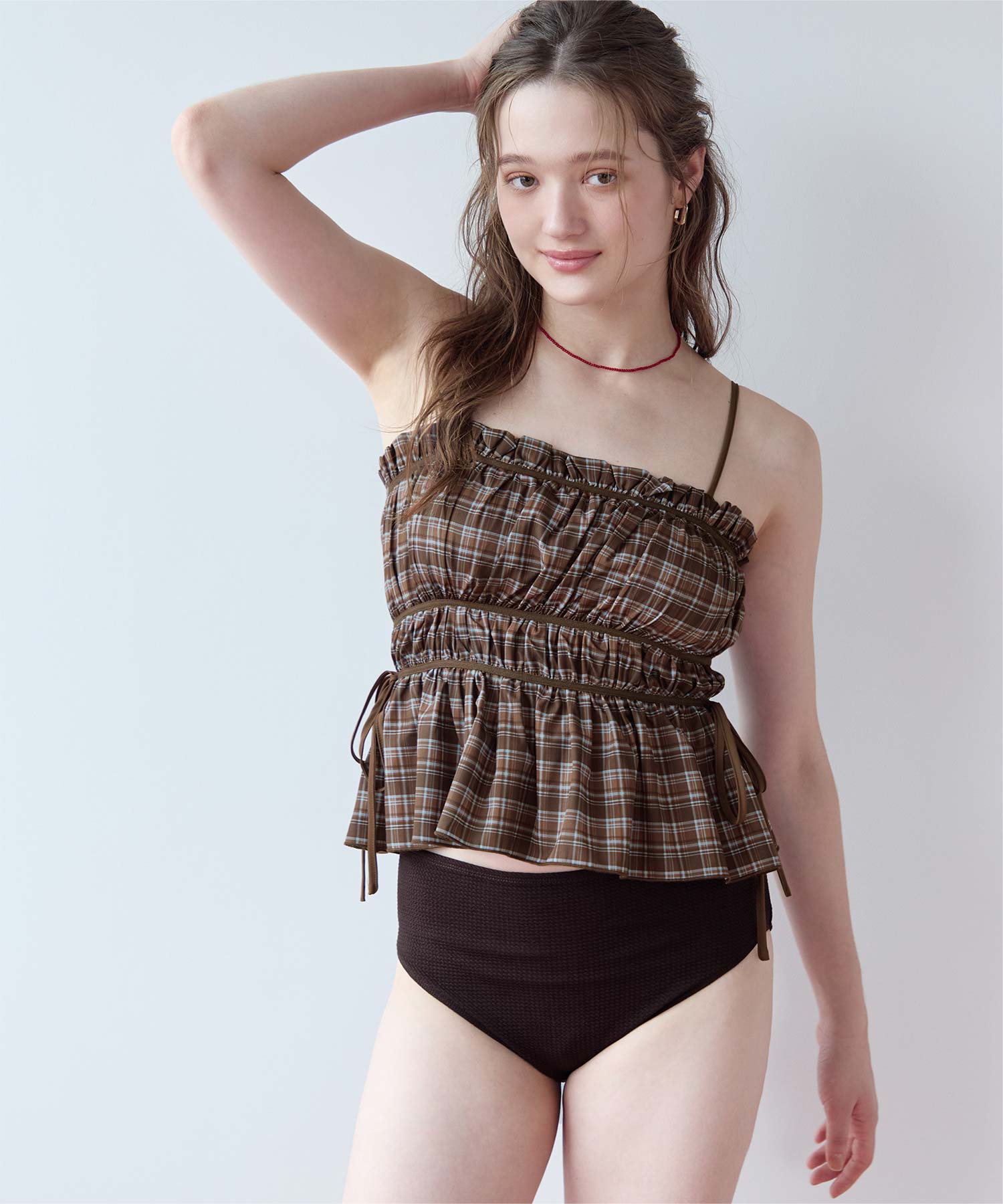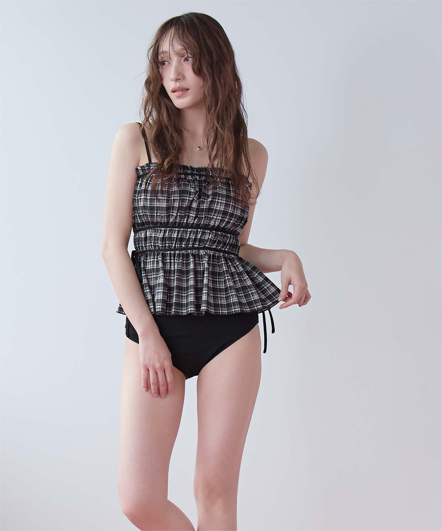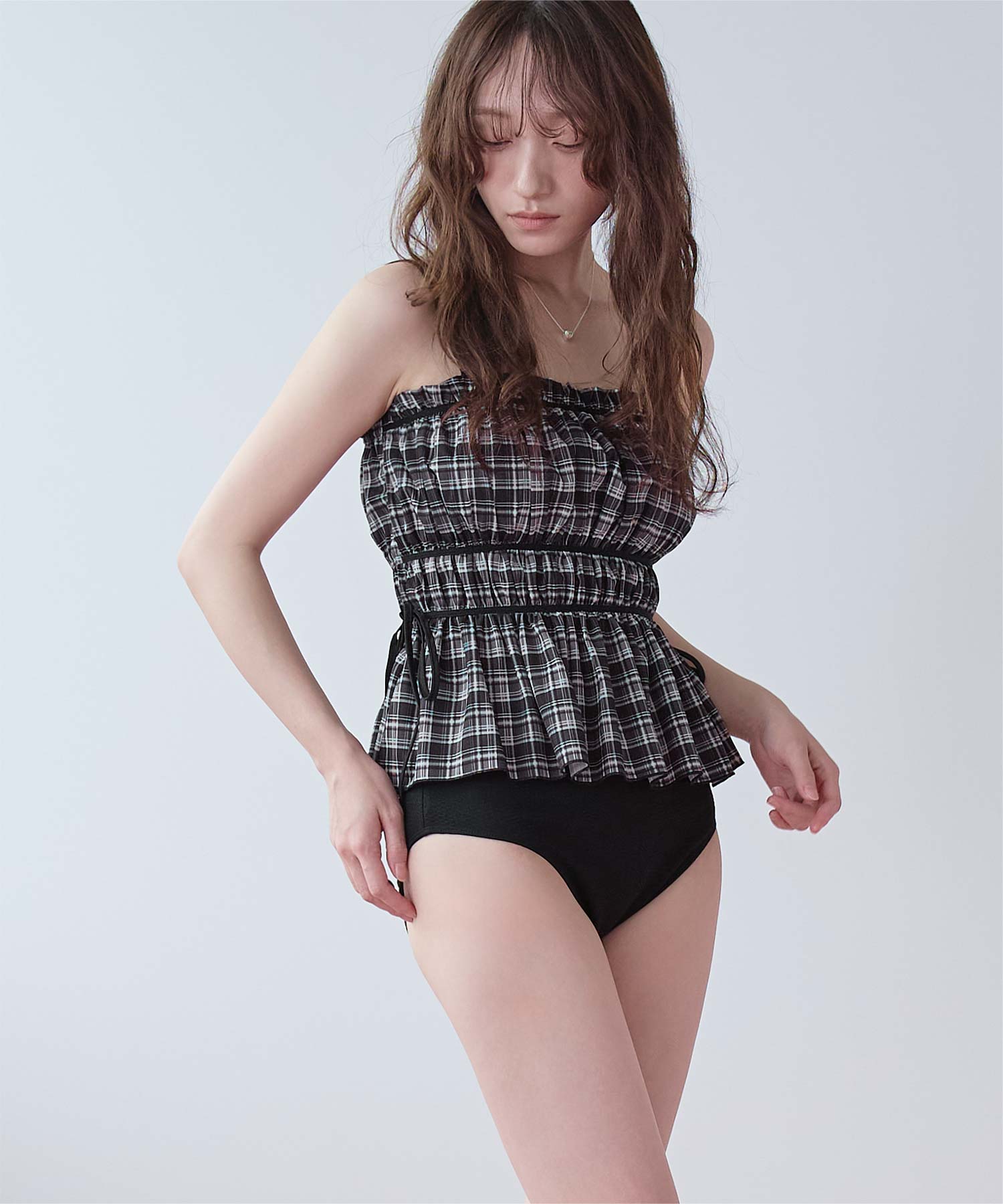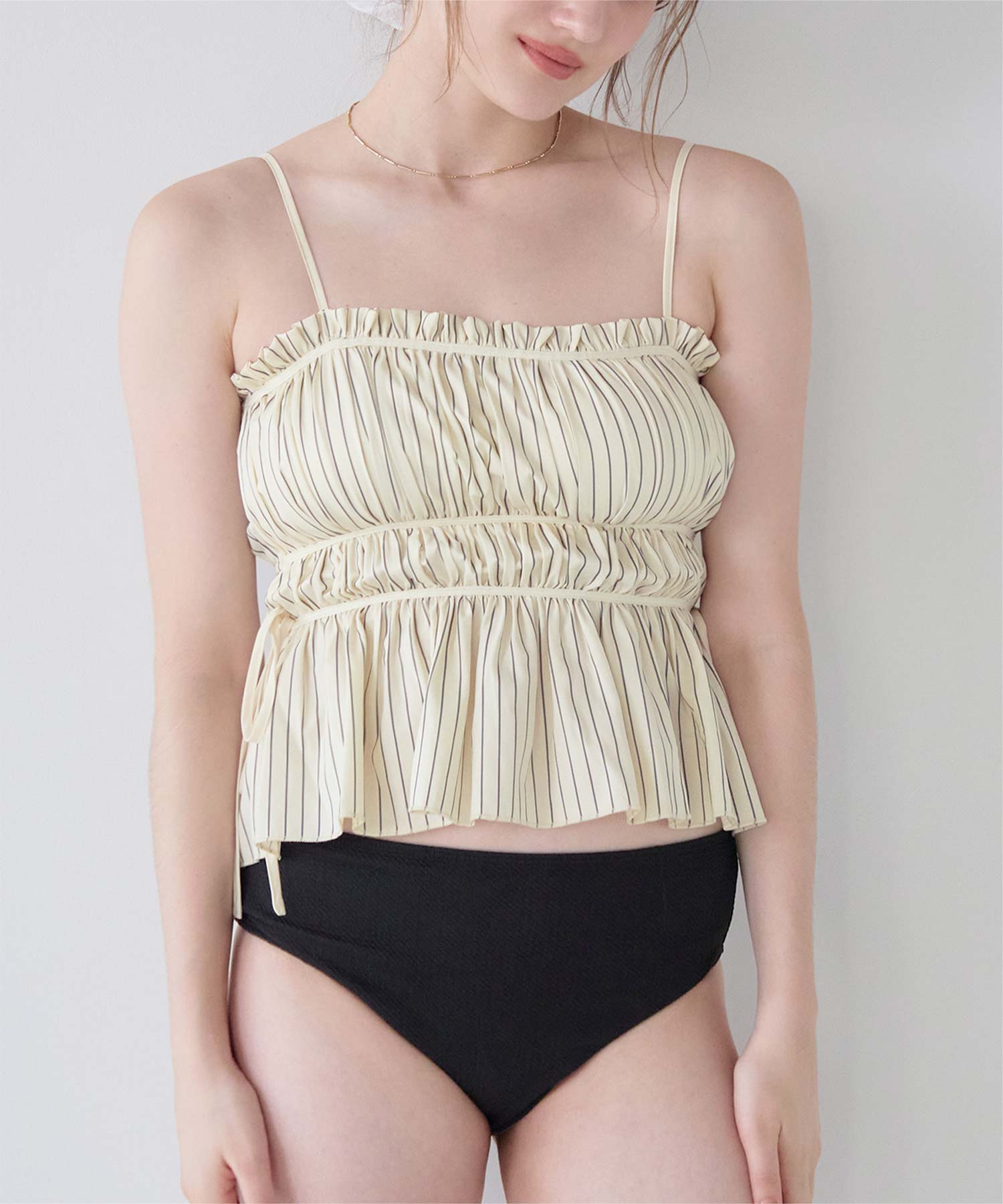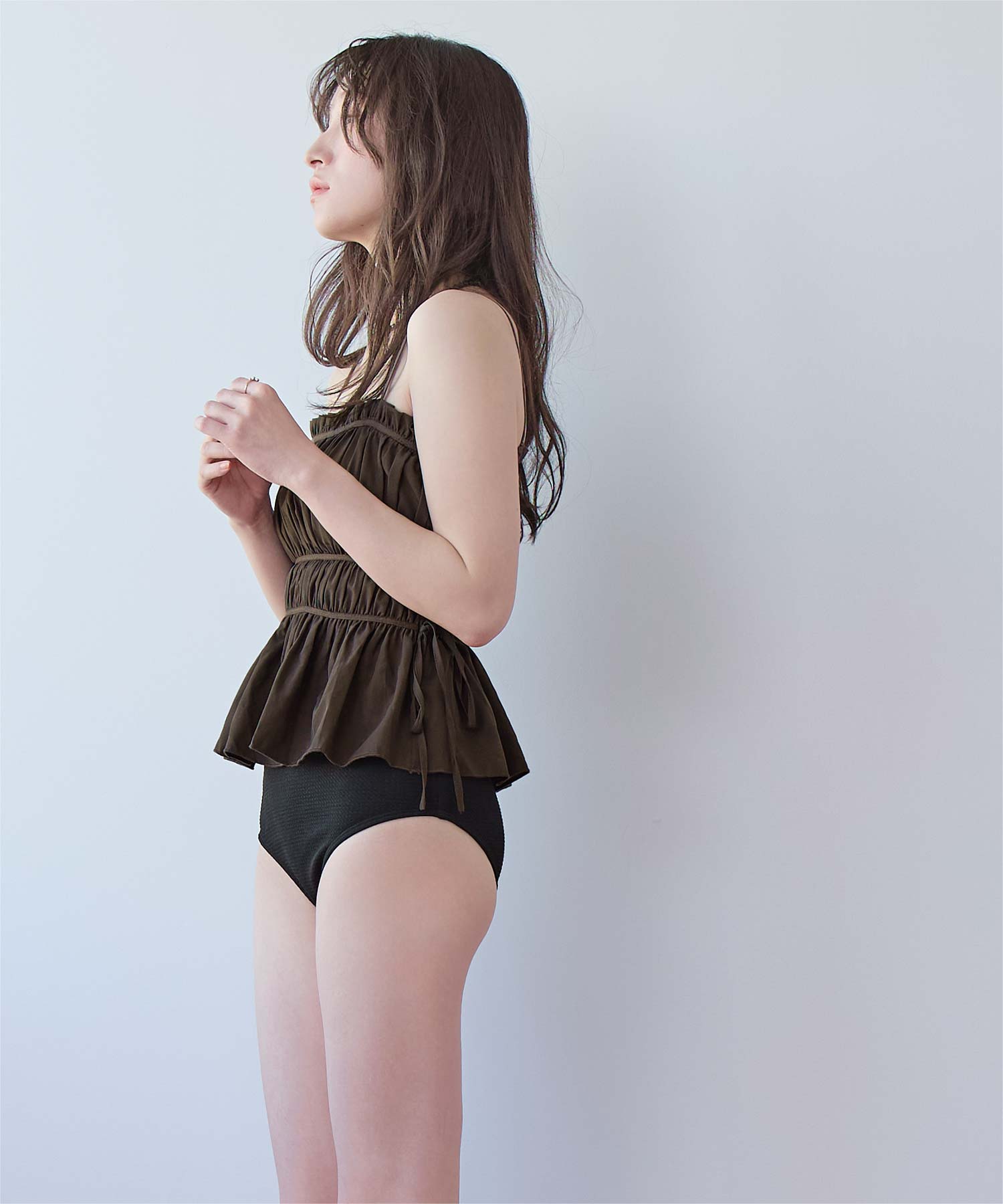 ボリュームのあるギャザーデザインが大人可愛いペプラムフレアビキニ。