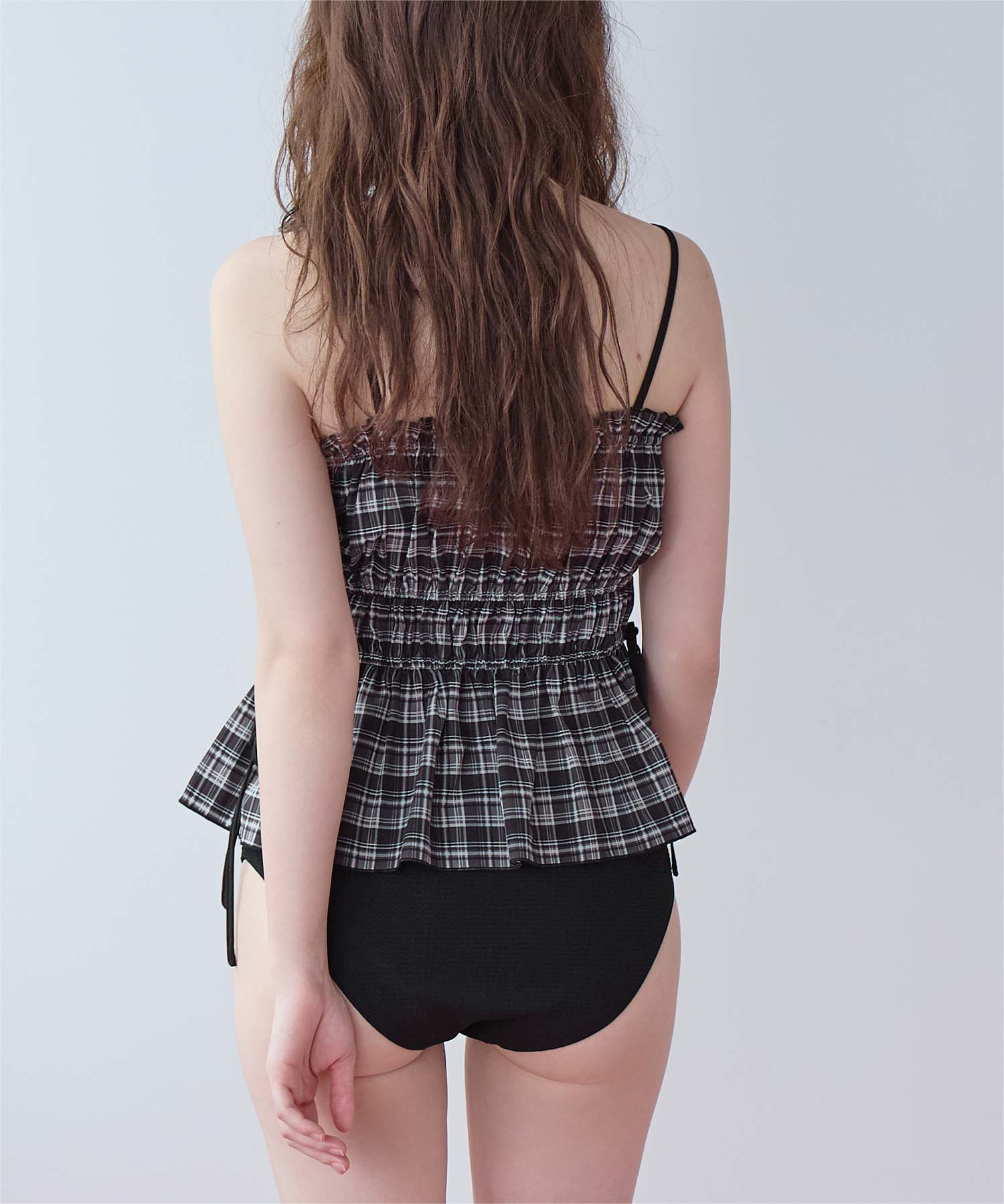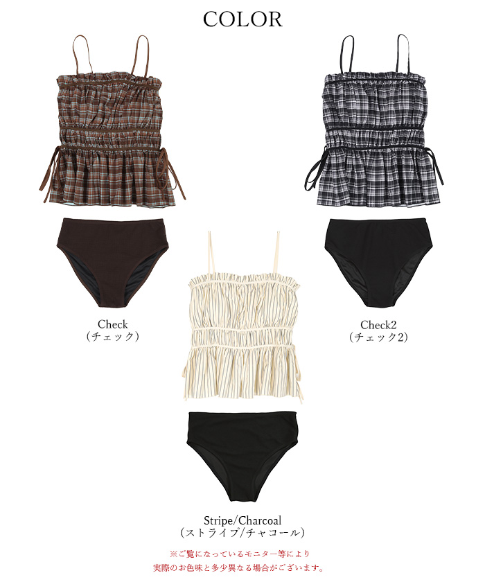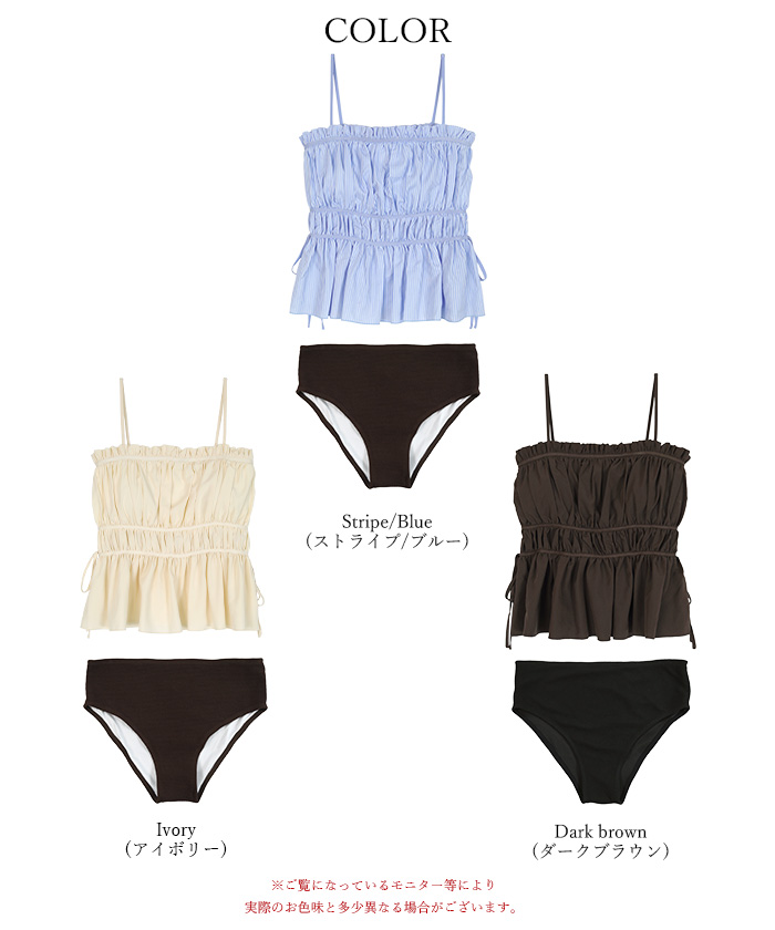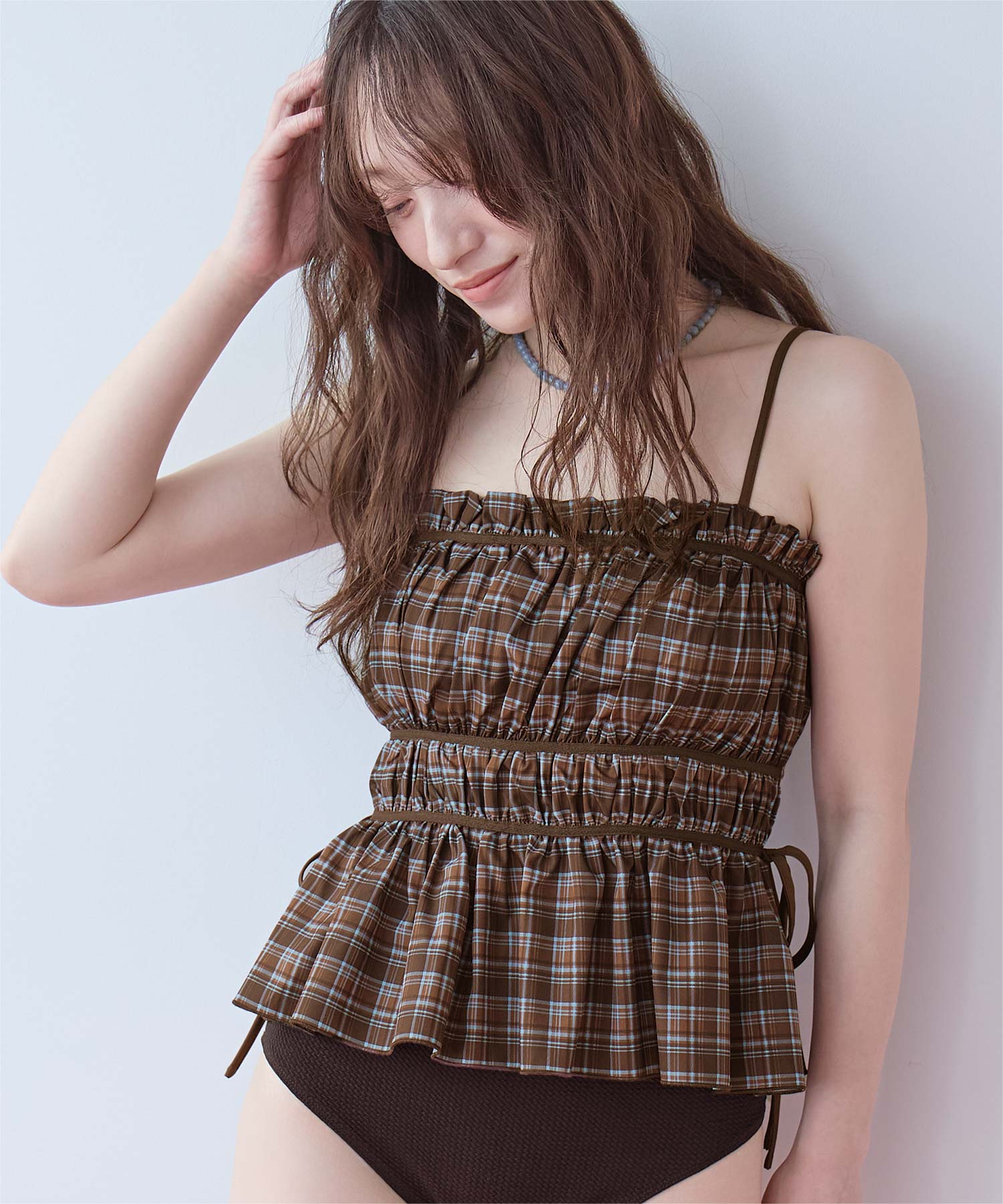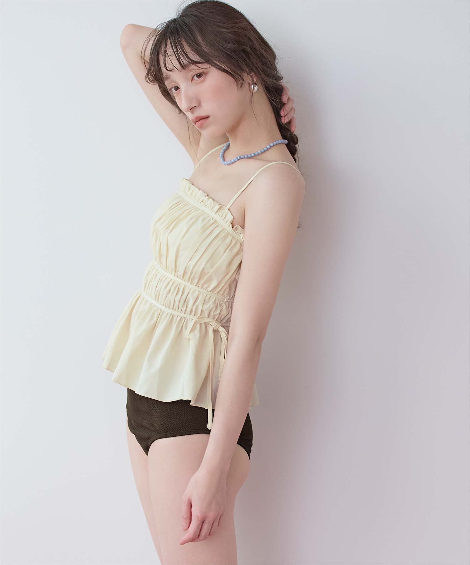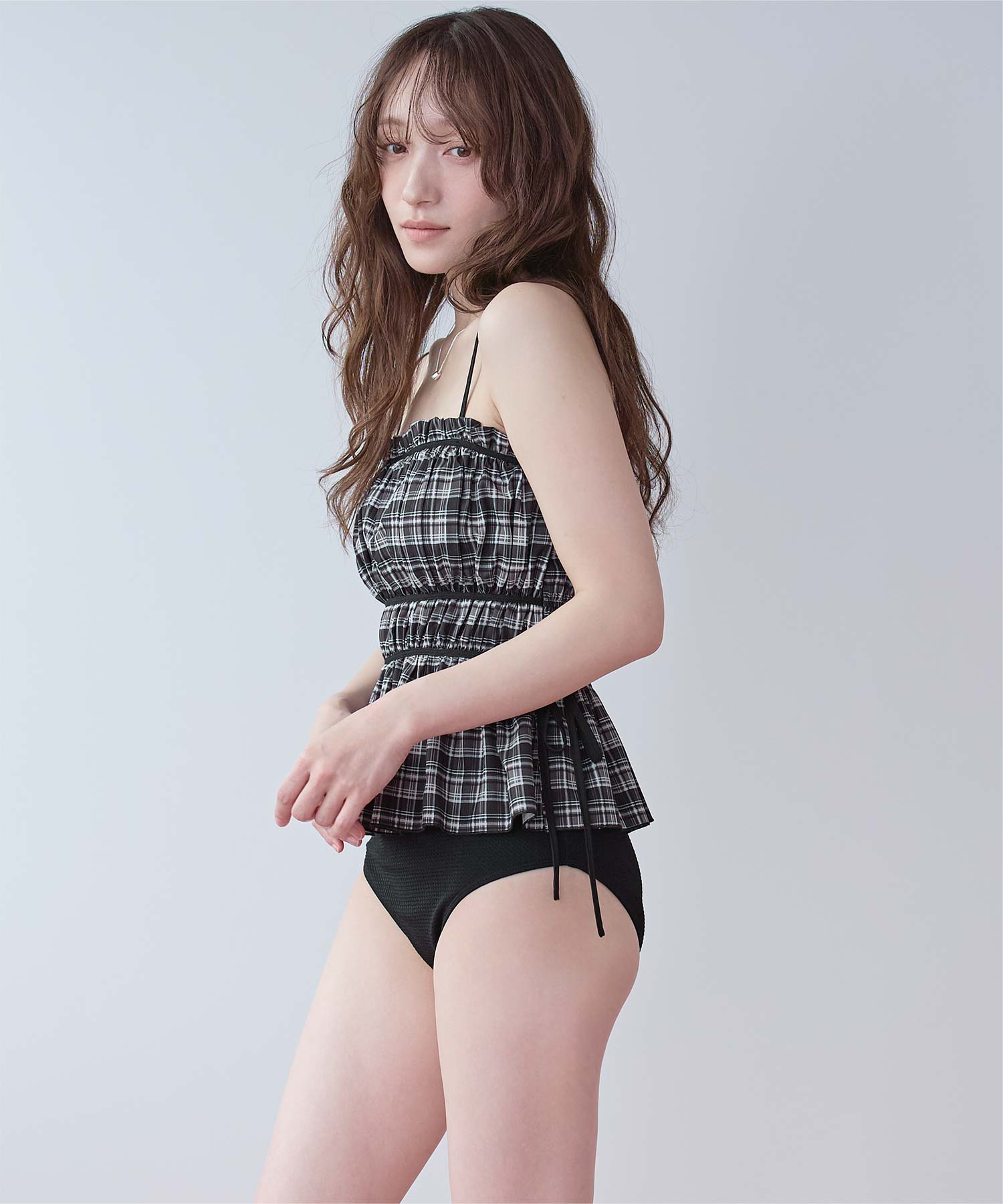 ボリュームのあるギャザーデザインが大人可愛いペプラムフレアビキニ。