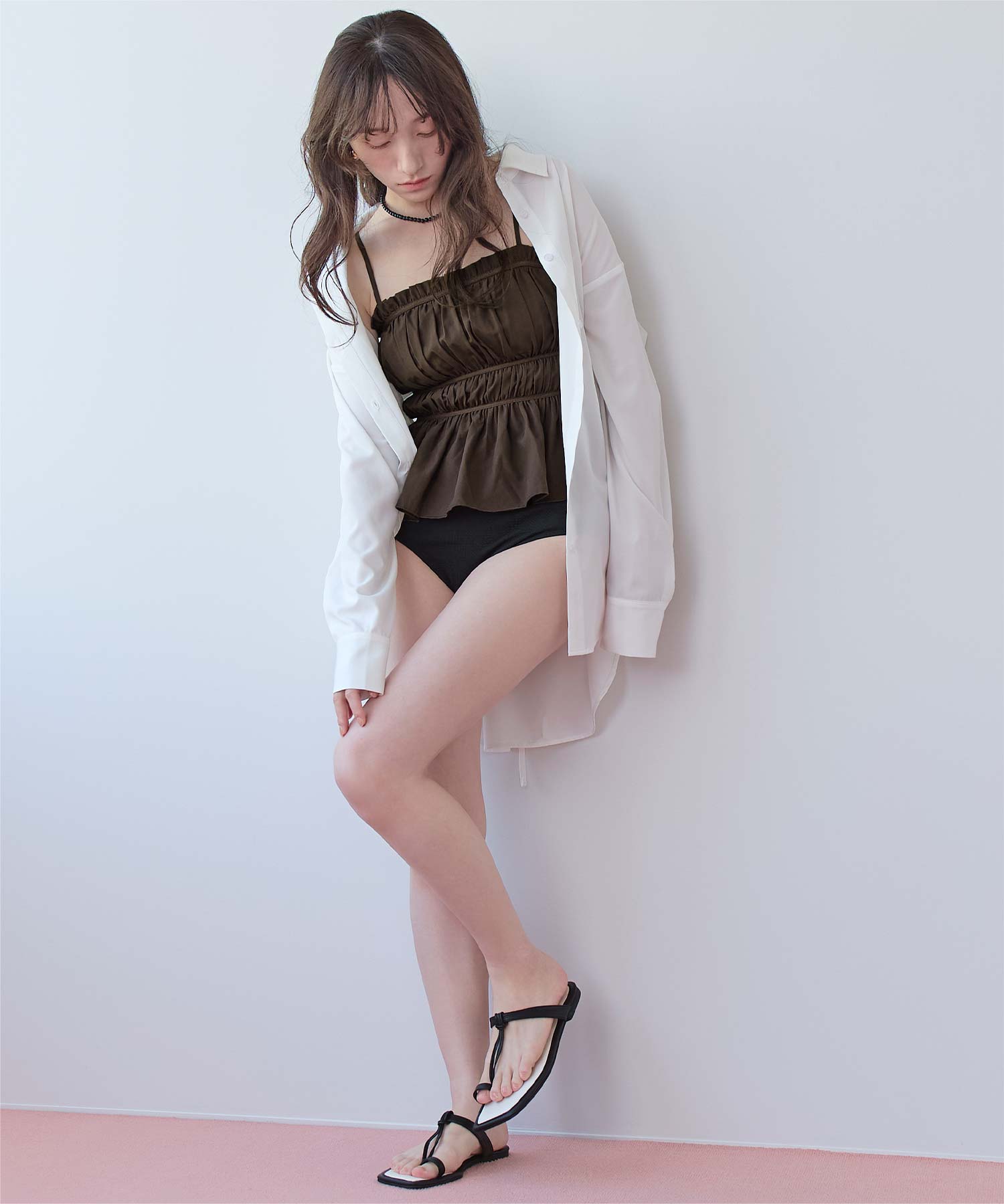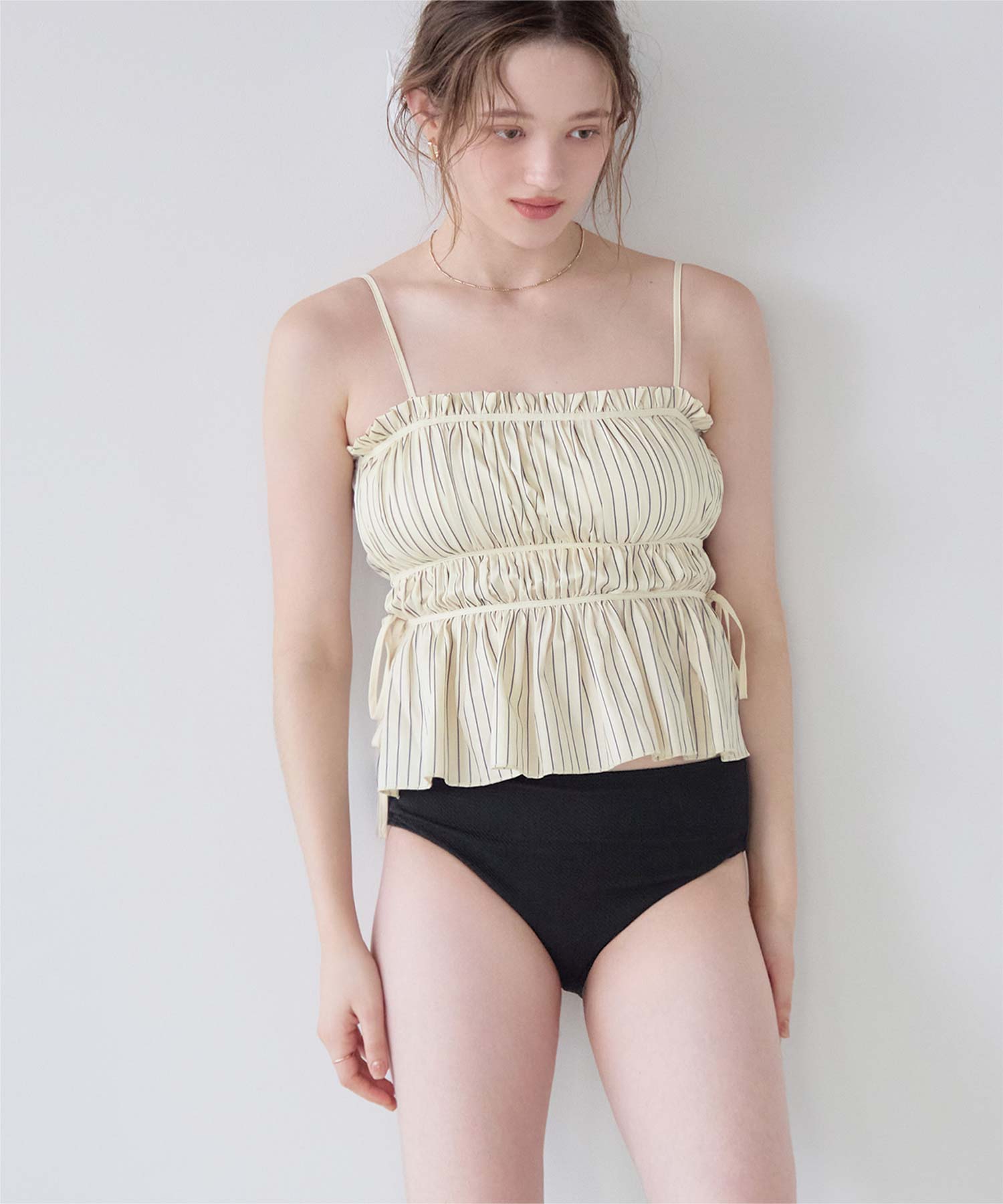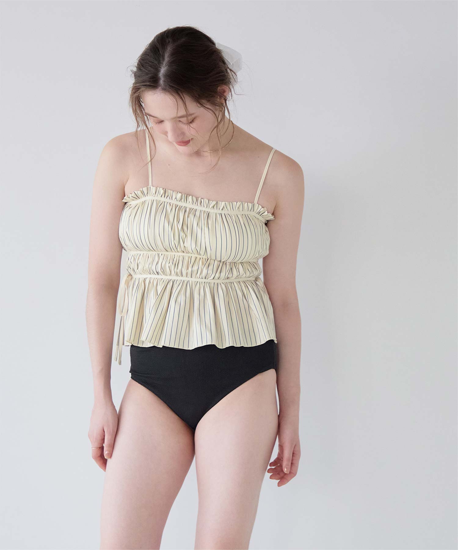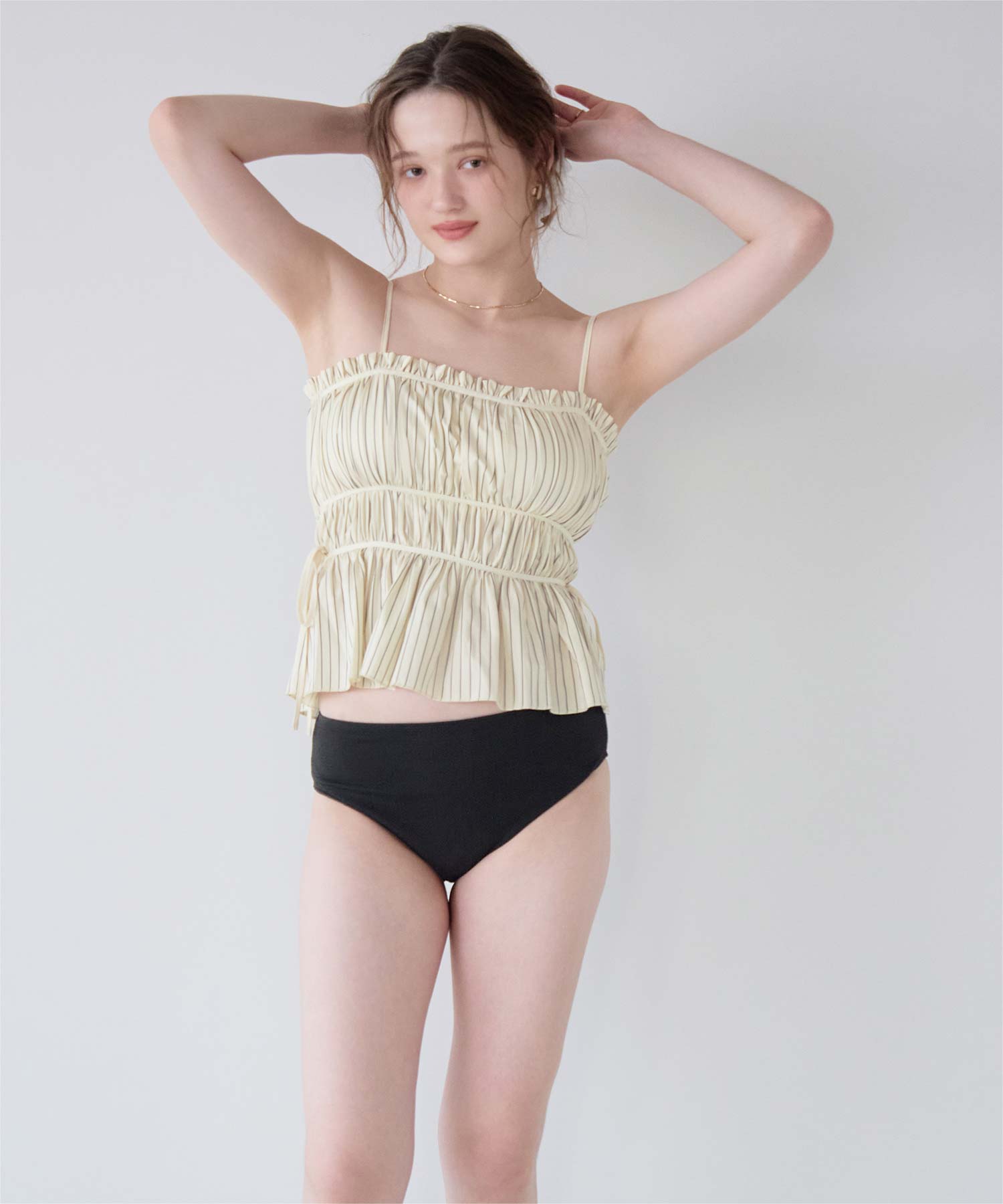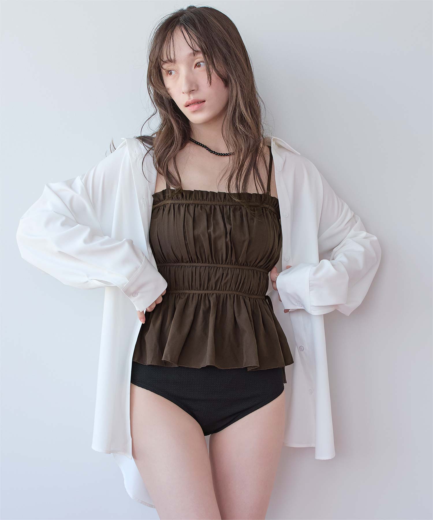 着脱しやすいゴム仕様のブラは、カップ付きトップスとしてデイリーのコーディネートにも使える万能アイテム。