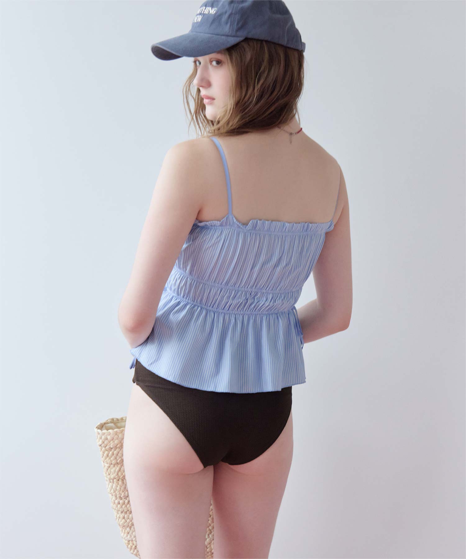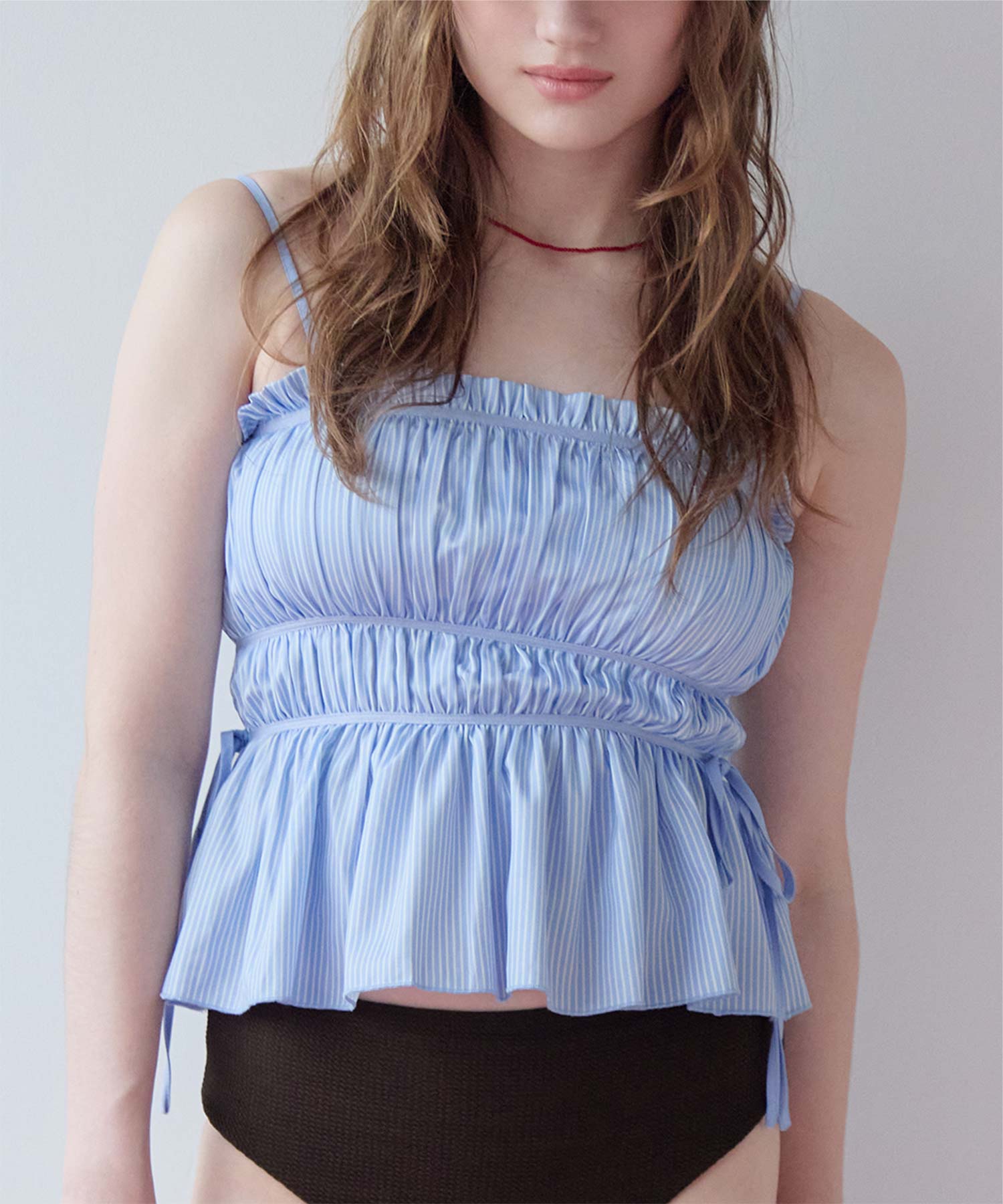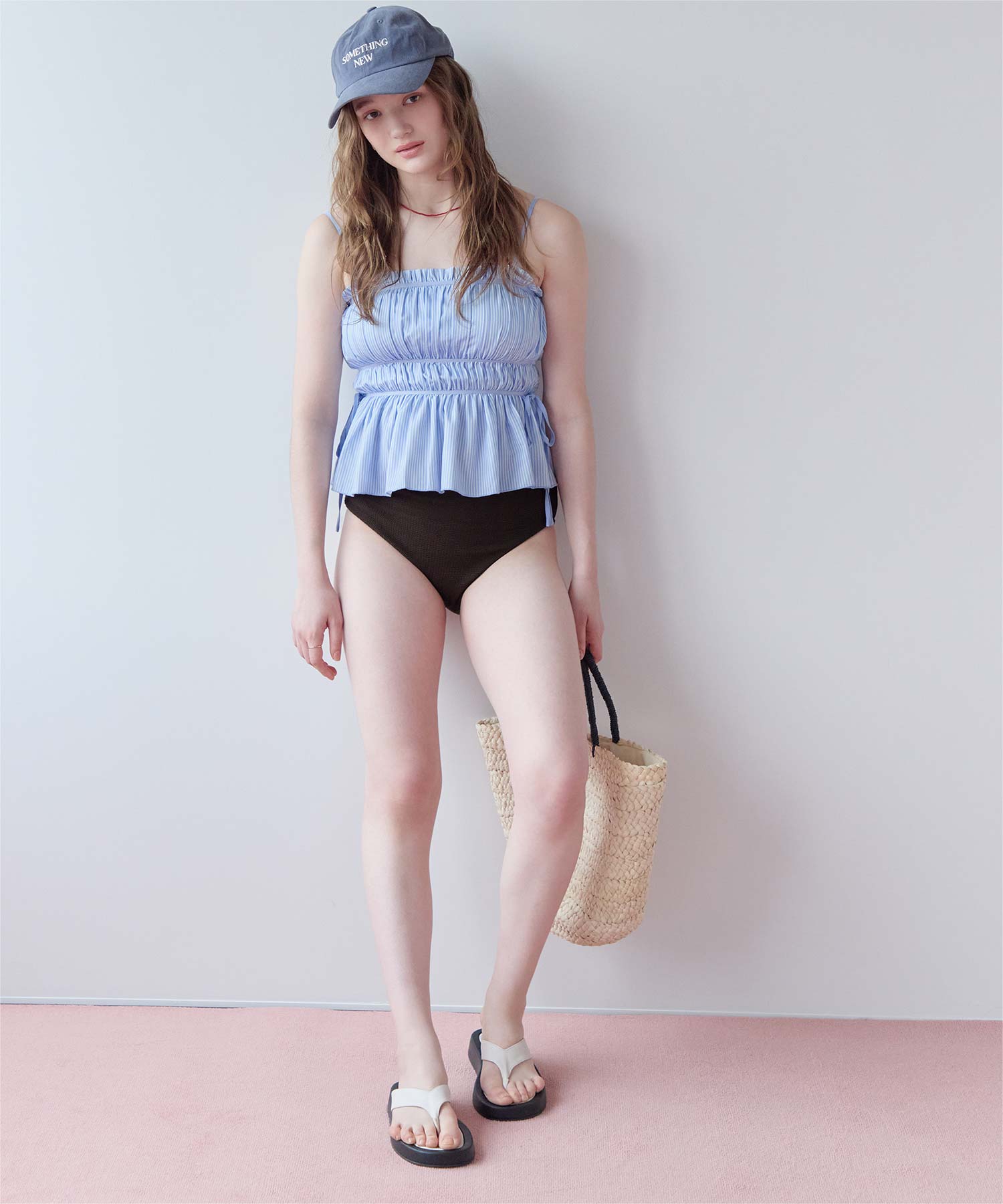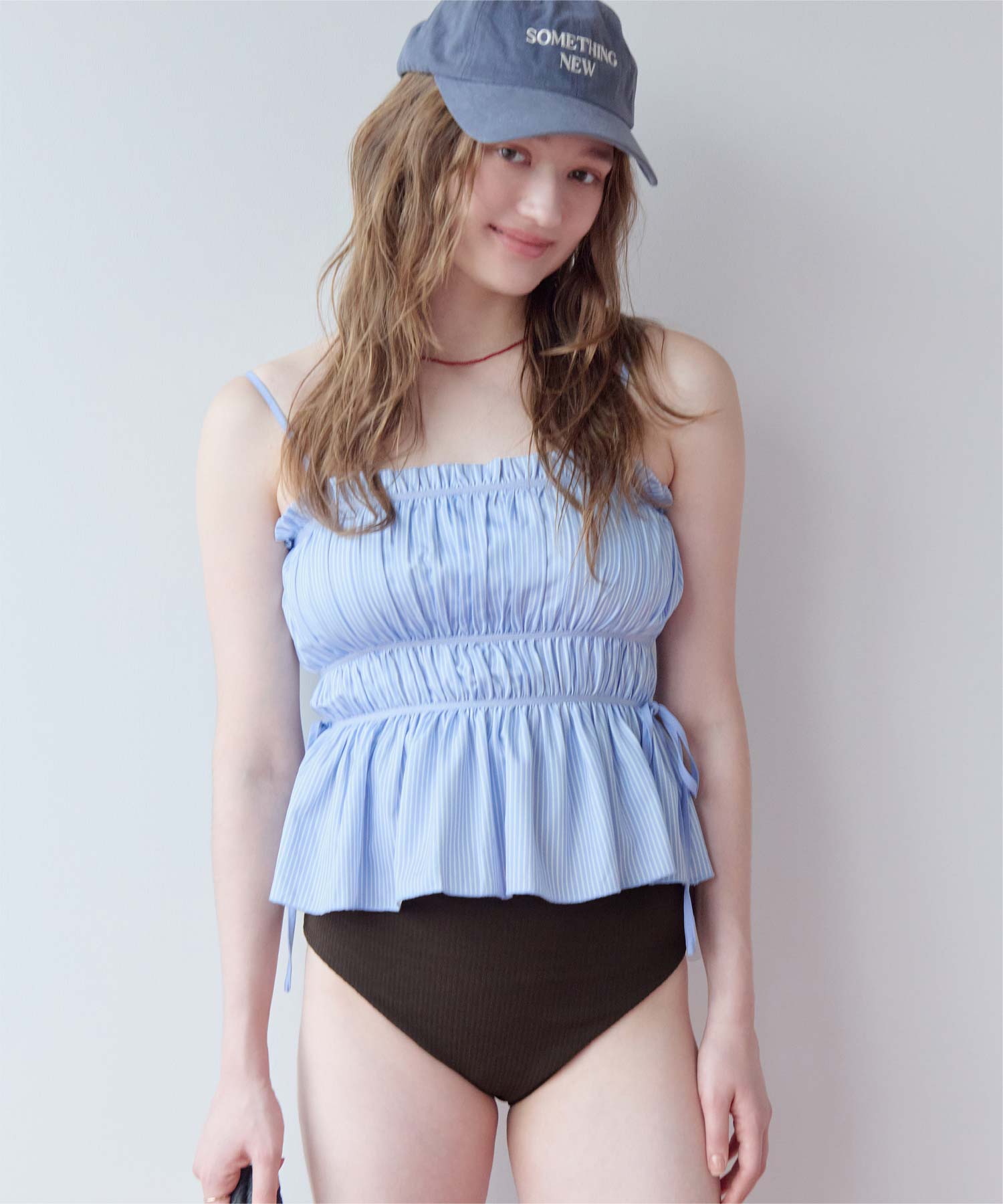 着脱しやすいゴム仕様のブラは、カップ付きトップスとしてデイリーのコーディネートにも使える万能アイテム。