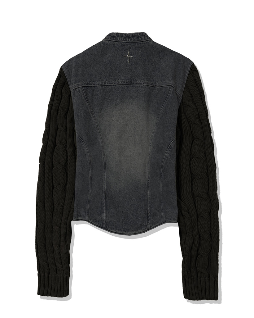 W Incision Knit Sleeve Denim Jacket - Black