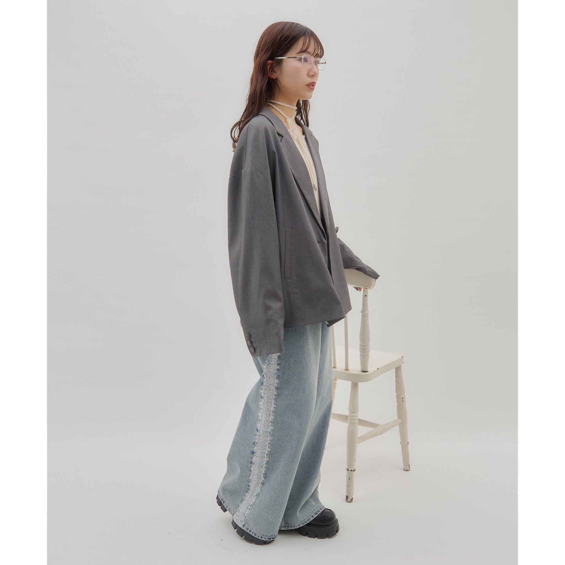 152cmスタッフ(Sサイズ):ワイドシルエットが綺麗なパンツは、サイドレースが甘さをプラスしてくれます!スニーカーでゆるっと合わせるのがおすすめです♪