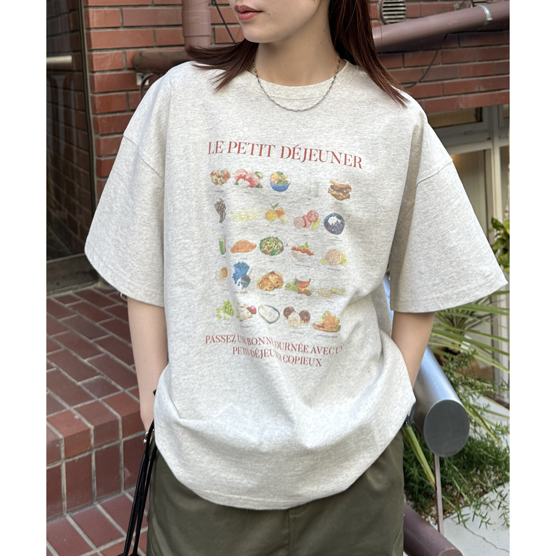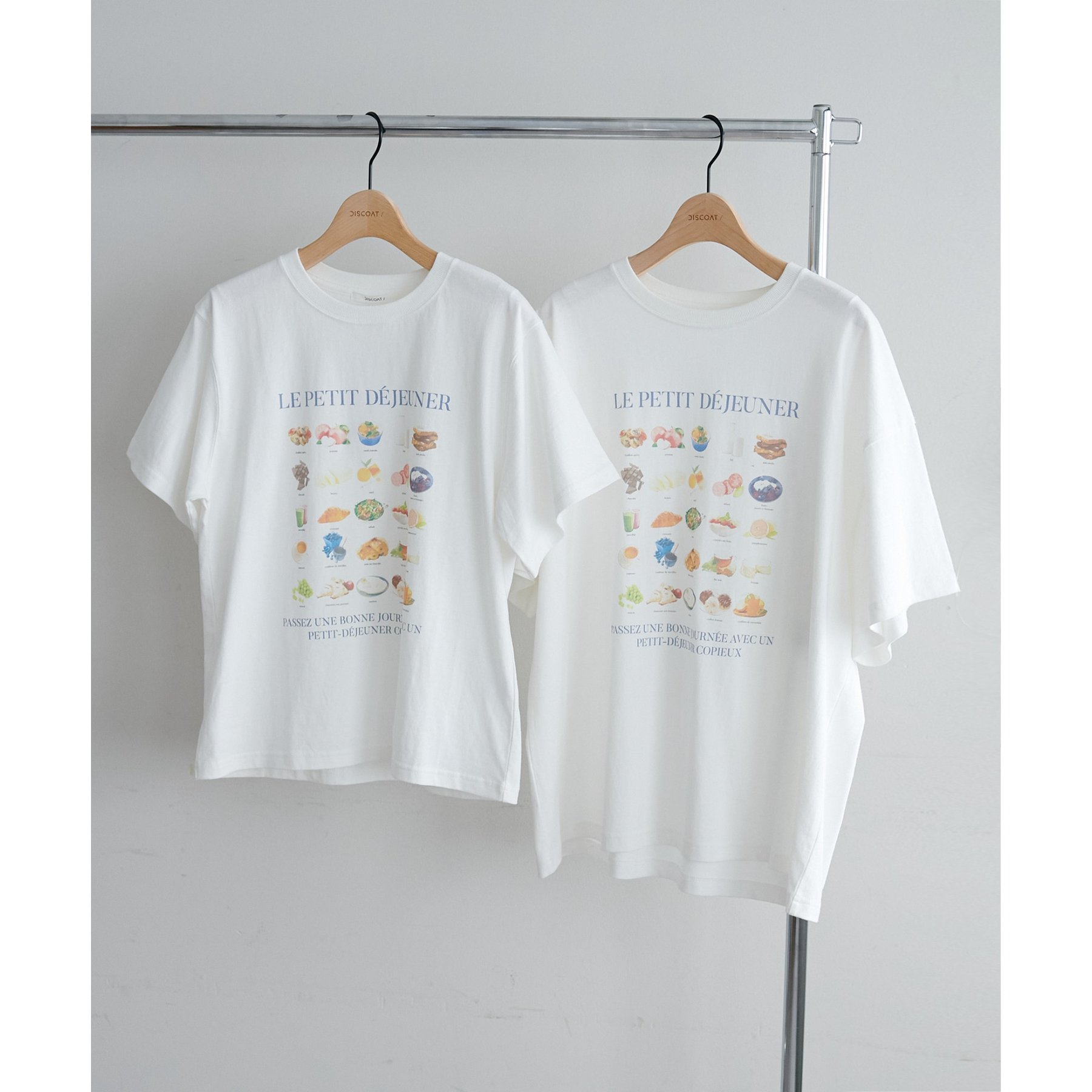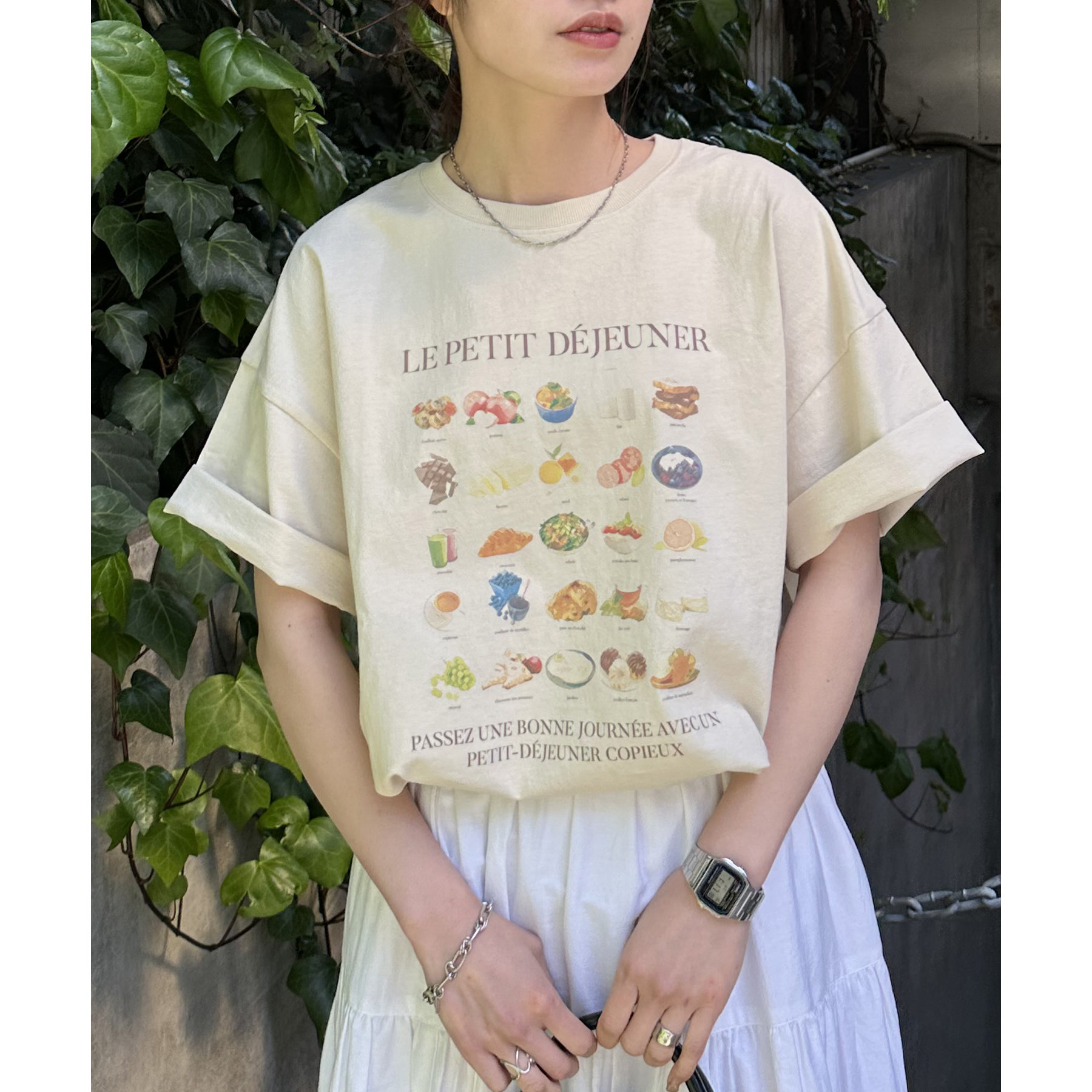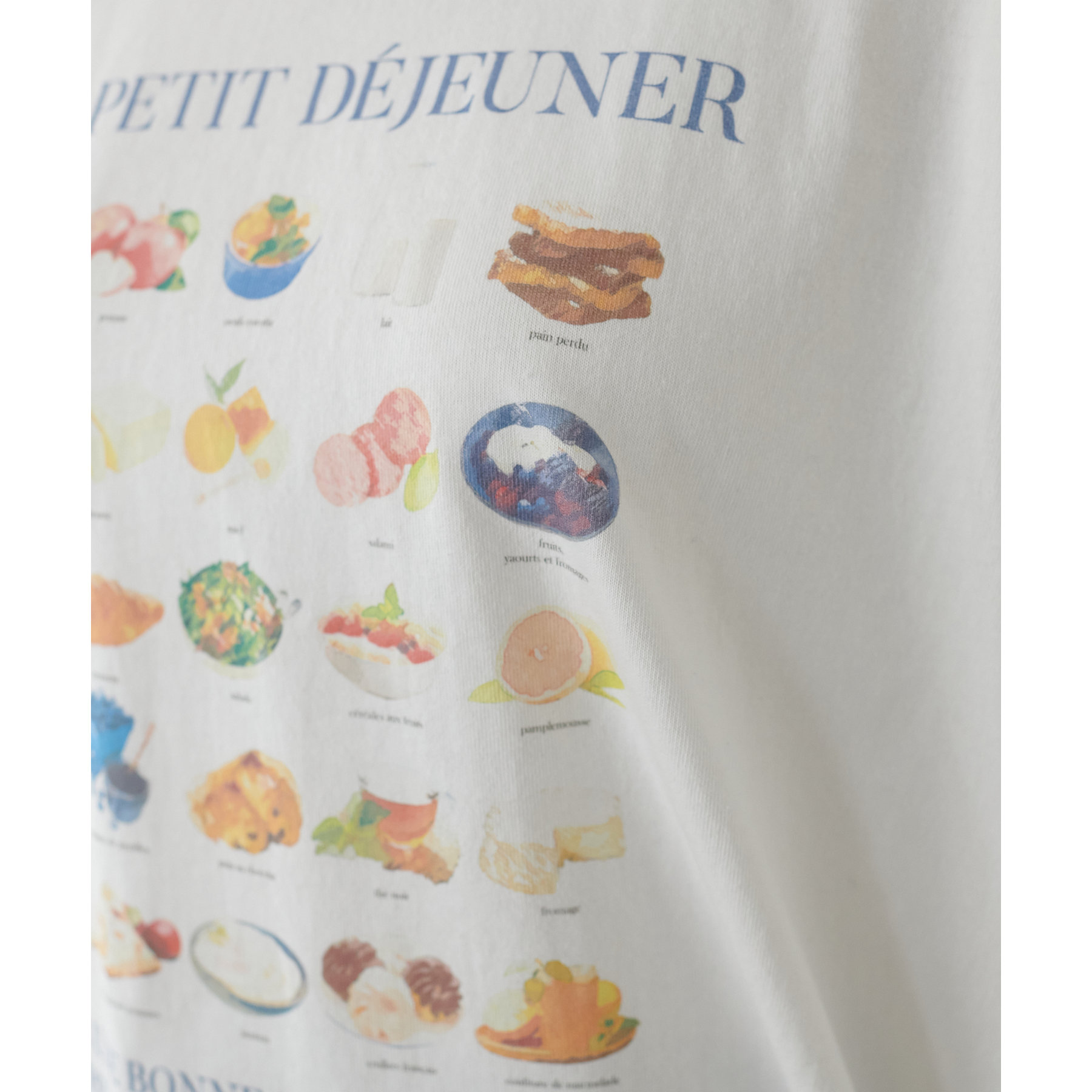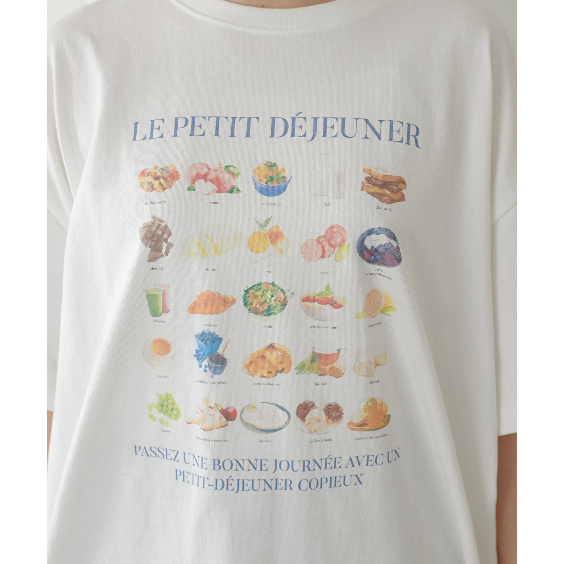 フランス語で「朝食」を意味する「LE PETIT DÉJEUNER」のロゴと、カラフルで可愛らしい朝食モチーフのイラストがプリントされたグラフィックTシャツ。