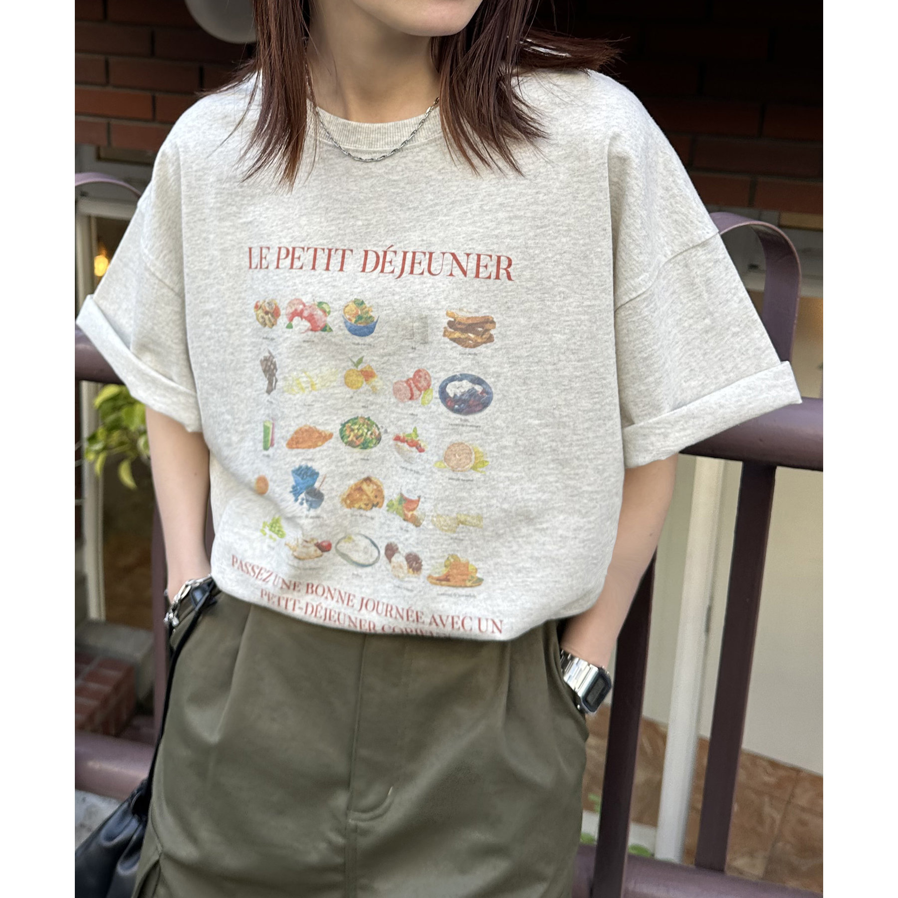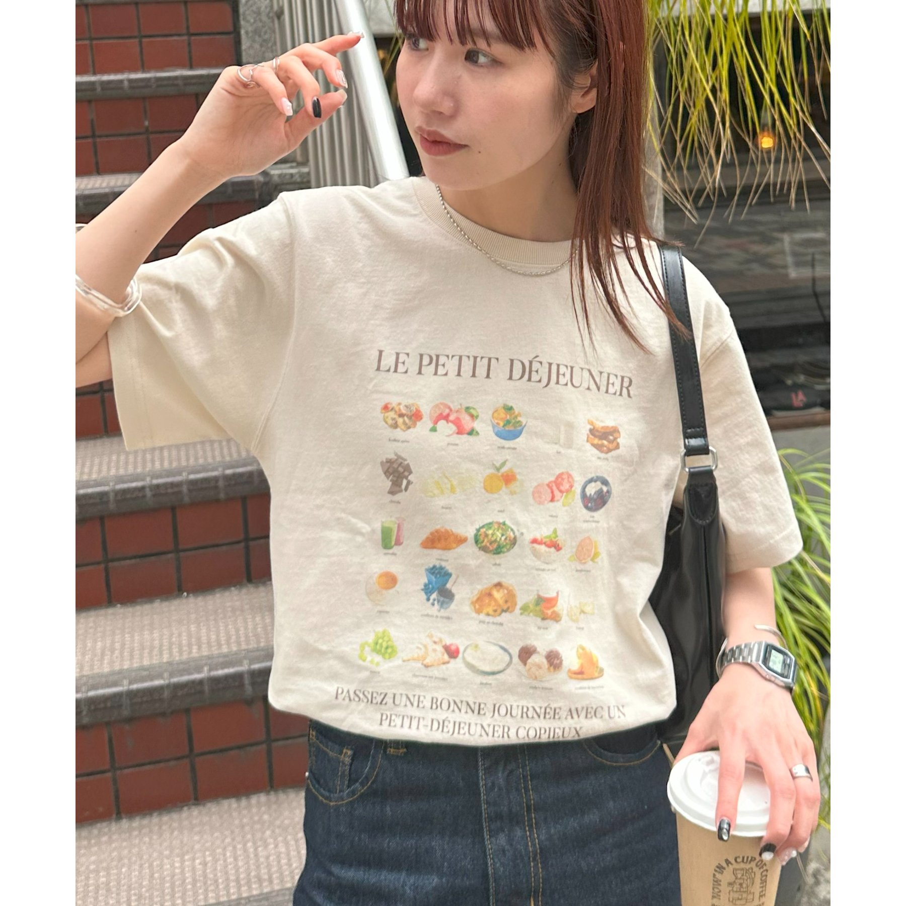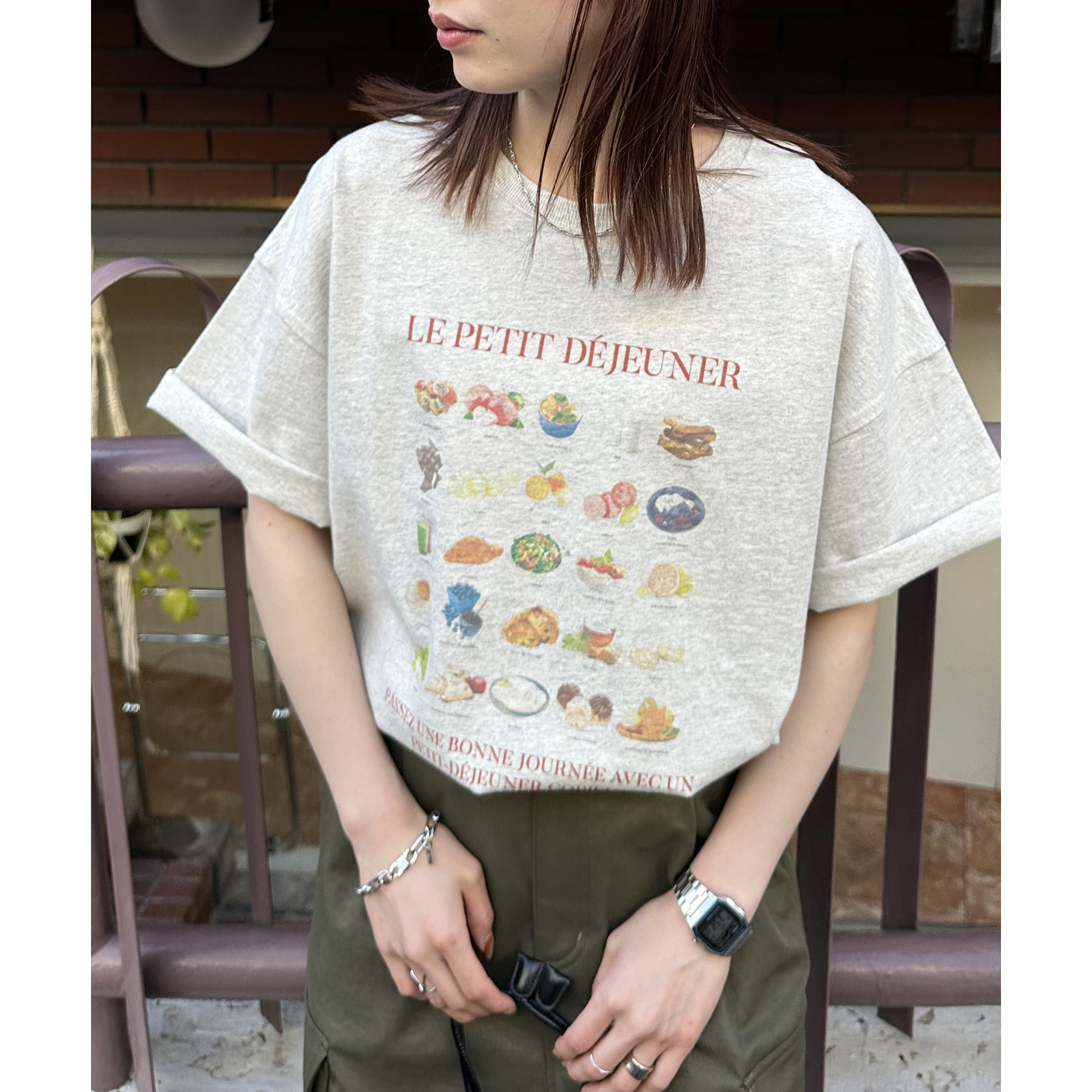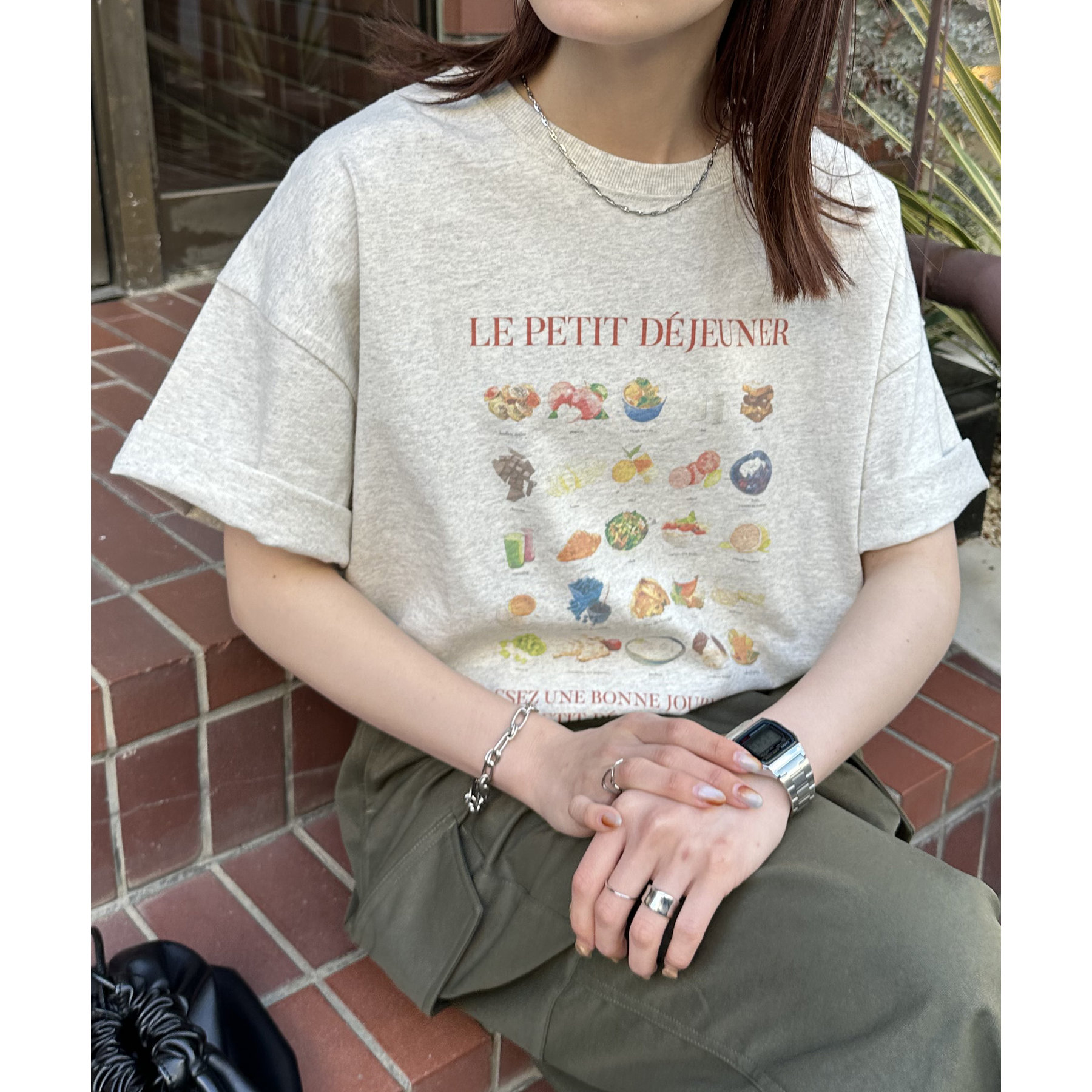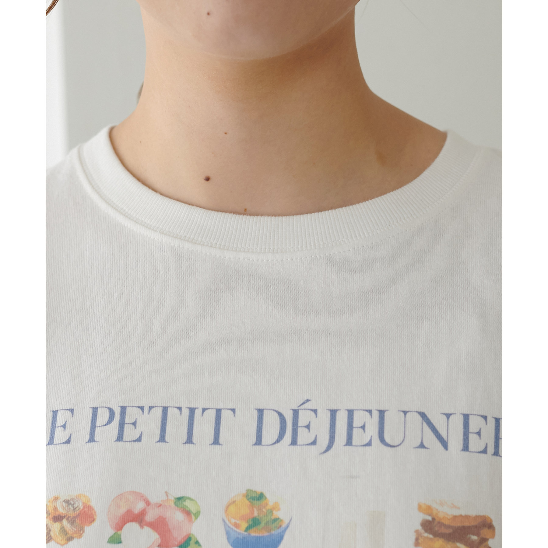 フランス語で「朝食」を意味する「LE PETIT DÉJEUNER」のロゴと、カラフルで可愛らしい朝食モチーフのイラストがプリントされたグラフィックTシャツ。