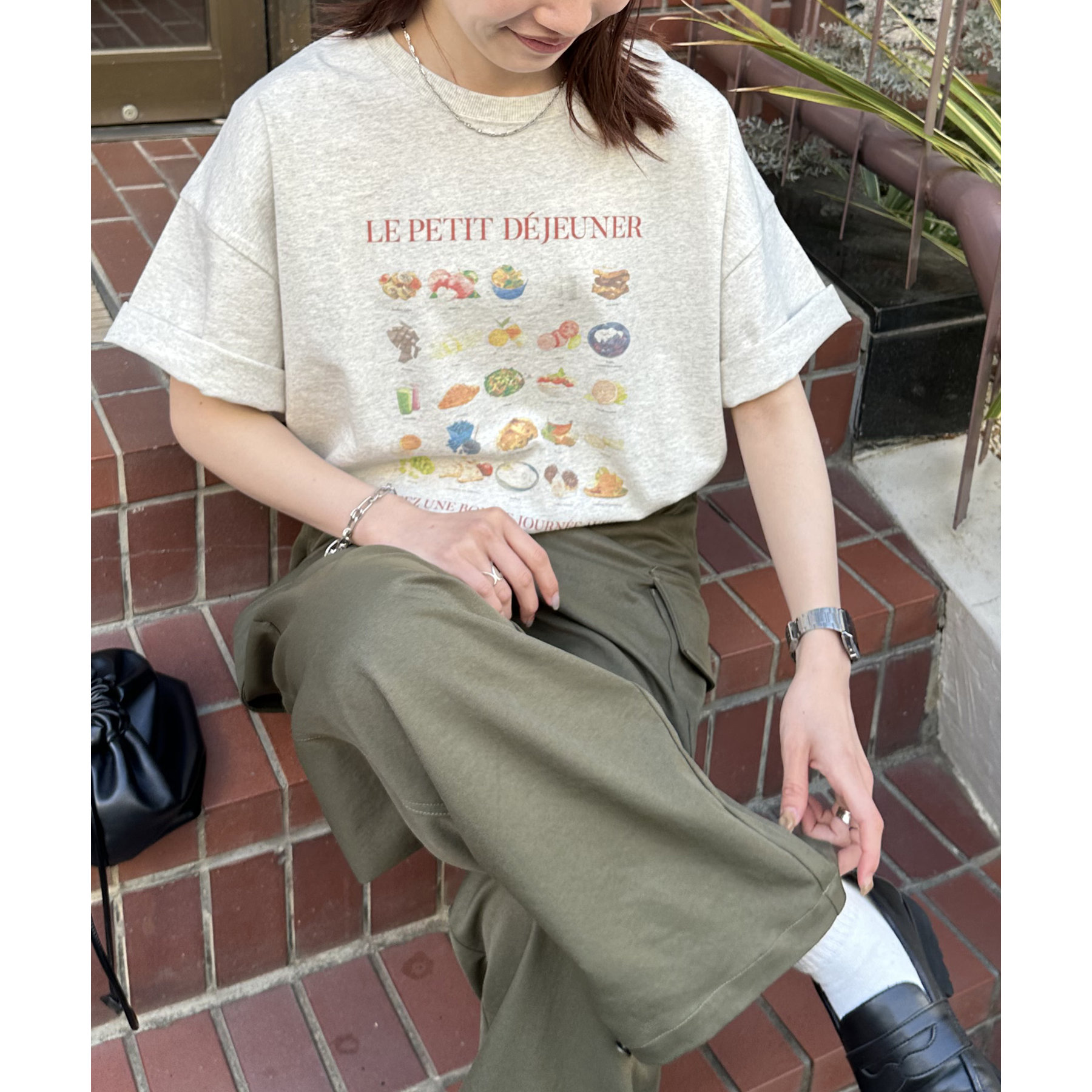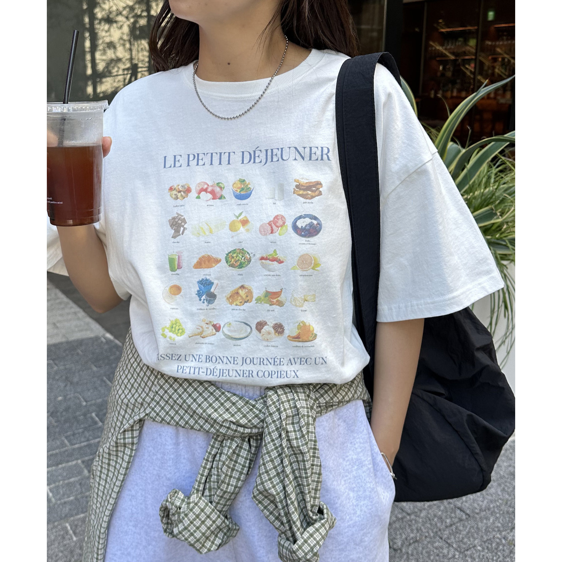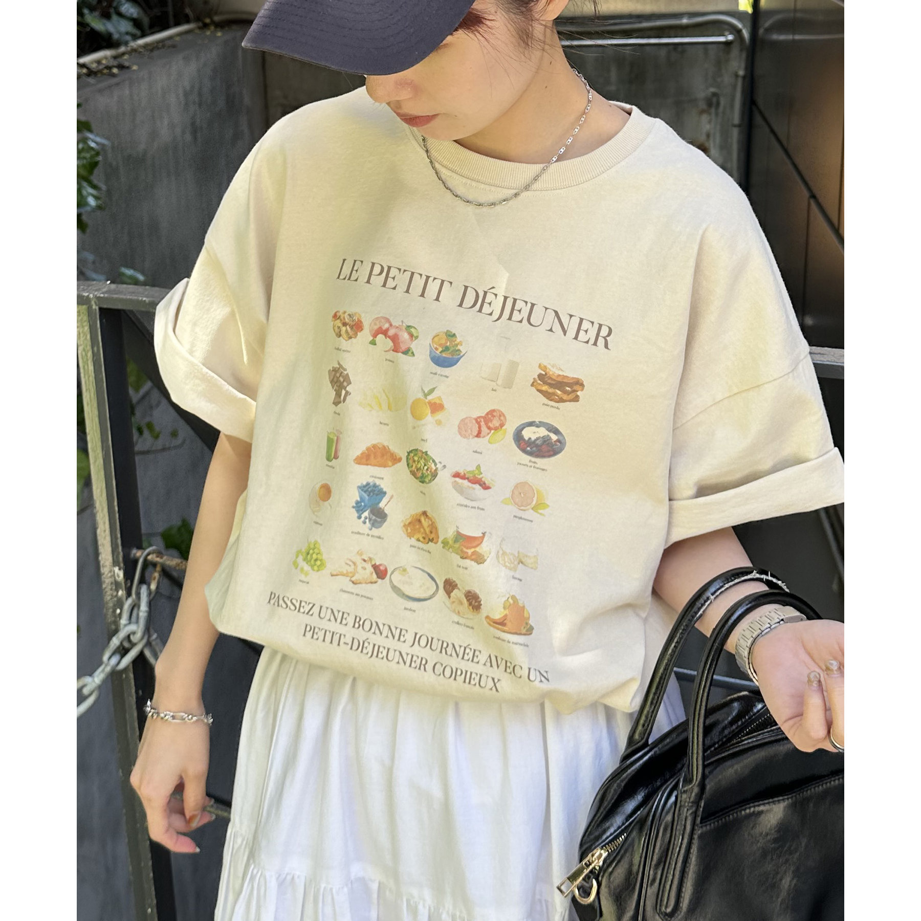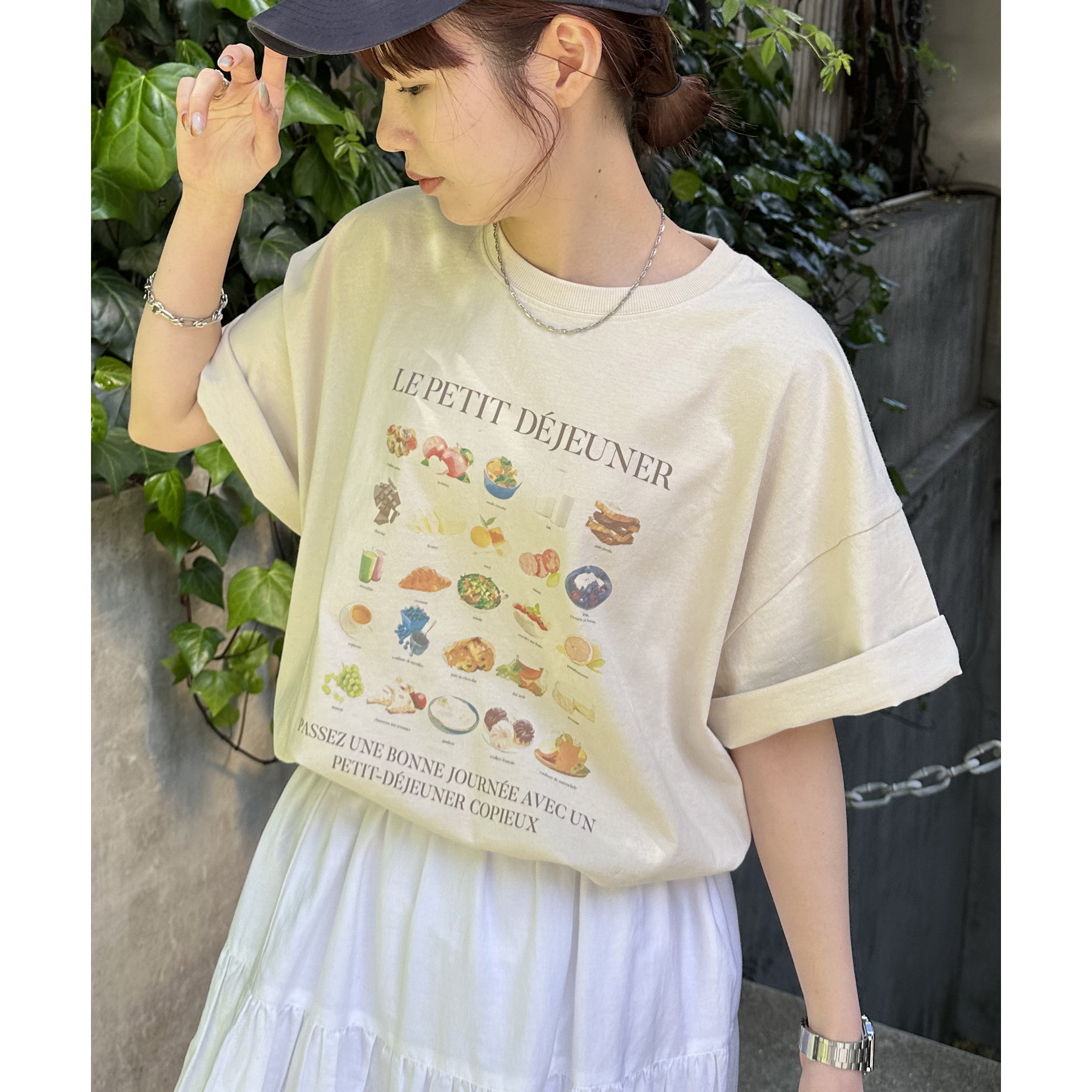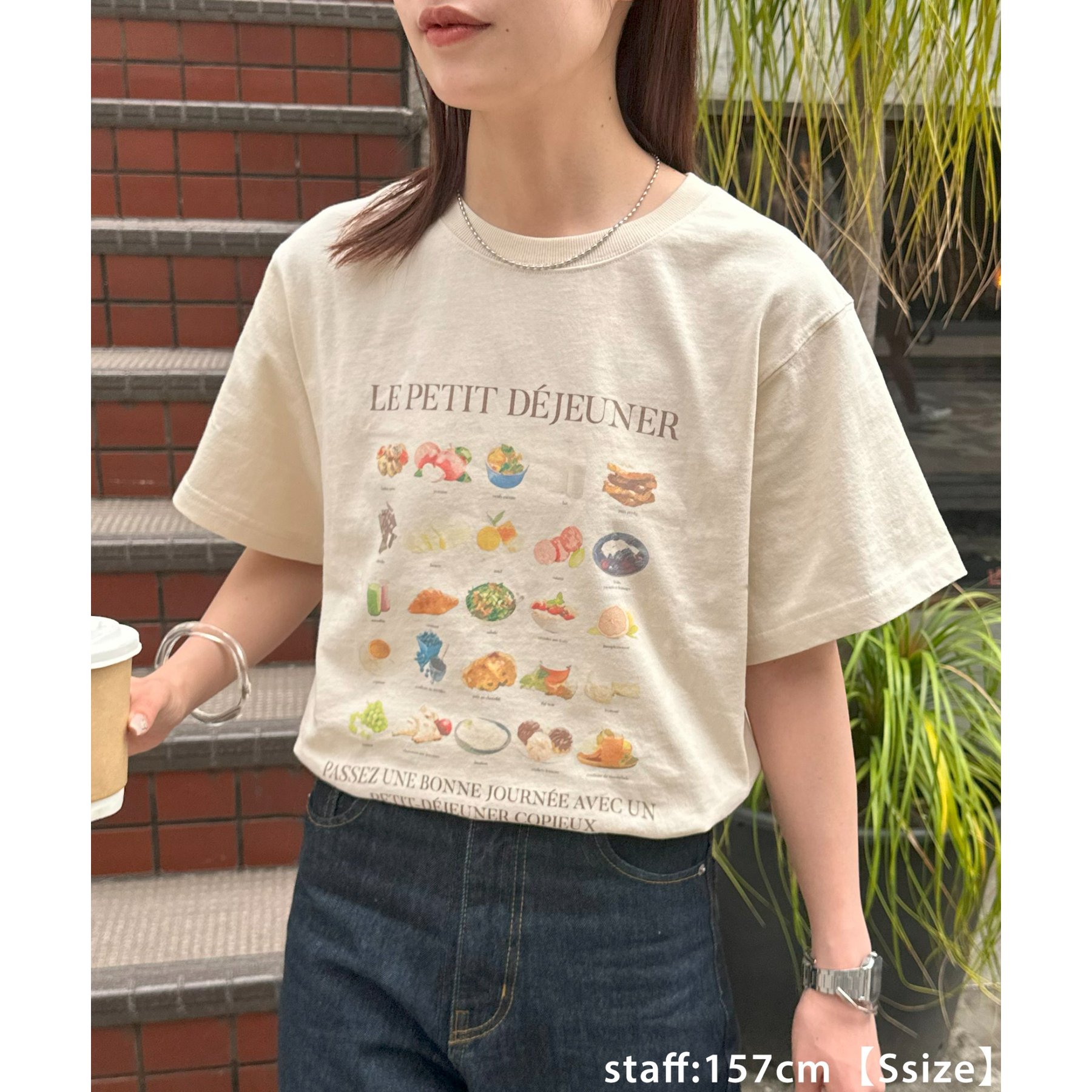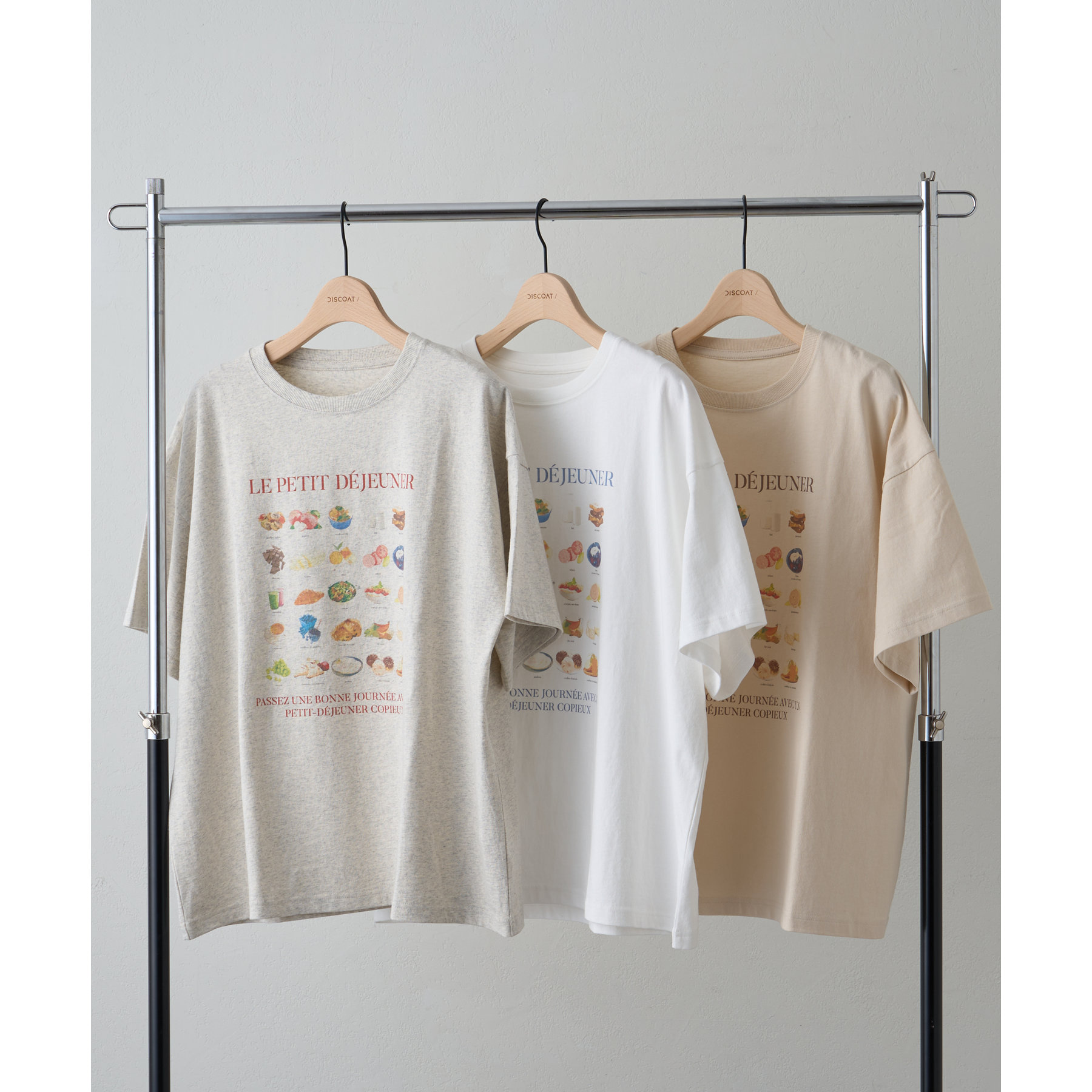 フランス語で「朝食」を意味する「LE PETIT DÉJEUNER」のロゴと、カラフルで可愛らしい朝食モチーフのイラストがプリントされたグラフィックTシャツ。