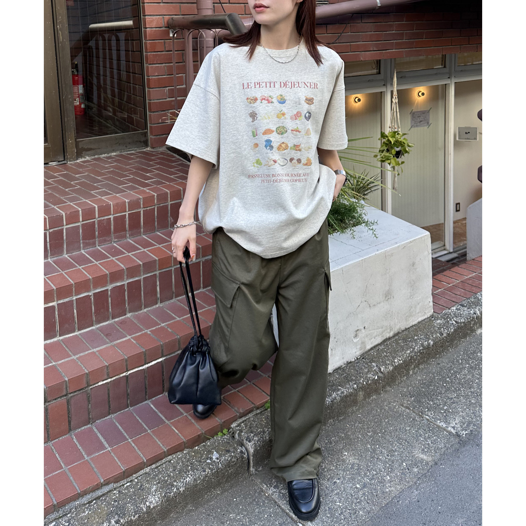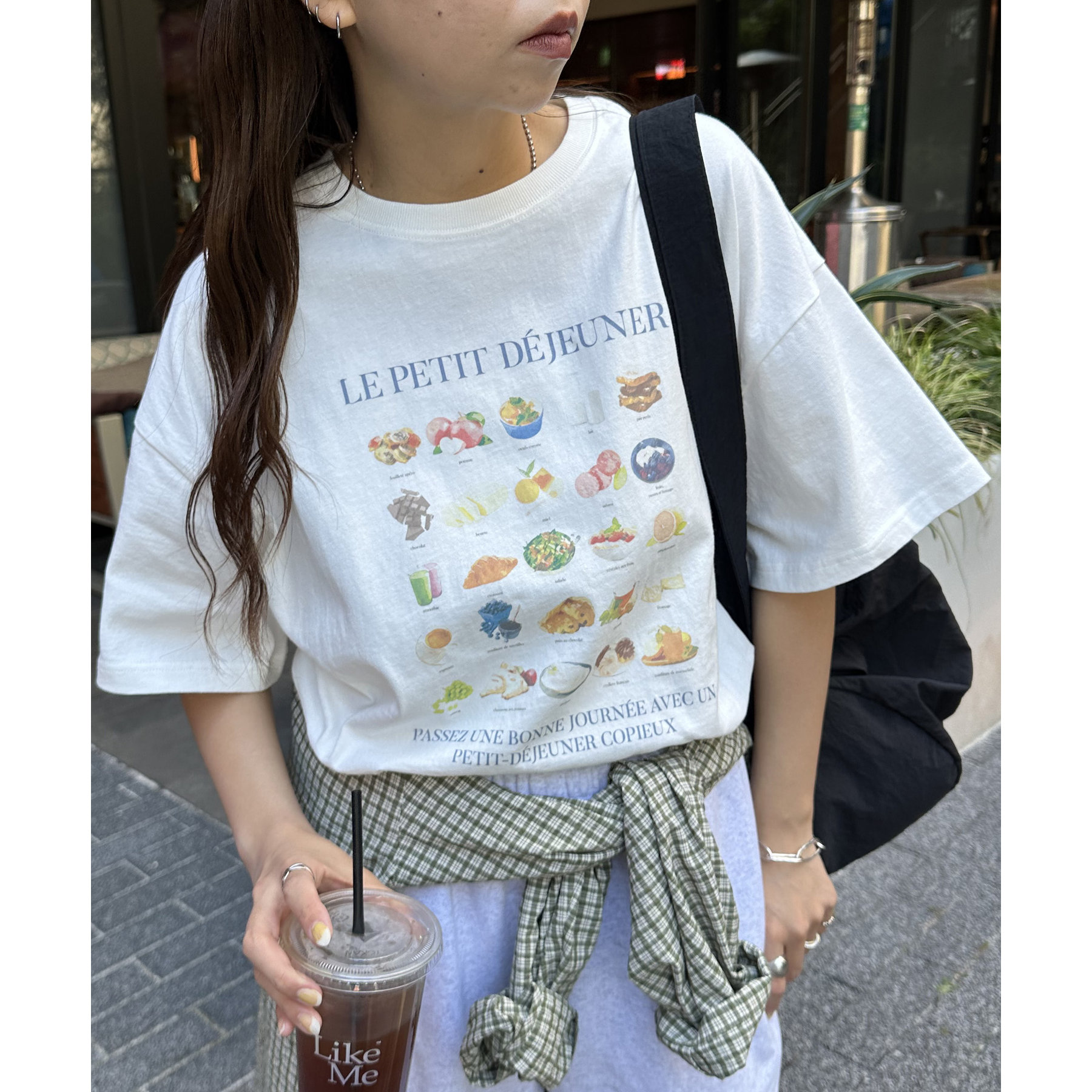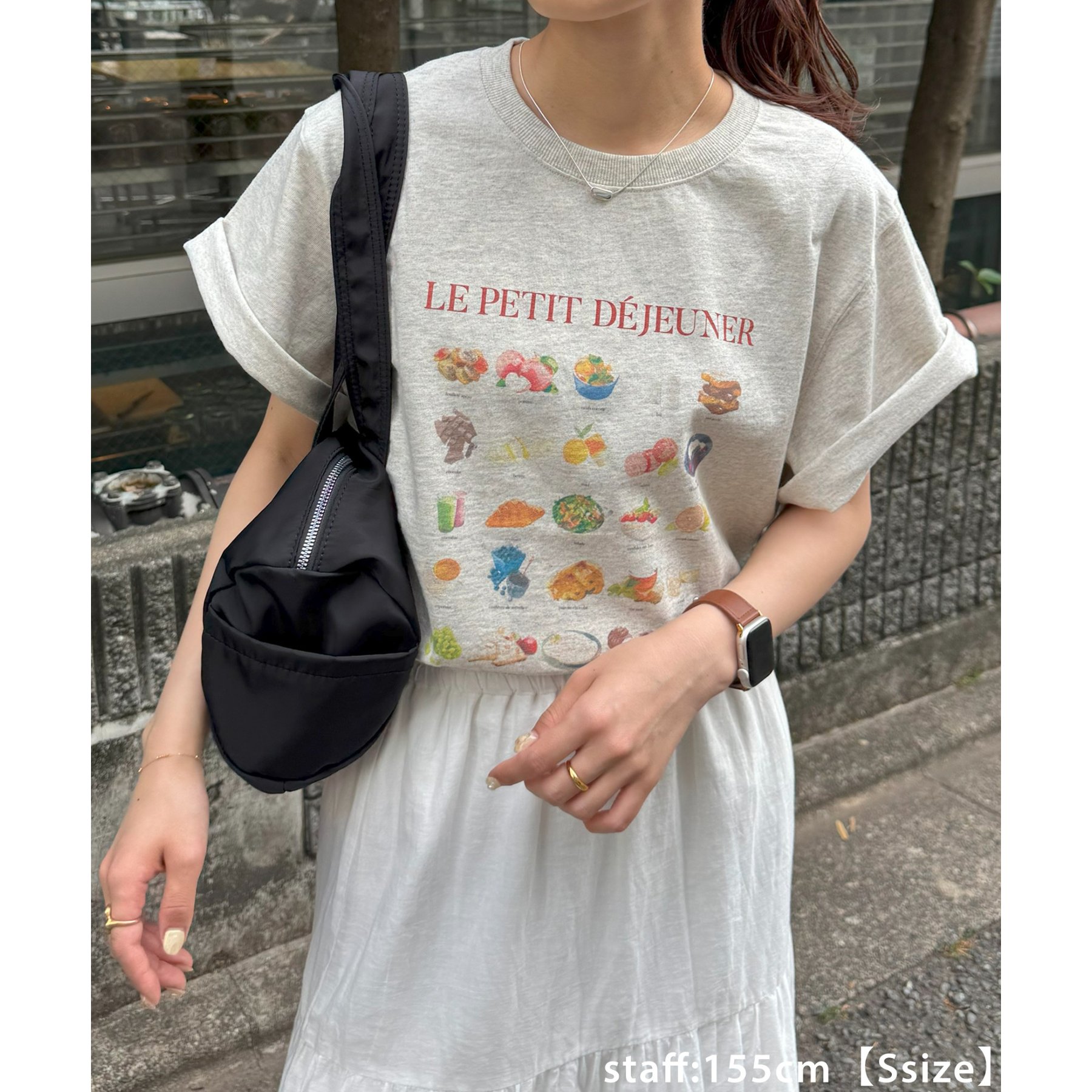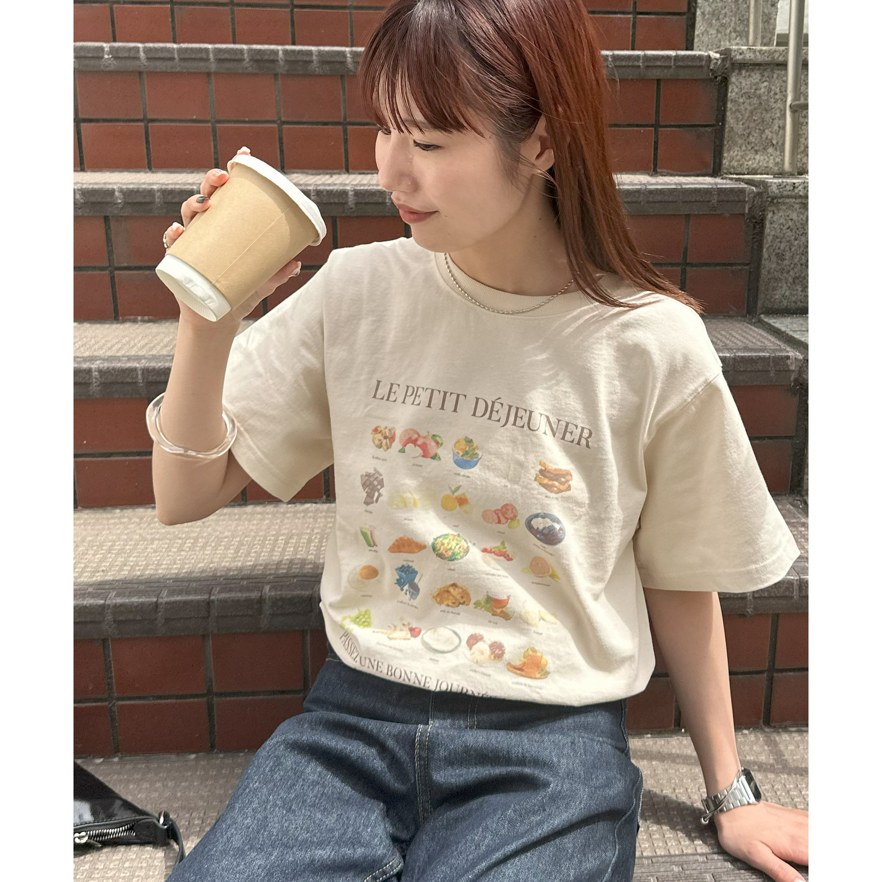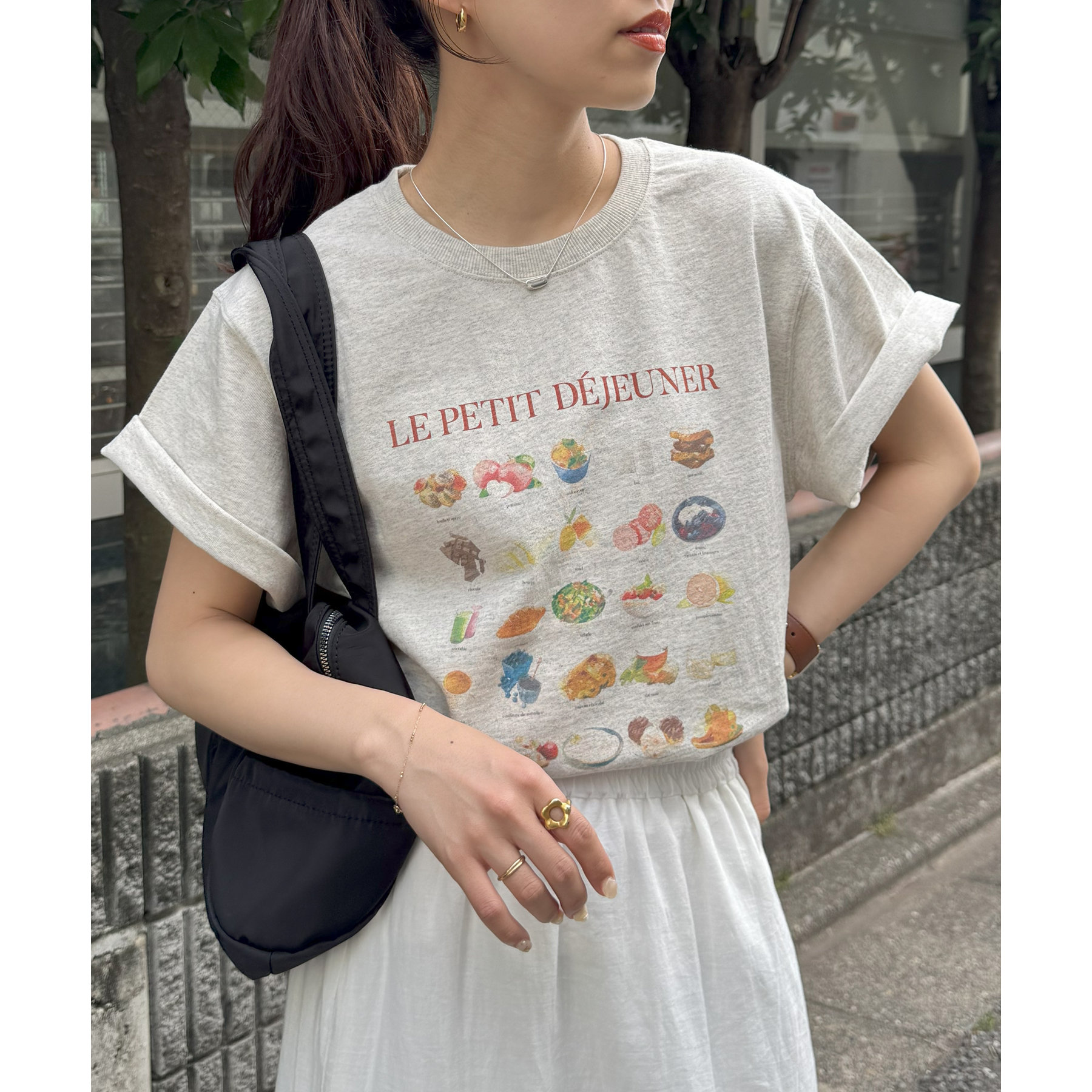 フランス語で「朝食」を意味する「LE PETIT DÉJEUNER」のロゴと、カラフルで可愛らしい朝食モチーフのイラストがプリントされたグラフィックTシャツ。