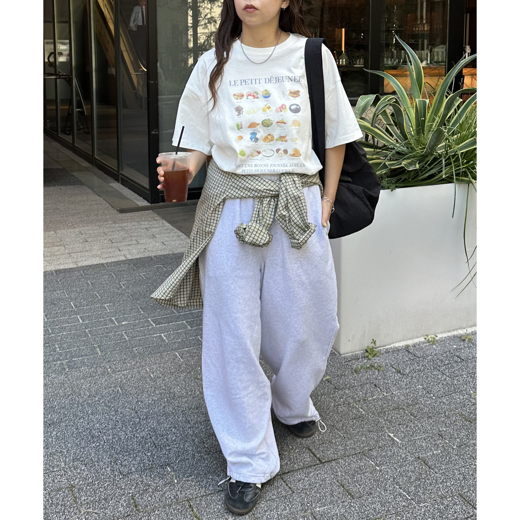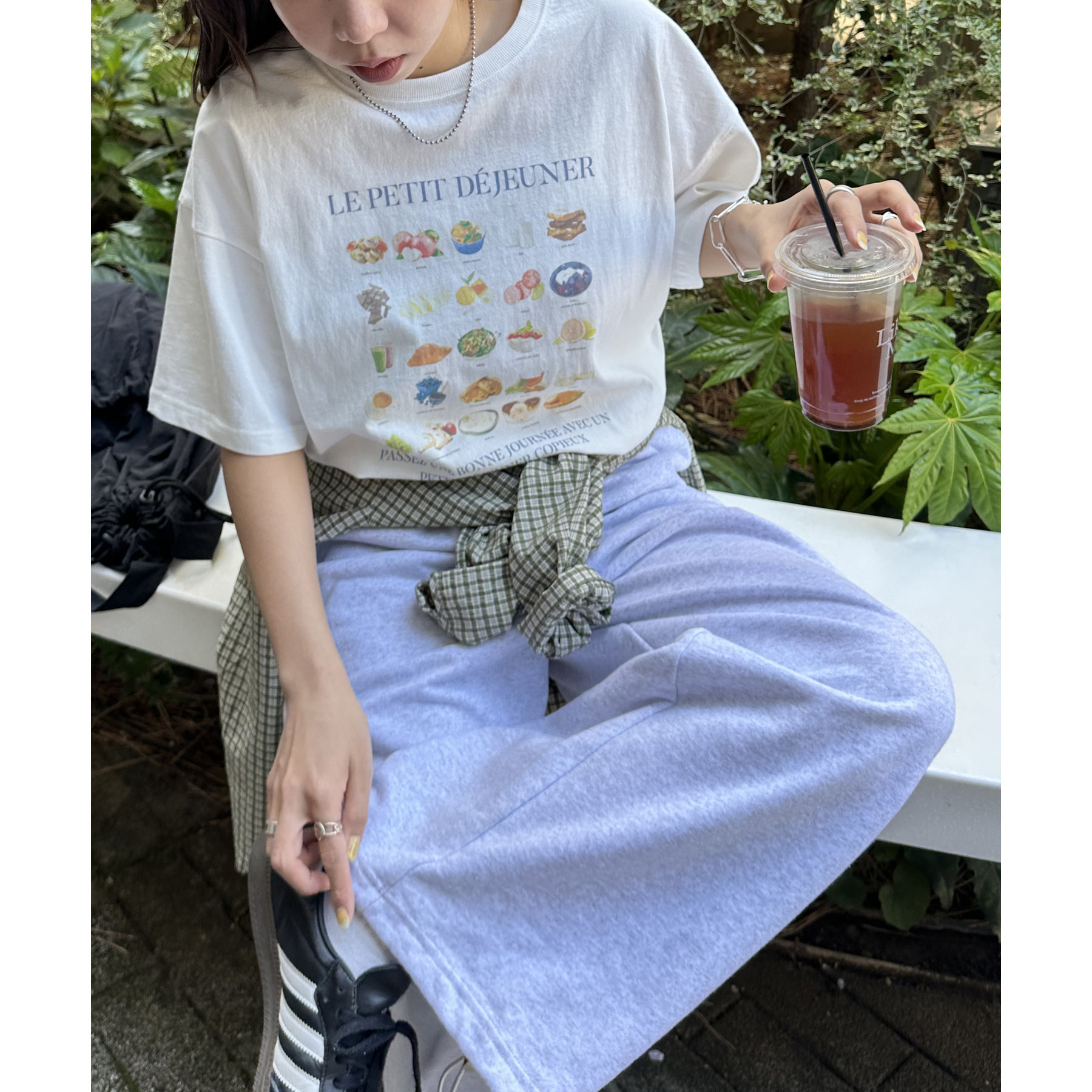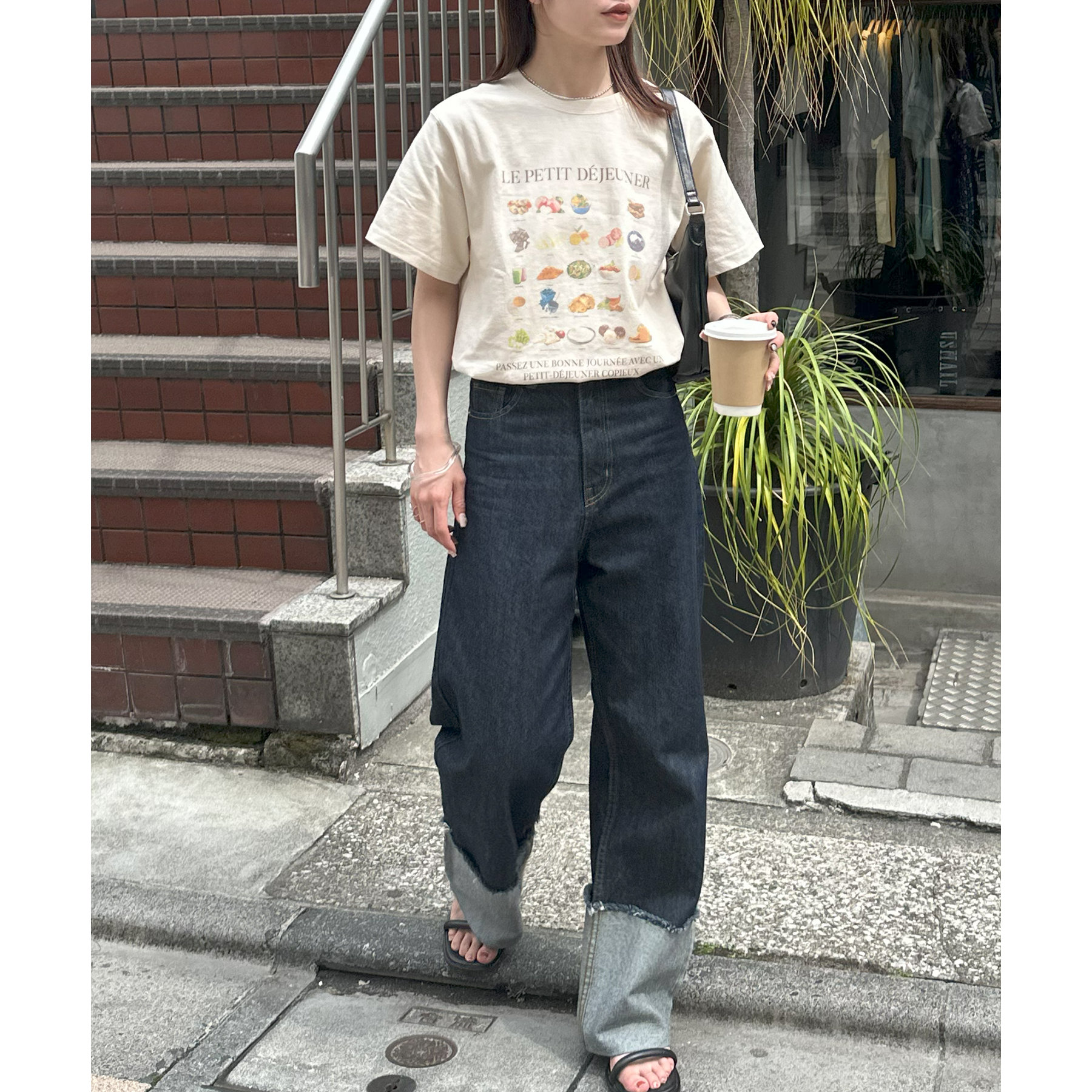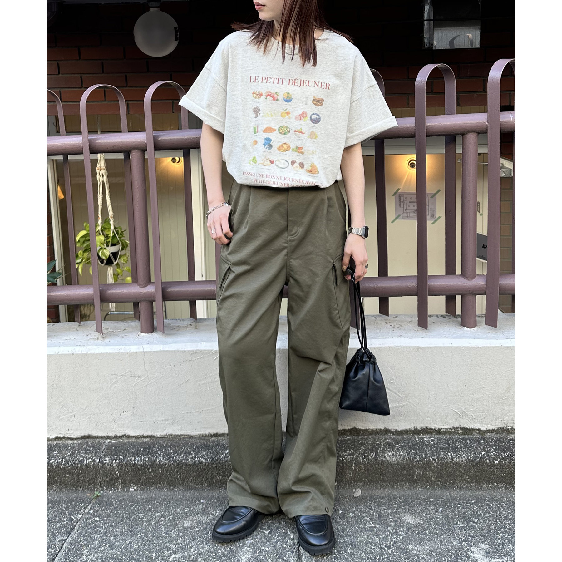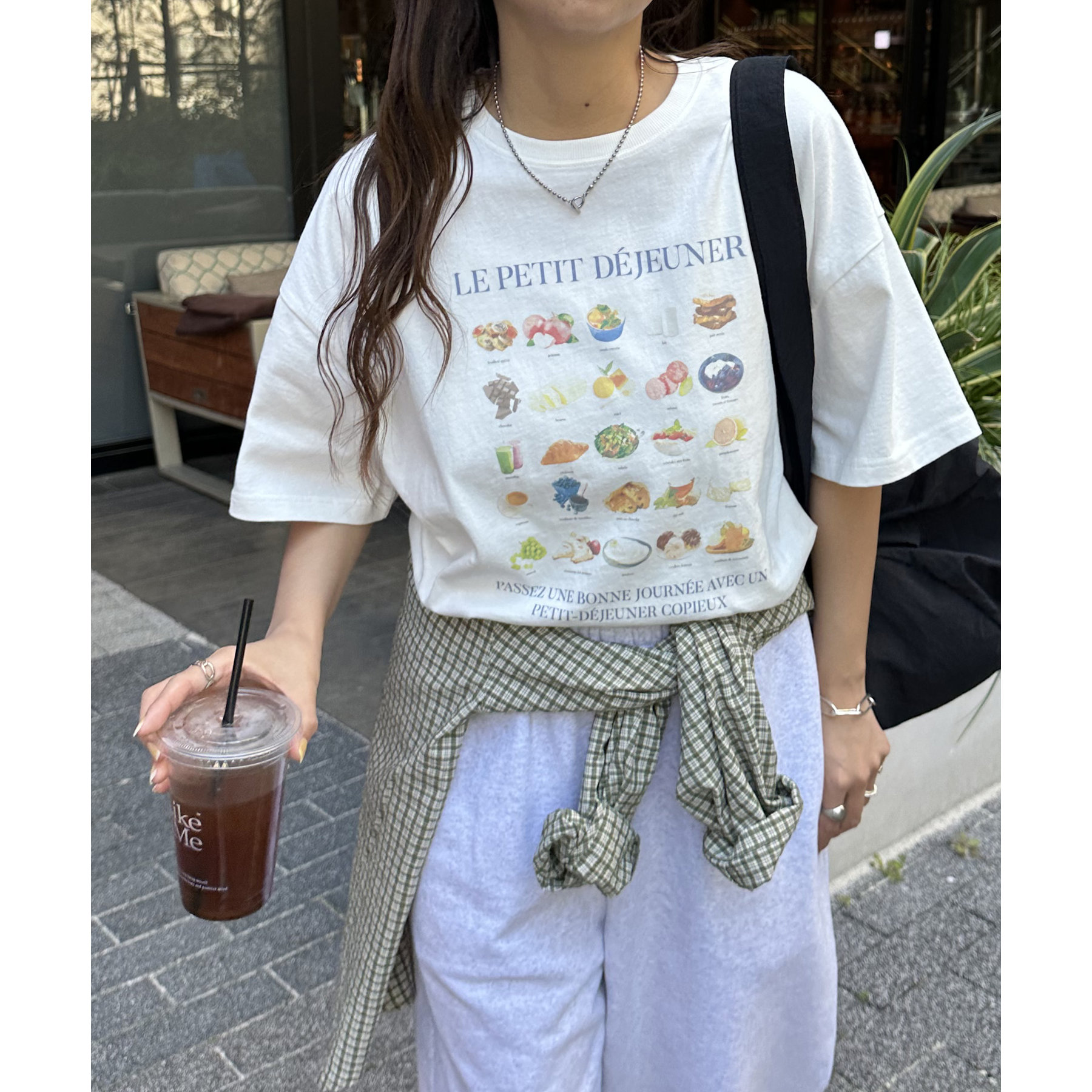 フランス語で「朝食」を意味する「LE PETIT DÉJEUNER」のロゴと、カラフルで可愛らしい朝食モチーフのイラストがプリントされたグラフィックTシャツ。