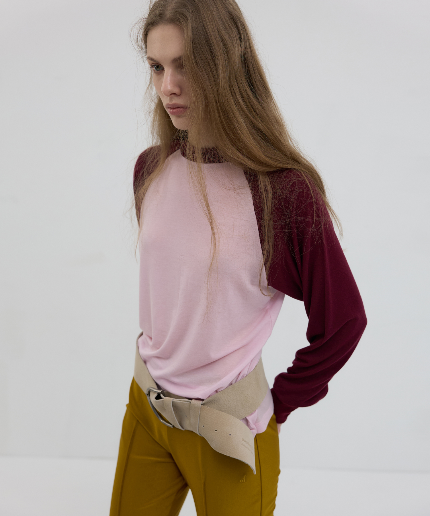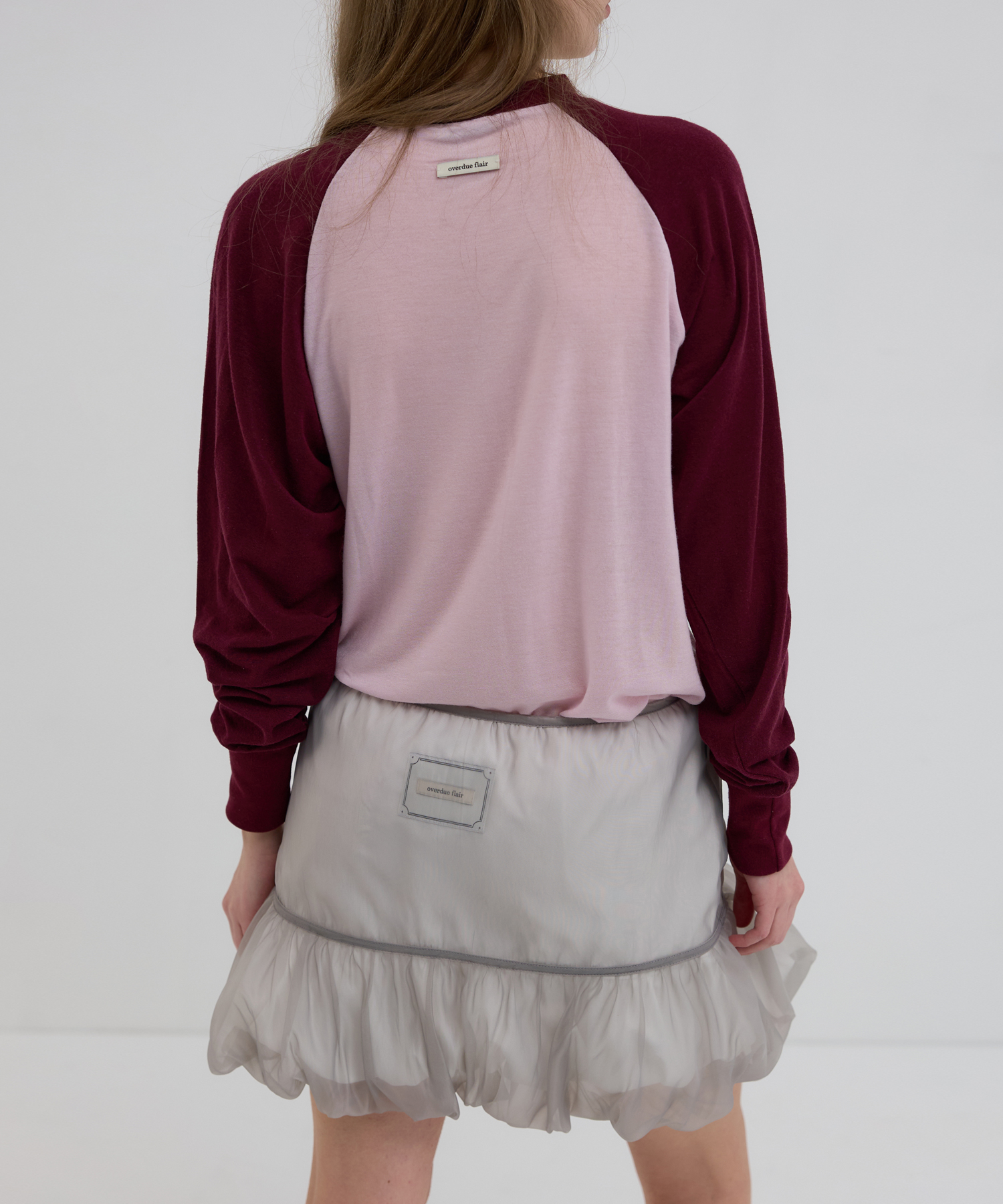 -ペールライトピンクのボディにトーンダウンしたバーガンディの袖を加え、珍しいカラー配色で落ち着きながらもフェミニンなムードを上品に表現しました。