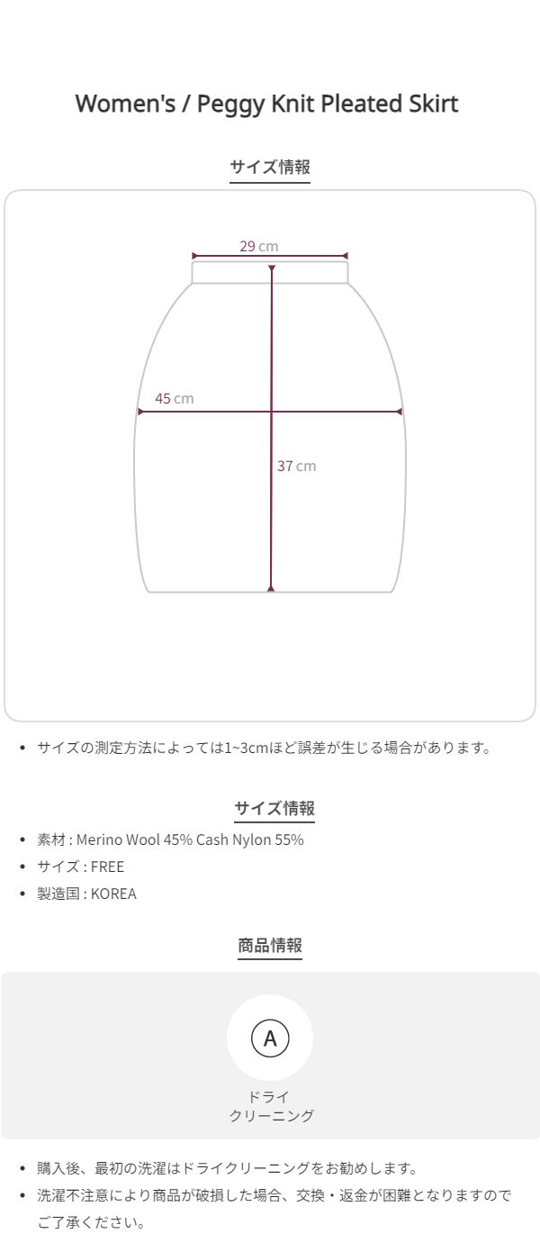 ペギーニットプリーツスカート、クラシックでガーリーなムード 高品質なメリノウールとキャッシュナイロンのブレンドで作られ、快適でありながら柔らかいフィット感を持ち、適度な厚みでラグジュアリーな印象を演出します。ニットの独特なテクスチャーの温かみと、プリーツが作り出す明るいシルエットが調和し、クラシックで官能的なムードを作り出しています。フレッシュなミニ丈は脚のラインを細く長く見せ、ウエストはバンドディテールで着心地よく感じられます。季節のトップスと合わせてモダンなスタイルを施します。メリノウール45%キャッシュナイロン55%プリーツデザイン ミニレングスウエストバンド